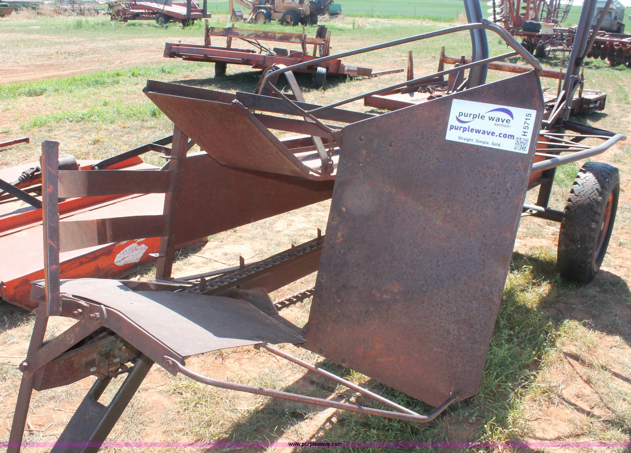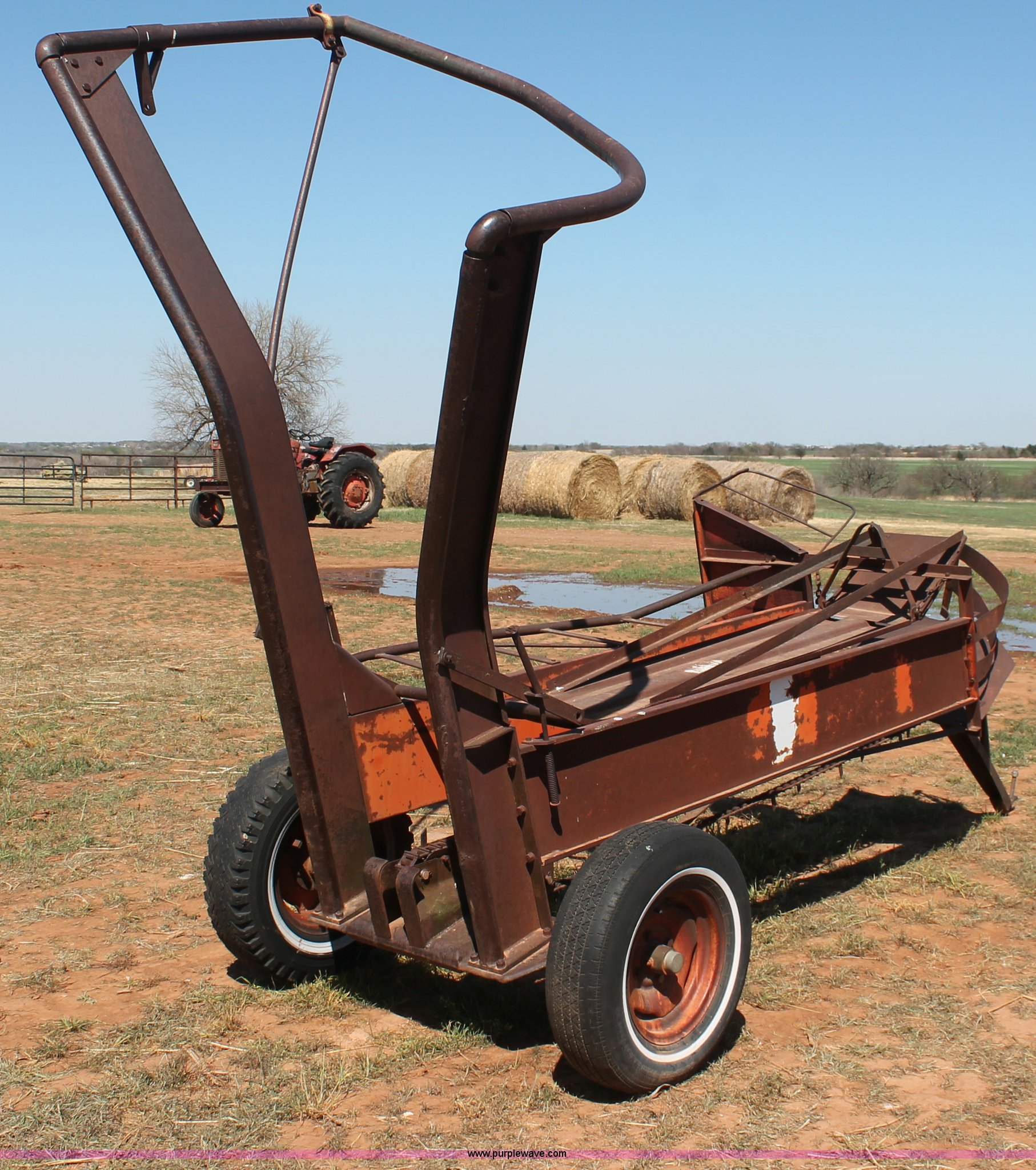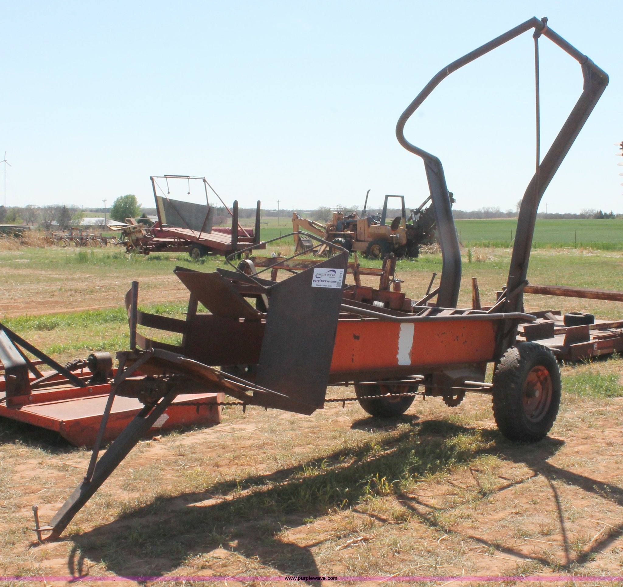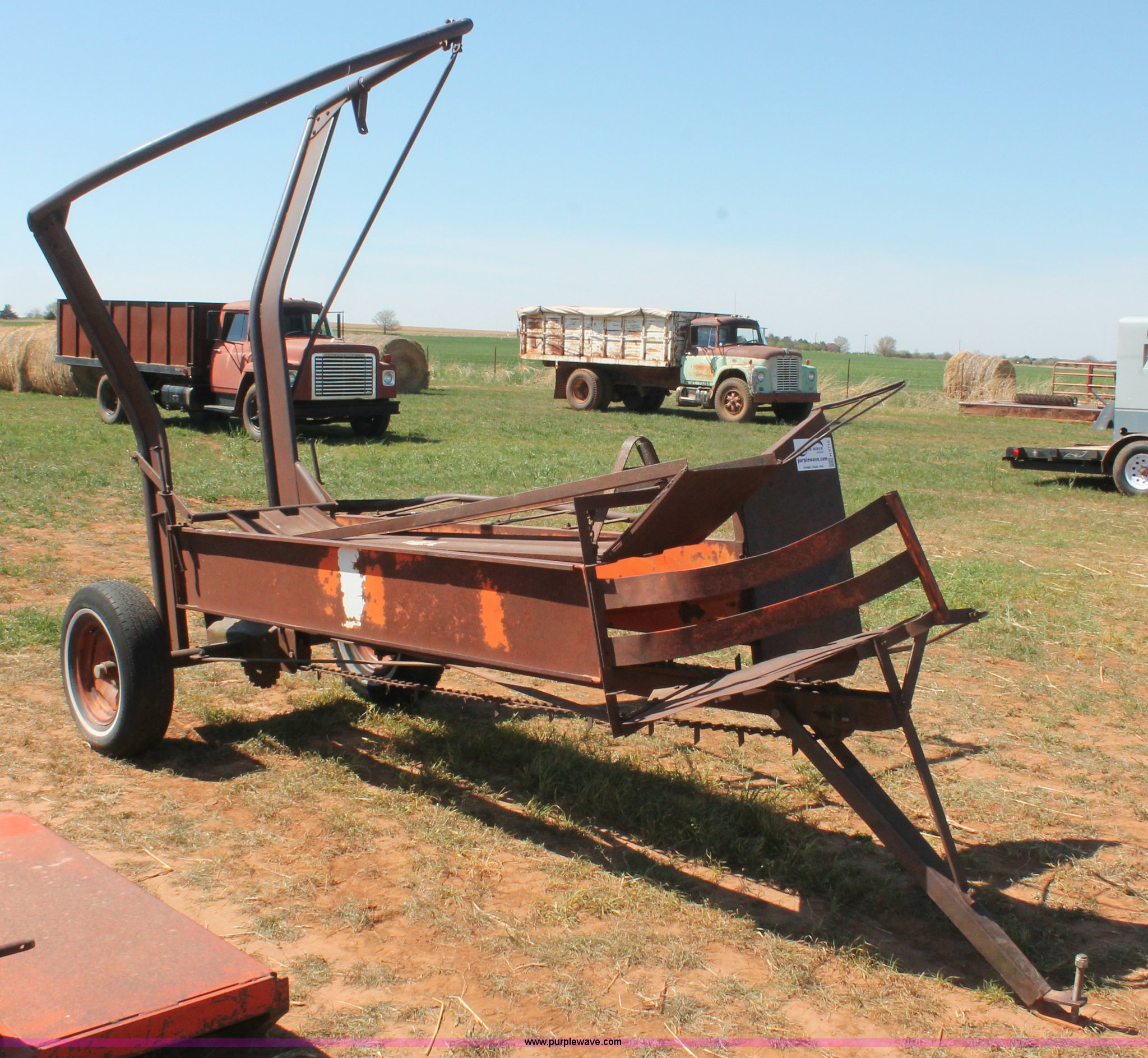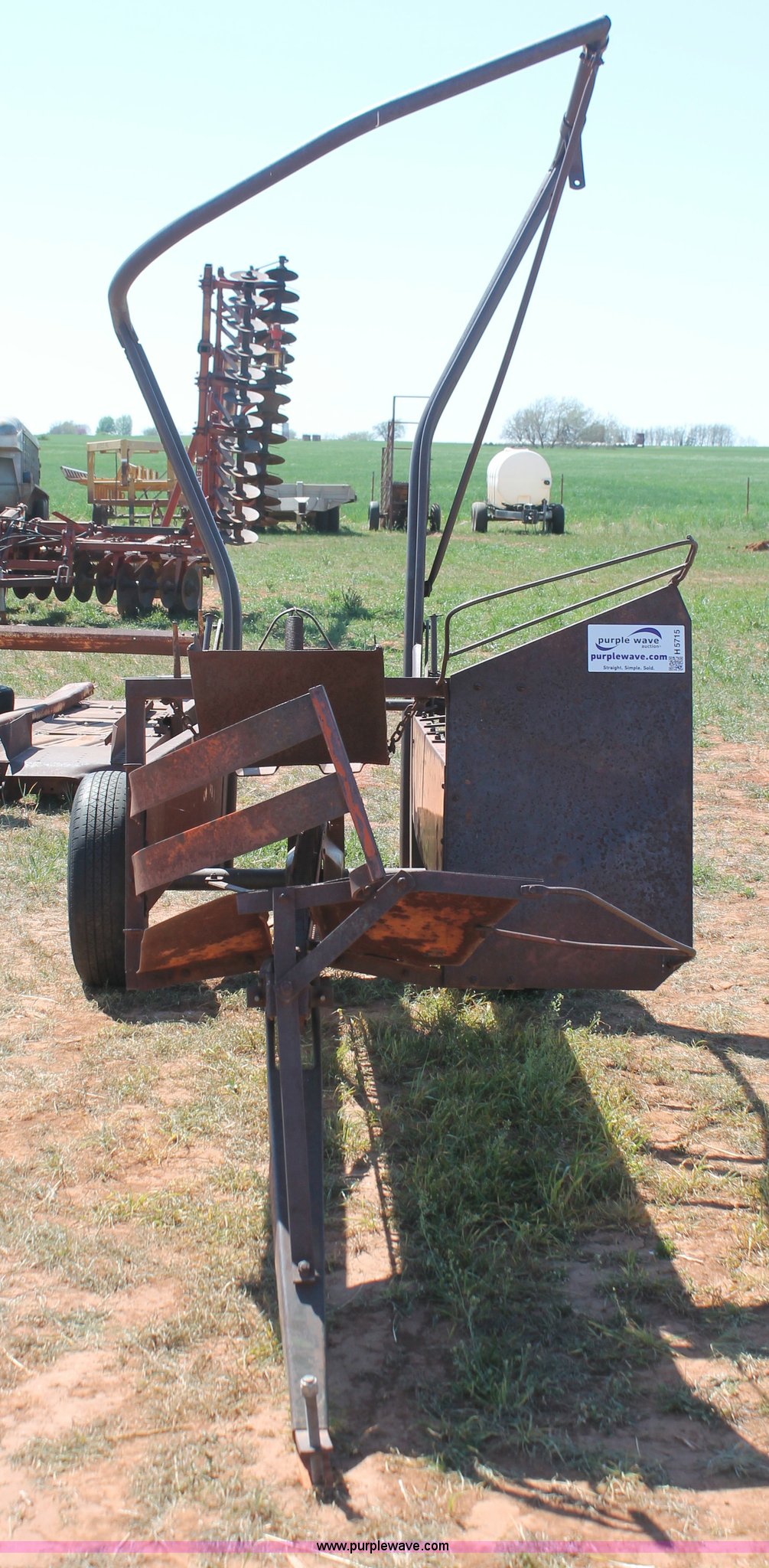 Purple Wave is selling a used Hay Handling in Oklahoma. This item is a Bush Hog pop-up square bale loader with the following: Ground drive, Pin hitch, P205/75R14 tires