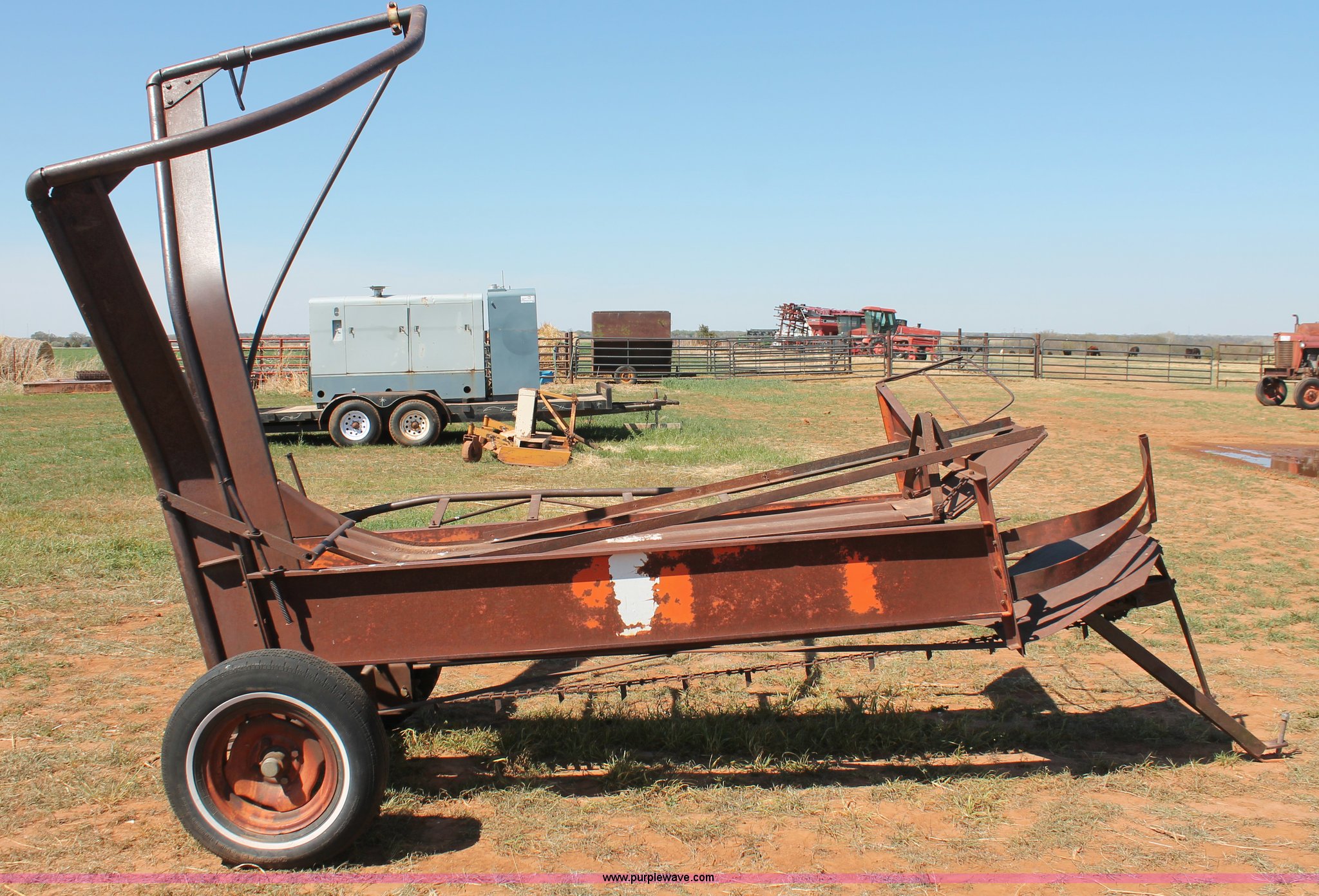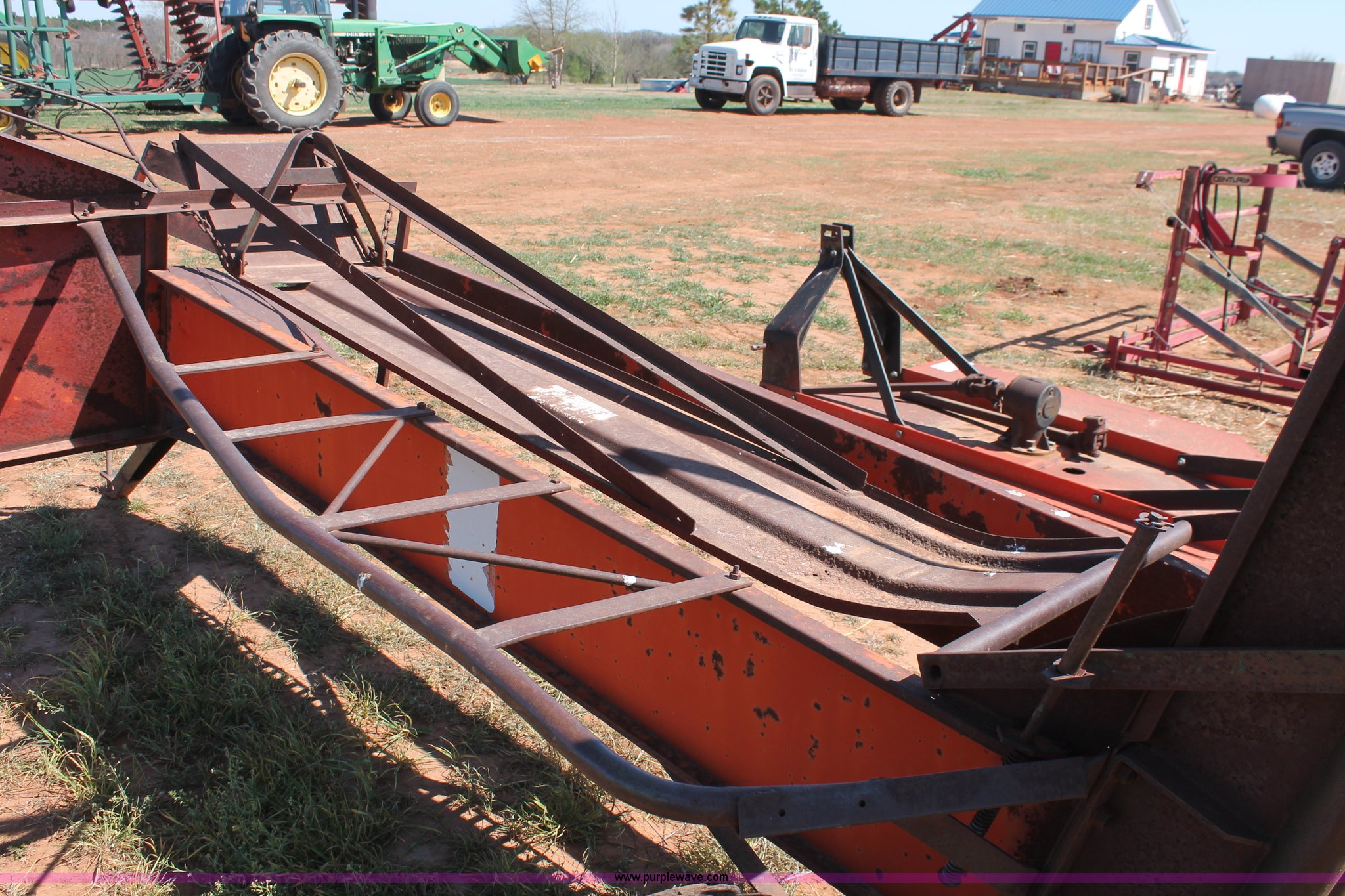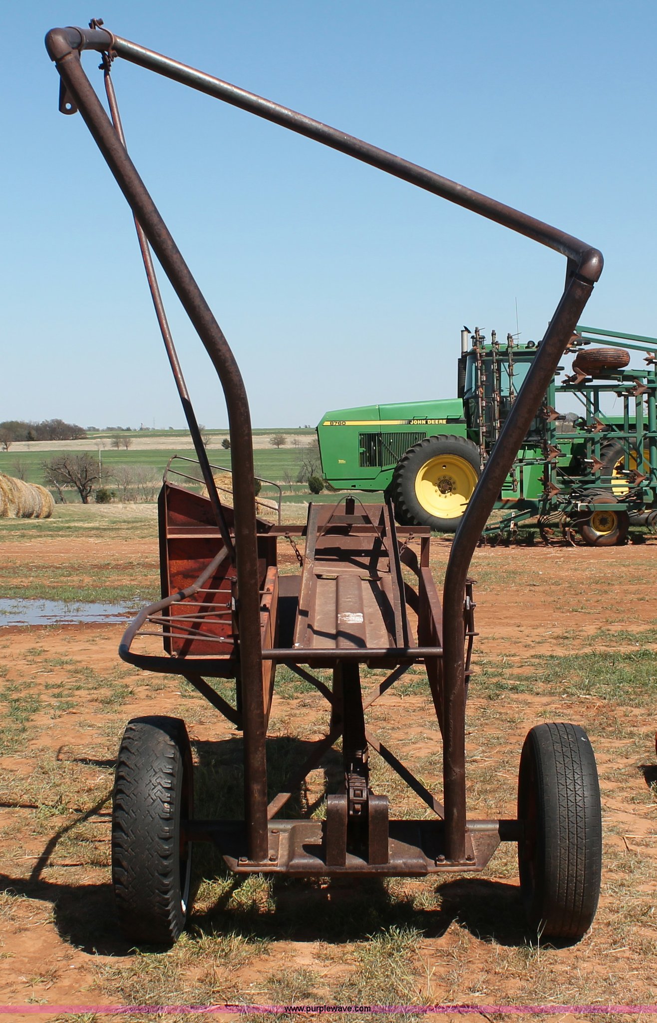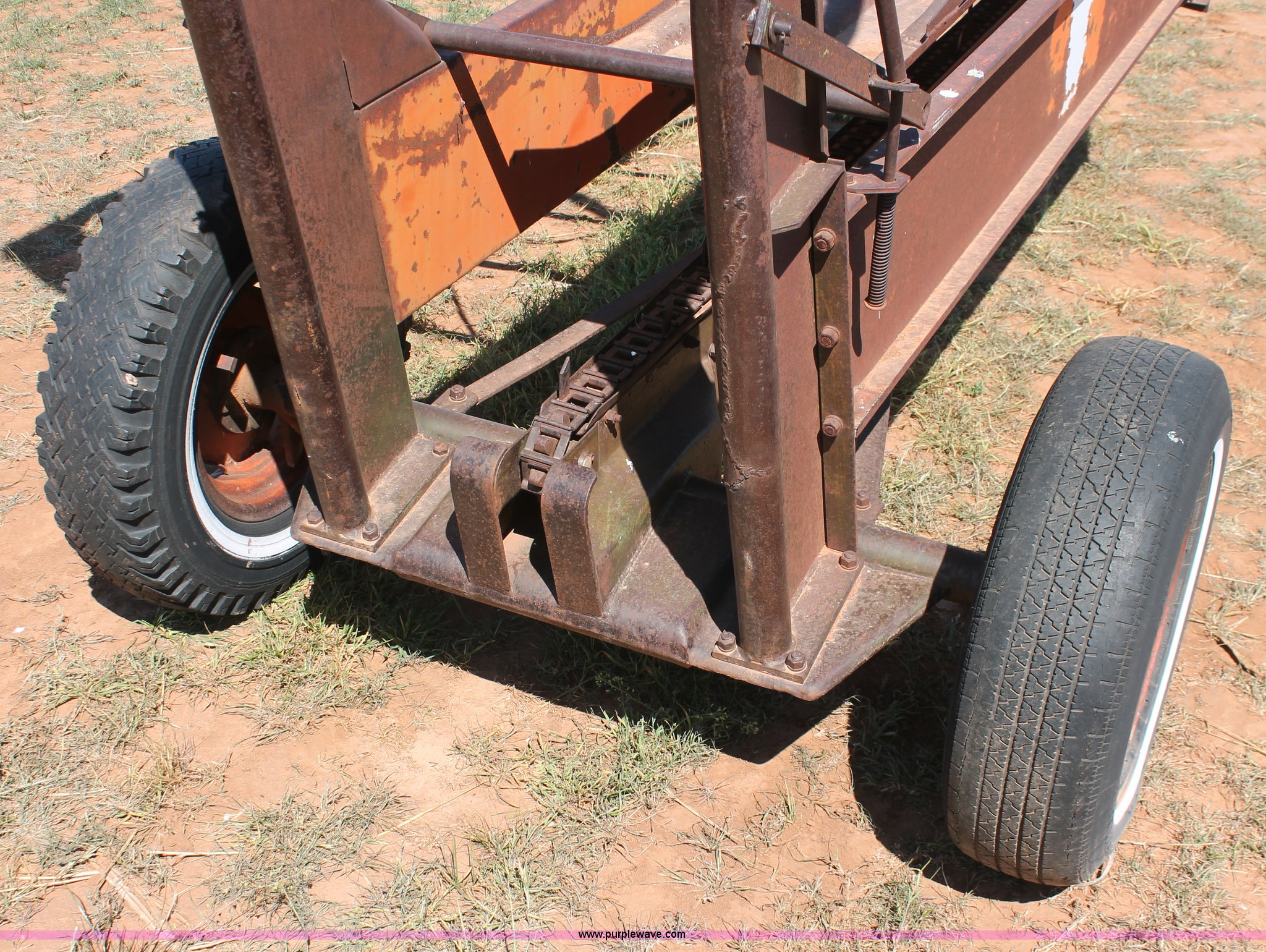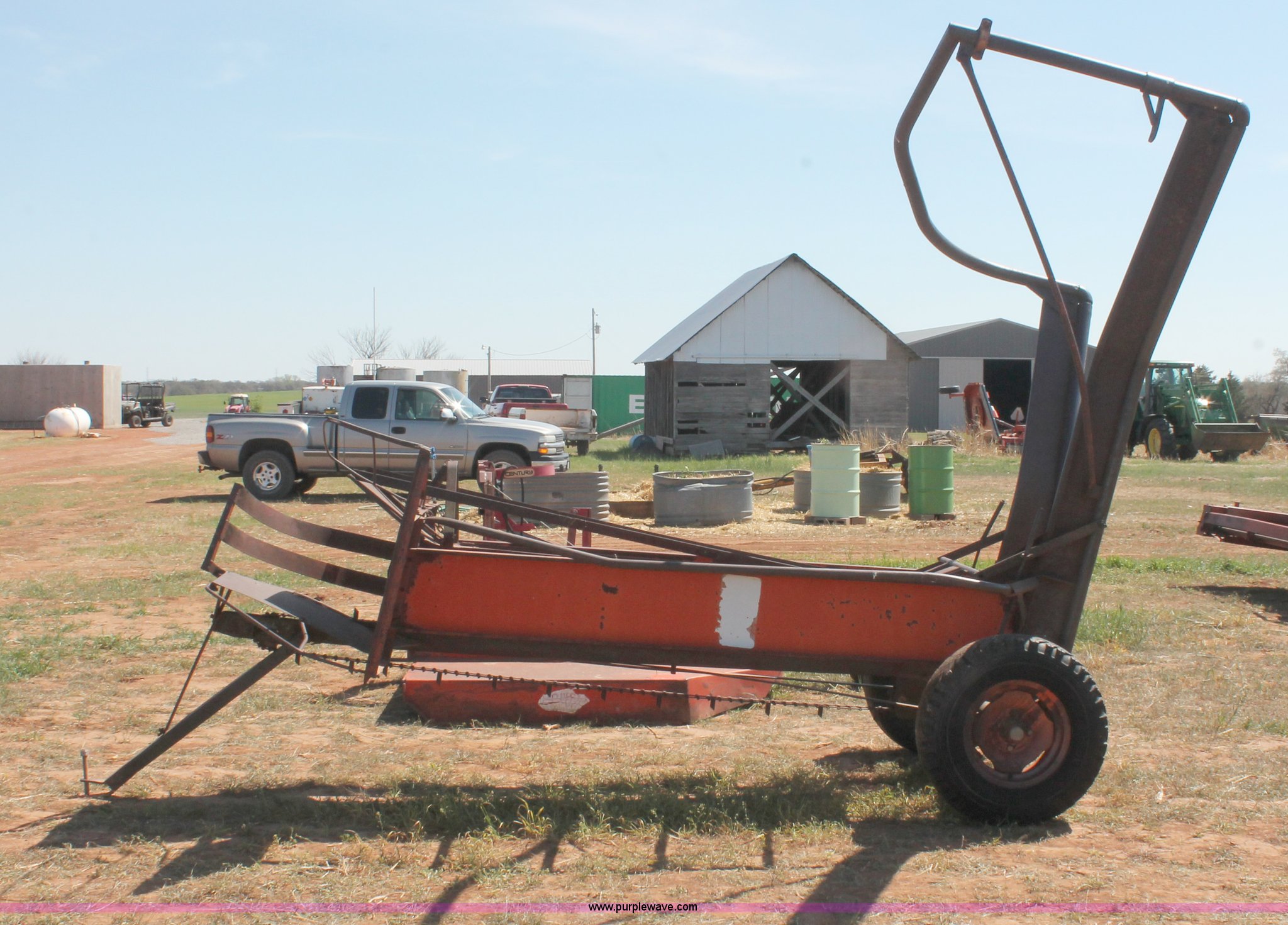 Purple Wave is selling a used Hay Handling in Oklahoma. This item is a Bush Hog pop-up square bale loader with the following: Ground drive, Pin hitch, P205/75R14 tires