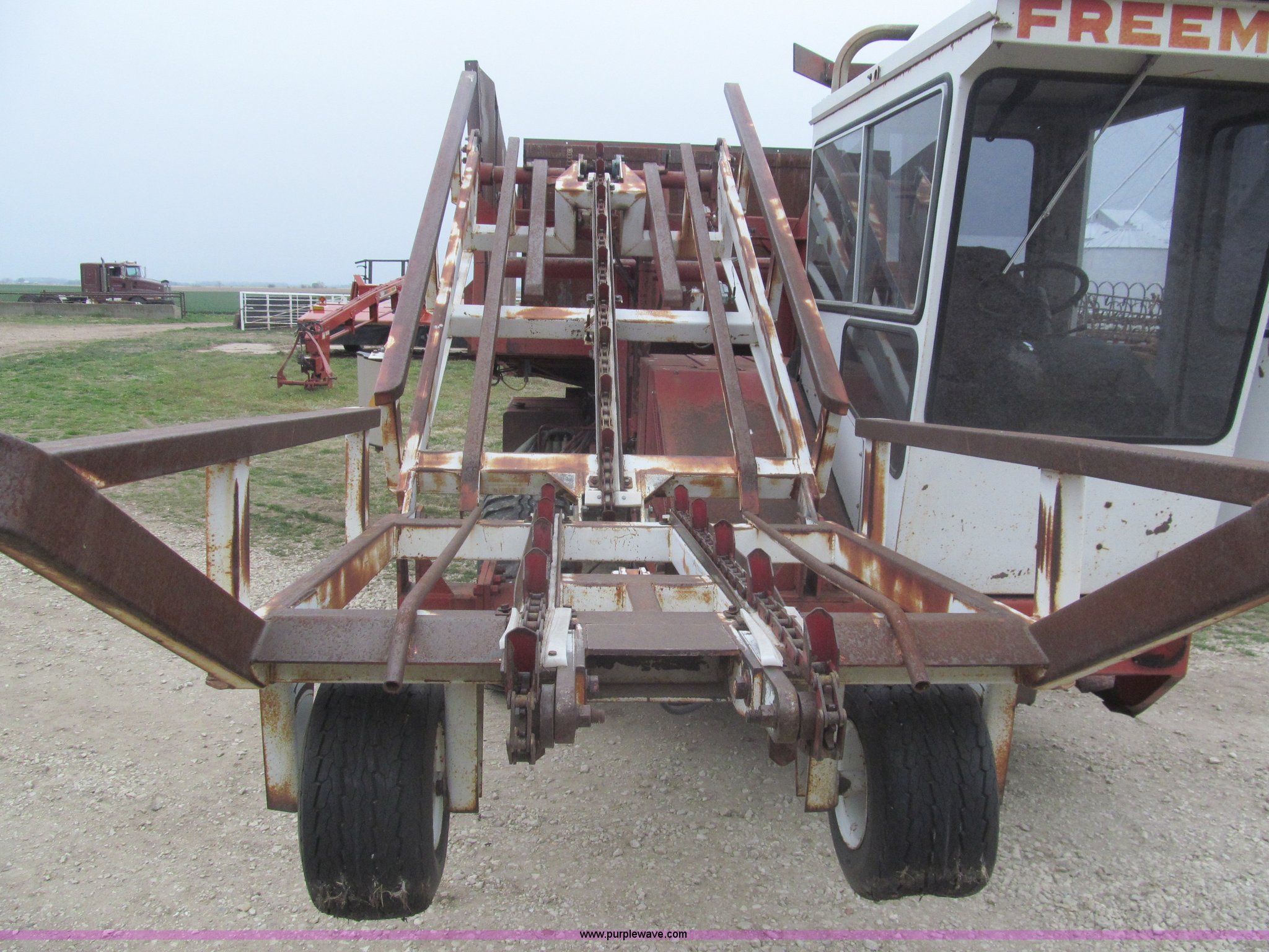 Purple Wave is selling a used Hay Handling in Kansas. This item is a Freeman 5000 bale wagon with the following: 913 hours on meter, Cummins turbo diesel engine, Automatic transmission, Enclosed cab, Model BBRS, AC, Serial 1303, 15-19.5ML front tires, 40x12-19 rear tires, Minor electrical issues, Serial BBRS0027