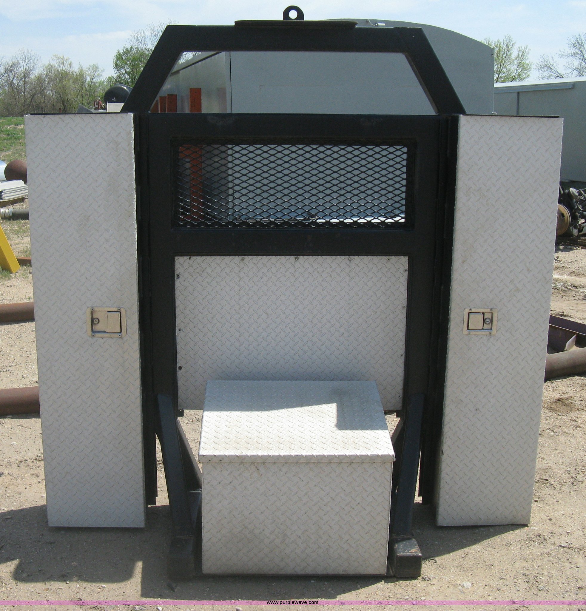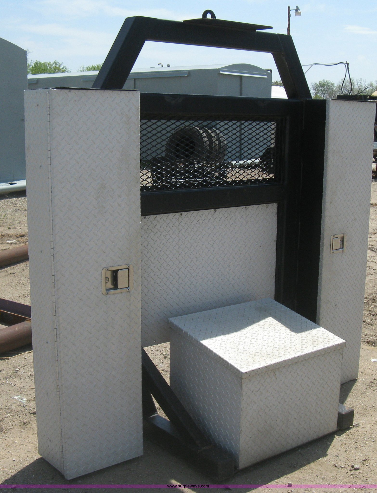 Shop built headache rack. 3.5" x 3.5" main frame square tubing, Expanded metal window covering, Strobe light mounting plate, (2) upright chain boxes Diamond plate doors, Diamond plate toolbox 72"W x 72"H. Fremar Corp. 5720 N Broadway. Wichita, KS 67219