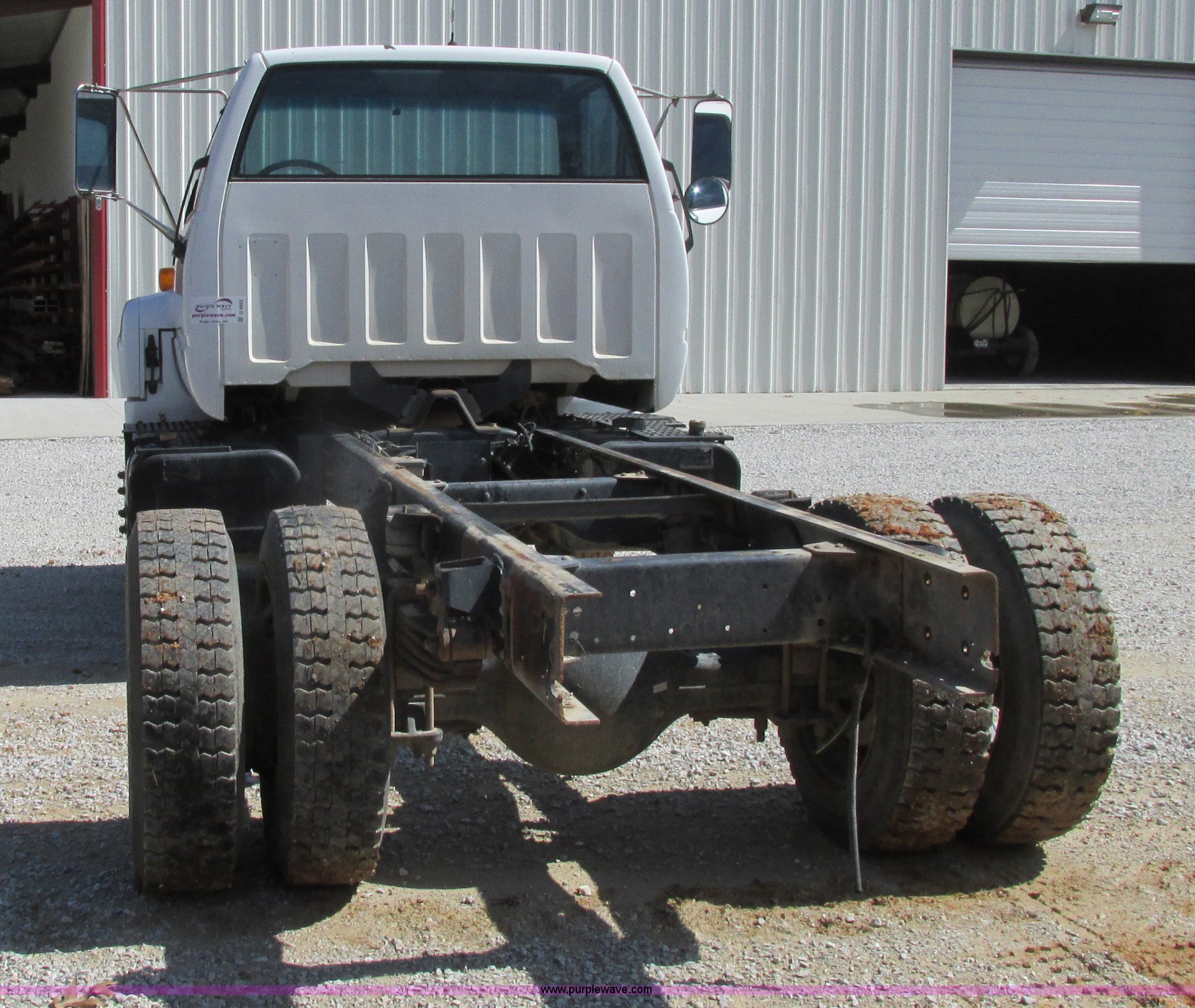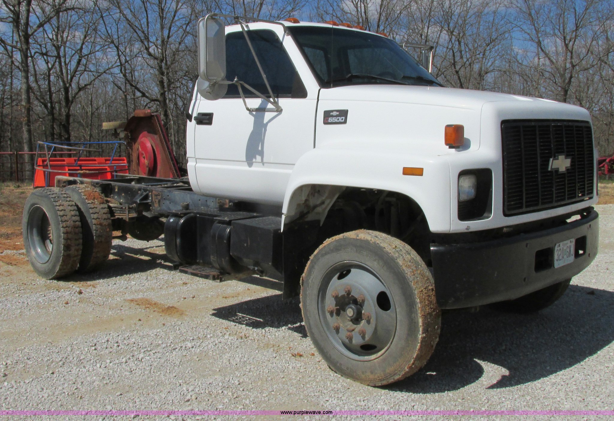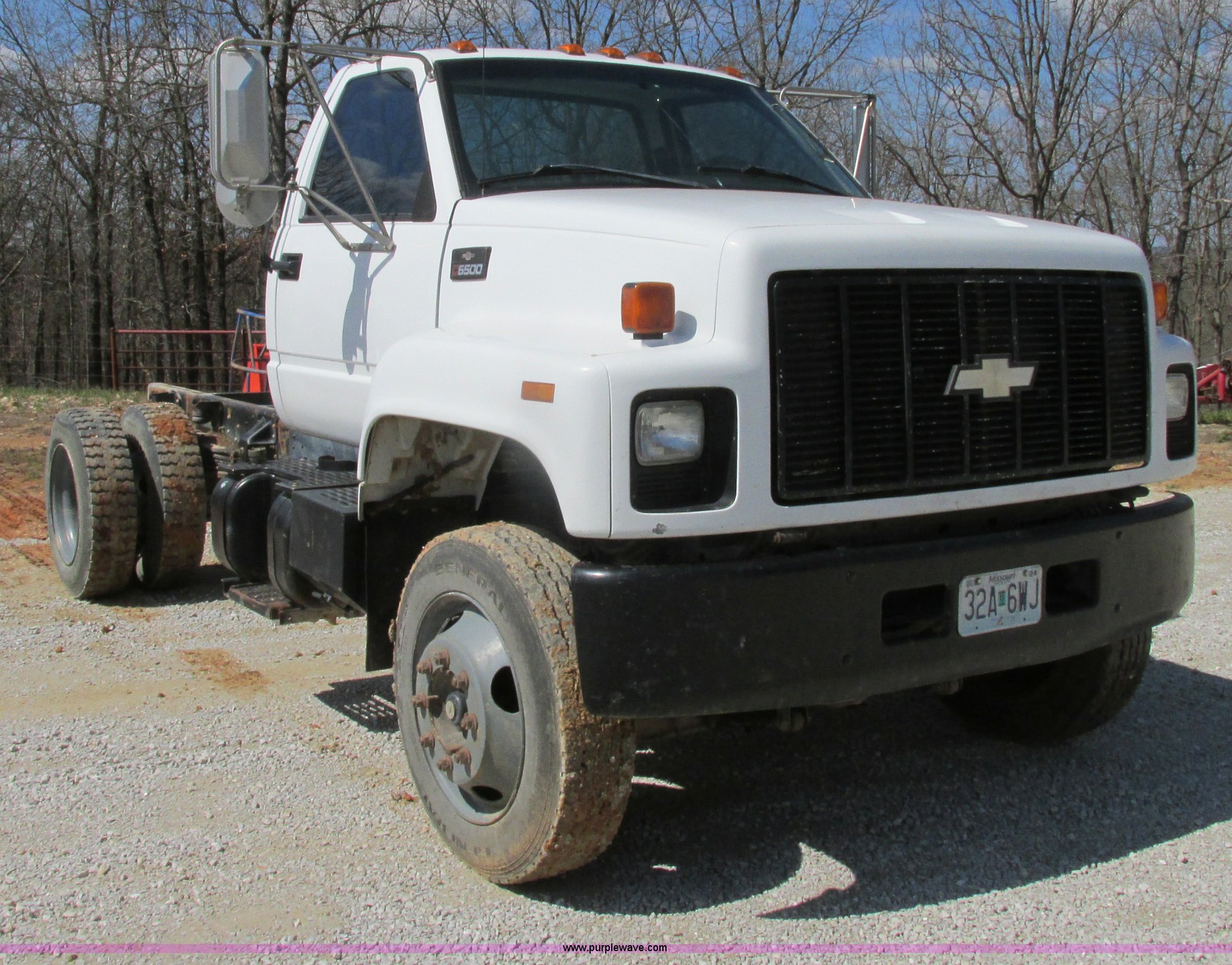 Purple Wave is selling a used Truck Chassis in Missouri. This item is a 1998 Chevrolet C6500 truck cab and chassis with the following: 261,494 actual miles, Caterpillar 3116 6.6L L6 turbo diesel engine, Six speed manual transmission, AC and heat, AM/FM/cassette, Manual windows and locks, Vinyl interior, Dual 35 gallon fuel tanks, Trailer brake controller, Spring suspension, Hydraulic brakes, 158" wheelbase, 255/70R22.5 tires, GVWR 23,900 lbs, FAWR 8,100 lbs, RAWR 16,900 lbs, Windshield cracked, No taillights