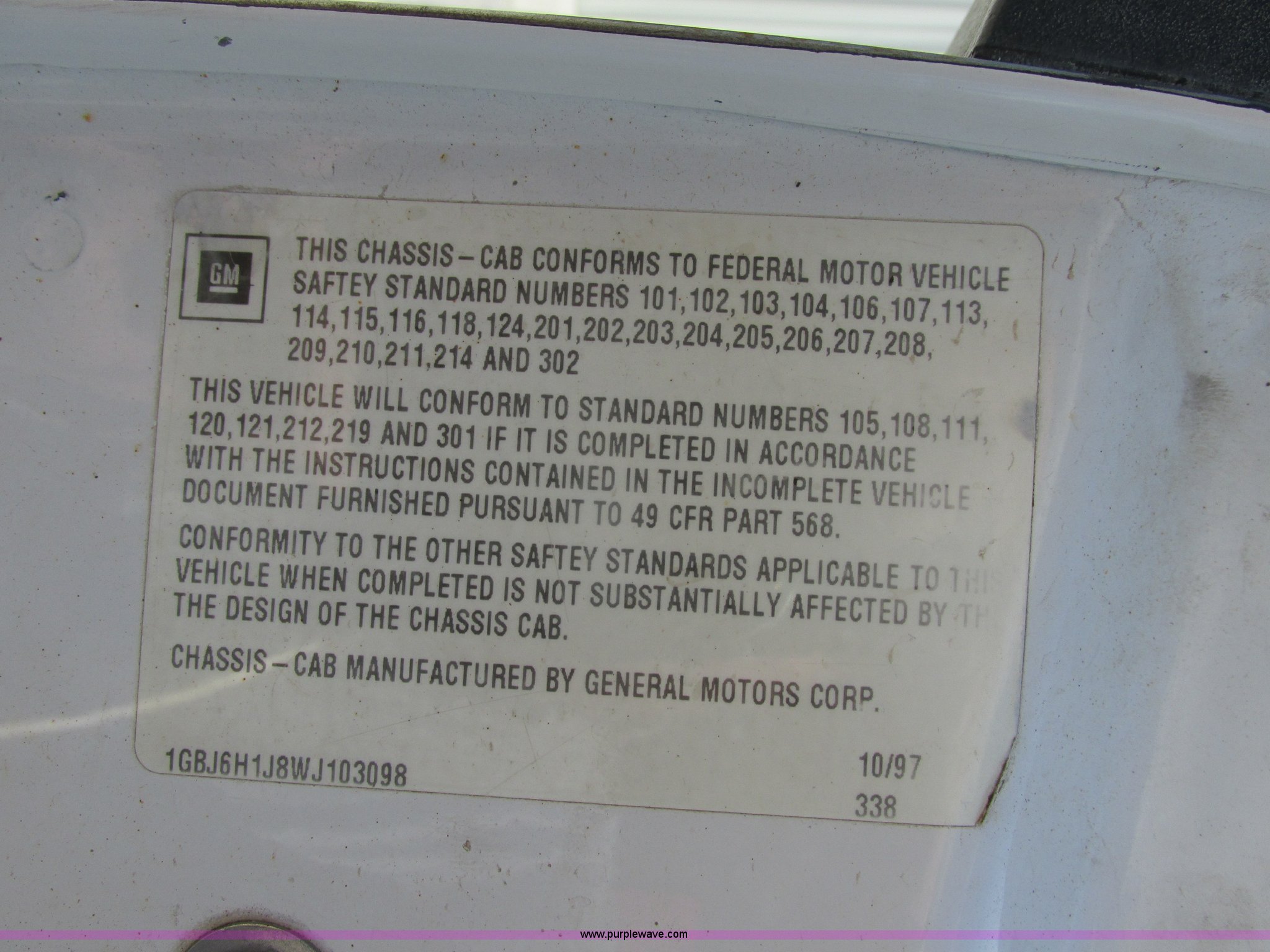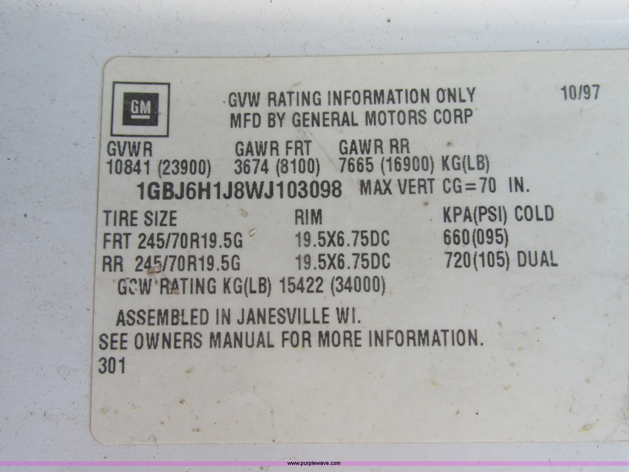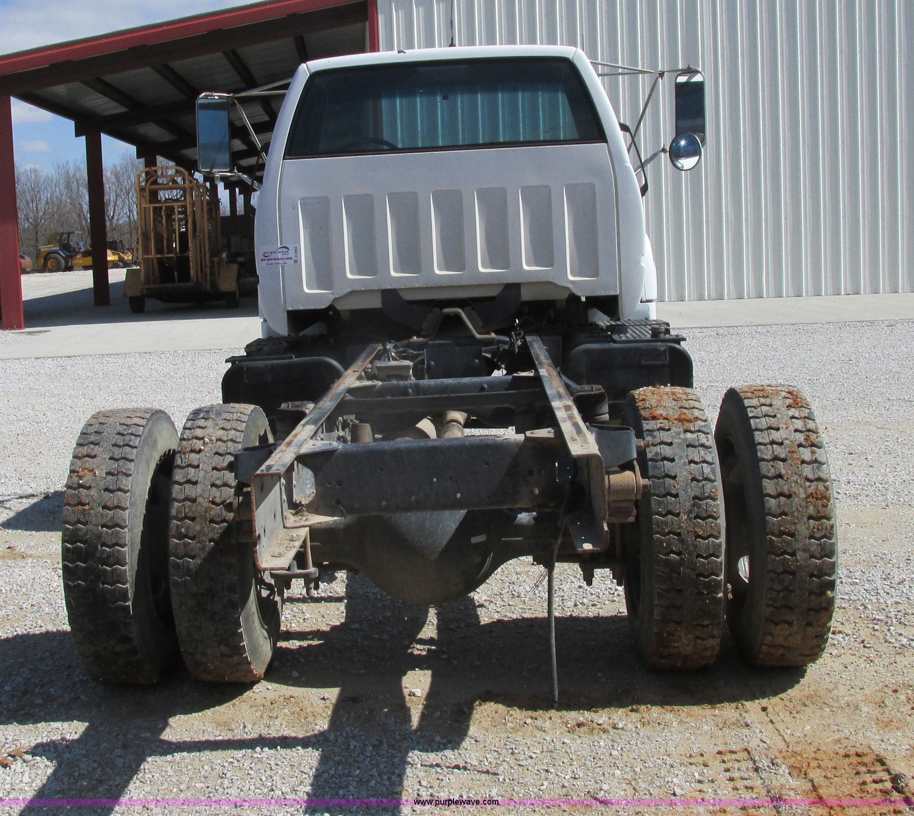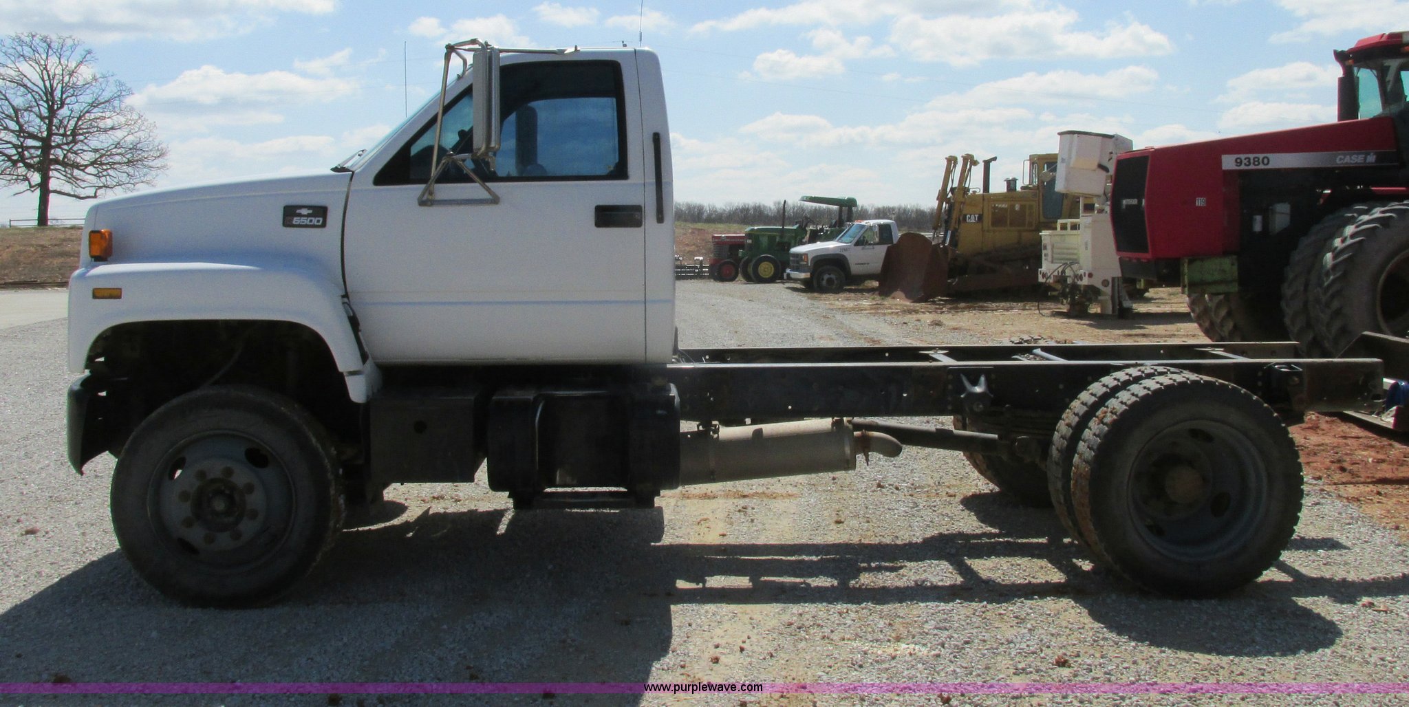 Purple Wave is selling a used Truck Chassis in Missouri. This item is a 1998 Chevrolet C6500 truck cab and chassis with the following: 261,494 actual miles, Caterpillar 3116 6.6L L6 turbo diesel engine, Six speed manual transmission, AC and heat, AM/FM/cassette, Manual windows and locks, Vinyl interior, Dual 35 gallon fuel tanks, Trailer brake controller, Spring suspension, Hydraulic brakes, 158" wheelbase, 255/70R22.5 tires, GVWR 23,900 lbs, FAWR 8,100 lbs, RAWR 16,900 lbs, Windshield cracked, No taillights