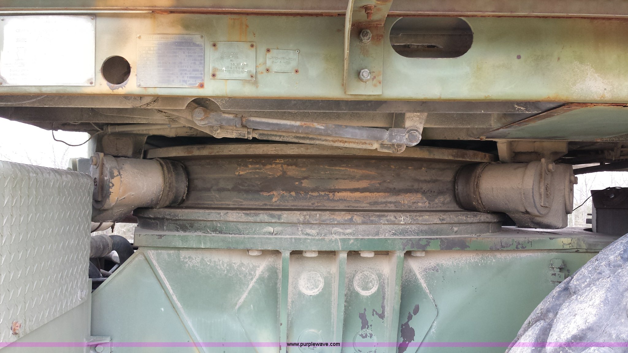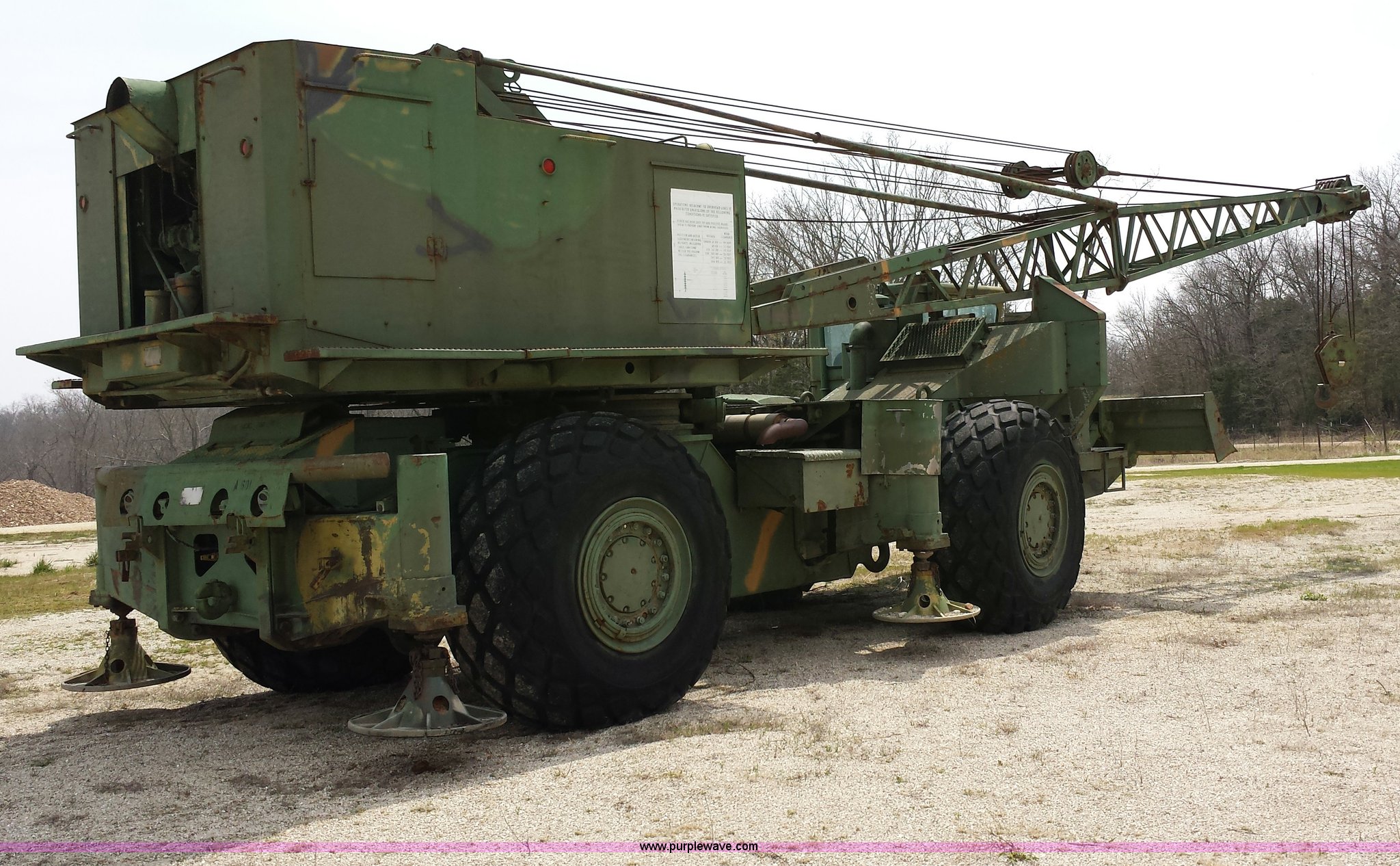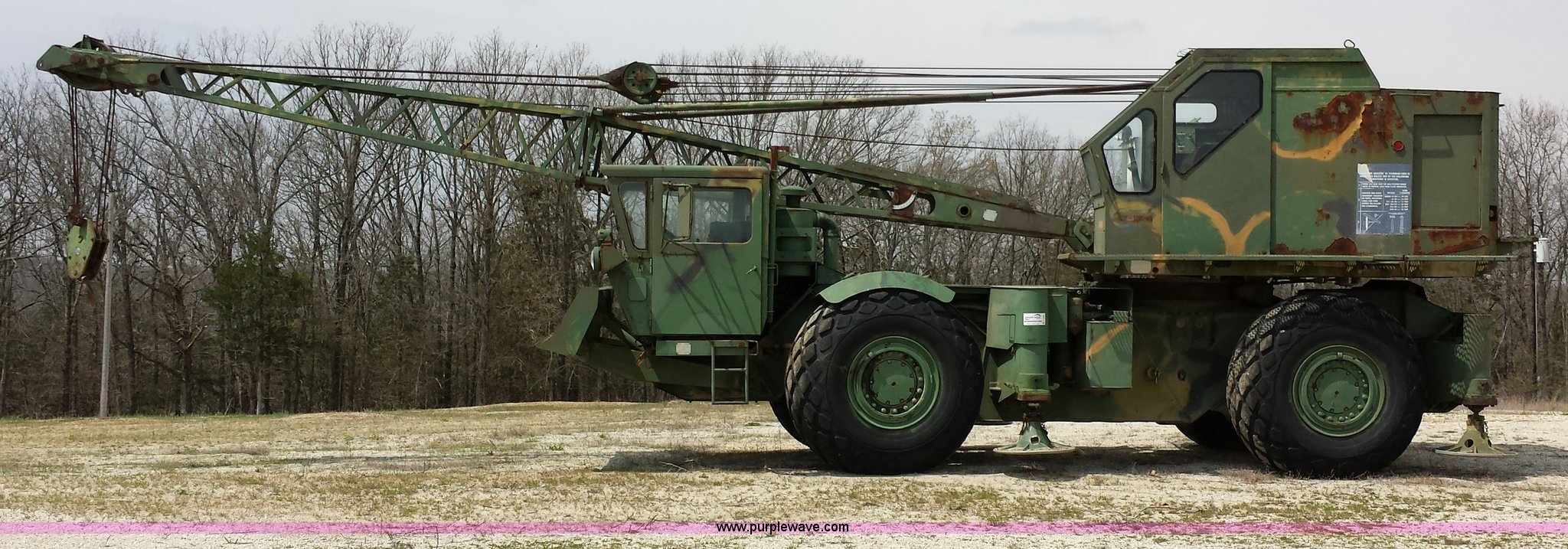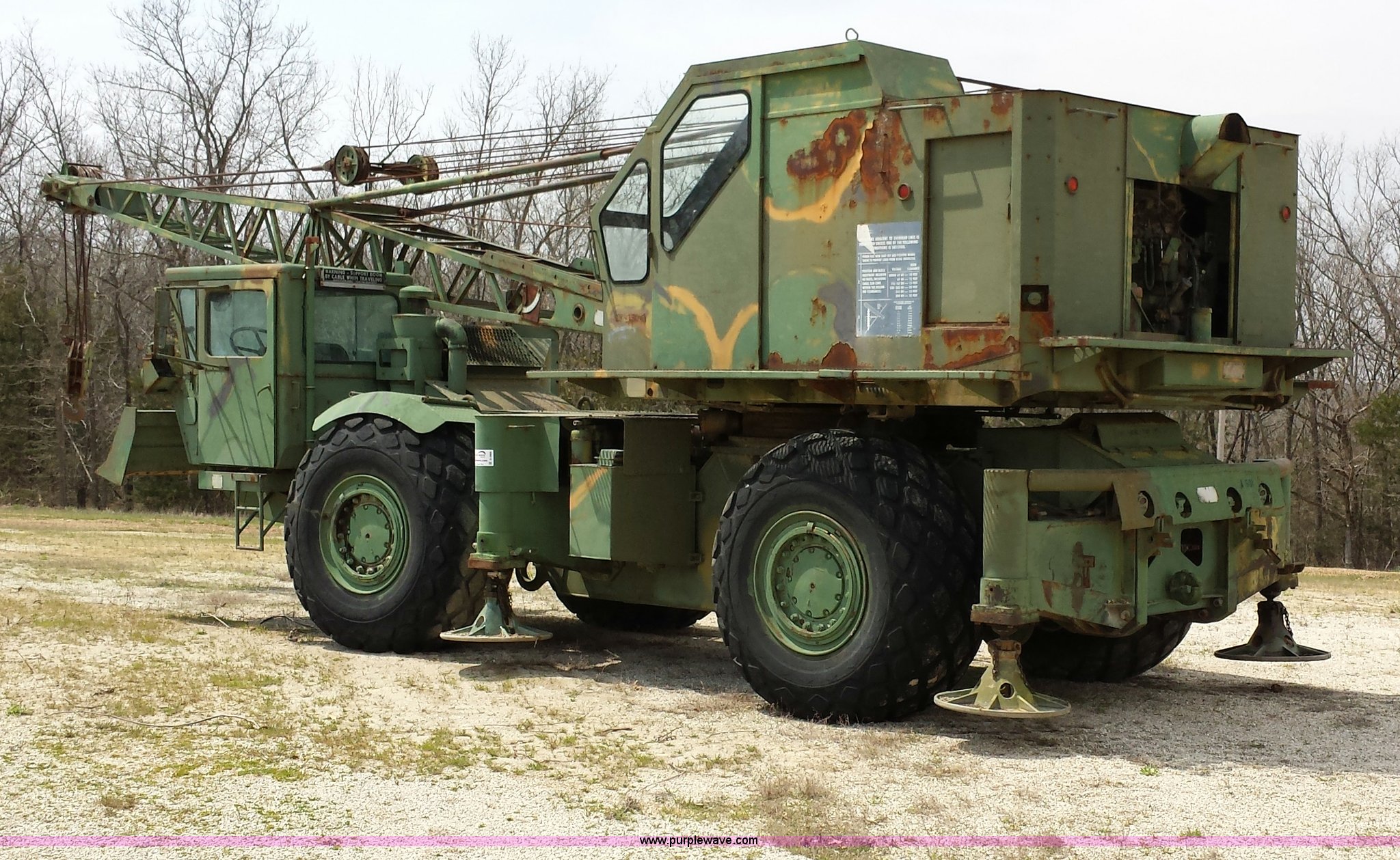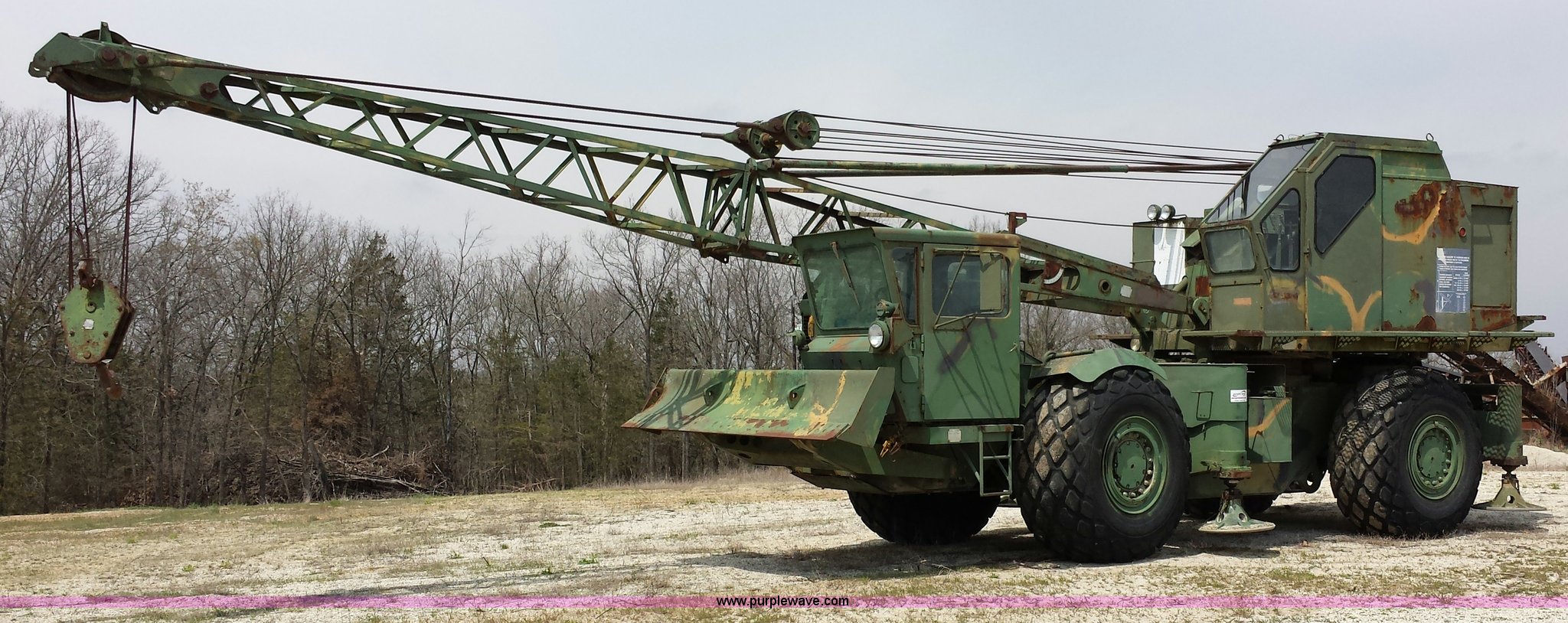 Purple Wave is selling a used Truck Crane in Missouri. This item is a American 2380 20 ton military crane with the following: 339 actual hours on carrier, 287 actual hours on crane, Cummins 265 C.I.D V8 diesel carrier engine, Cummins inline six cylinder diesel crane engine, 36'L boom, 5/8" cable with double drum, 20 ton shive block, 126" knock down blade, 360 degree continuous pivot, (4) hydraulic outriggers, Rear pintle hitch, Trailer wiring, Air brakes for trailer, 26.5-25 tires, 61,500 lbs. base operating weight, Serial GS9139W