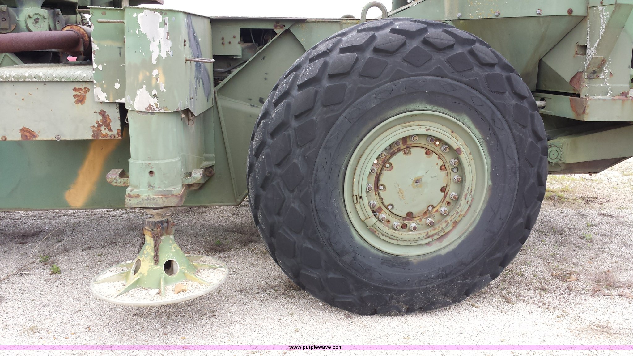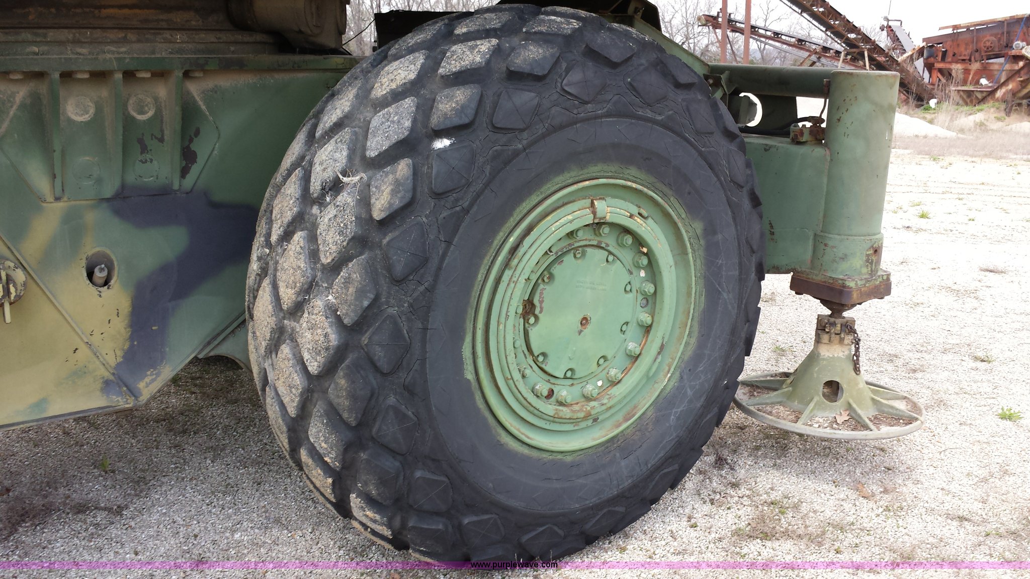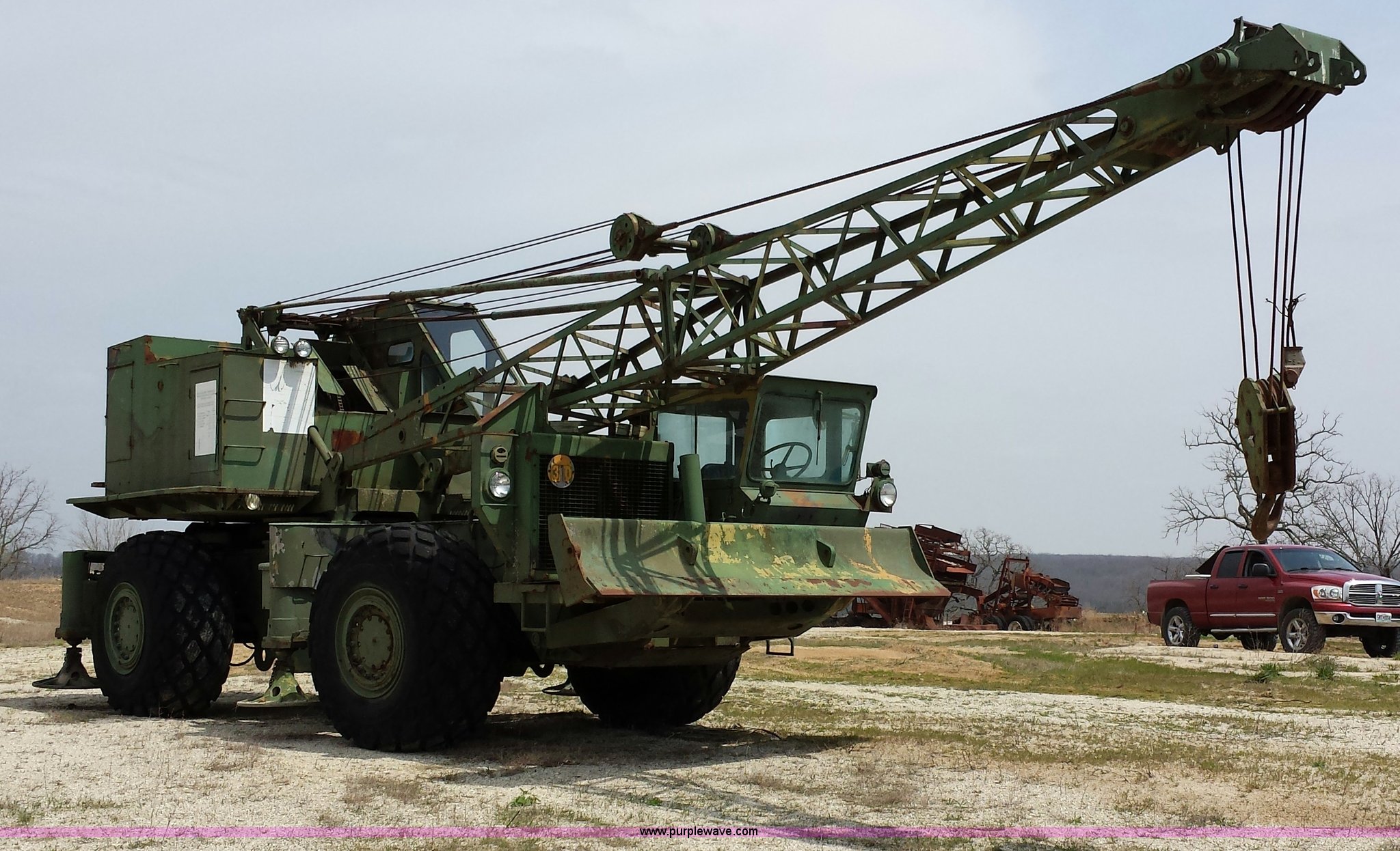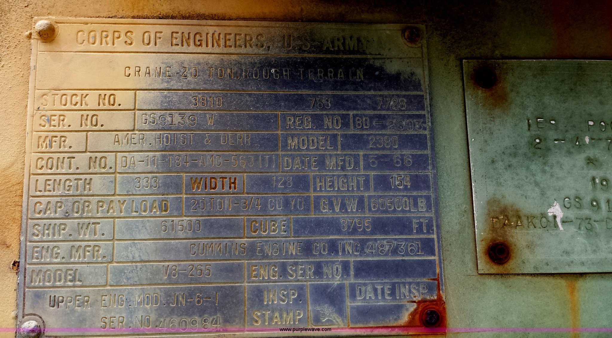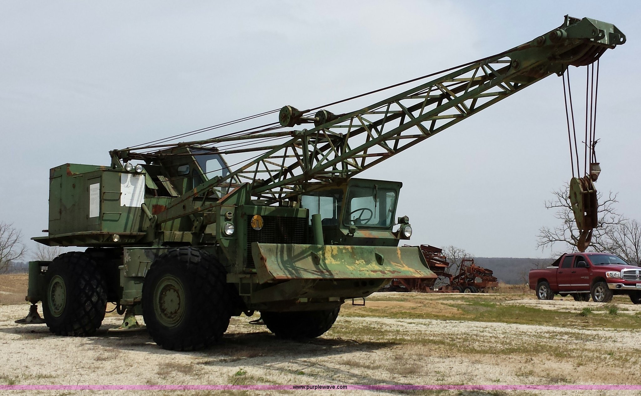 Purple Wave is selling a used Truck Crane in Missouri. This item is a American 2380 20 ton military crane with the following: 339 actual hours on carrier, 287 actual hours on crane, Cummins 265 C.I.D V8 diesel carrier engine, Cummins inline six cylinder diesel crane engine, 36'L boom, 5/8" cable with double drum, 20 ton shive block, 126" knock down blade, 360 degree continuous pivot, (4) hydraulic outriggers, Rear pintle hitch, Trailer wiring, Air brakes for trailer, 26.5-25 tires, 61,500 lbs. base operating weight, Serial GS9139W