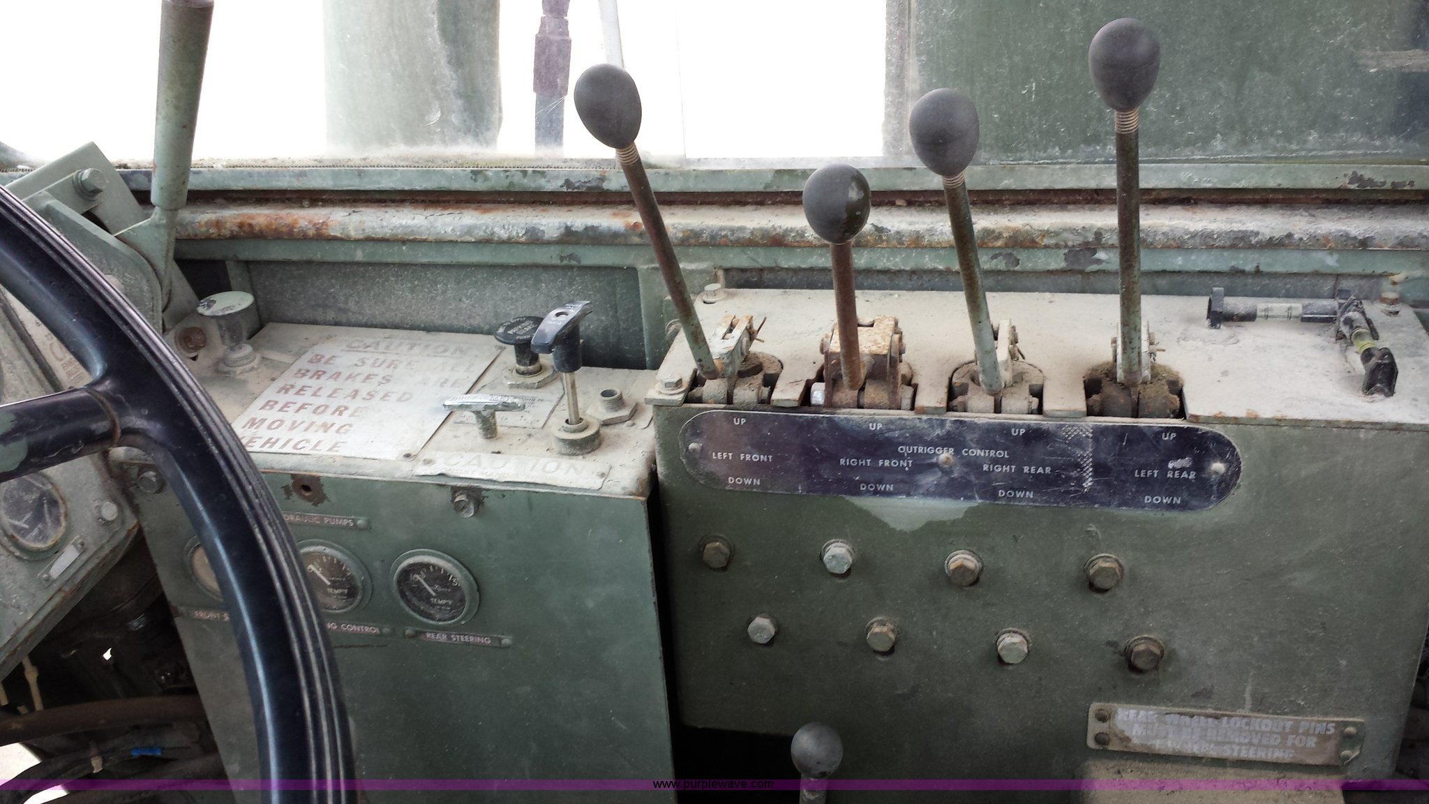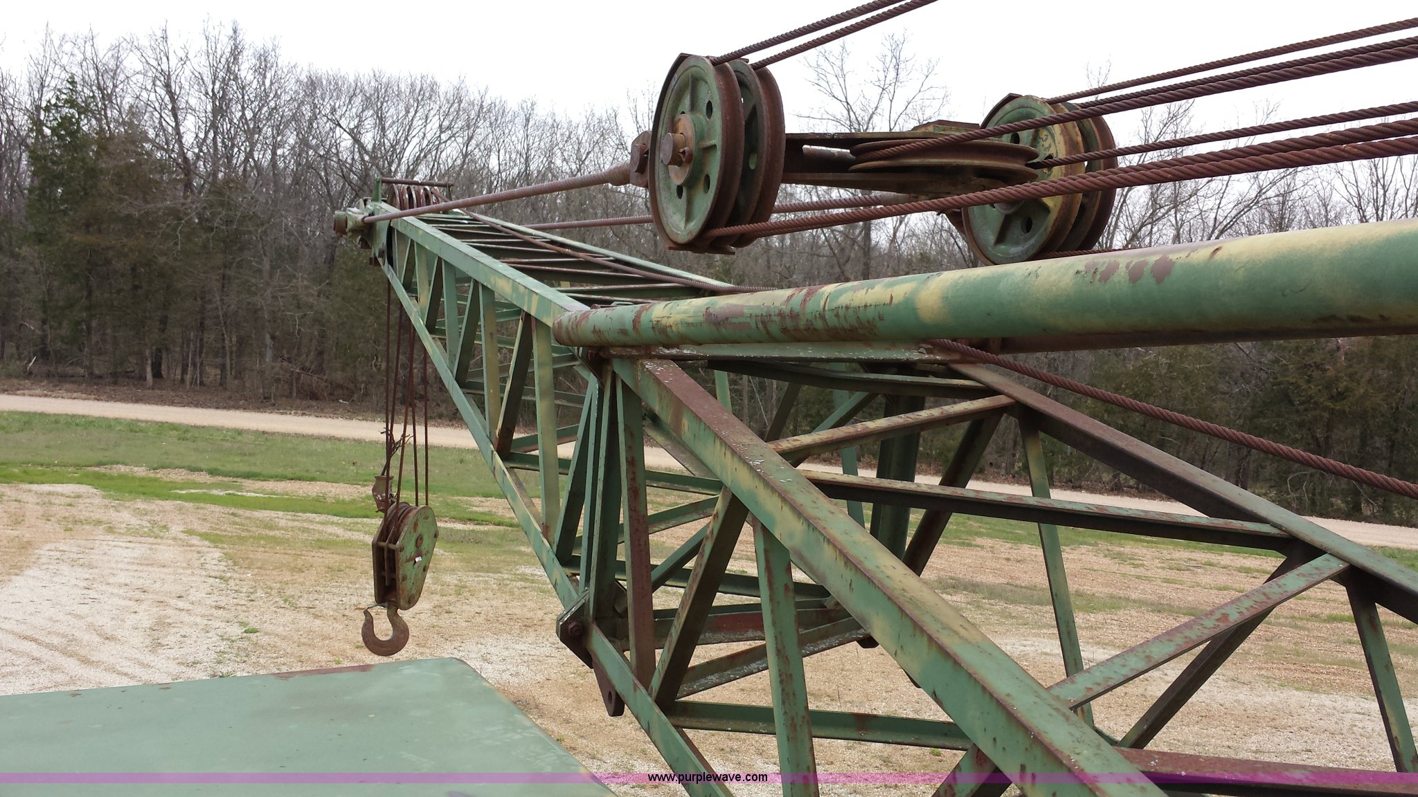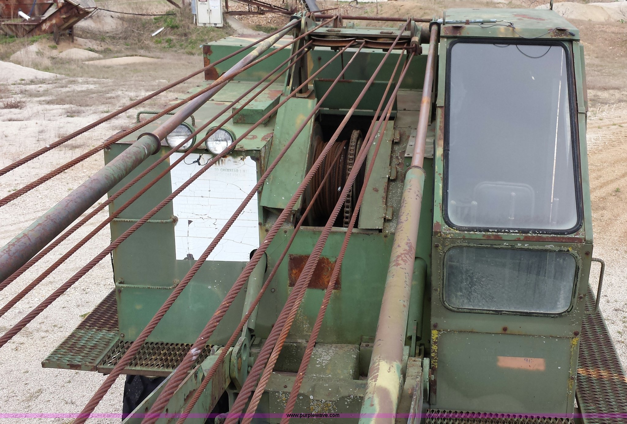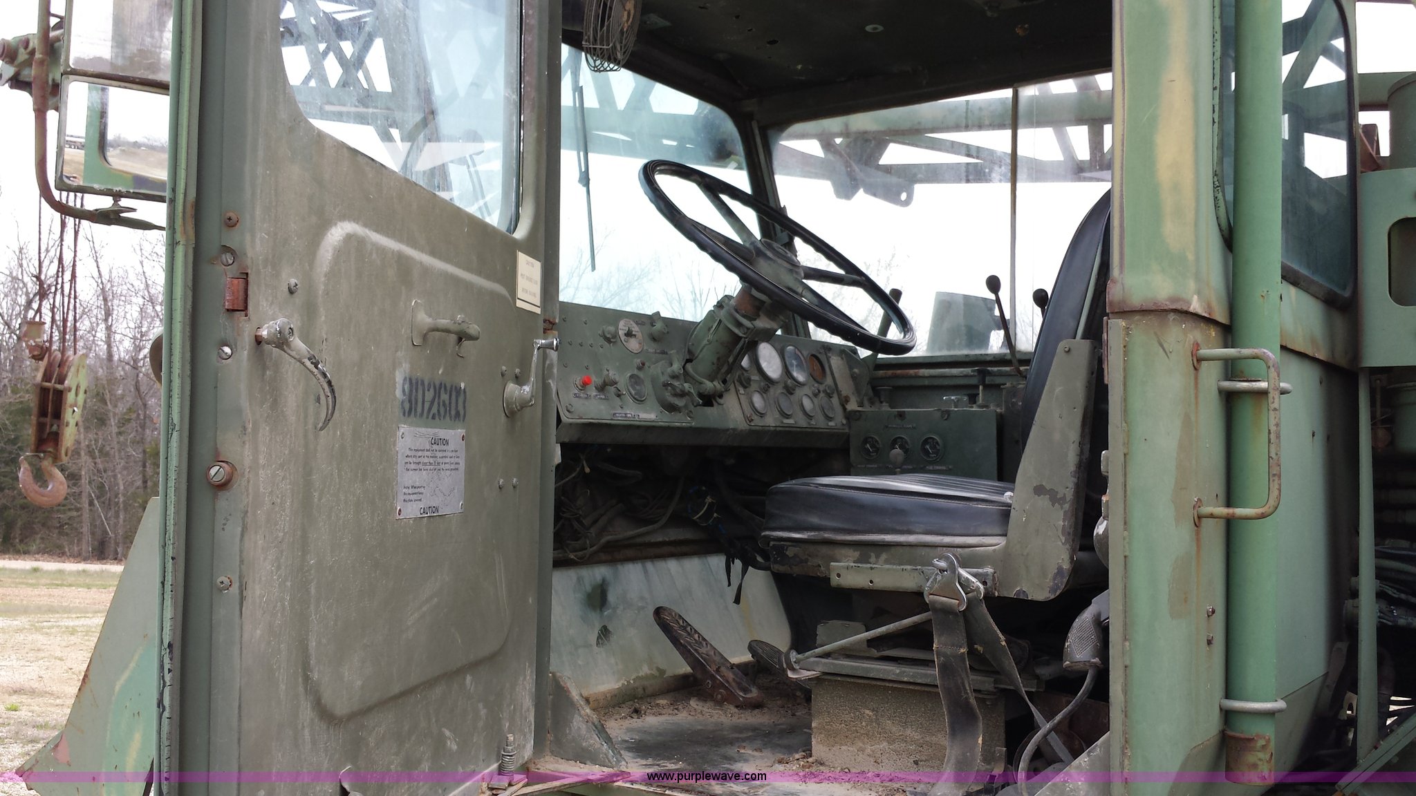 Purple Wave is selling a used Truck Crane in Missouri. This item is a American 2380 20 ton military crane with the following: 339 actual hours on carrier, 287 actual hours on crane, Cummins 265 C.I.D V8 diesel carrier engine, Cummins inline six cylinder diesel crane engine, 36'L boom, 5/8" cable with double drum, 20 ton shive block, 126" knock down blade, 360 degree continuous pivot, (4) hydraulic outriggers, Rear pintle hitch, Trailer wiring, Air brakes for trailer, 26.5-25 tires, 61,500 lbs. base operating weight, Serial GS9139W