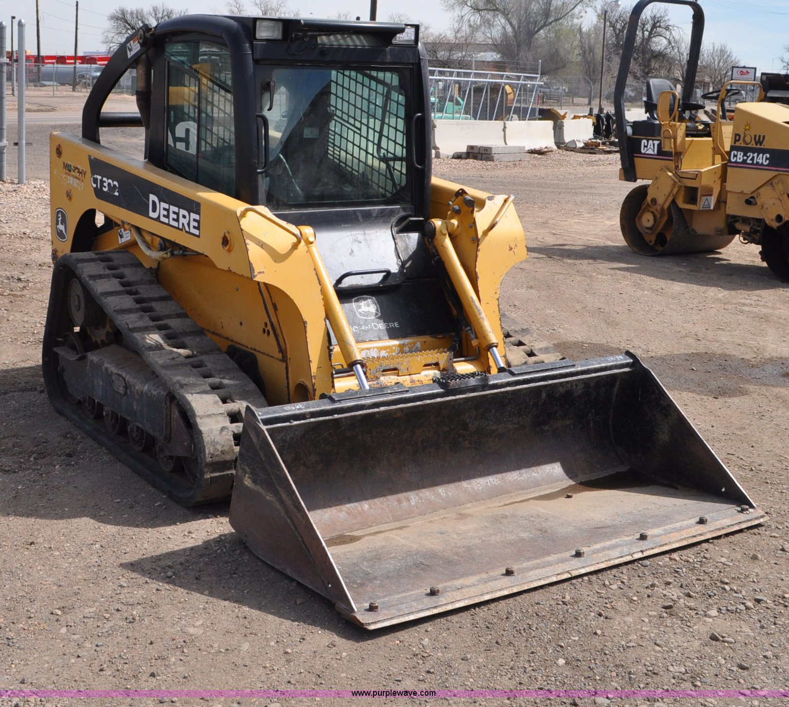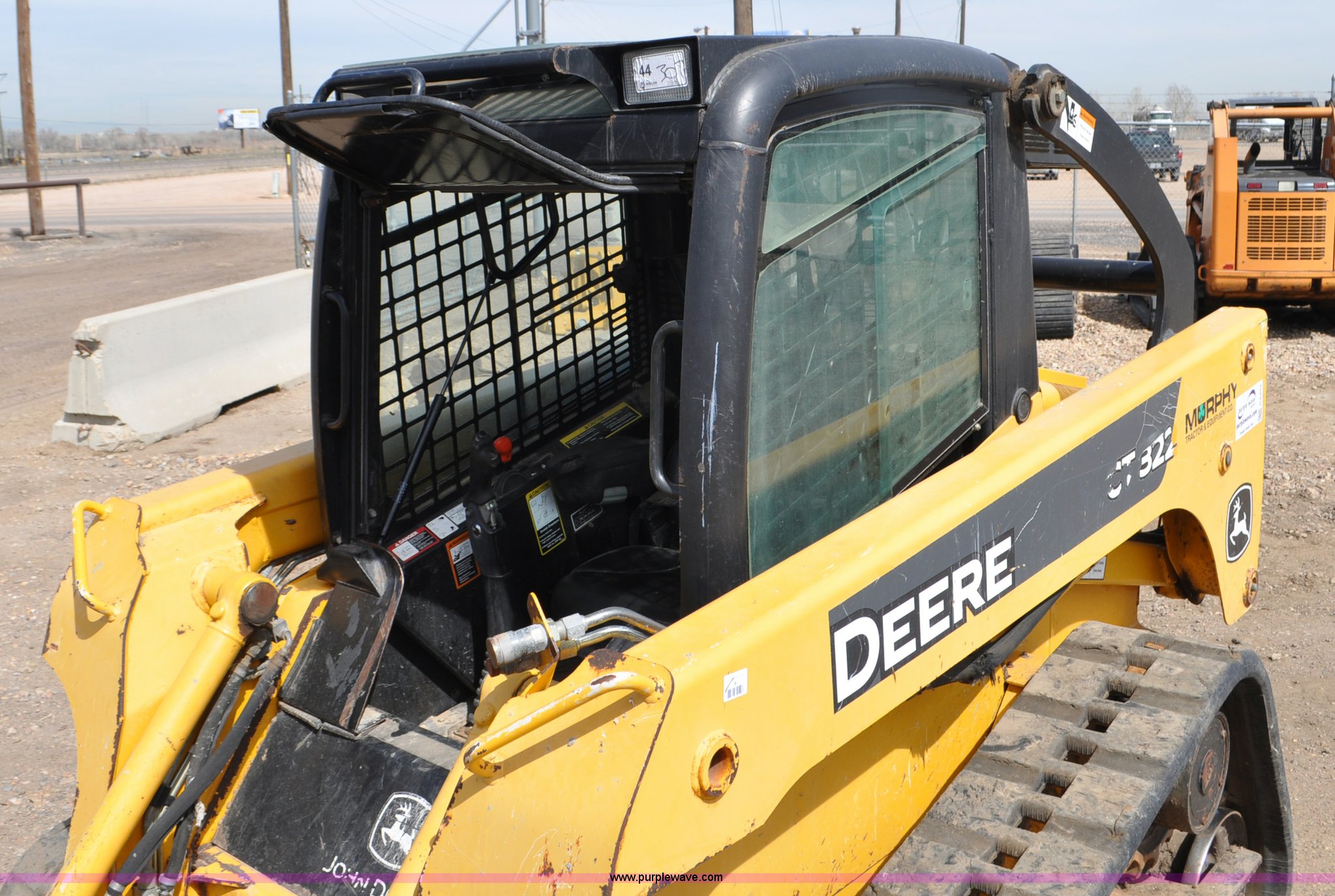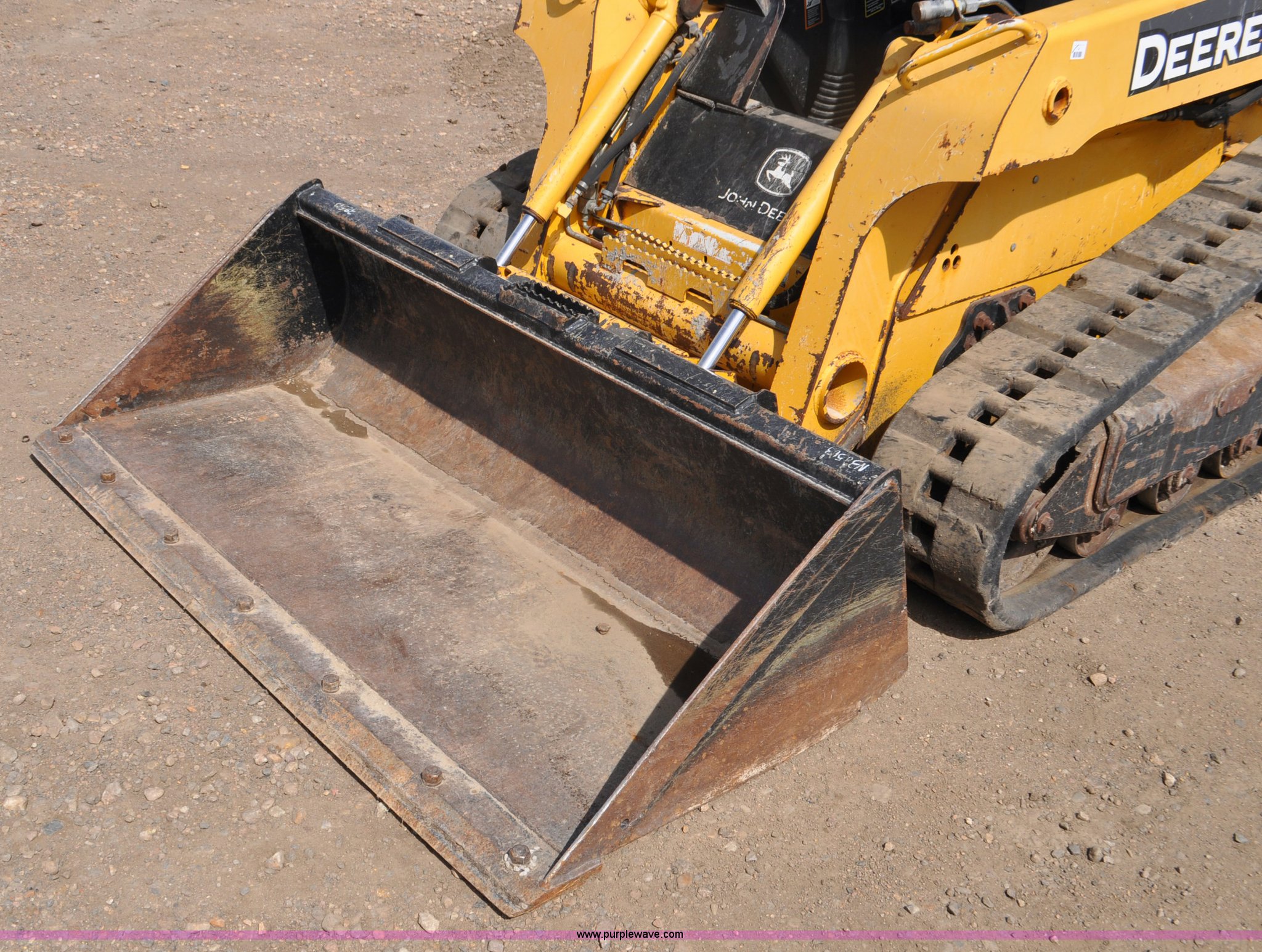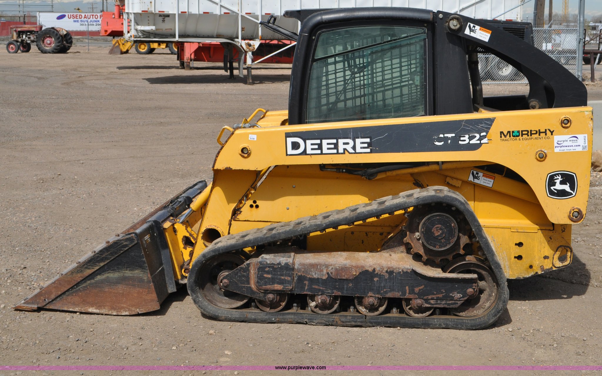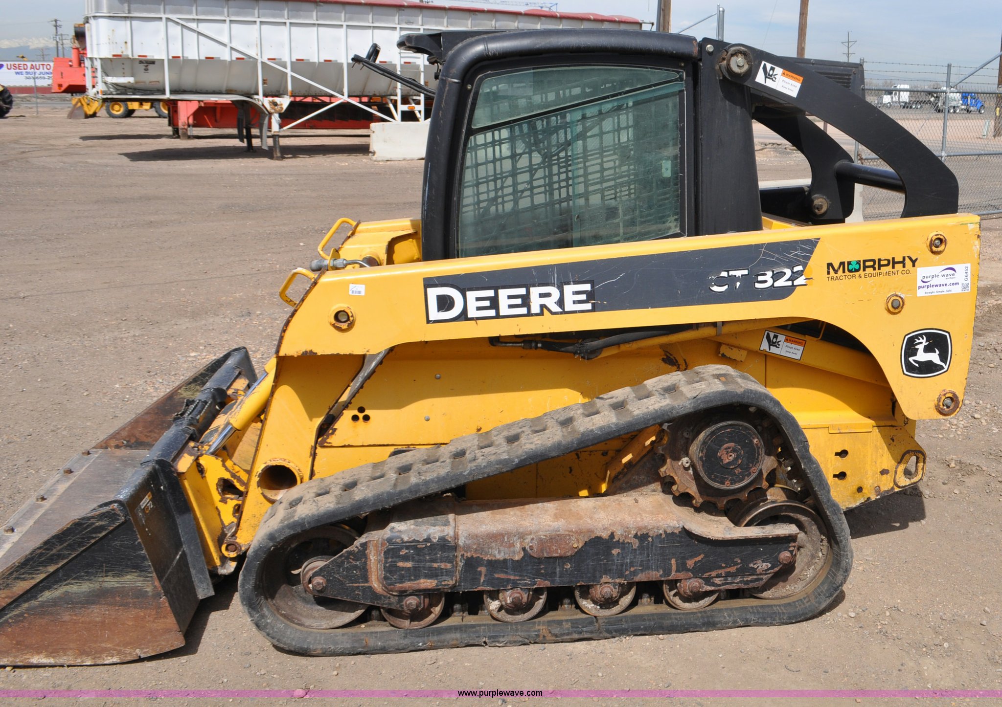 Purple Wave is selling a used Tracked Skid Steer Loader in Colorado. This item is a 2009 John Deere CT322 skid steer with the following: 1,746 hours on meter, John Deere 4024T four cylinder turbo diesel engine, 66 HP, Hydrostatic transmission, Enclosed cab, AC and heat, Wipers, Joystick bucket controls, Spring suspension seat, Auxiliary hydraulics, John Deere C72 Worksite 70"W bucket, Bolt-on cutting edge, Front and rear work lights, Four bottom rollers, 12"W track pads, Serial T0322TB116613