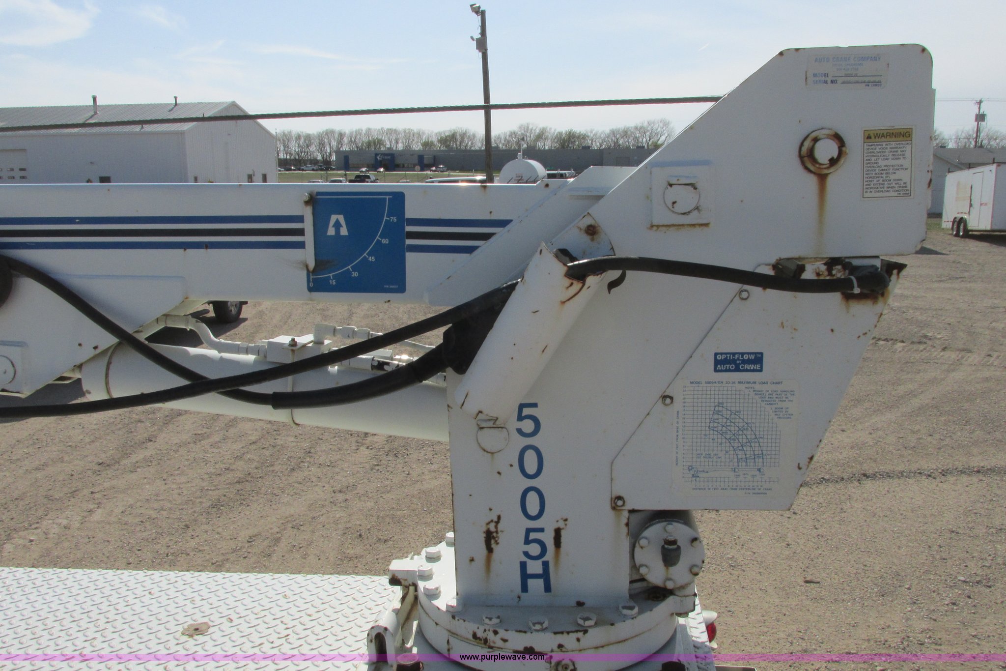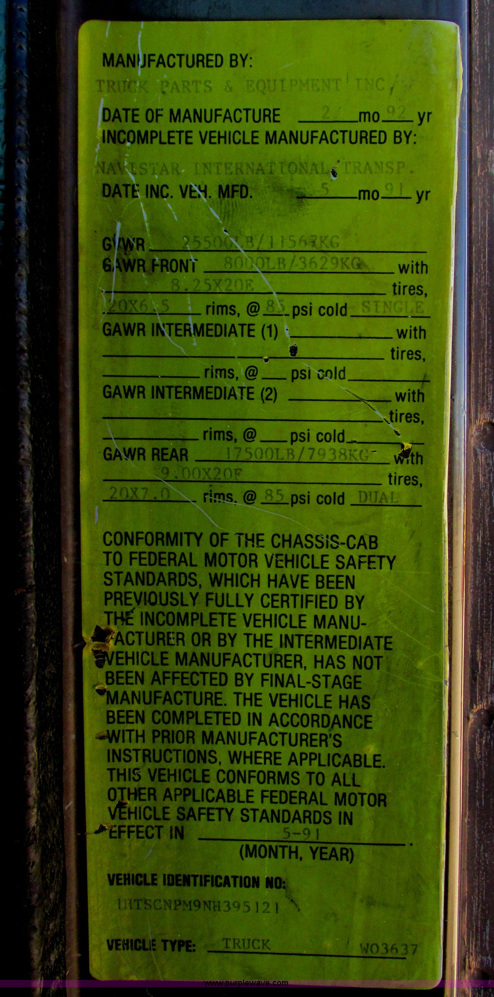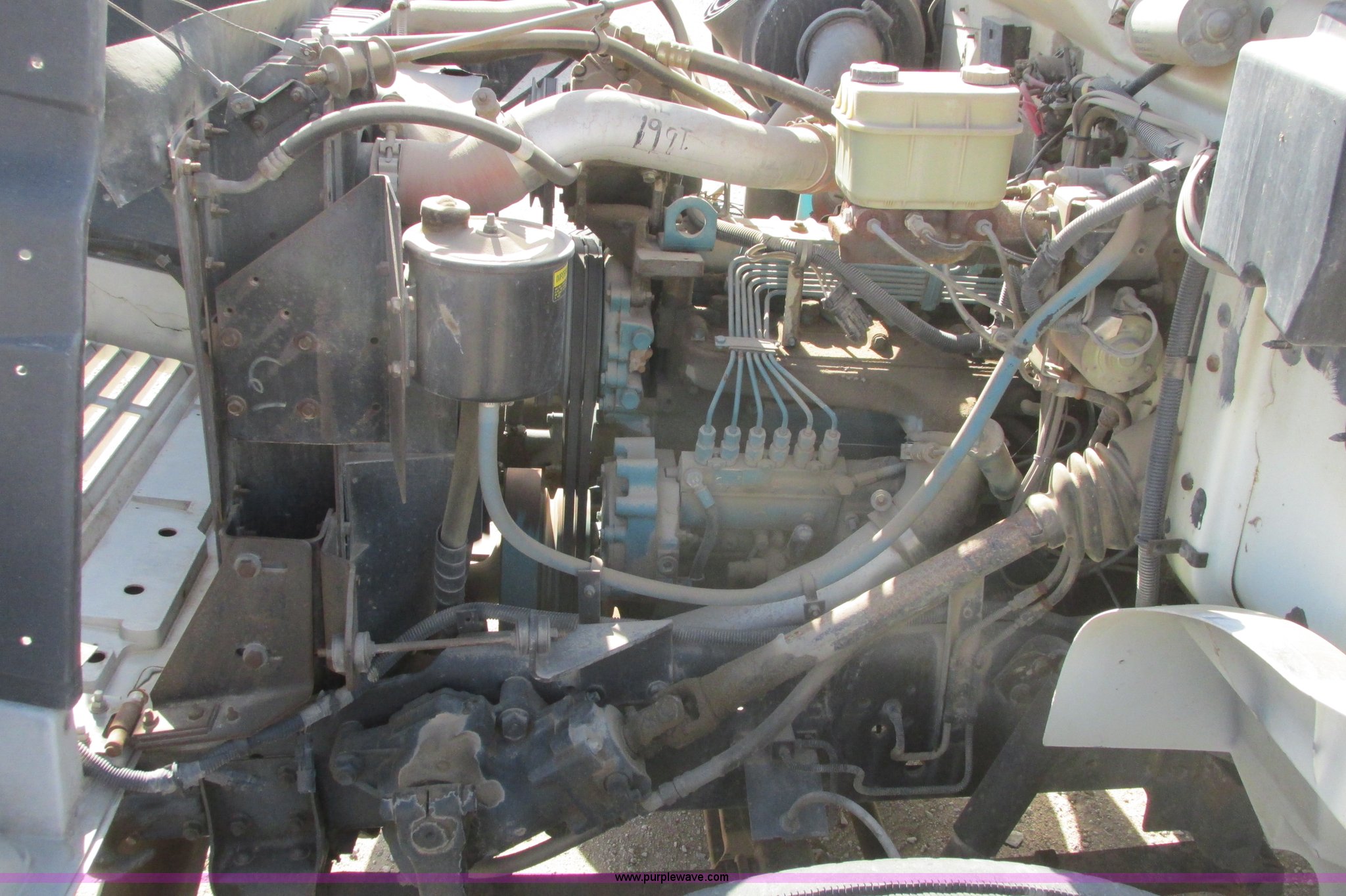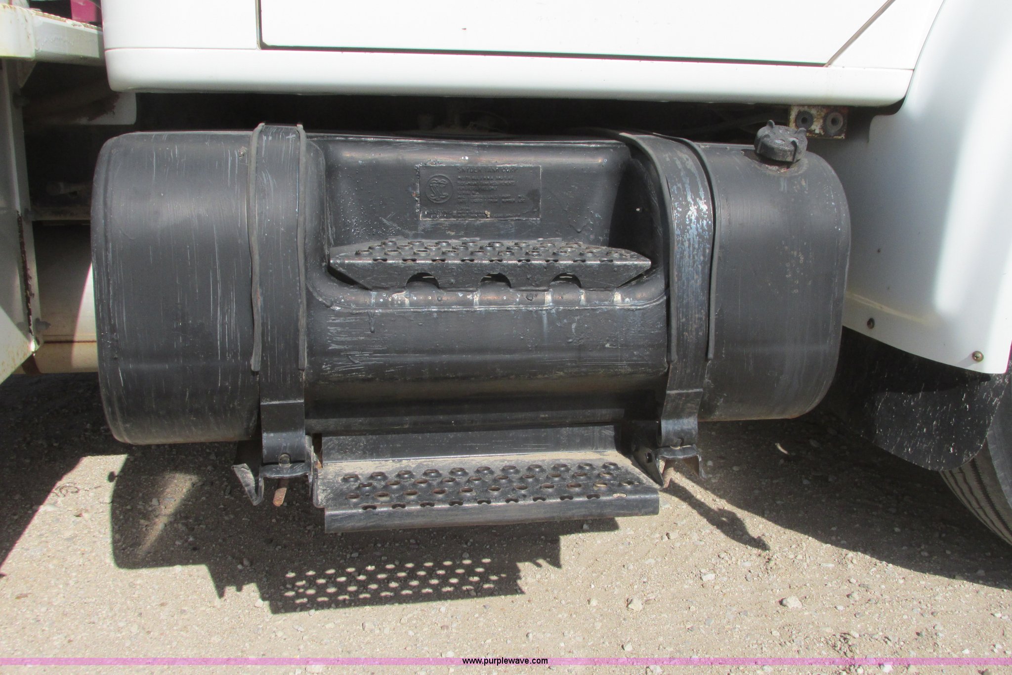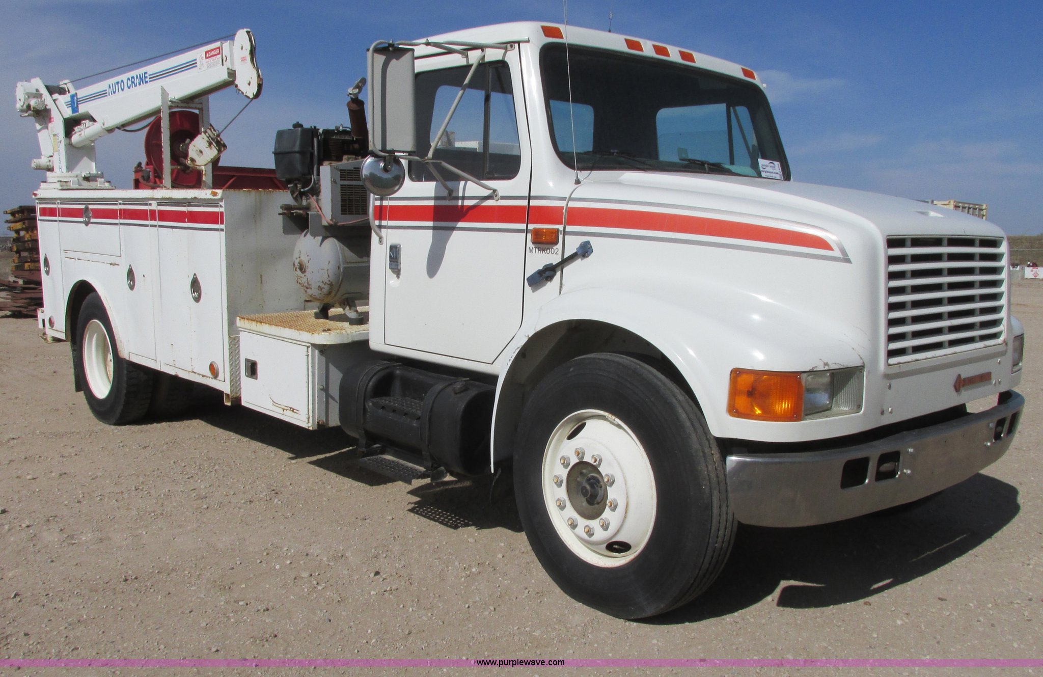 1992 International 4700 service truck. 110,160 miles on odometer, 4,296 hours on meter, International DT360 5.9L L6 diesel engine 180 HP, Spicer Double Duty D 10 speed manual transmission, AC and heat, JVC AM/FM/cassette, Manual windows and locks, Vinyl interior, Turner 84-54-2T utility bed 12'L x 93"W, Serial 89234311, Step up bumper, Manual rear outriggers, (8) tool cabinets, Diamond plate floor, Outlets at rear of bed, Auto Crane 5005H-PE telescopic crane Oscillating, 5,000 lbs block/hook, Thermal Arc TA-10/270 welder generator 727 hours on meter, AC/DC-CC/CV, 115/230V, 460 AC three phase, Leads, Ingersoll Rand T30 air compressor Kohler Magnum 10 gas engine, Twin cylinder compressor, Chelsea PTO, Dual fuel tanks, Receiver hitch, Trailer wiring, 218" wheelbase, 10R22.5 tires 12 ply, GVWR 25,500 lbs, FAWR 8,000 lbs, RAWR 17,500 lbs, FHWA annual inspection completed August 2013, Scratches and dents, Torch bottles are not included. 1HTSCNPM9NH395121. UCI. 1850 S Hoover. Wichita, KS 67209