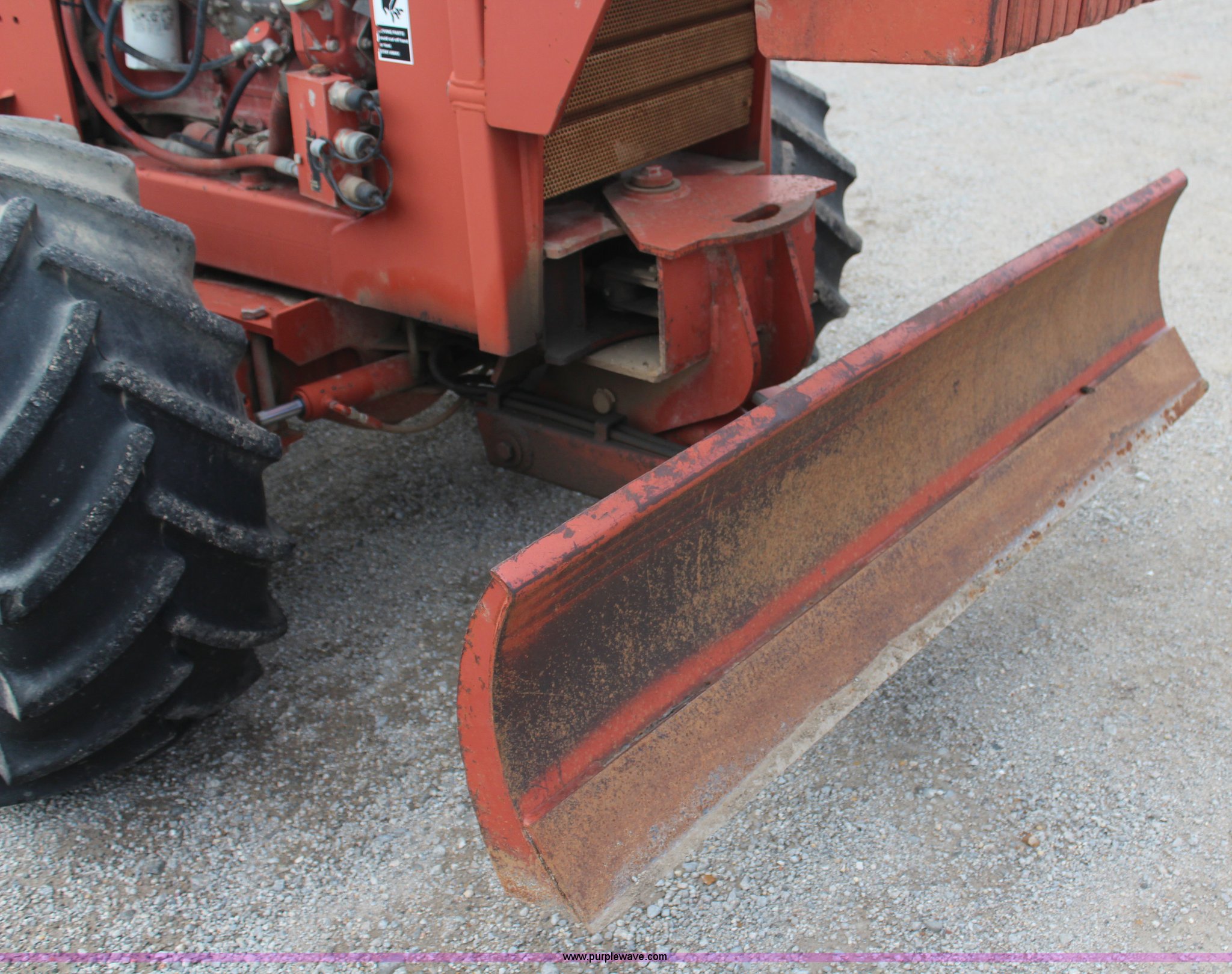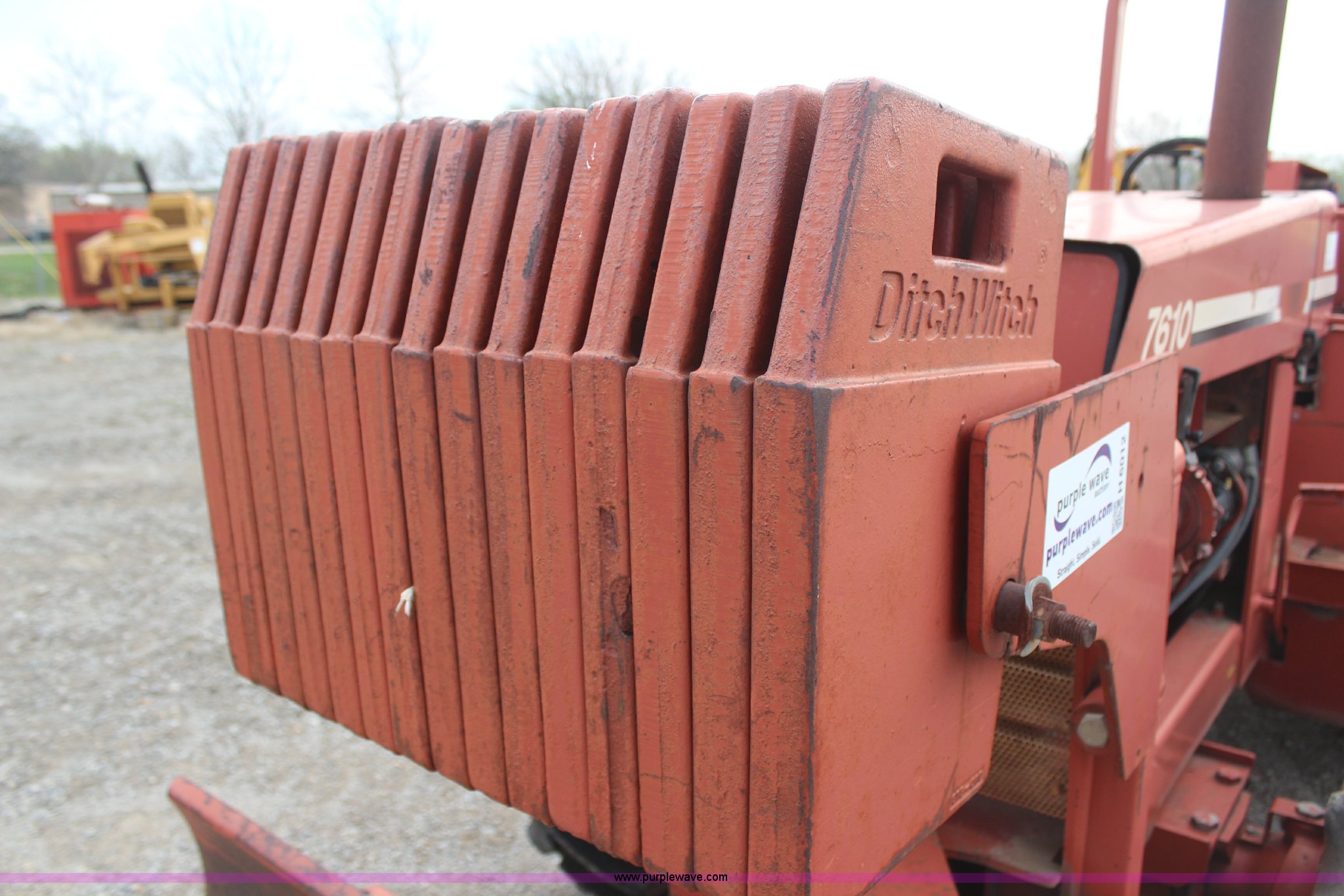 Purple Wave is selling a used Trencher or Rock Saw in Kansas. This item is a Ditch Witch 7610 trencher with the following: 246 hours on meter, Deutz four cylinder diesel engine, 72 HP, Four speed manual transmission, Four wheel drive, Four wheel steering, Ditch Witch A655HD trencher, Serial 2N1554, Crumber, 6' maximum digging depth, Left side auger missing, 72" six way back fill blade, Plow mounting bracket, (15) counter weights, 38 x 18.00-20 tires, Serial 5N0520