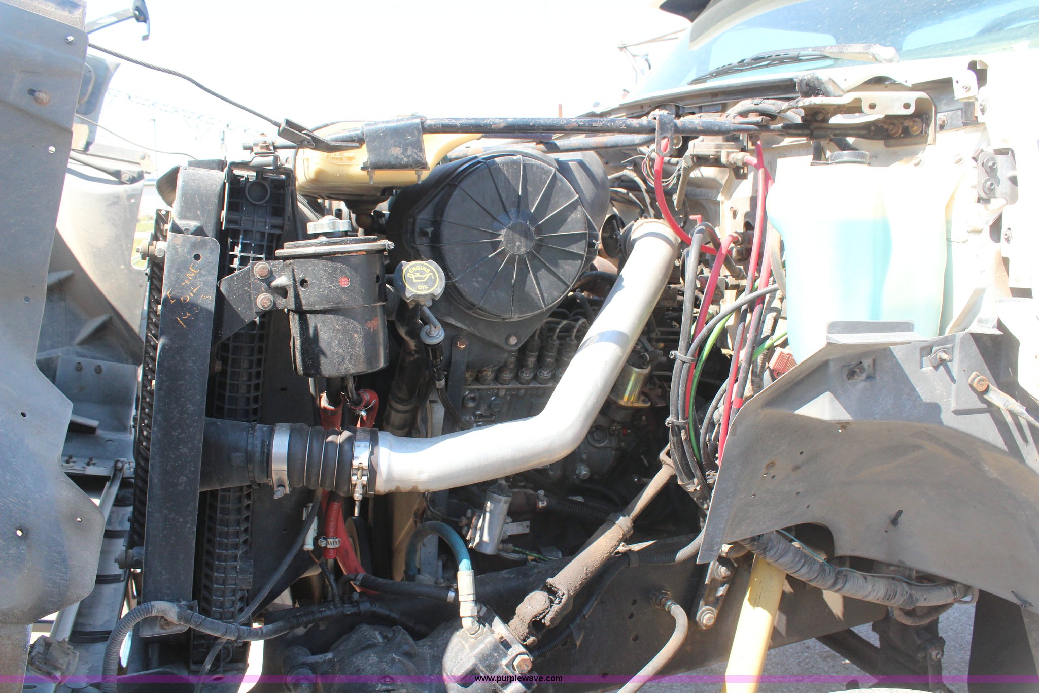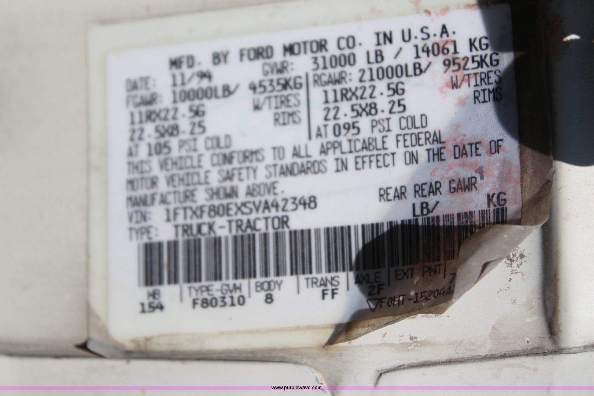 Purple Wave is selling a used Truck Tractor in Kansas. This item is a 1995 Ford F800 semi truck with the following: 56,920 miles on odometer, Cummins ISC 8.3L L6 turbo diesel engine, Road Ranger nine speed manual transmission, AC and heat, Air suspension seat, Chrome bumper, Dual 50 gallon fuel tanks, Aluminum deck plate, Stainless steel quarter fenders, Spring suspension, Air brakes, Aluminum wheels, 11R22.5 tires, GVWR 31,000 lbs, FAWR 10,000 lbs, RAWR 21,000 lbs, Seat torn