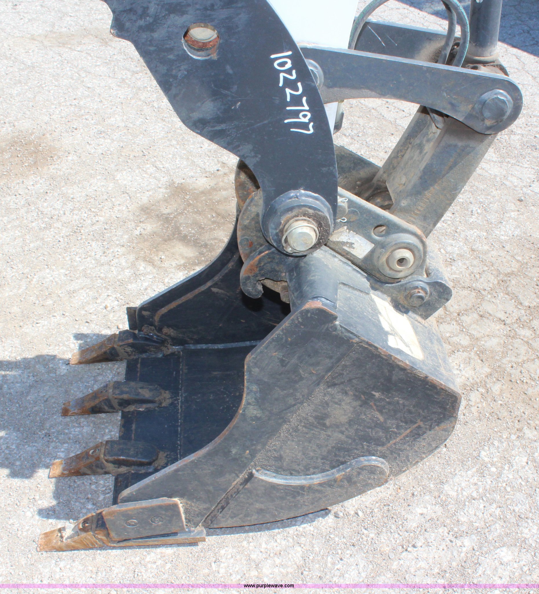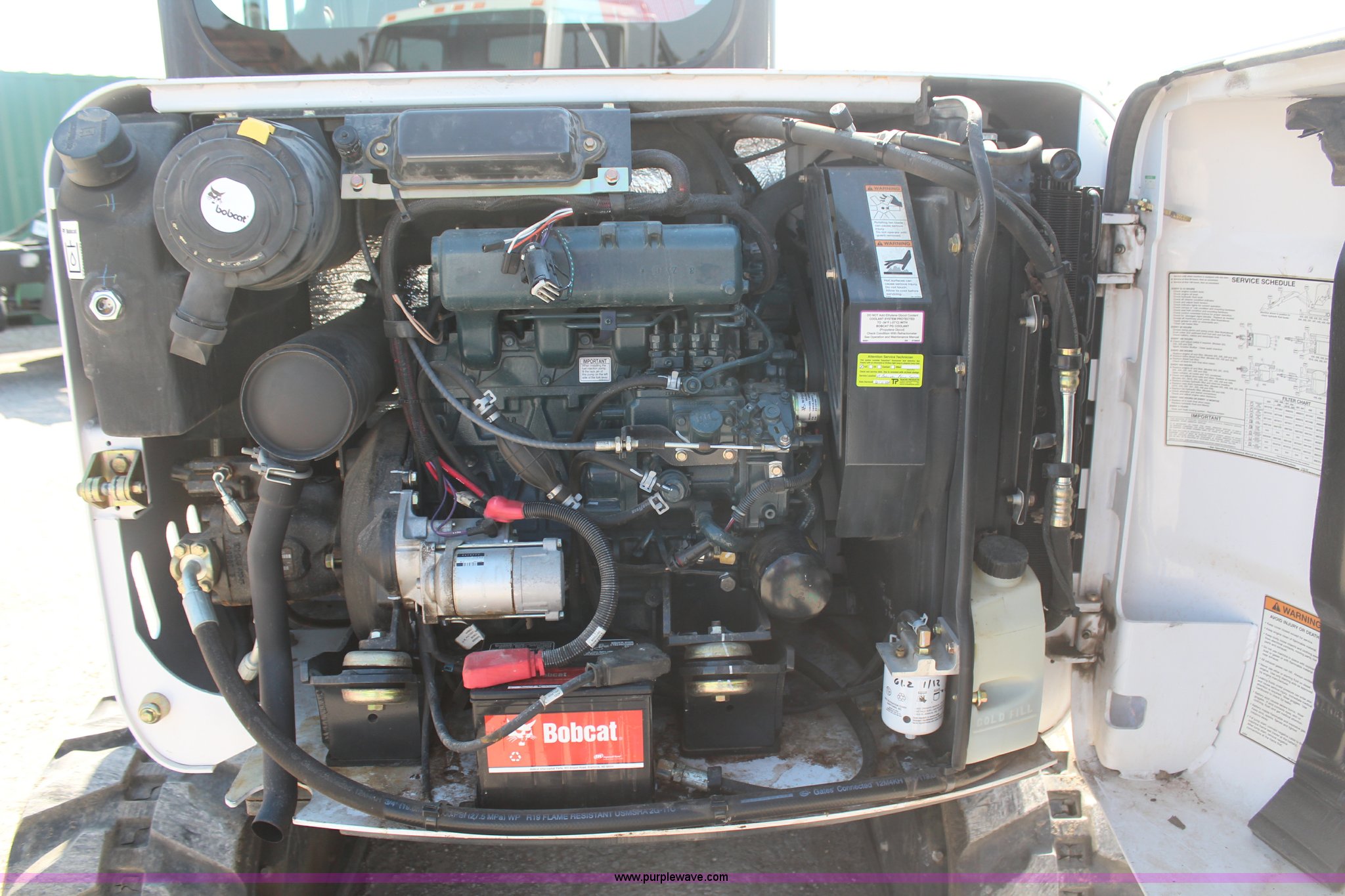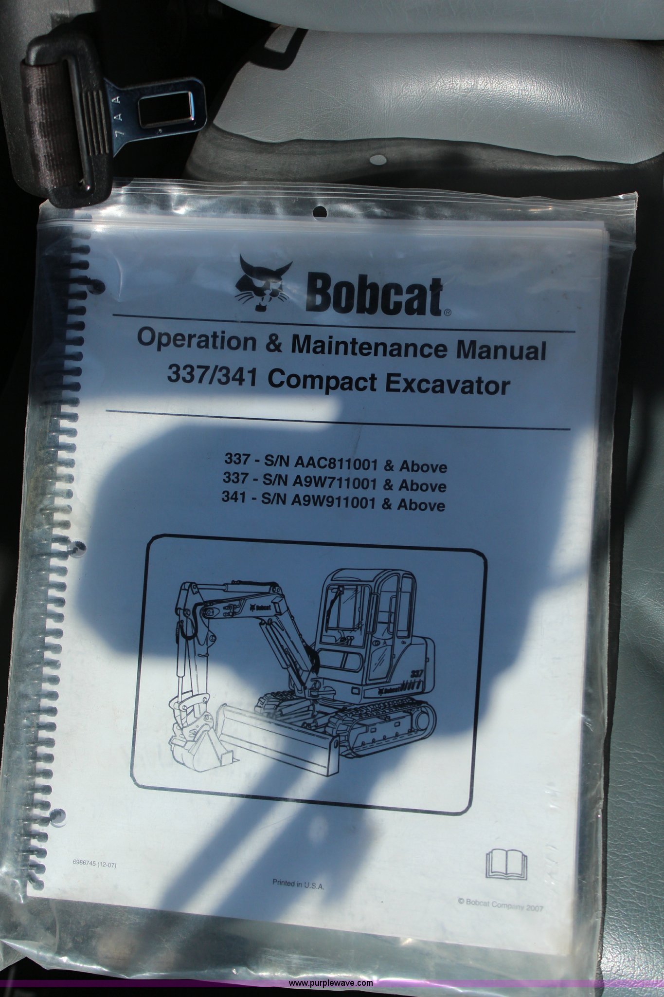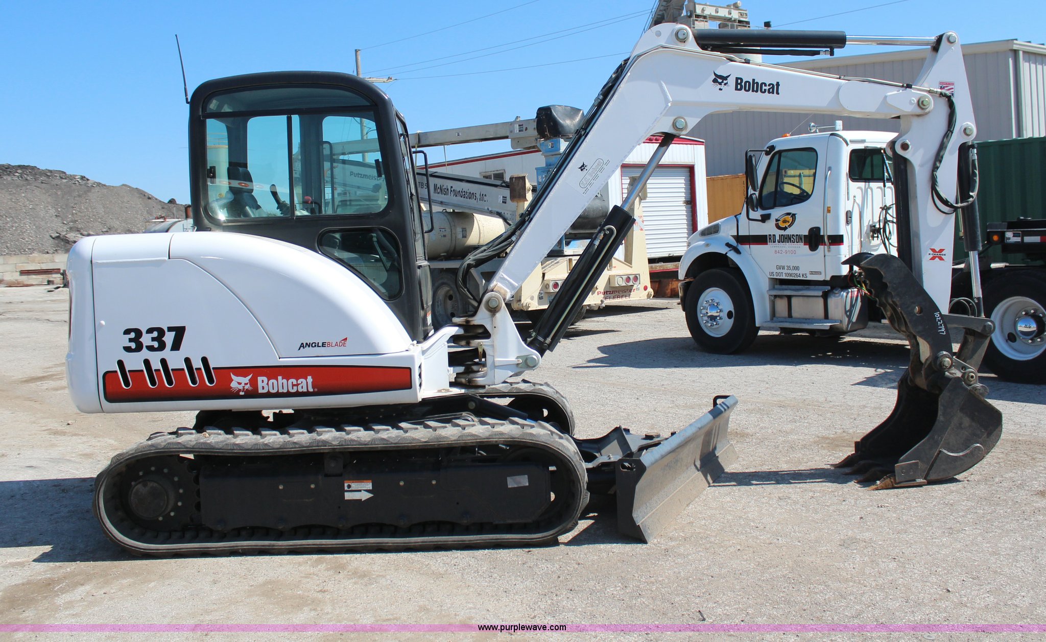 Purple Wave is selling a used Mini Excavator in Kansas. This item is a 2008 Bobcat 337G compact excavator with the following: 71 actual hours, Kubota V2403-T four cylinder diesel engine, 47 HP, Hydrostatic transmission, Glow plugs, Enclosed cab, AC and heat, AM/FM/weatherband, Spring suspension seat, Windshield wipers, Joystick controls, Pattern changer, Front work lights, 5'L stick, Bobcat hydraulic quick coupler, Hydraulic thumb, Bobcat 24" bucket, Weld-on cutting edge, (4) teeth, 76"W back fill angle blade, 15.5"W rubber tracks, 11,084 lbs. base operating weight, Serial AAC811288