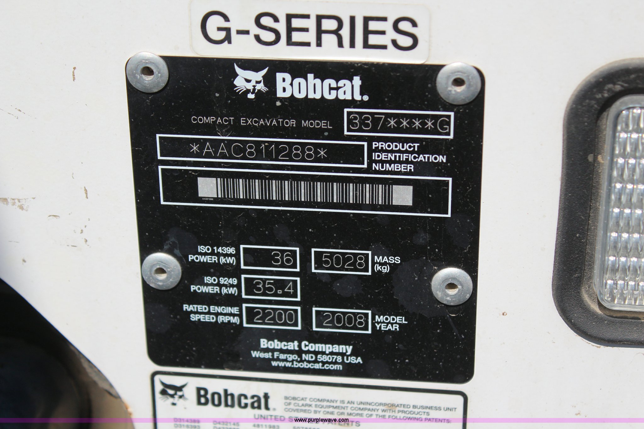 2008 Bobcat 337G compact excavator has sold in Lawrence, Kansas for $42900. Item H6169 sold on May 15th, 2014.