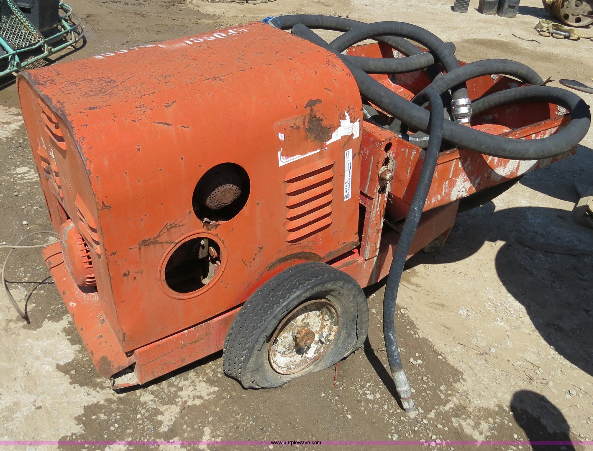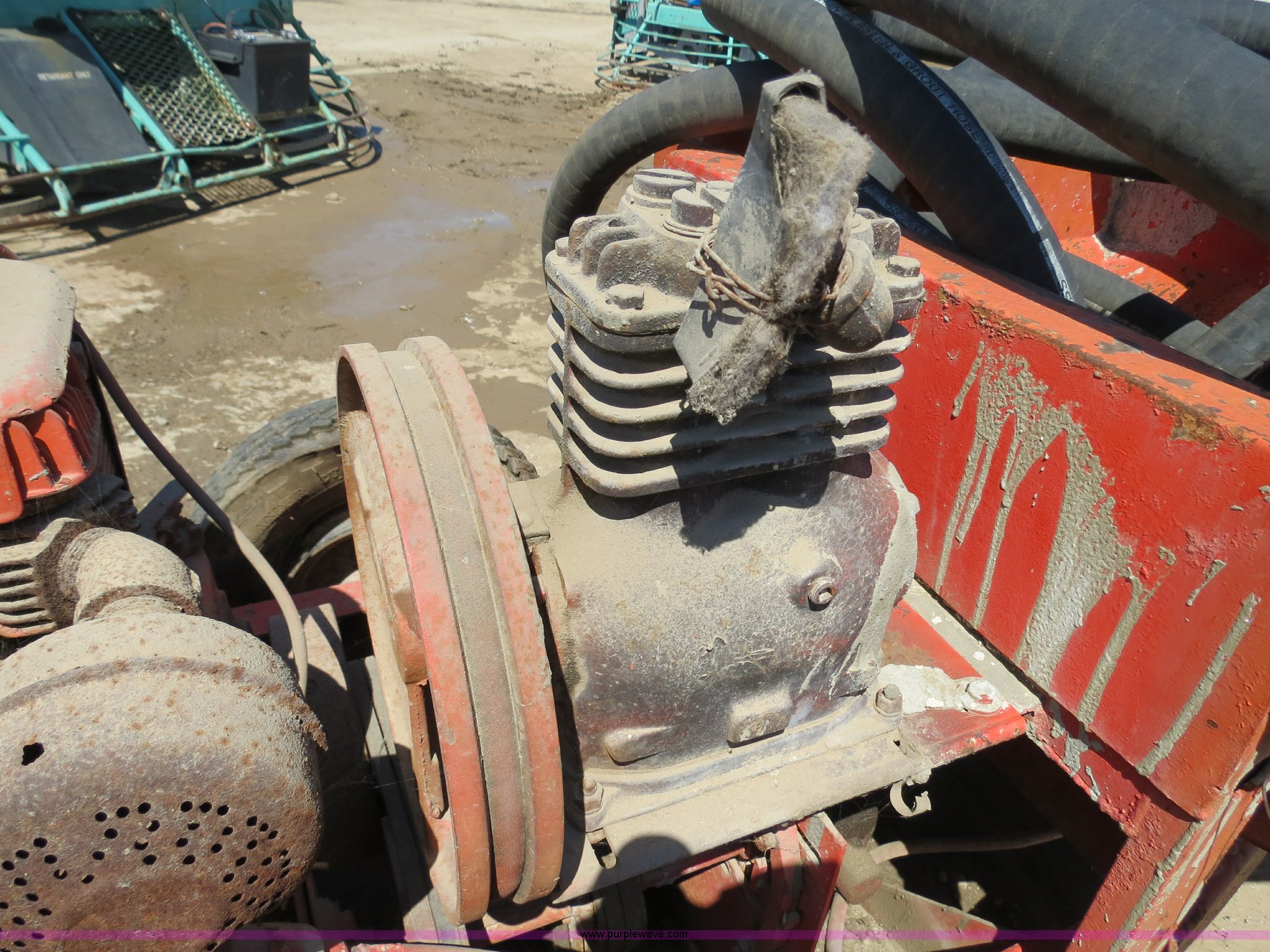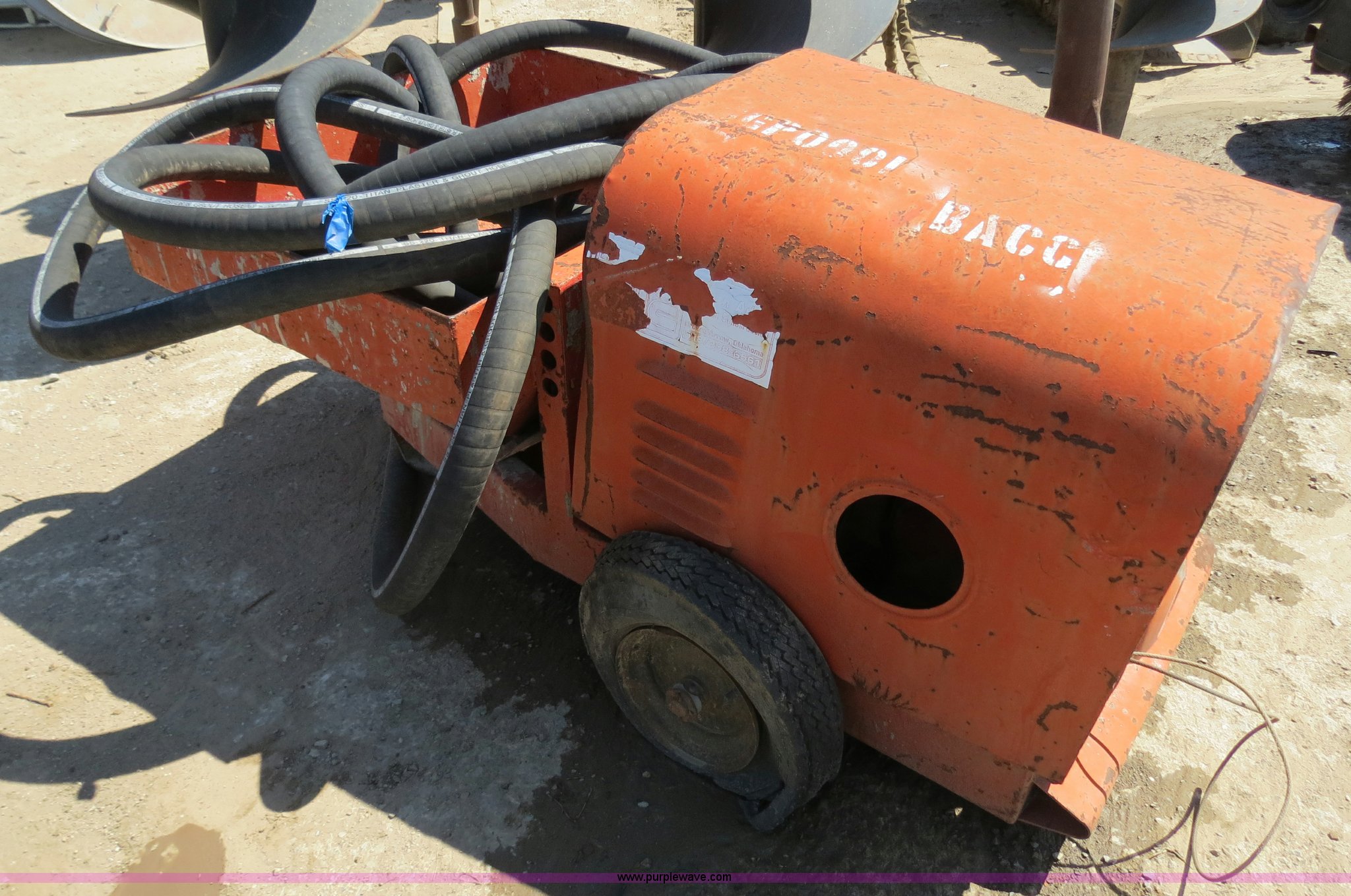 Purple Wave is selling a used Pump in Oklahoma. This item is a Essick grout/plaster/fireproofing pump with the following: Wisconsin AENED2 gas engine, Serial 5884271, 2.5" Titan Plaster & Grout SS220 hose, 34" x 29" hopper