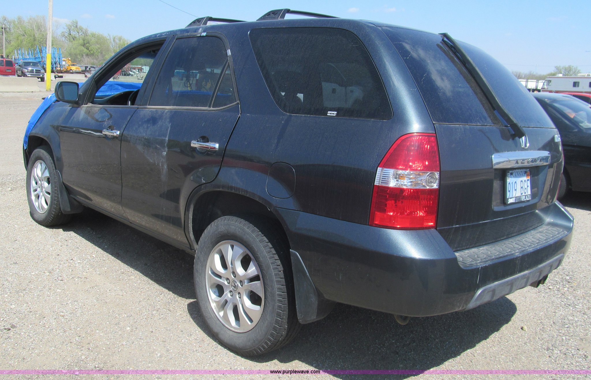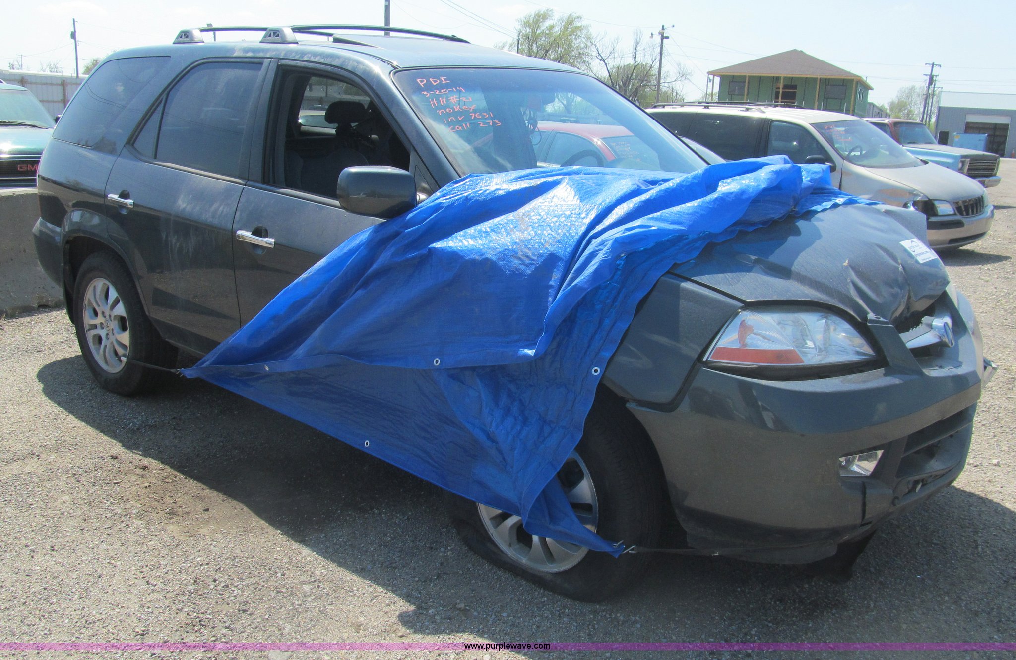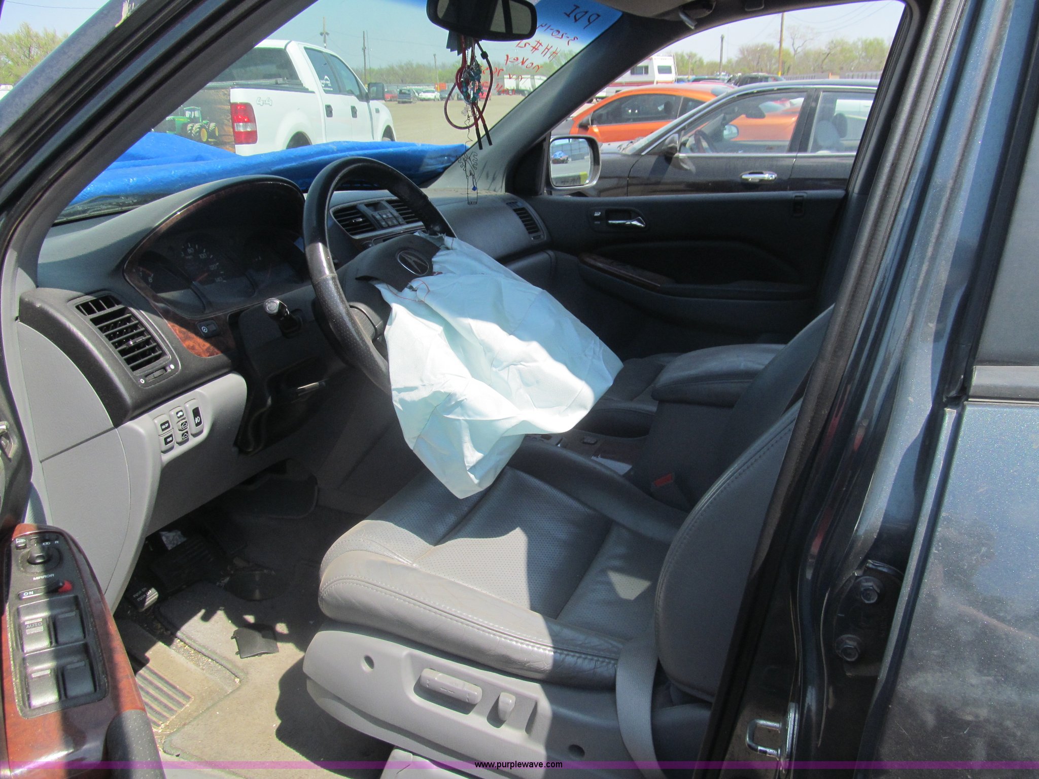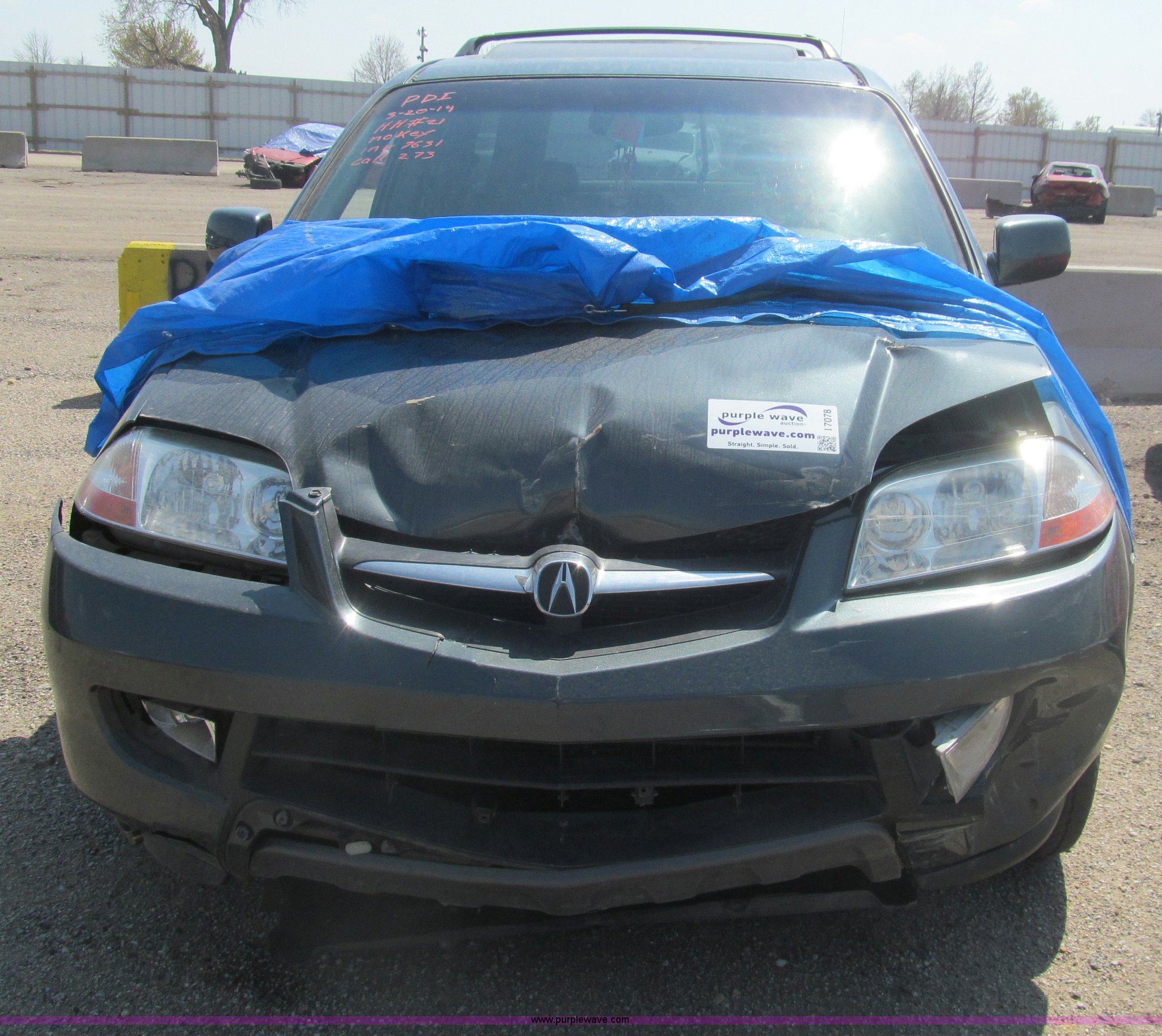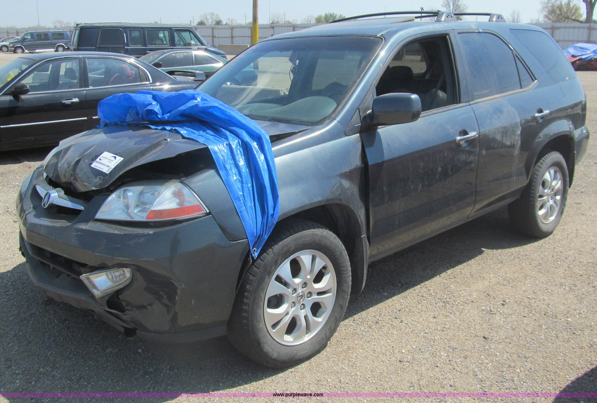 Purple Wave is selling a used Wrecked and Abandoned in Kansas. This item is a 2003 Acura MDX Touring SUV with the following: Unknown miles on odometer, 3.5L V6 SOHC 24V gas engine, Automatic transmission, AM/FM/CD, Power windows, locks, mirrors, and seats, Leather interior, Navigation system, Sunroof, 235/65R17 tires, Front collision damage, One tire flat, Front windows are down, Air bags deployed, Case# 14C017578