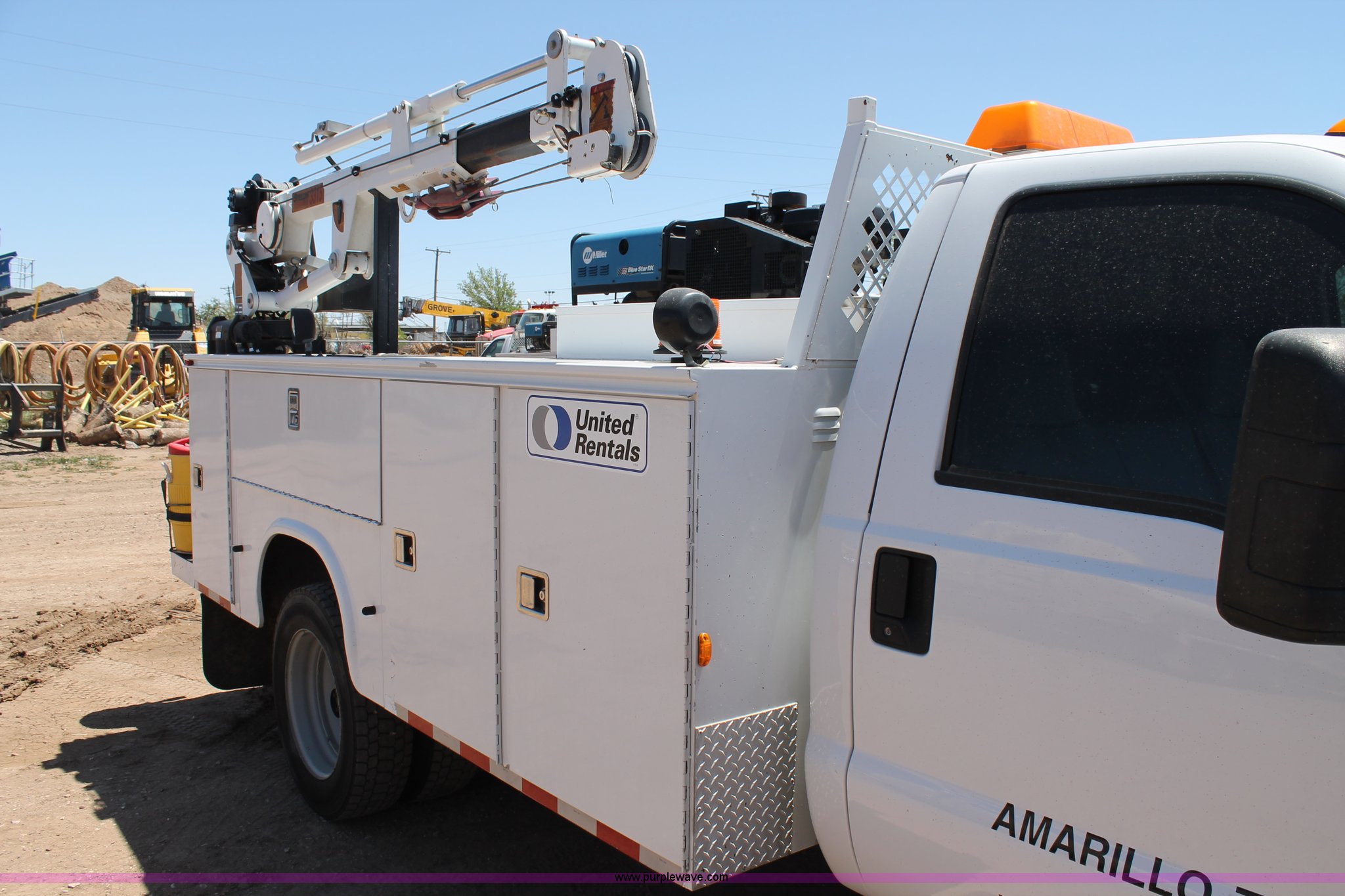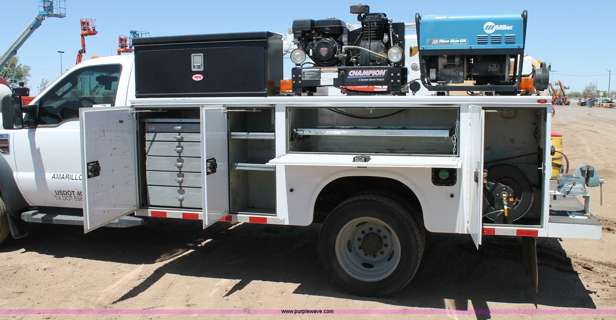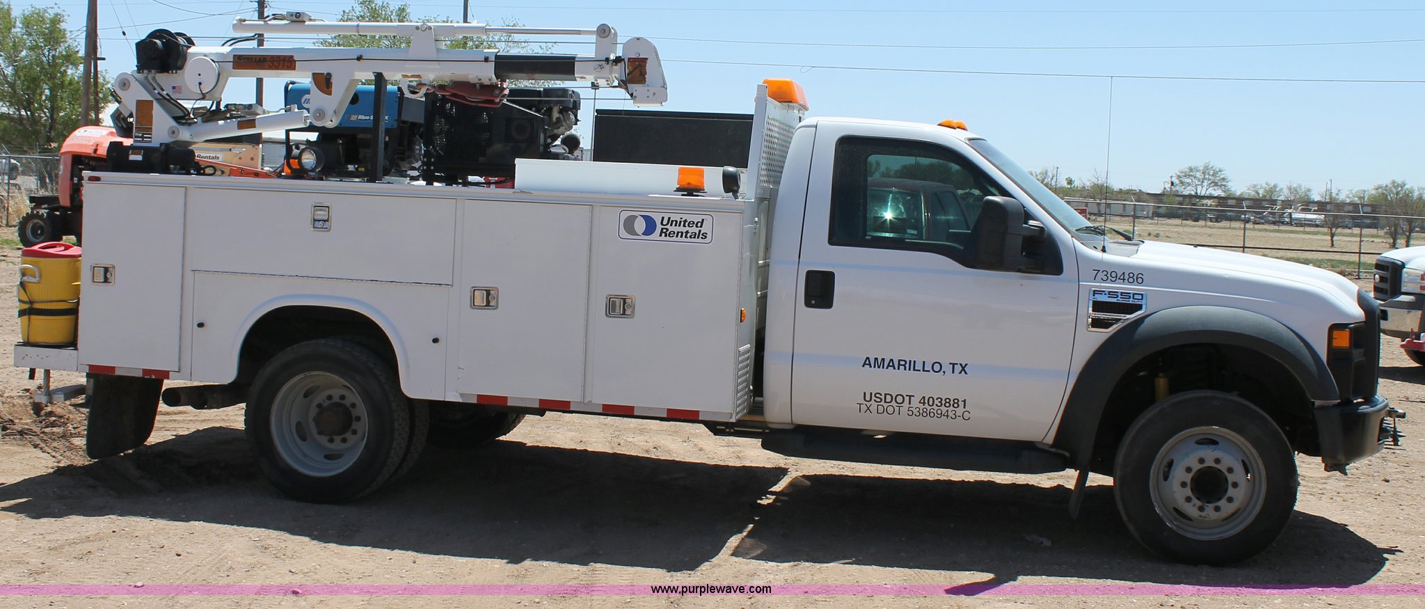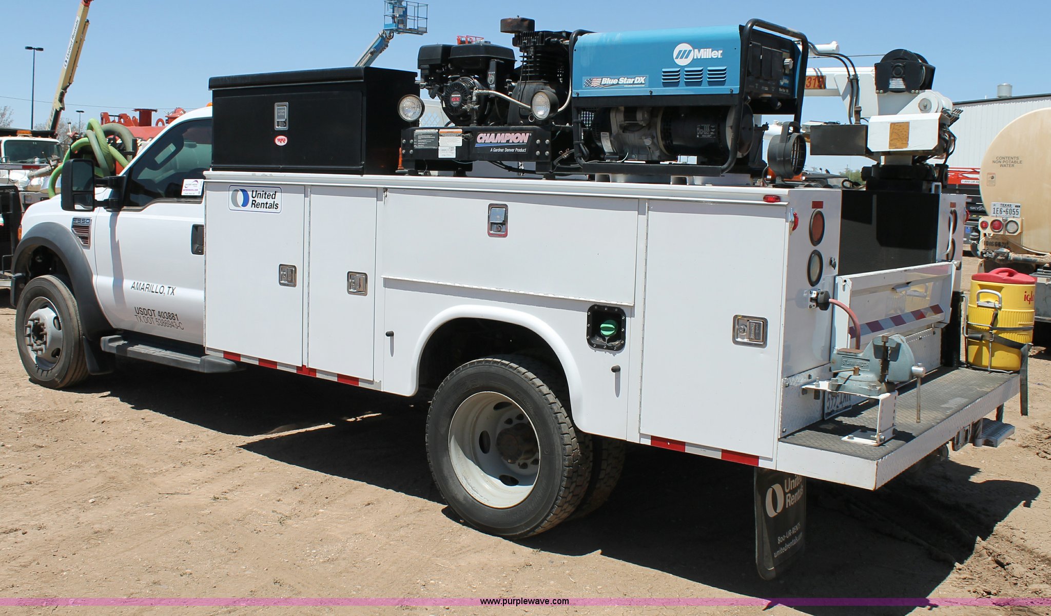 Purple Wave is selling a used Service Truck in Texas. This item is a 2008 Ford F550 utility truck with the following: 148,126 actual miles, 6.4L V8 OHV 32V turbo diesel engine, 325 HP, Automatic transmission, AC and heat, Tilt, Cruise, AM/FM/CD, Manual windows and locks, Vinyl interior, Front and rear work lights, Amber strobe lighting, Utility bed, (8) side compartments, Toolbox, Sliding drawers, RKI box, Miller BlueStar 185 welder/generator, 71.2 hours, Electric start, 6,000 watt, Champion air compressor, Honda GX270 engine, Electric start, Stellar 3315 crane, 3,200 lbs capacity, Current inspection valid through November 2014, Serial KCW07770, Oil storage tank, Plumbed with hose, reels, and pump, Filter drain rack, Air hose and reel, Battery jump plug mounted on front, Rear mounted vise, Receiver hitch, Trailer wiring, 225/70R19.5 tires, Engine needs repaired, EIN 739486RA