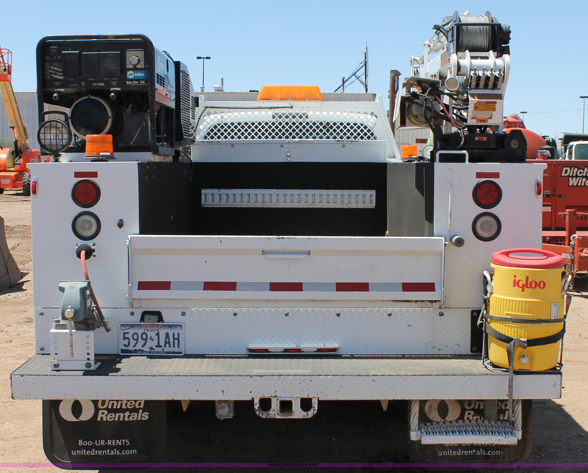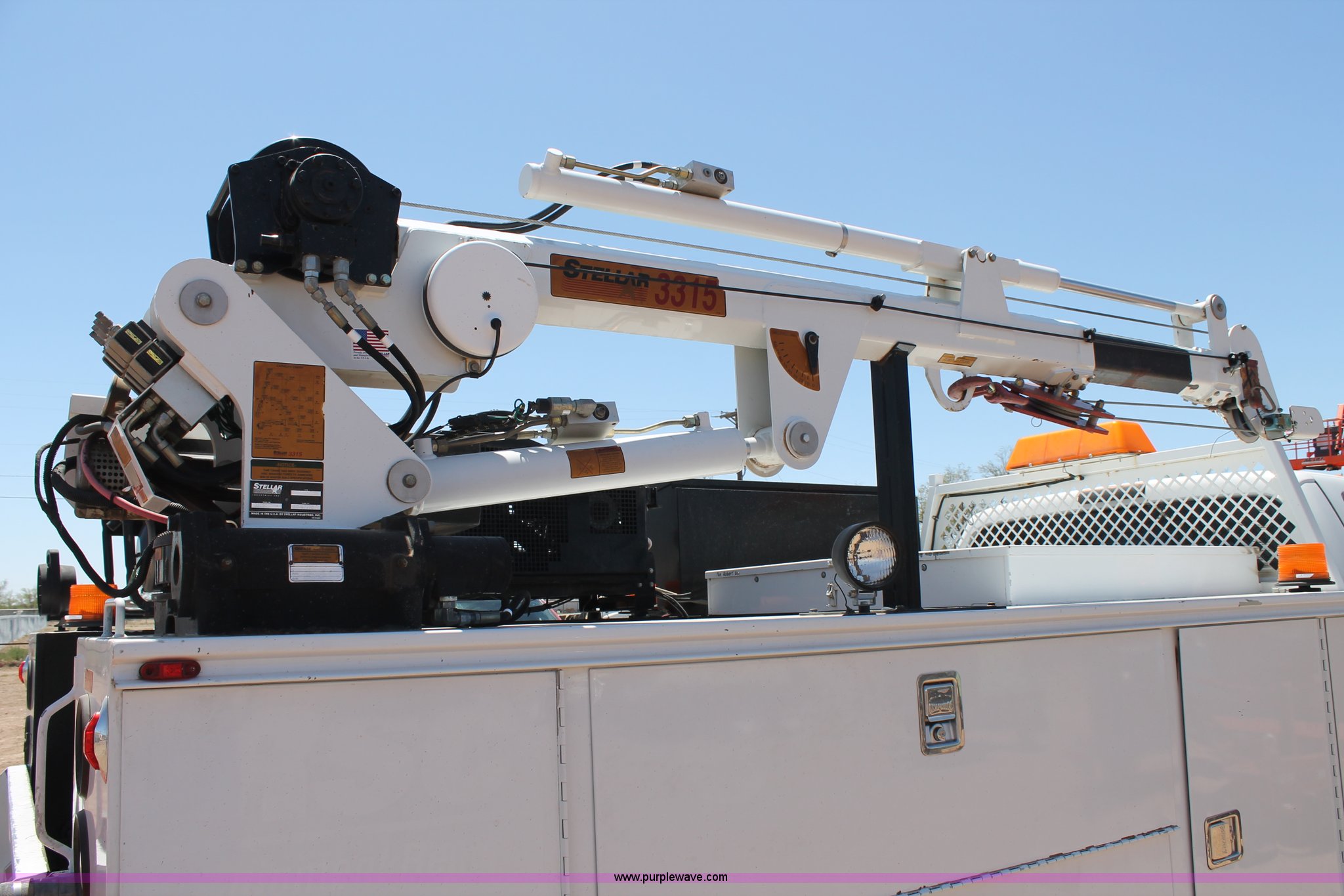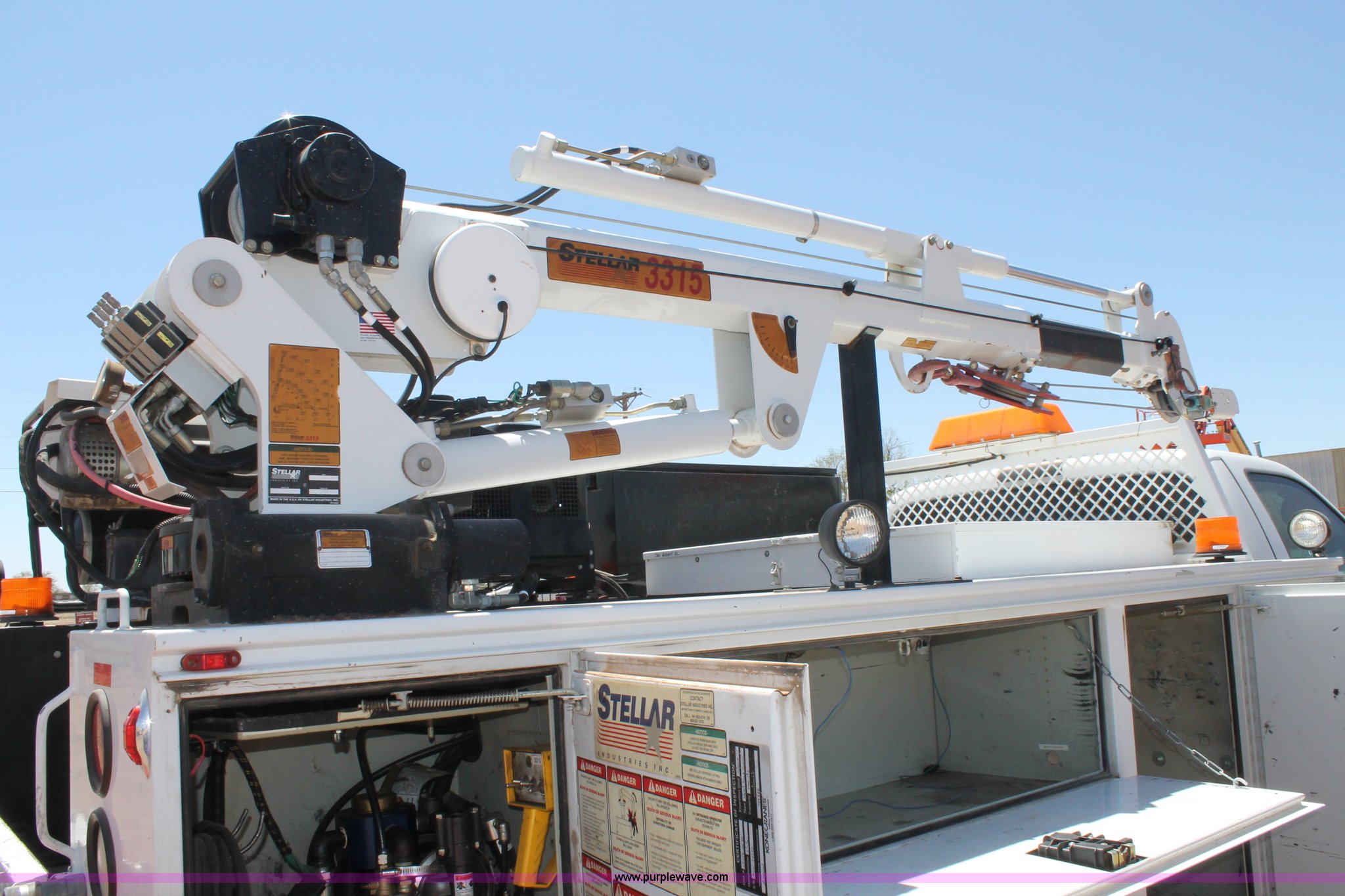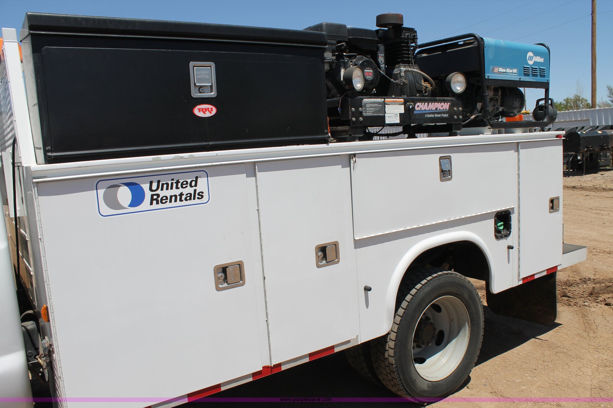 Purple Wave is selling a used Service Truck in Texas. This item is a 2008 Ford F550 utility truck with the following: 148,126 actual miles, 6.4L V8 OHV 32V turbo diesel engine, 325 HP, Automatic transmission, AC and heat, Tilt, Cruise, AM/FM/CD, Manual windows and locks, Vinyl interior, Front and rear work lights, Amber strobe lighting, Utility bed, (8) side compartments, Toolbox, Sliding drawers, RKI box, Miller BlueStar 185 welder/generator, 71.2 hours, Electric start, 6,000 watt, Champion air compressor, Honda GX270 engine, Electric start, Stellar 3315 crane, 3,200 lbs capacity, Current inspection valid through November 2014, Serial KCW07770, Oil storage tank, Plumbed with hose, reels, and pump, Filter drain rack, Air hose and reel, Battery jump plug mounted on front, Rear mounted vise, Receiver hitch, Trailer wiring, 225/70R19.5 tires, Engine needs repaired, EIN 739486RA
