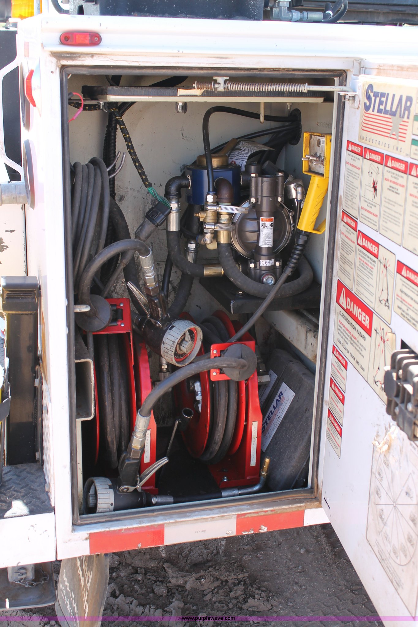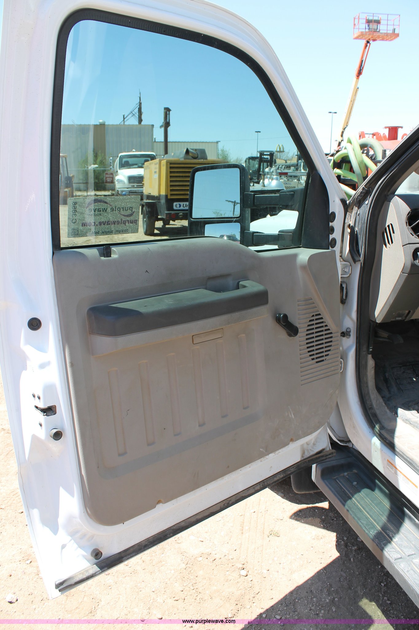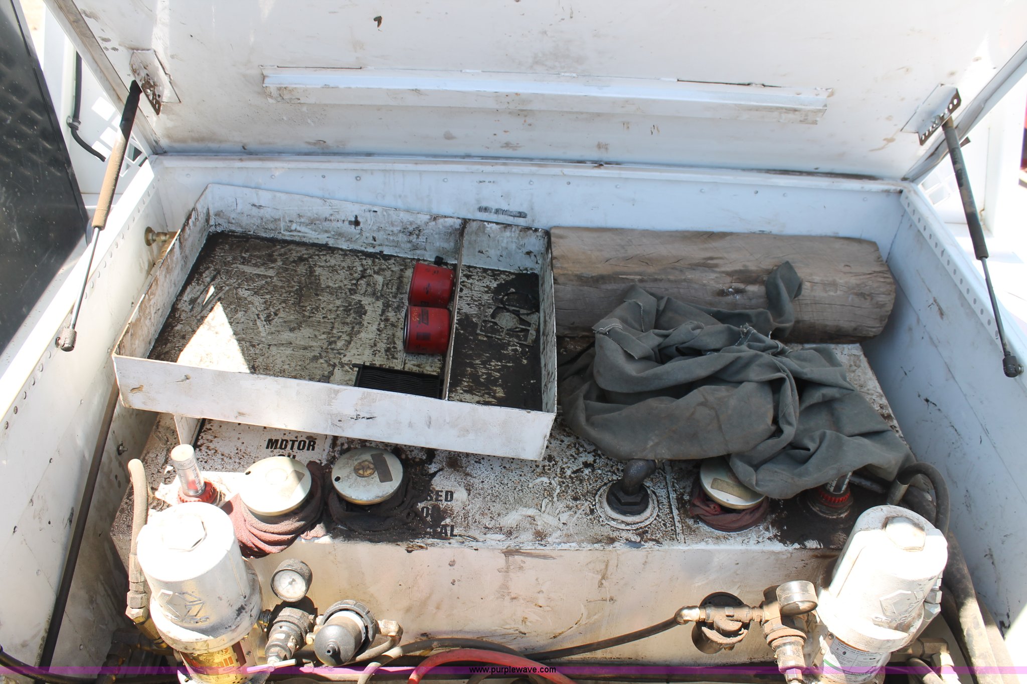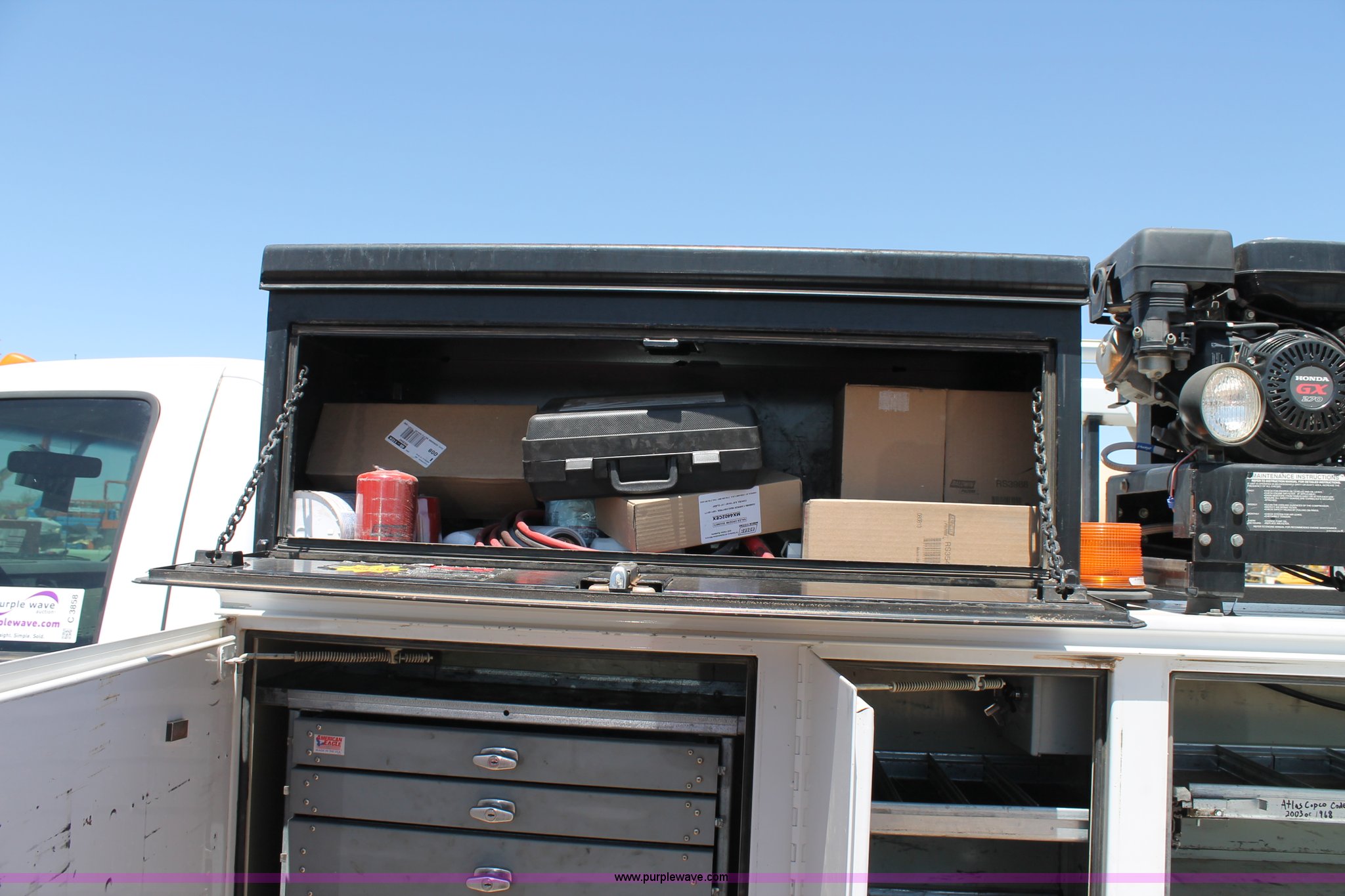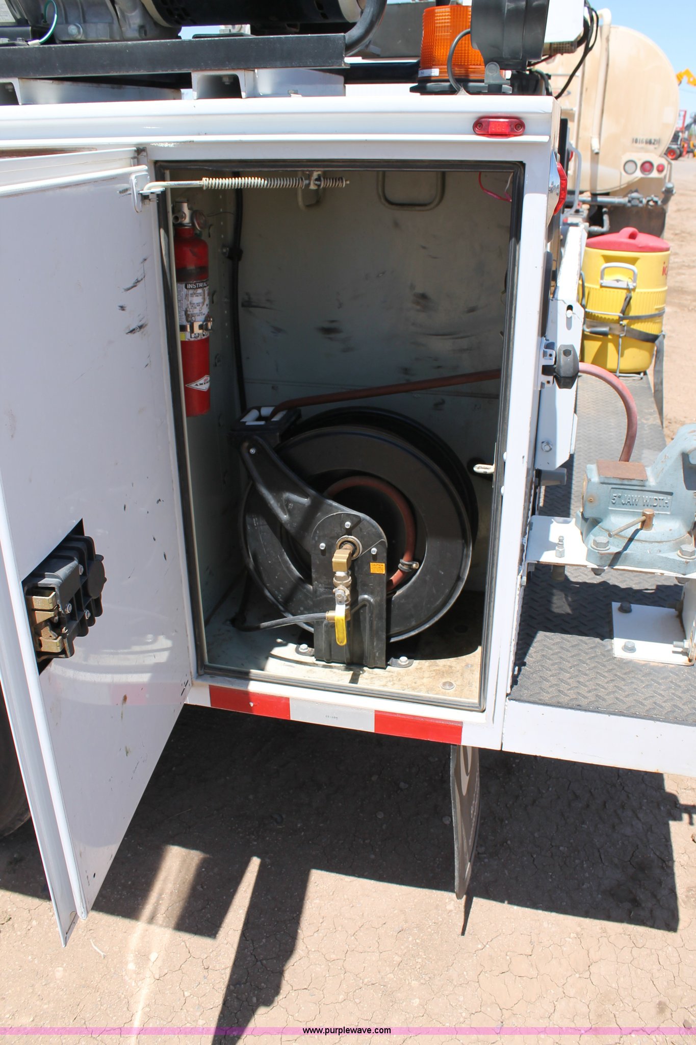 Purple Wave is selling a used Service Truck in Texas. This item is a 2008 Ford F550 utility truck with the following: 148,126 actual miles, 6.4L V8 OHV 32V turbo diesel engine, 325 HP, Automatic transmission, AC and heat, Tilt, Cruise, AM/FM/CD, Manual windows and locks, Vinyl interior, Front and rear work lights, Amber strobe lighting, Utility bed, (8) side compartments, Toolbox, Sliding drawers, RKI box, Miller BlueStar 185 welder/generator, 71.2 hours, Electric start, 6,000 watt, Champion air compressor, Honda GX270 engine, Electric start, Stellar 3315 crane, 3,200 lbs capacity, Current inspection valid through November 2014, Serial KCW07770, Oil storage tank, Plumbed with hose, reels, and pump, Filter drain rack, Air hose and reel, Battery jump plug mounted on front, Rear mounted vise, Receiver hitch, Trailer wiring, 225/70R19.5 tires, Engine needs repaired, EIN 739486RA