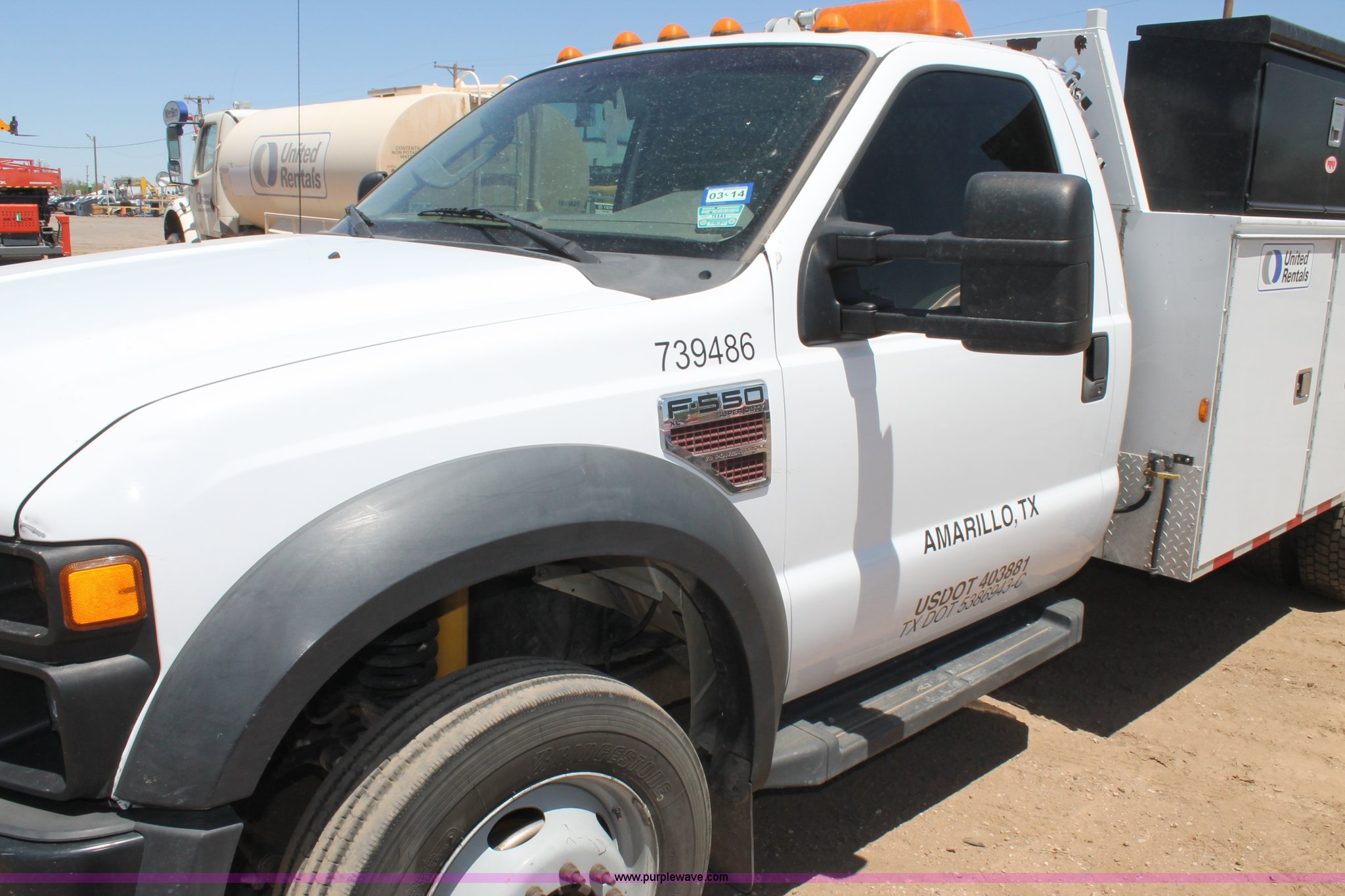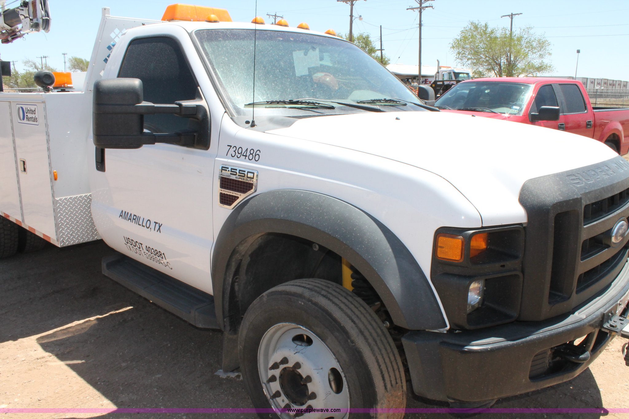 2008 Ford F550 utility truck. 148,126 actual miles, 6.4L V8 OHV 32V turbo diesel engine 325 HP, Automatic transmission, AC and heat, Tilt, Cruise, AM/FM/CD, Manual windows and locks, Vinyl interior, Front and rear work lights, Amber strobe lighting, Utility bed (8) side compartments, Toolbox, Sliding drawers, RKI box, Miller BlueStar 185 welder/generator, 71.2 hours Electric start, 6,000 watt, Champion air compressor Honda GX270 engine, Electric start, Stellar 3315 crane 3,200 lbs capacity, Current inspection valid through November 2014, Serial KCW07770, Oil storage tank Plumbed with hose, reels, and pump, Filter drain rack, Air hose and reel, Battery jump plug mounted on front, Rear mounted vise, Receiver hitch, Trailer wiring, 225/70R19.5 tires, Engine needs repaired, EIN 739486RA. View item removal requirement and like-kind exchange information. 1FDAF56R08EC83533. United Rentals - Amarillo. 3900 I-40 East. Amarillo, TX 79103