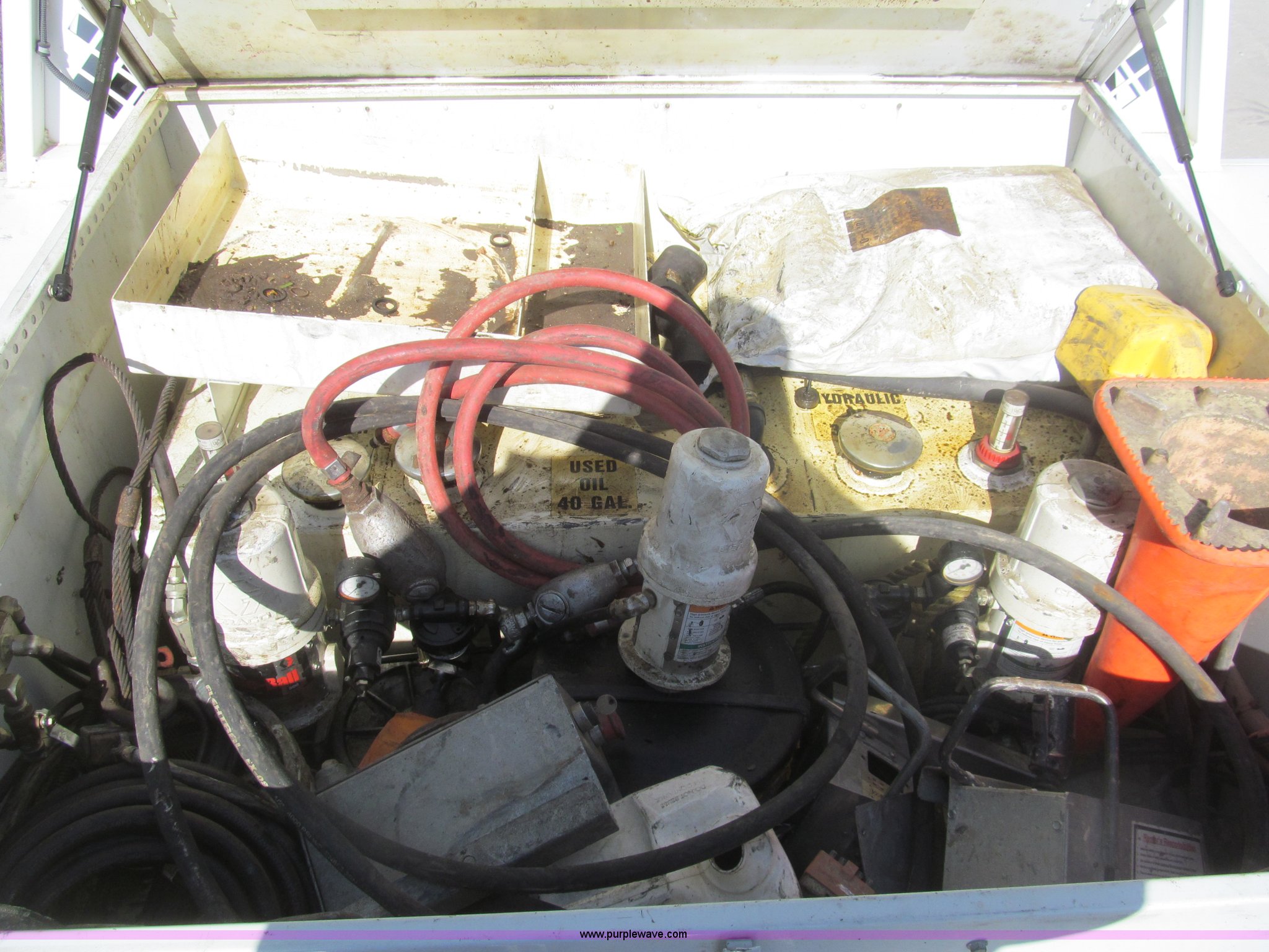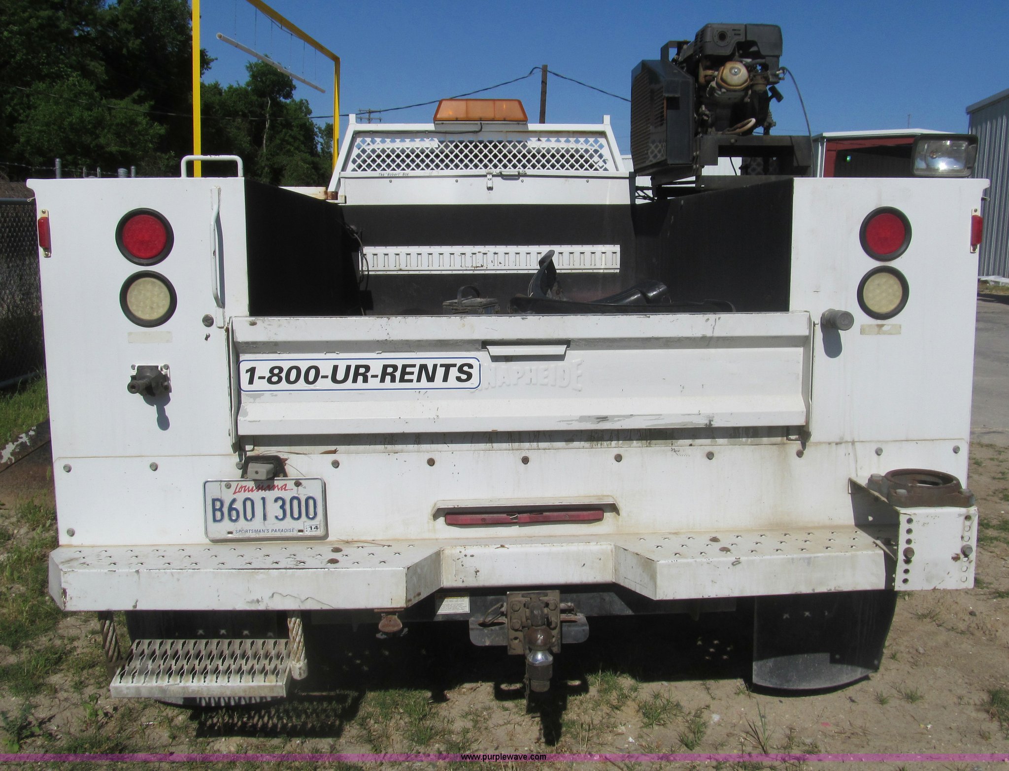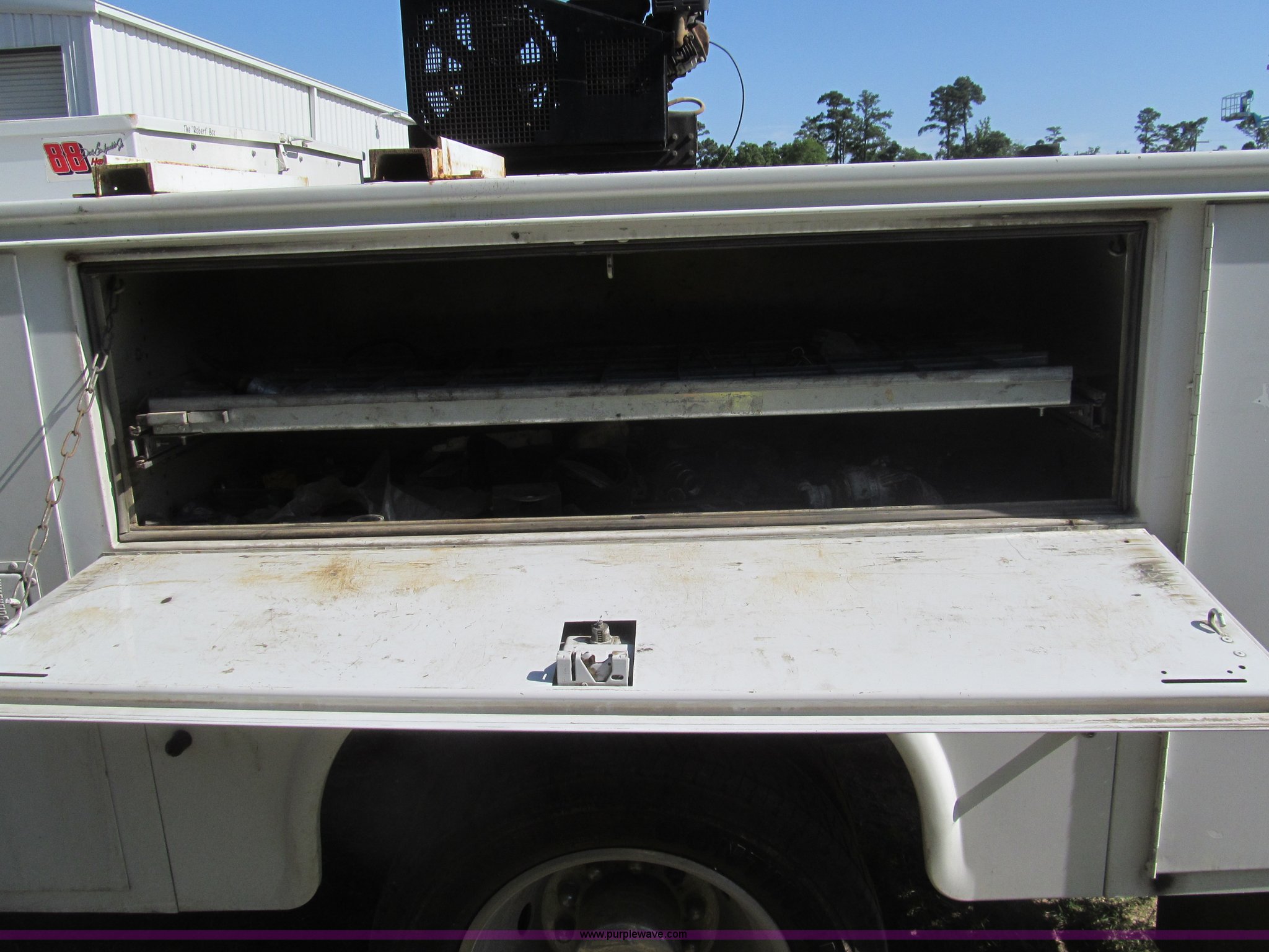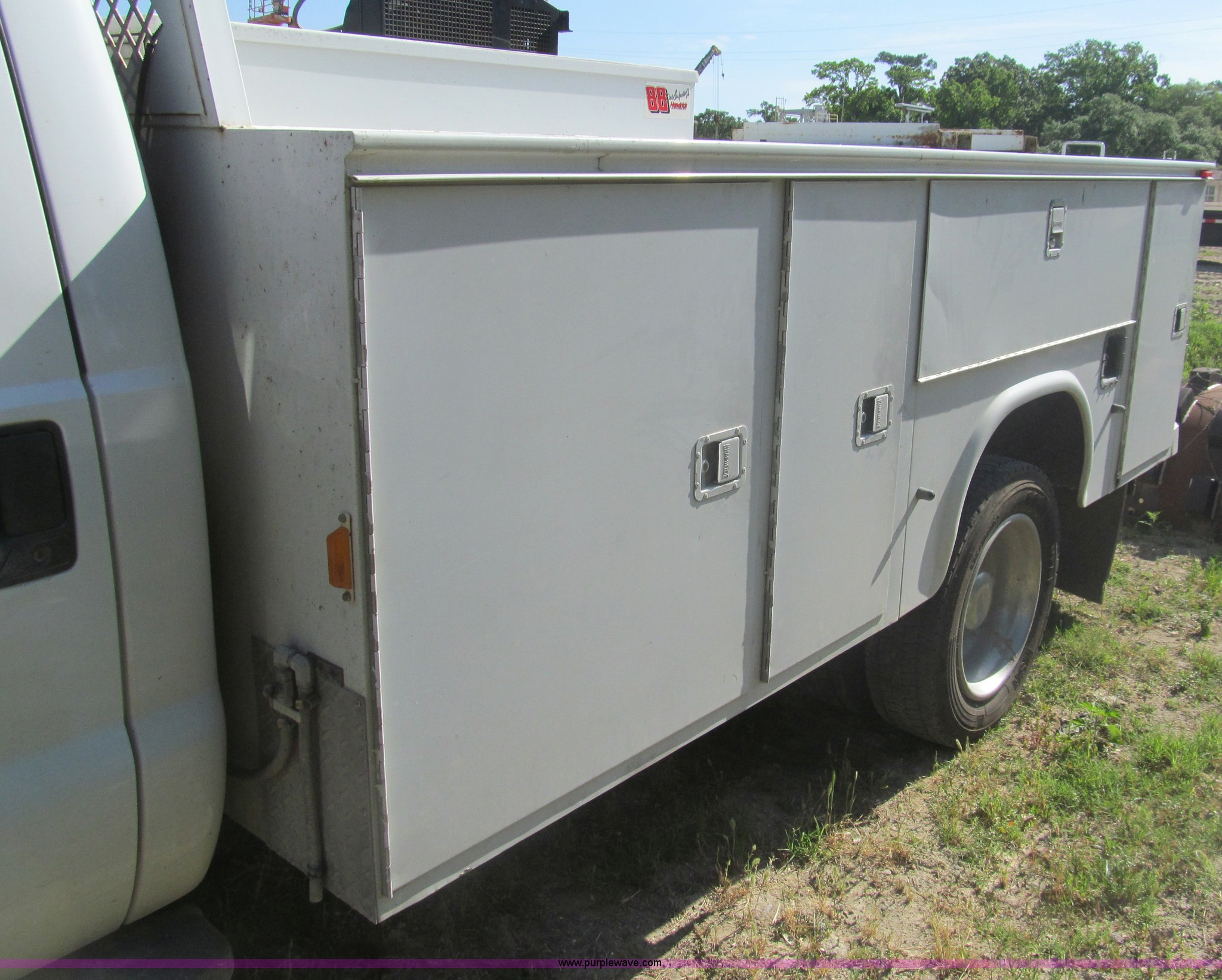 Purple Wave is selling a used Service Truck in Louisiana. This item is a 2007 Ford F550 service truck with the following: 137,534 actual miles, 6.0L V8 OHV 32V turbo diesel engine, Automatic transmission, AC and heat, Tilt, Cruise, AM/FM/CD, Manual windows and locks, Vinyl interior, Auxiliary control panel, Knapheide 11' utility bed, (8) storage compartments, American Eagle tool chest, Amber light bar, Champion air compressor, Honda 9 HP gas engine, 175 maximum psi, Hose, Reel, Nozzle assembly, Graco lube, oil, and grease system, Motor, hydraulic, and recovery reservoirs, Graco Fireball pump, Hose, Reel, Nozzle assembly, Front tow hooks, Front auxiliary power outlet, Pintle hitch, Trailer wiring, 225/70R19.5 tires, EIN 675117RA