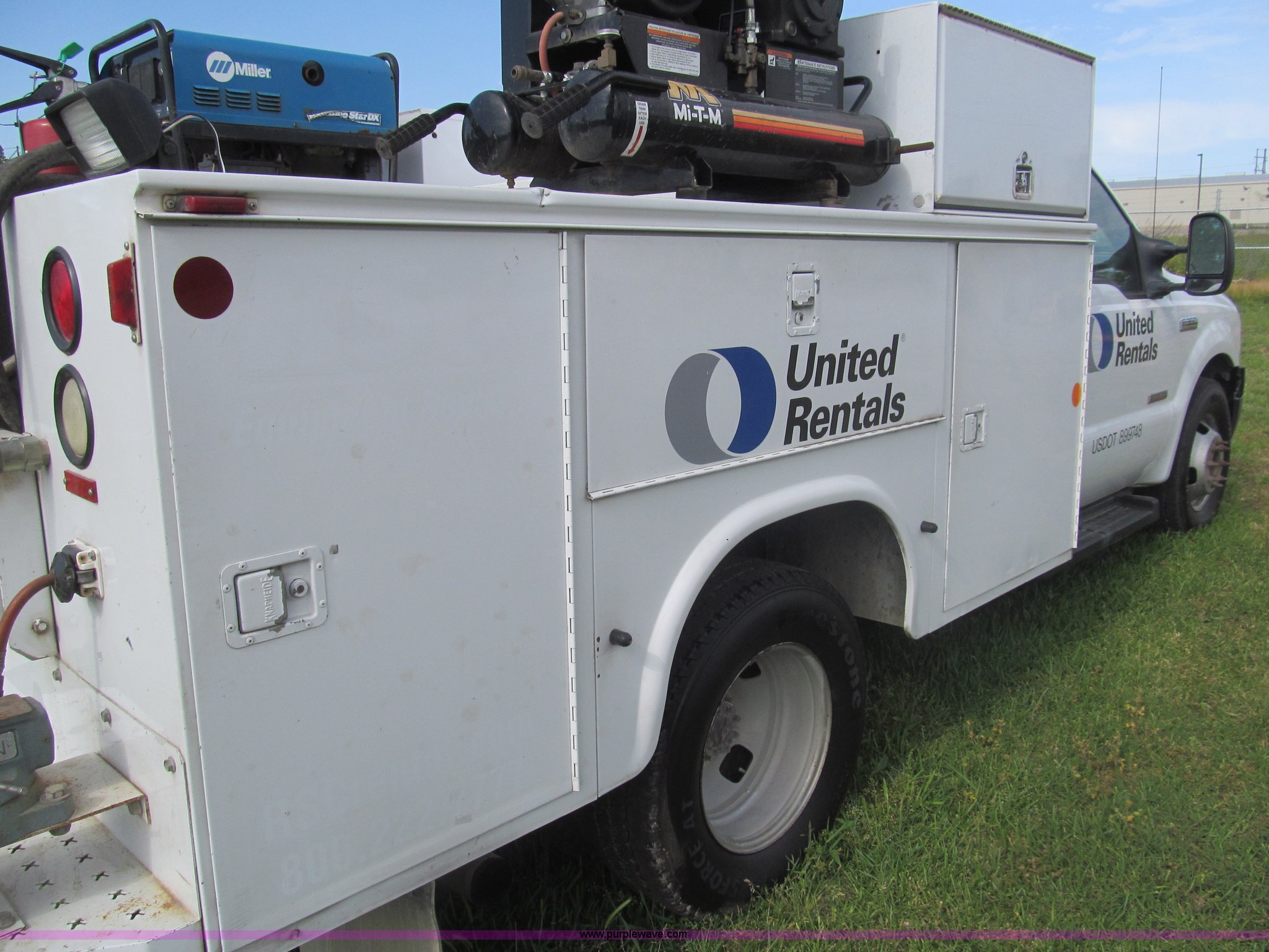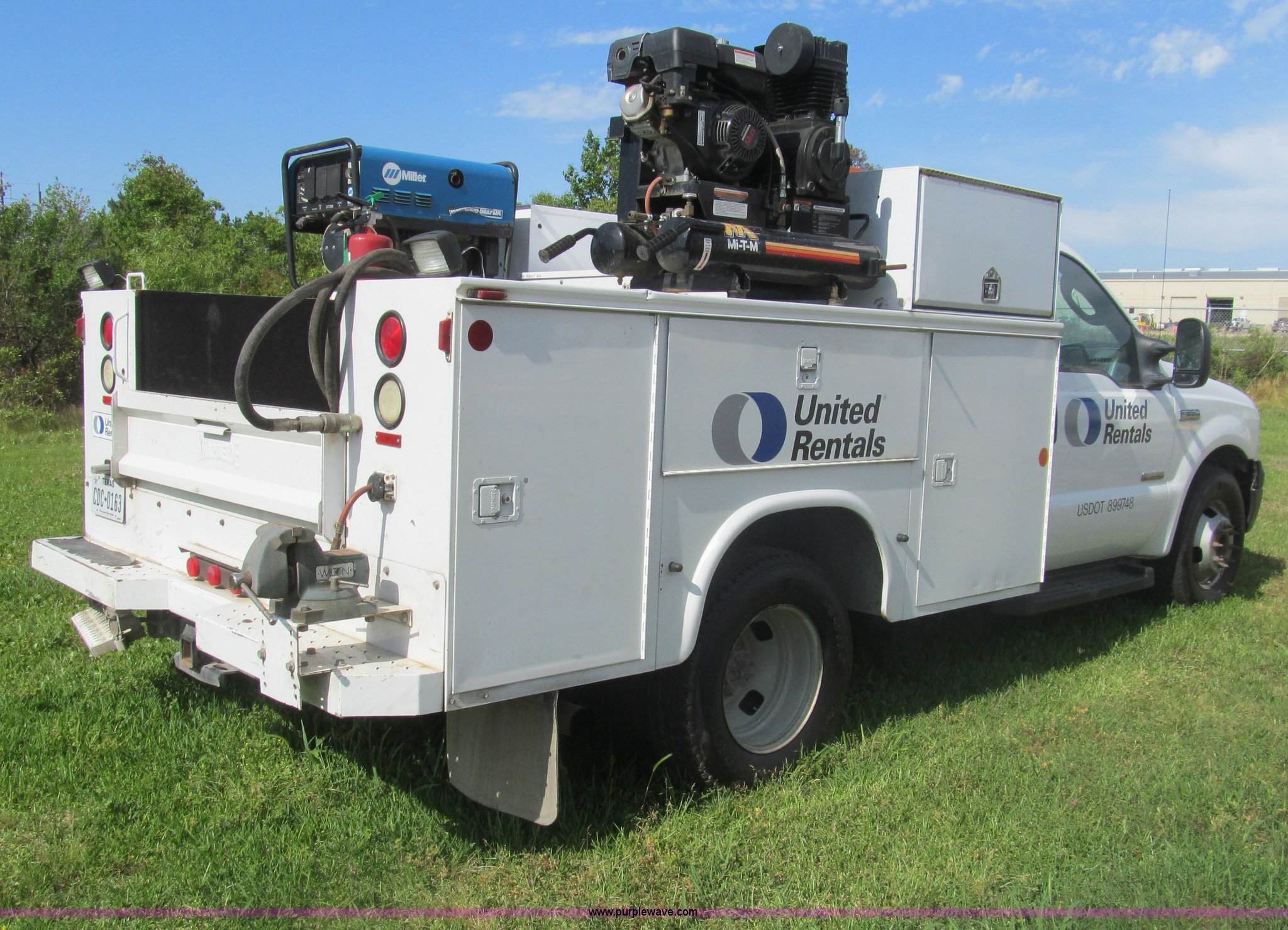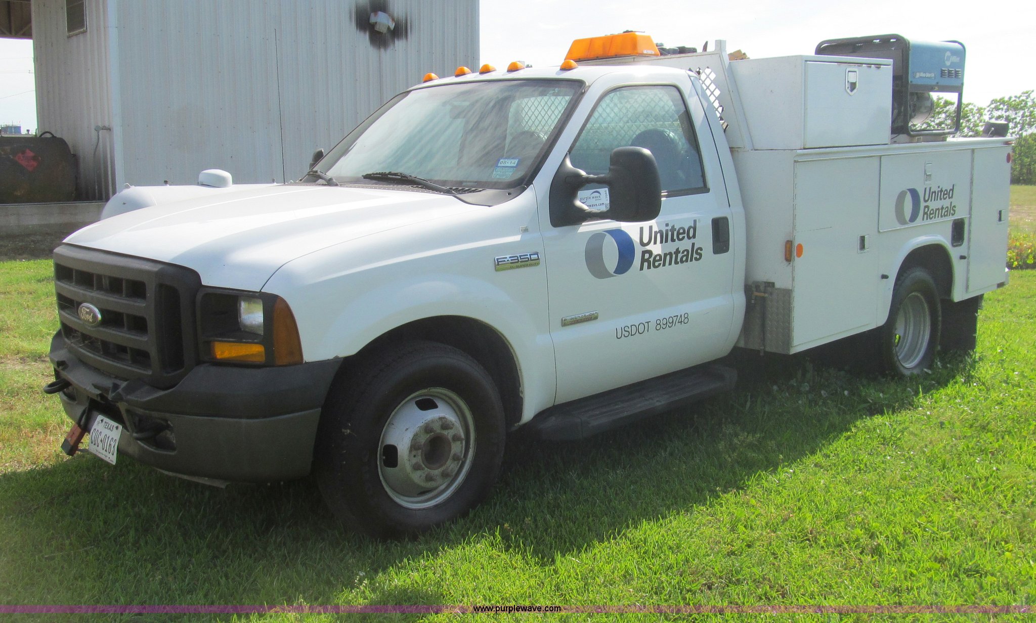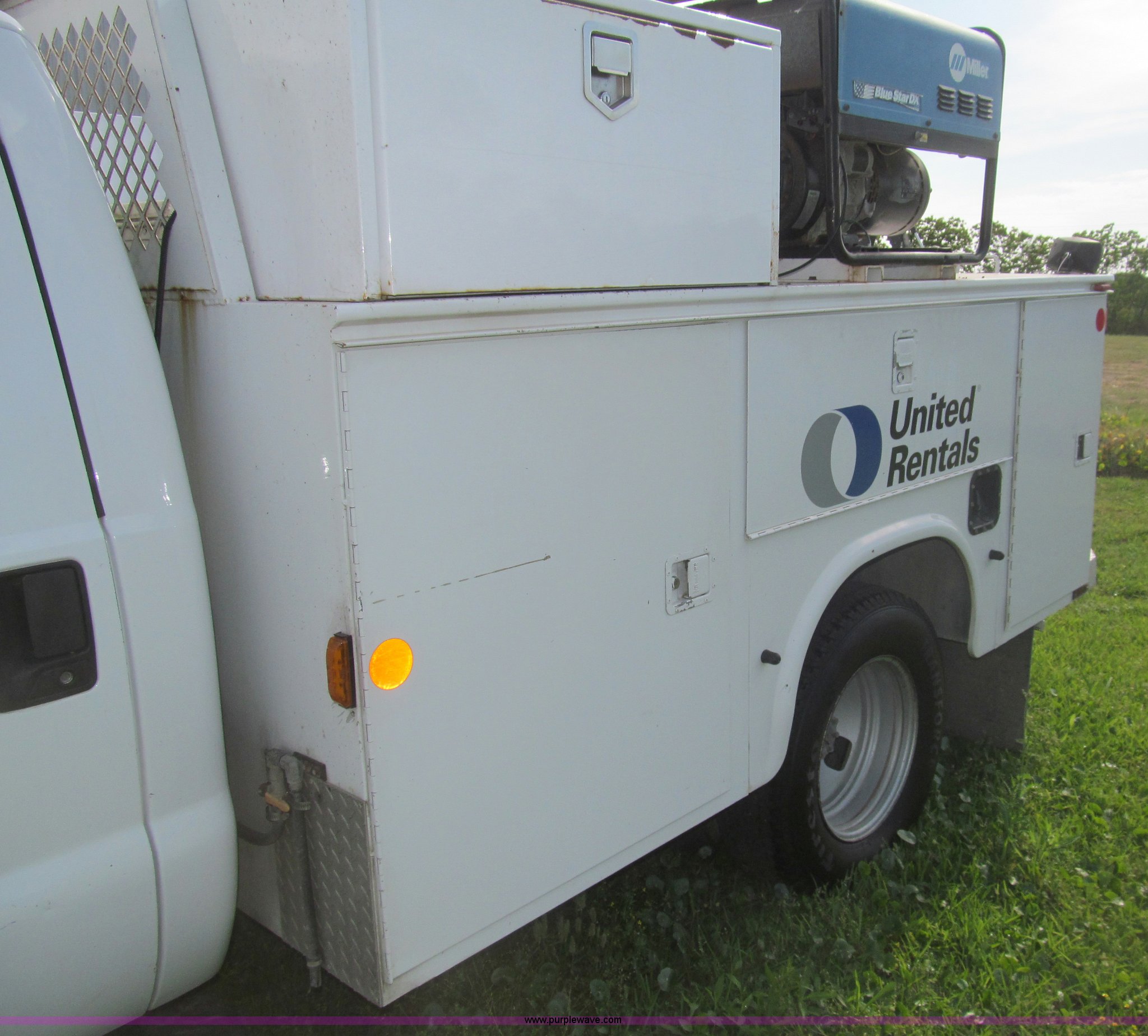Purple Wave is selling a used Service Truck in Texas. This item is a 2007 Ford F350 Super Duty XL service truck with the following: 134,269 actual miles, 6.0L V8 OHV 32V turbo diesel engine, Automatic transmission, AC and heat, Tilt, Cruise, AM/FM/CD, Manual windows and locks, Vinyl interior, Auxiliary control panel, Running boards, Front tow hooks, Front auxiliary power outlet, Knapheide 9' utility bed, (6) storage compartments, (2) toolboxes, Work lights, Amber light bar, 5" vise, American Eagle tool chest, Miller BlueStar 185 welder/generator, 15 hours on meter, Kohler Welder 12.5 HP gas engine, 6,000 watt generator, CC/DC welder, (2) 120V outlets, 240V outlet, Graco oil, lube, and grease system, Motor, hydraulic, recovery reservoirs, Graco Fireball pumps, Hose, reel, and nozzle assemblies,, Receiver hitch, Trailer wiring, LT245/75R17 tires, Air compressor not included, Front bumper damage, EIN 650416RA