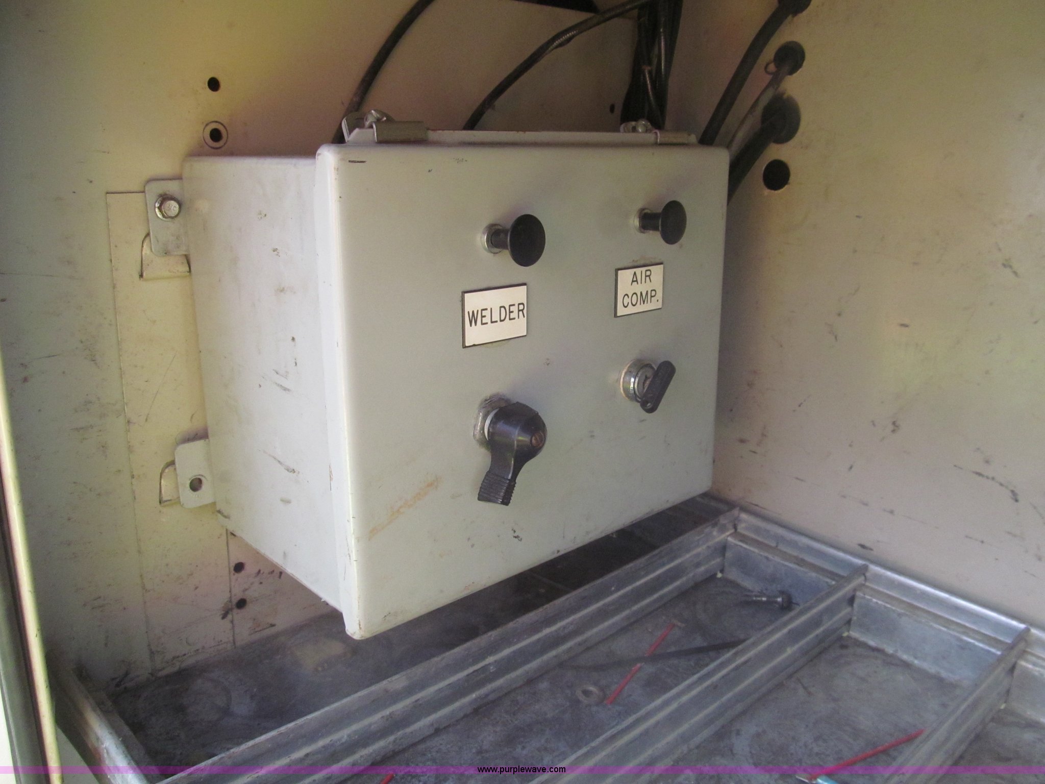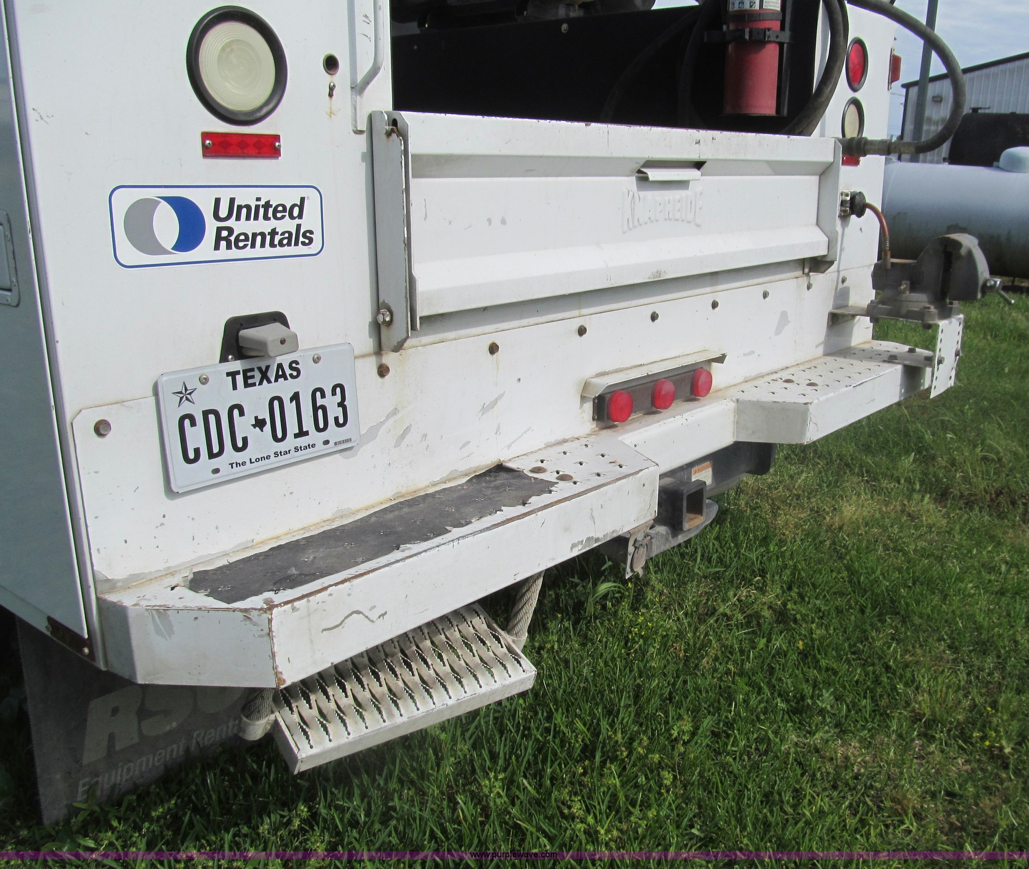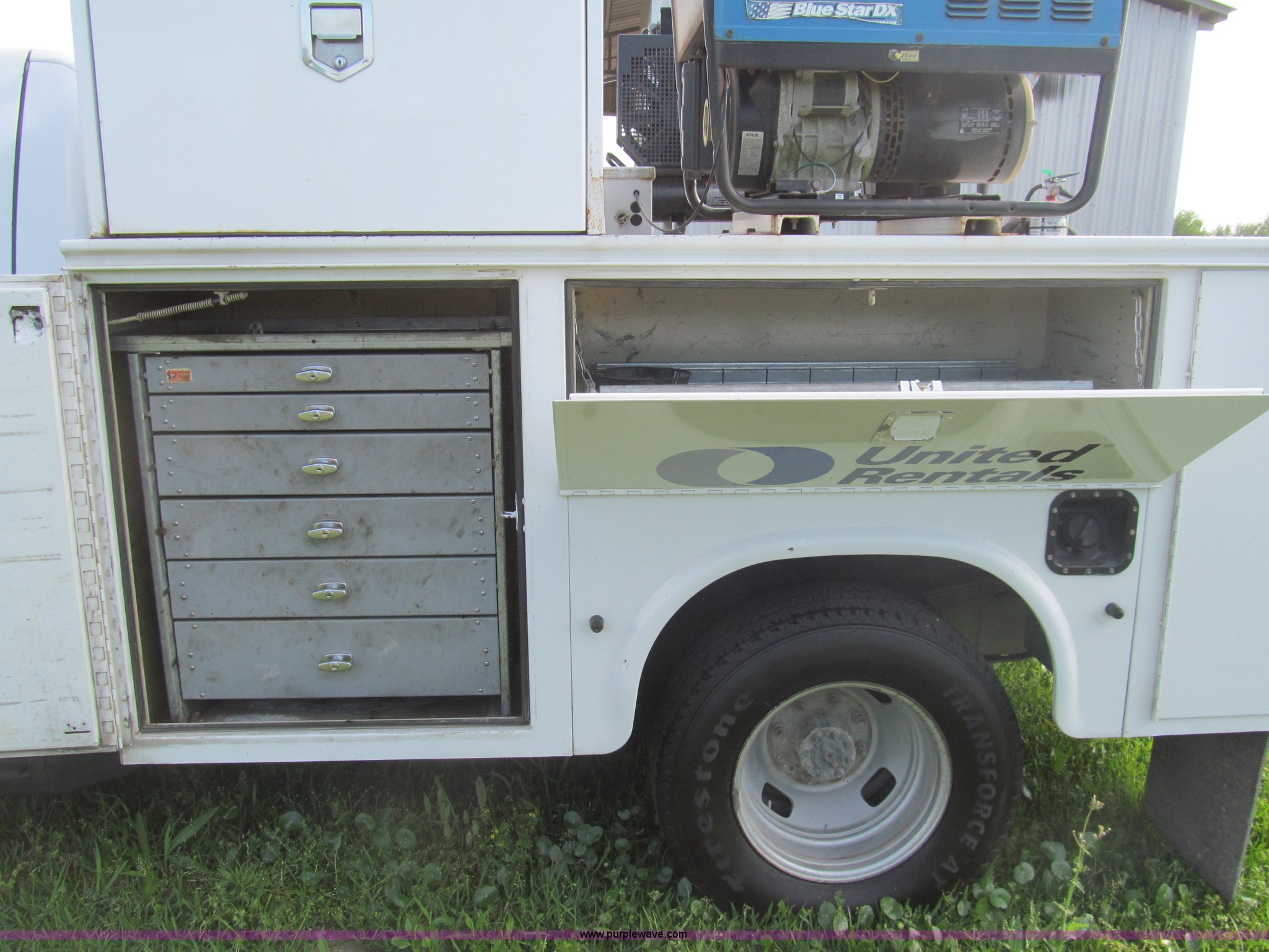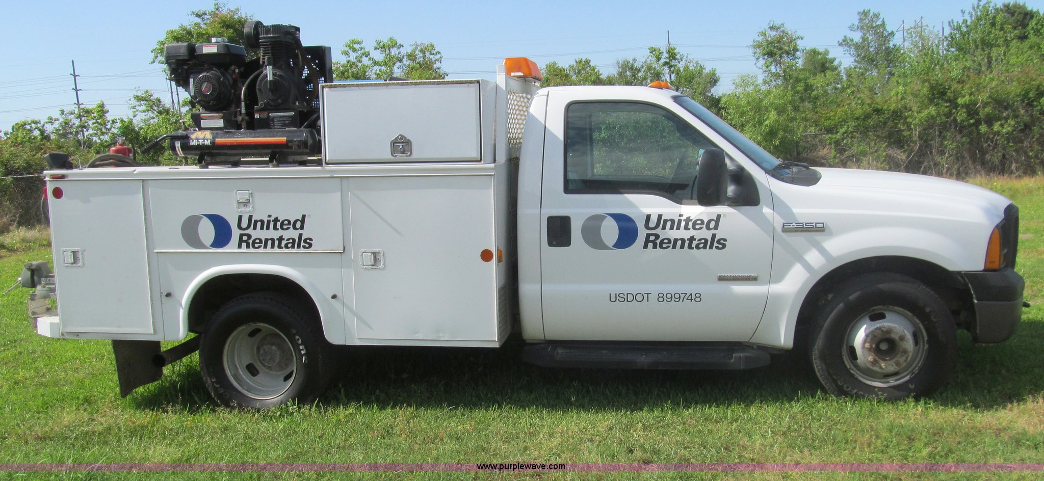 Purple Wave is selling a used Service Truck in Texas. This item is a 2007 Ford F350 Super Duty XL service truck with the following: 134,269 actual miles, 6.0L V8 OHV 32V turbo diesel engine, Automatic transmission, AC and heat, Tilt, Cruise, AM/FM/CD, Manual windows and locks, Vinyl interior, Auxiliary control panel, Running boards, Front tow hooks, Front auxiliary power outlet, Knapheide 9' utility bed, (6) storage compartments, (2) toolboxes, Work lights, Amber light bar, 5" vise, American Eagle tool chest, Miller BlueStar 185 welder/generator, 15 hours on meter, Kohler Welder 12.5 HP gas engine, 6,000 watt generator, CC/DC welder, (2) 120V outlets, 240V outlet, Graco oil, lube, and grease system, Motor, hydraulic, recovery reservoirs, Graco Fireball pumps, Hose, reel, and nozzle assemblies,, Receiver hitch, Trailer wiring, LT245/75R17 tires, Air compressor not included, Front bumper damage, EIN 650416RA