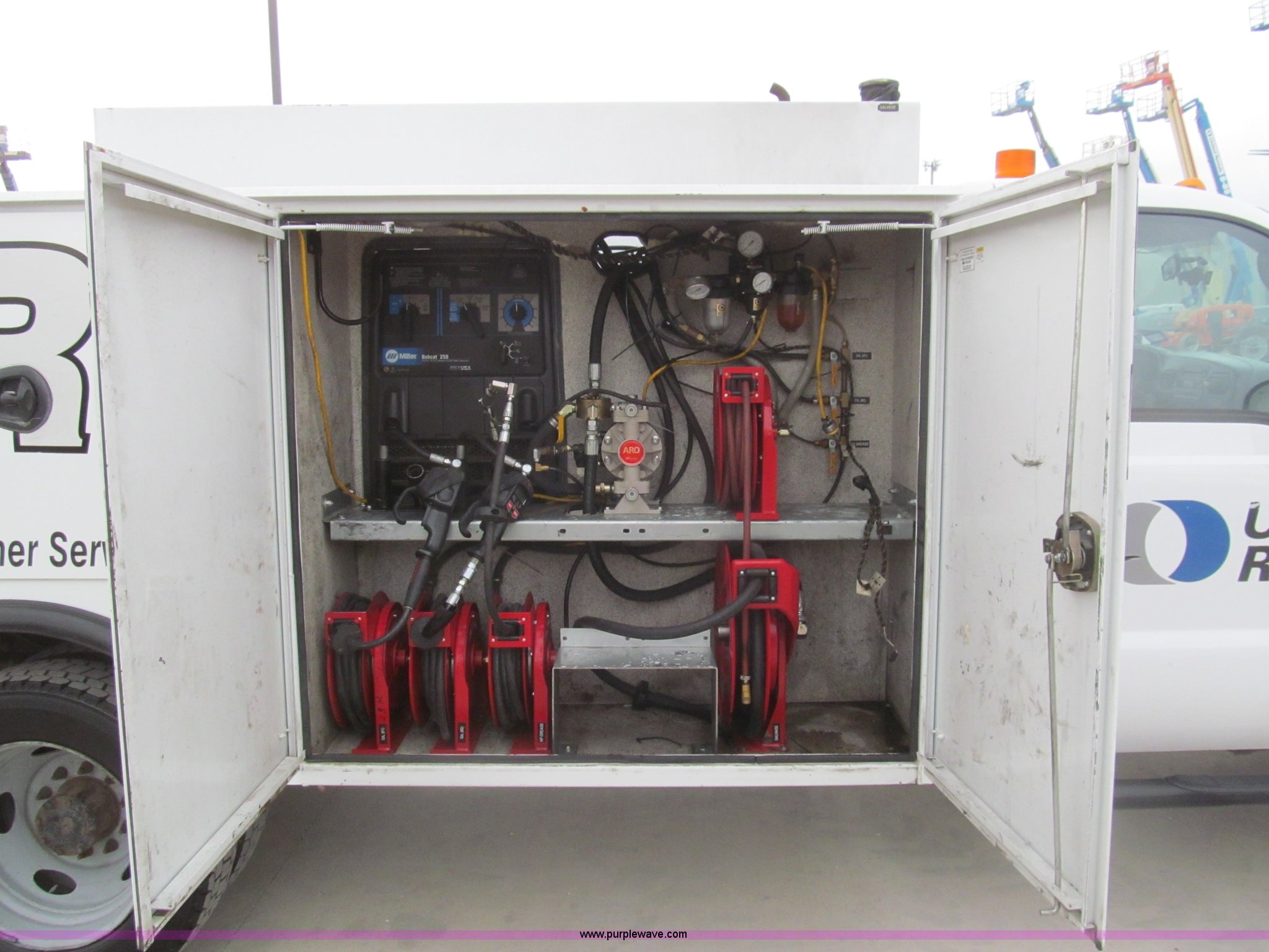 2007 Ford F550 Super Duty XL service truck. 207,914 miles on odometer, 6.0L V8 OHV 32V turbo diesel engine, Automatic transmission, Four wheel drive, AC and heat, Tilt, Cruise, AM/FM/CD, Power windows, locks, and mirrors, Vinyl interior, Auxiliary control panel, Running boards, Front tow hooks, Amber light bar, Block heater, Utility bed (7) storage compartments, Internal shelving, American Eagle toolbox, Side mounted gas and diesel fuel tanks, Work lights, Ingersoll Rand 2475 air compressor Kohler Command 12.5 HP gas engine, 175 max psi, Serial 7030849, Miller Bobcat 250 welder/generator 77 hours on meter, Kohler CH730 23.5 HP gas engine, CC/CV, AC/DC, 10,500 watt generator, Graco oil, lube, and grease system Motor, hydraulic, grease, and recovery reservoirs, IR ARO pumps, Reelcraft hose, reel, and nozzle assemblies, Receiver hitch, Trailer wiring, 225/70R19.5 tires, Cracked windshield, EIN 1004770. View item removal requirement and like-kind exchange information. 1FDAF57P17EB47049. United Rentals - Corpus Christi. 7753 IH 37 Access Rd. Corpus Christi, TX 78409