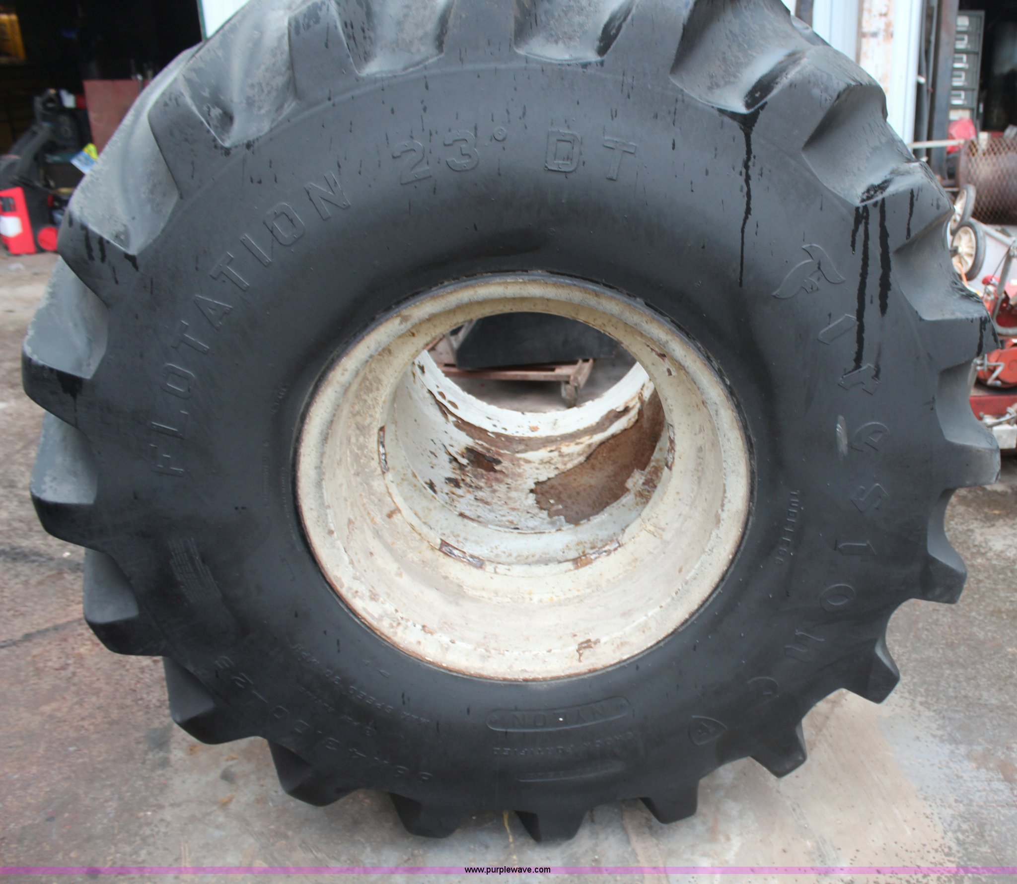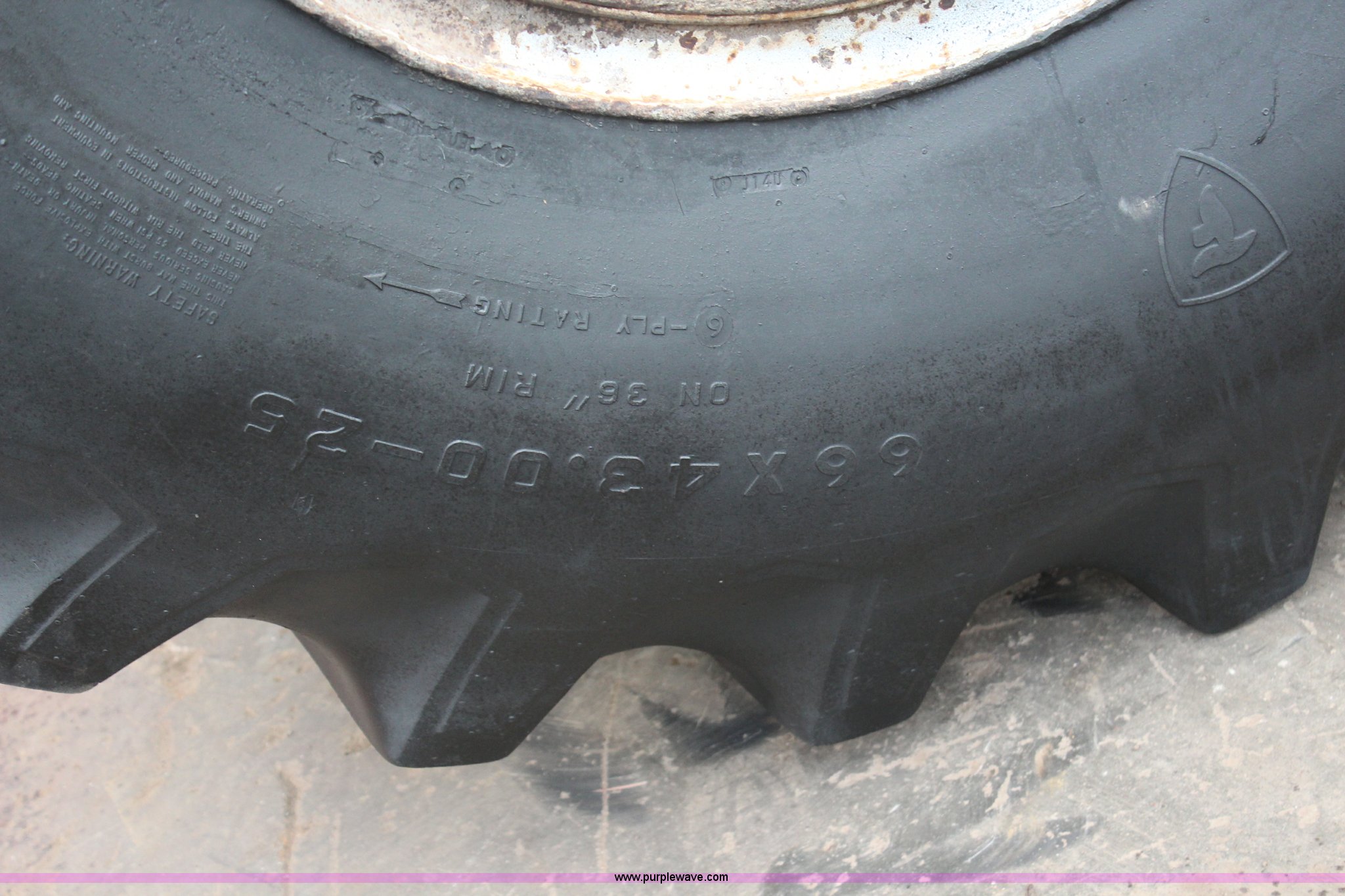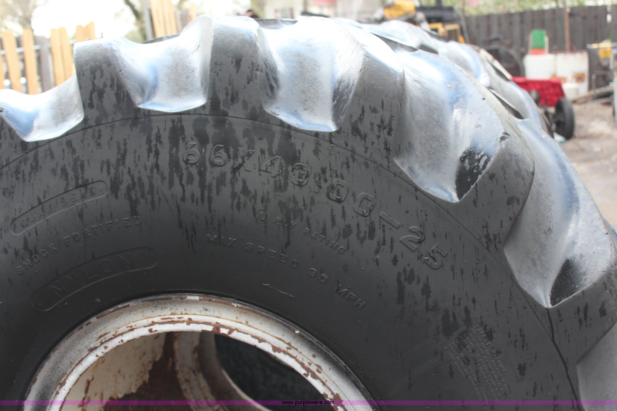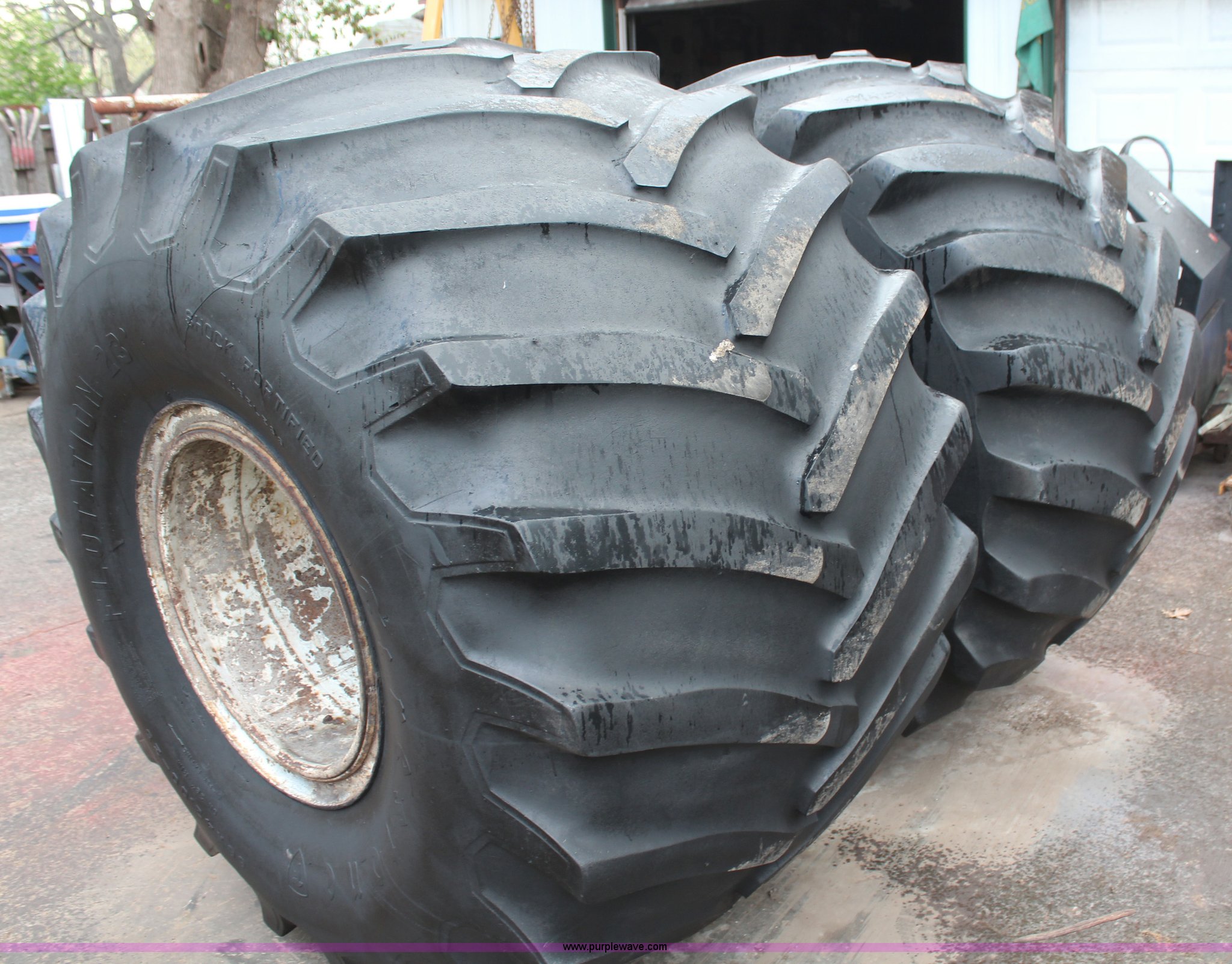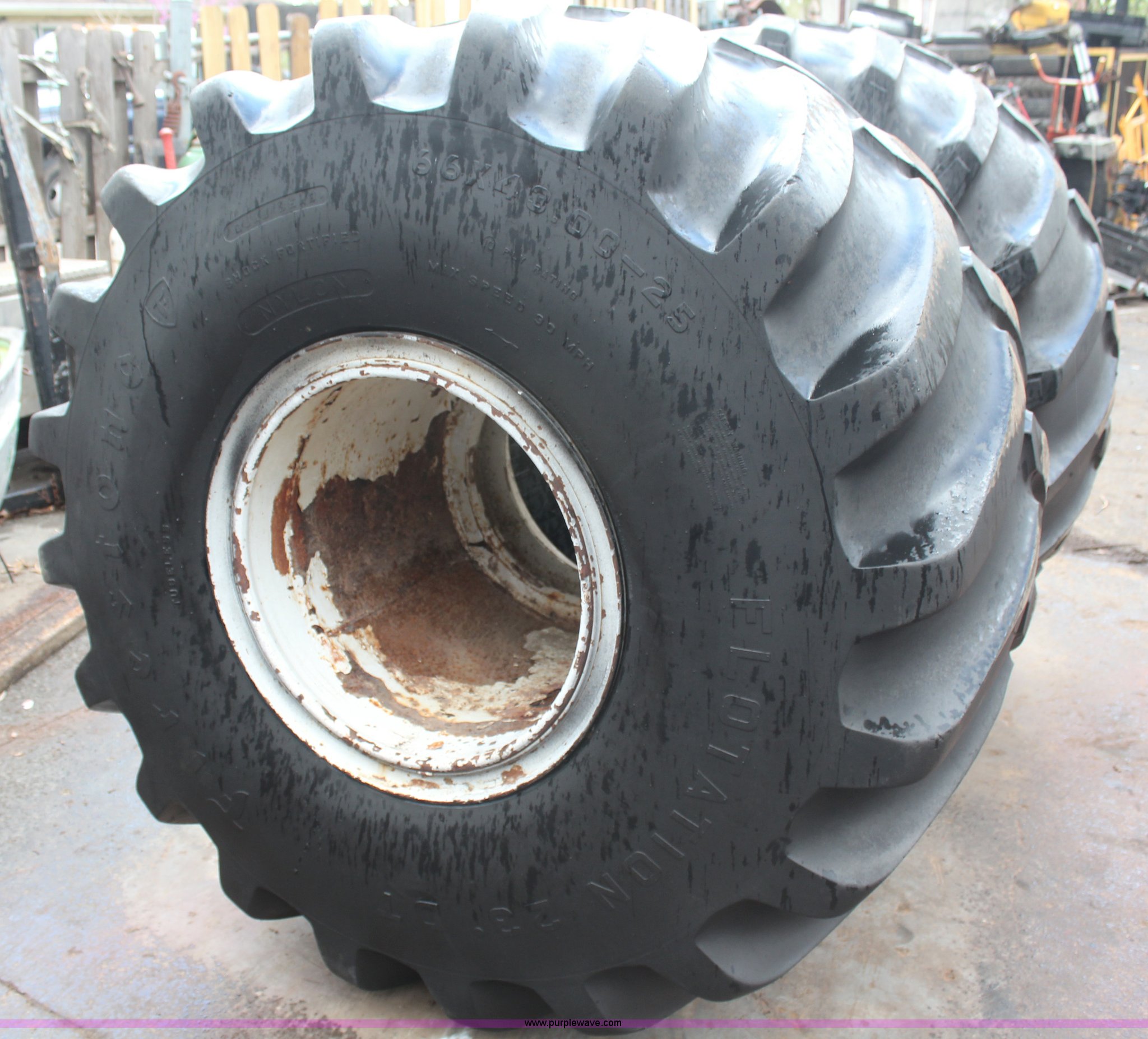 Purple Wave is selling a used Industrial Tires or Tracks in Kansas. This item is a (2) 66x43.00-25 floatation tires and wheels with the following: (2) 66x43.00-25 floatation tires and wheels. Tonganoxie, KS 66086