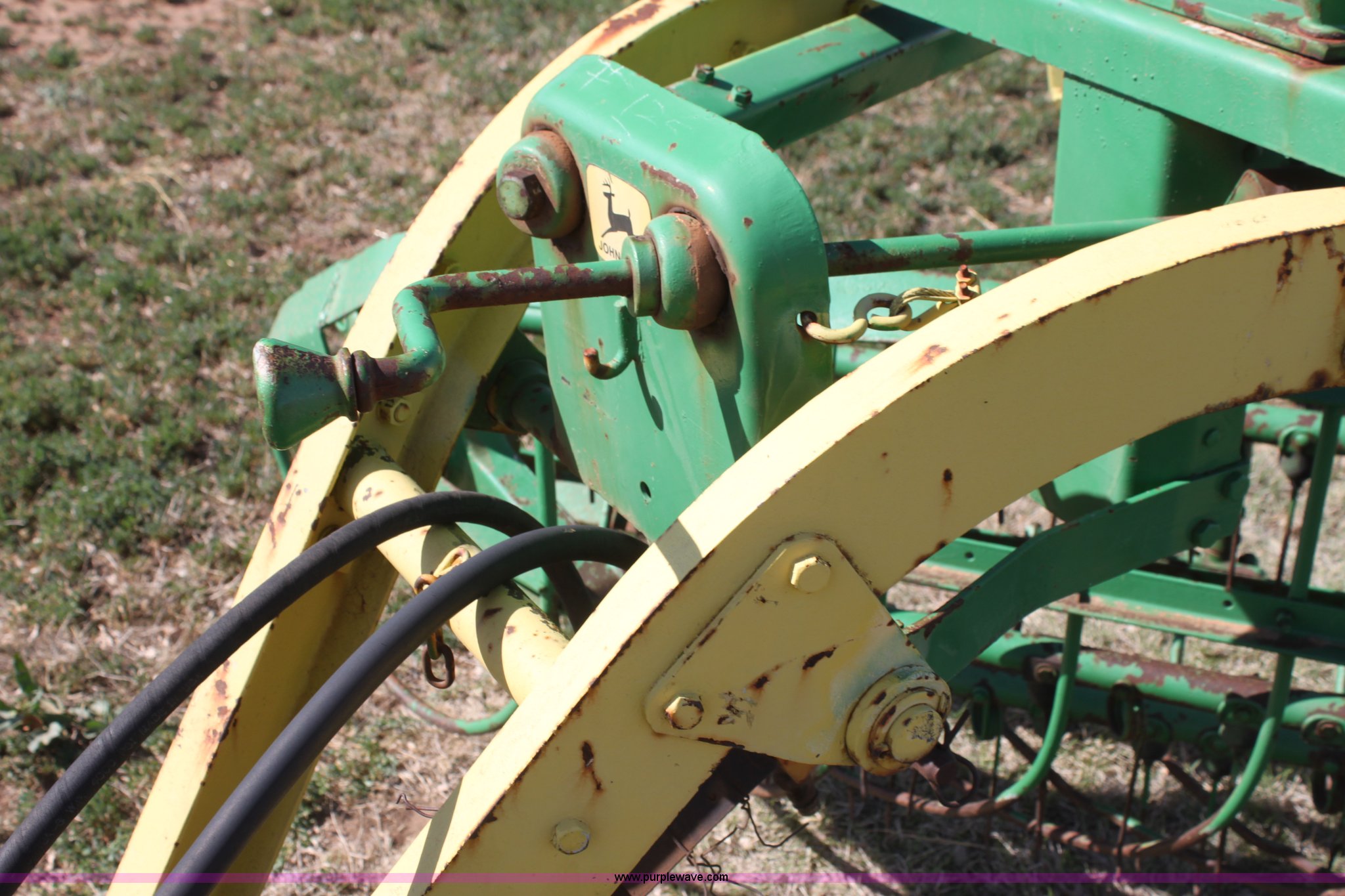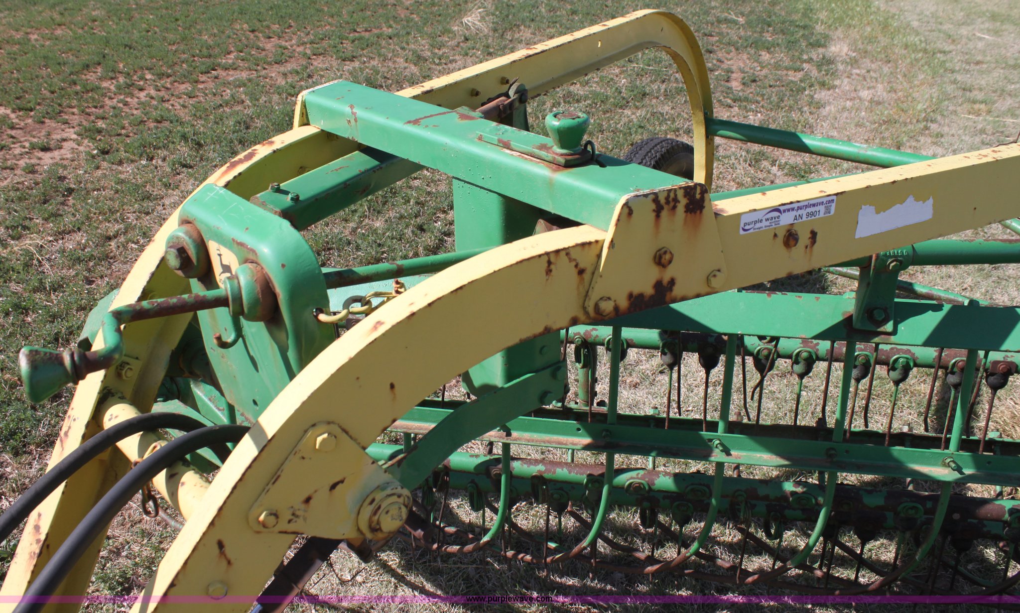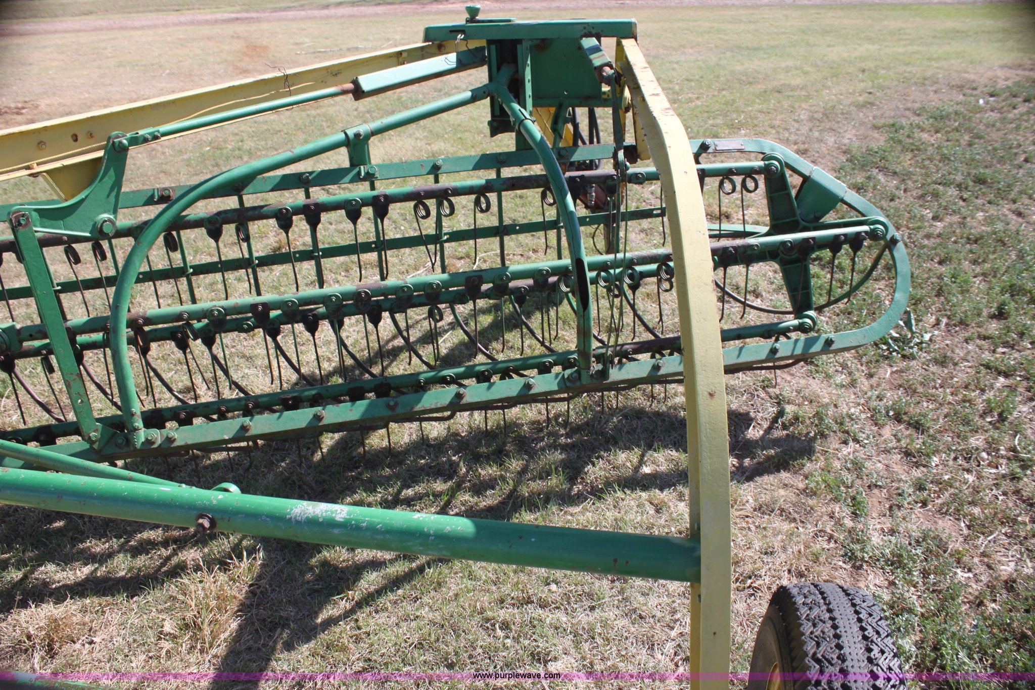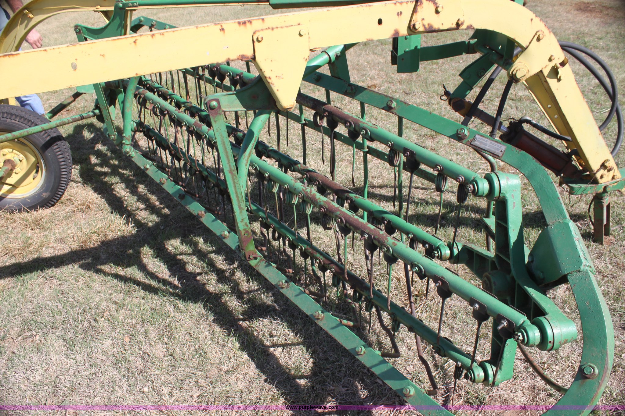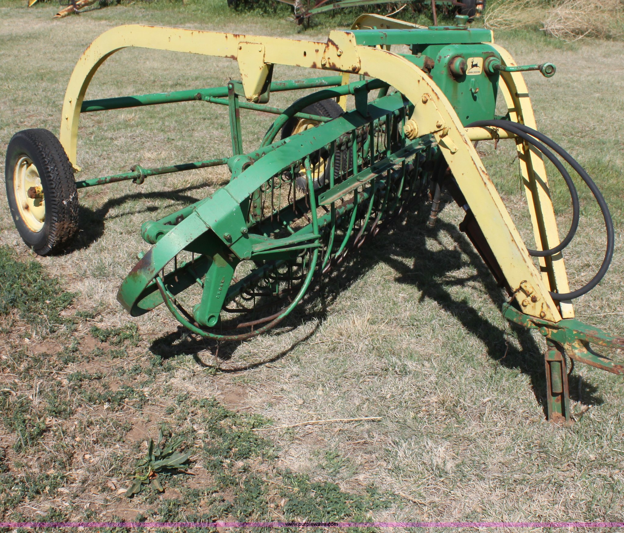 Purple Wave is selling a used Hay Rake in Oklahoma. This item is a John Deere 858 side delivery rake with the following: 10'W, Hydraulic height adjust, Ground driven, 15" tires, Serial 87029