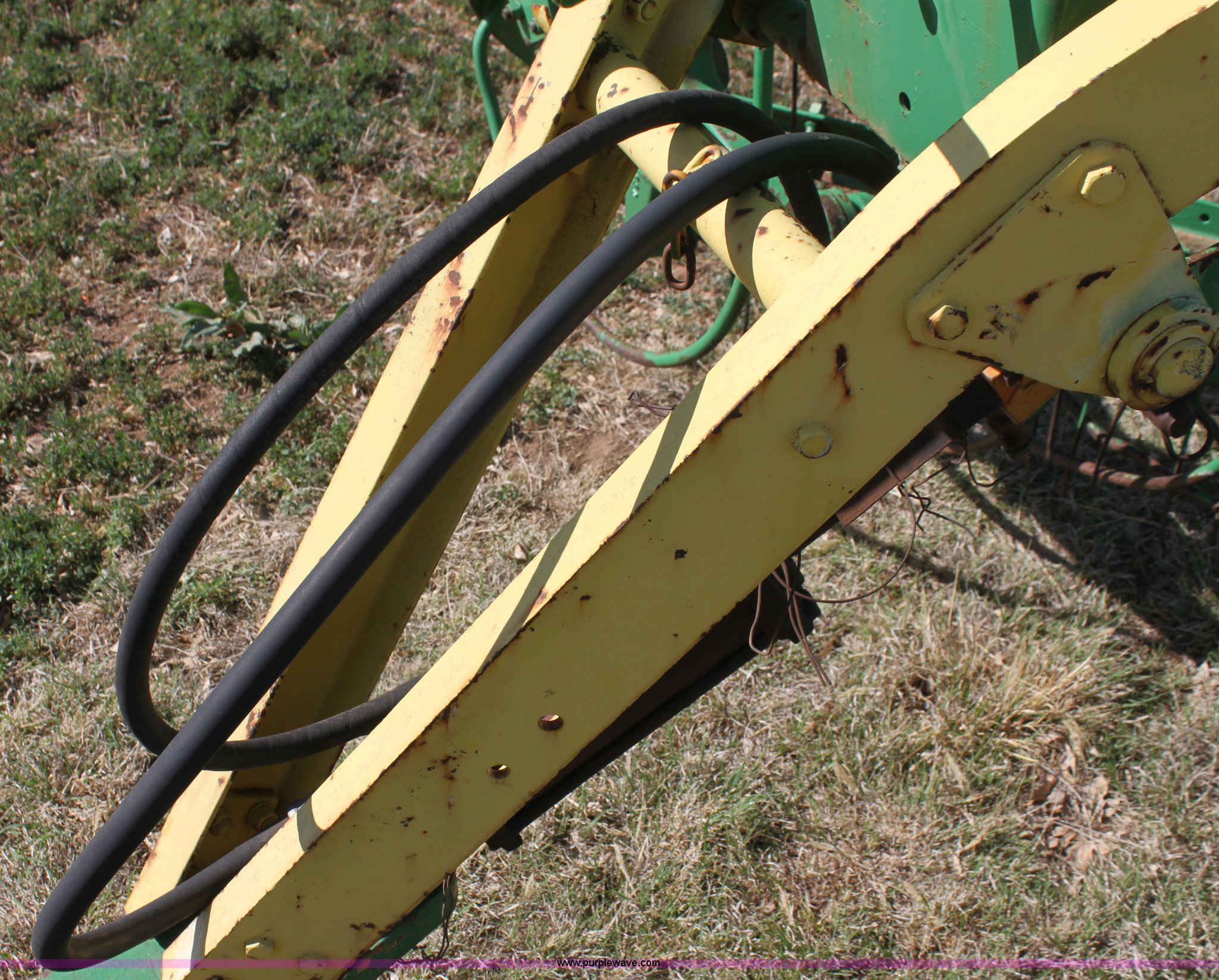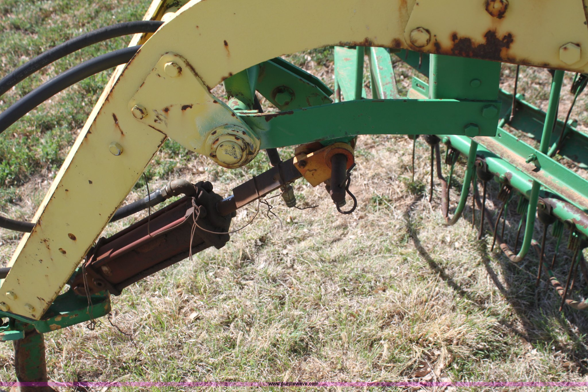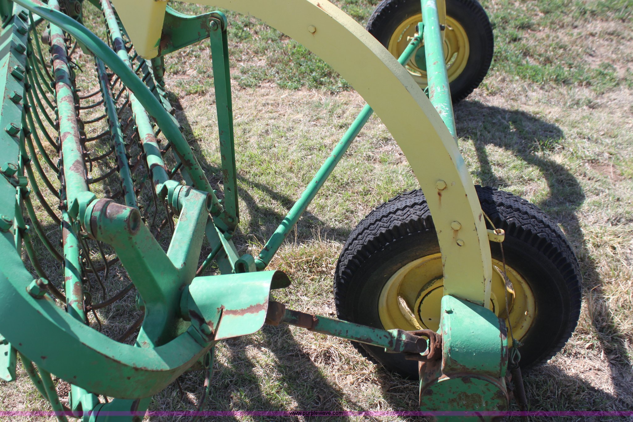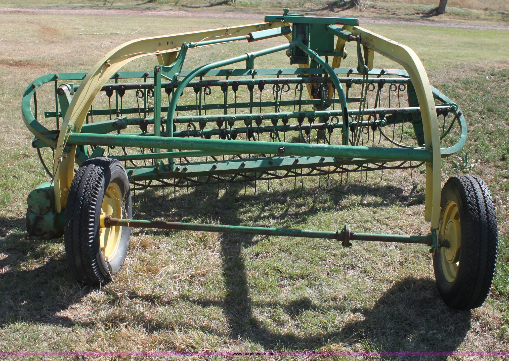 Purple Wave is selling a used Hay Rake in Oklahoma. This item is a John Deere 858 side delivery rake with the following: 10'W, Hydraulic height adjust, Ground driven, 15" tires, Serial 87029
