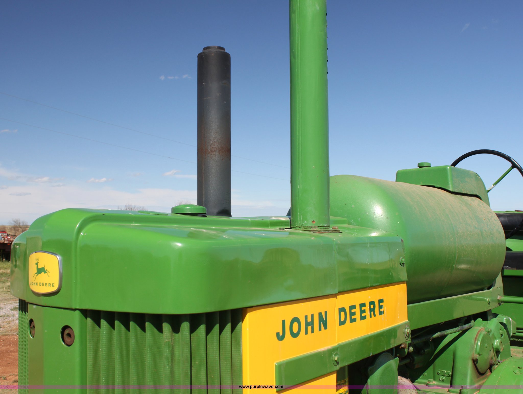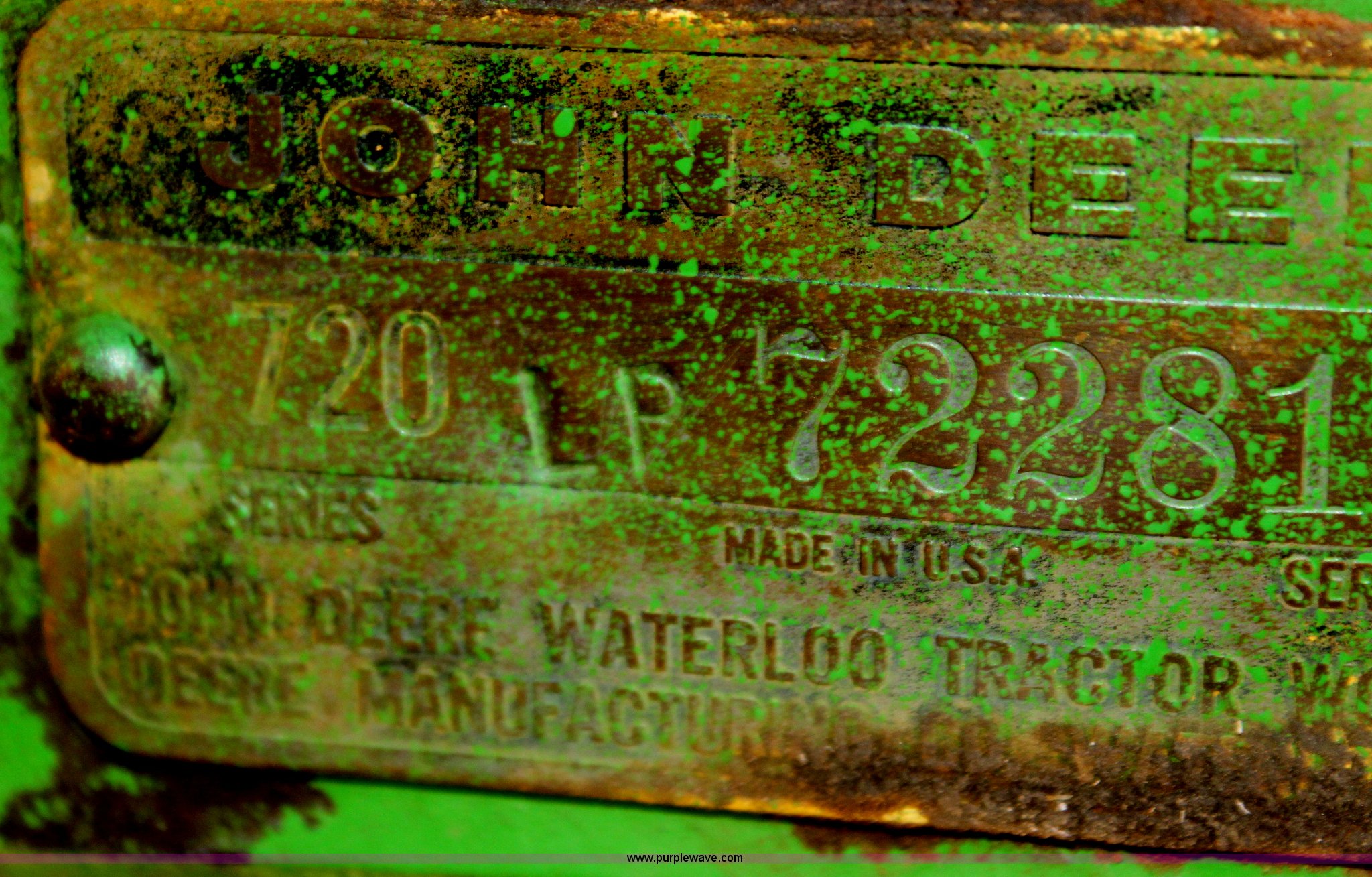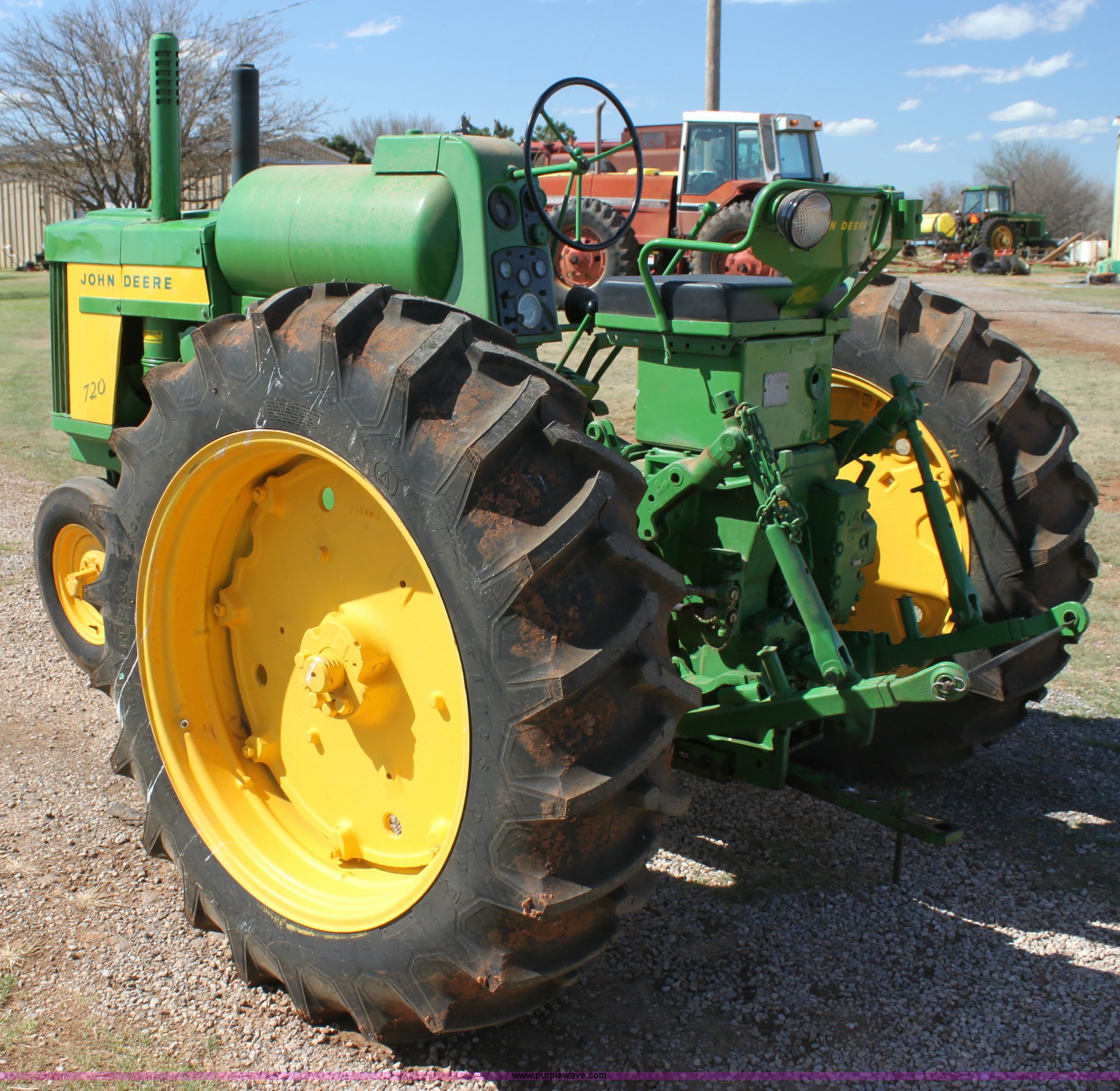 Purple Wave is selling a used Tractor in Oklahoma. This item is a John Deere 720 tractor with the following: .4 hours on meter, Unknown actual hours, Two cylinder LP engine, 6F-1R gears, Hand clutch, Three point, 540 PTO, Draw bar, Rear hydraulic remote, John Deere Custom POWR-TR01 Roll-o-Matic front end, 6.00-16 front tires, 15.5-38 rear tires, Recently replaced tires, Serial 720LP722817