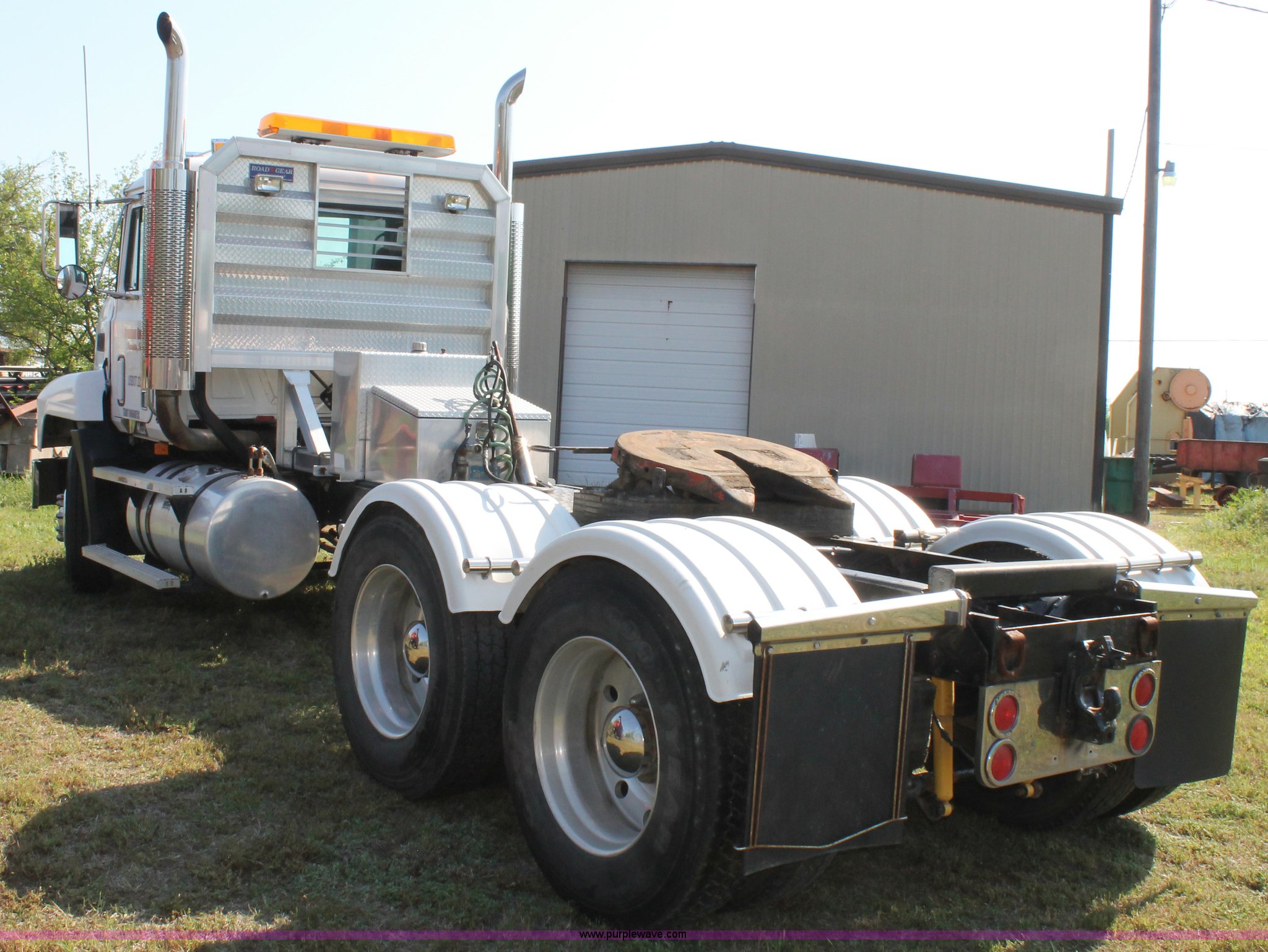 Purple Wave is selling a used Truck Tractor in Texas. This item is a 1993 Mack CH613 semi truck with the following: 519,098 miles on odometer, Mack E7 12.0L L6 diesel engine, Nine speed manual transmission, AC and heat, Tilt, Cruise, AM/FM/cassette, Passenger daylight door, Air suspension seat, Air ride cab, Headache rack, Window, Chain hanger, Chrome bumper, Block heater, Air slide fifth wheel, Dual 120 gallon fuel tanks, Dual rear exhaust stacks, Aluminum deck plate, Aluminum full fenders, Pintle hitch, PTO, Wet kit, Air suspension, Air brakes, Aluminum wheels, 139" wheelbase, 11R24.5 tires, GVWR 50,000 lbs