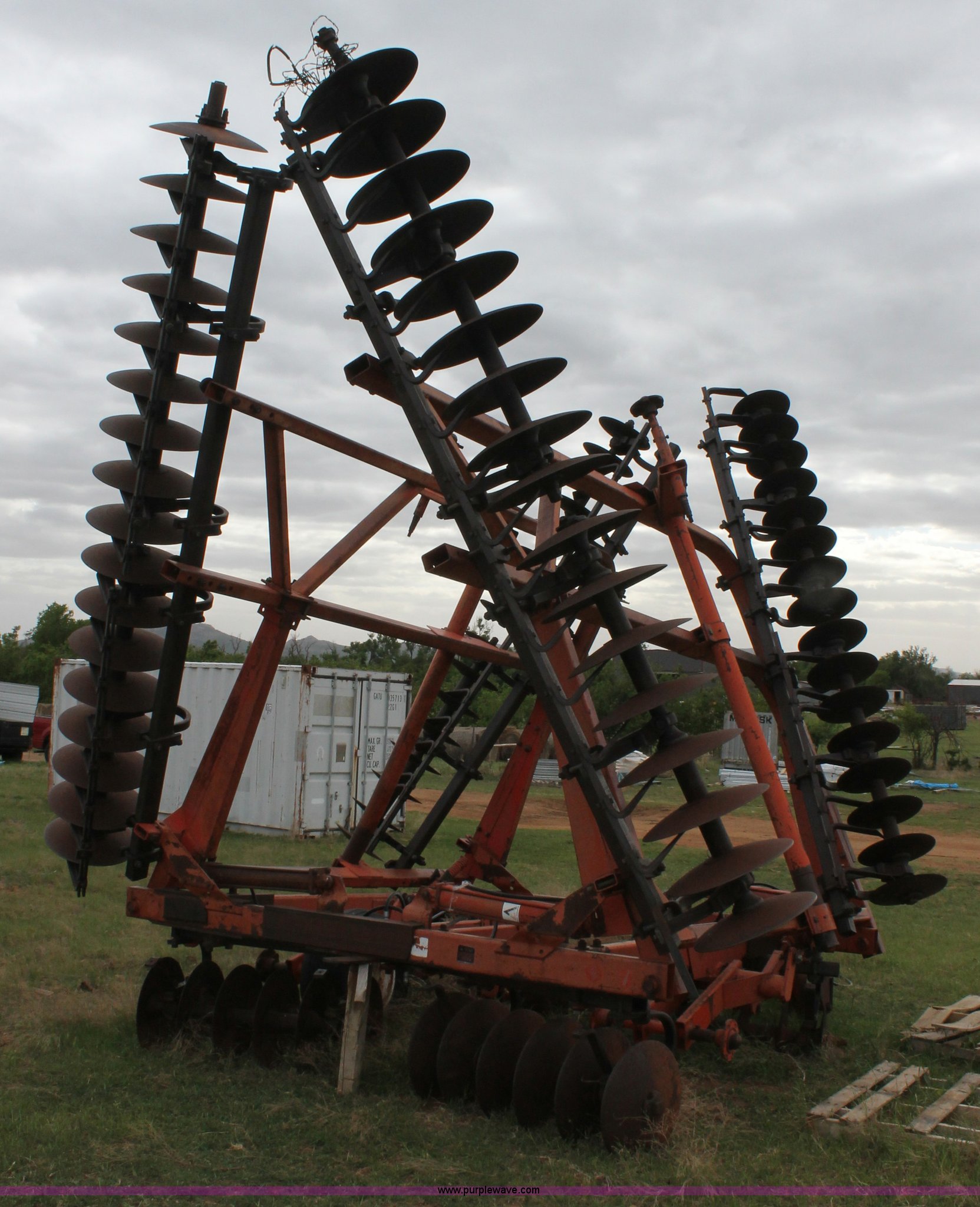 Purple Wave is selling a used Disk in Oklahoma. This item is a Allis Chalmers HD2500 34' tandem disk with the following: 16 3/4" disks, Hydraulic raise and lower, Hydraulic double fold, Clevis hitch, Rear hitch, Six bolt hubs, Missing all but one tire, Two hubs missing on each wing, Frame repairs