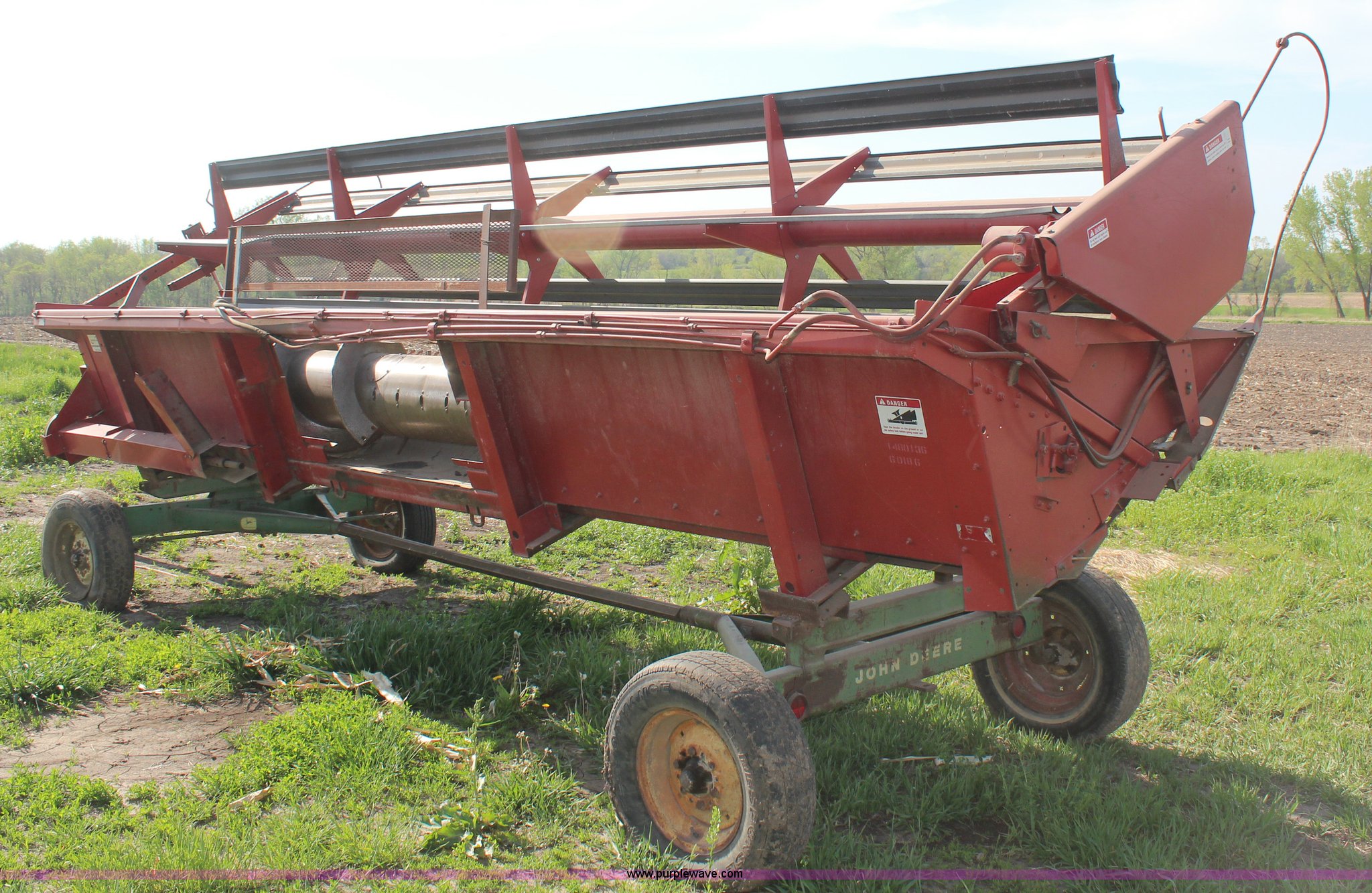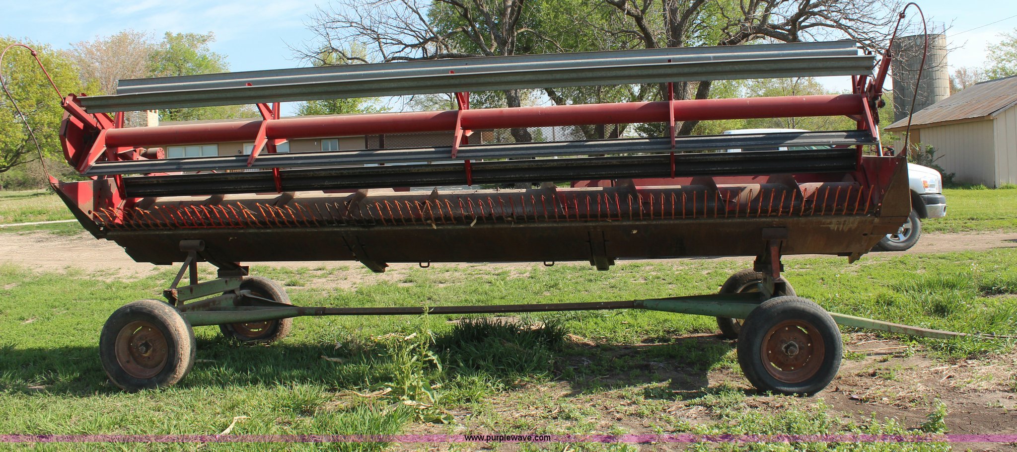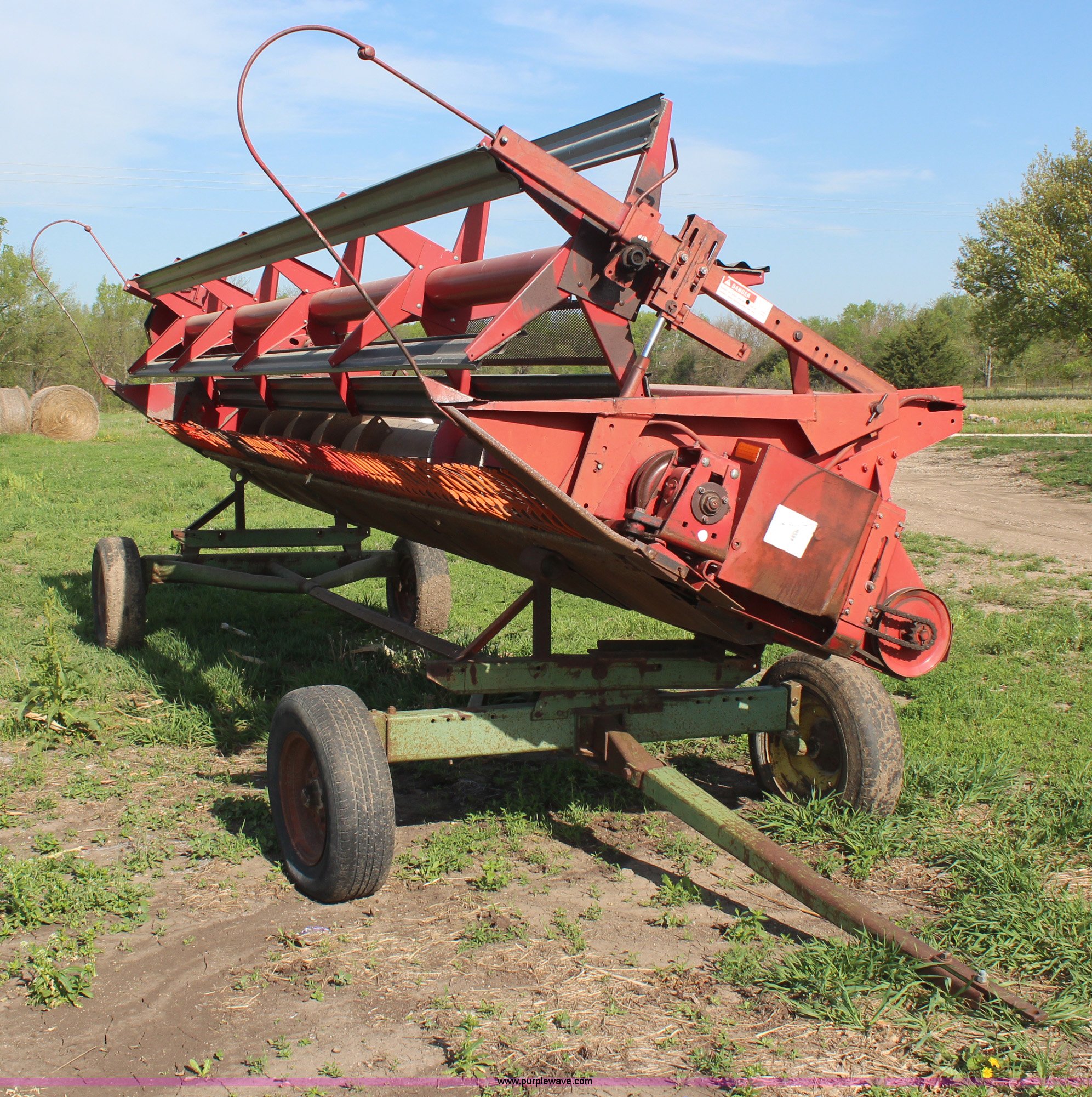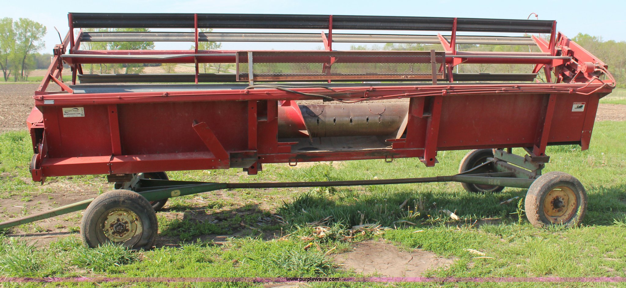 Purple Wave is selling a used Platform or Stripper Head in Kansas. This item is a International 810-20 rigid platform head with the following: 20'W platform, Bat reel, Hydraulic reel lift, Milo guards, John Deere 1064 header trailer, Auger fingers mechanism broken, Serial 1480136U0L0186