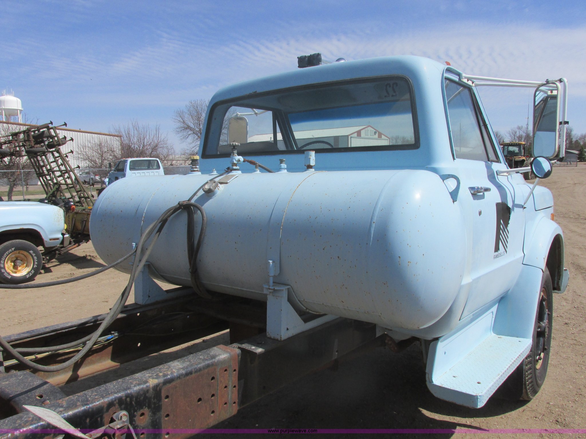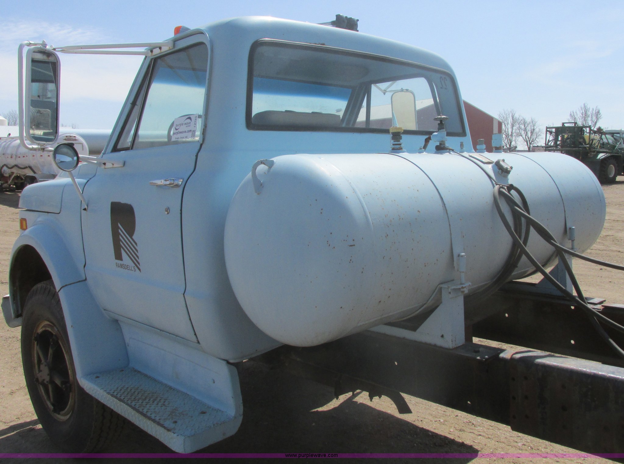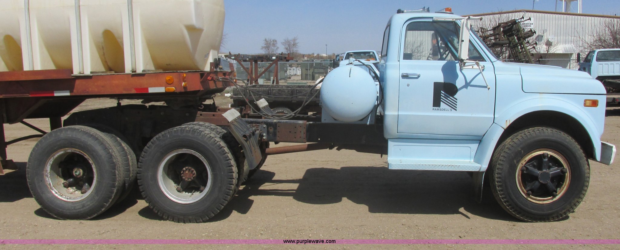 1968 Chevrolet semi truck. 12,079 miles on odometer, Eight cylinder LP engine, Five speed manual transmission, Two speed axle, Spring suspension seat, Bendex LP conversion pump, 150 gallon fuel tank, Steel deck plate, Spring suspension, Air brakes, 180" wheelbase, 10.00-20 front tires, 10.00-20 rear tires, GVWR 24,000 lbs, Passenger door issue, No passenger seat, Trailer not included, Unit# 22. CE63BB122521. View equipment video. Ramsdells F&M Ltd.. 308 S Veterans St. Flandreau, SD 57028