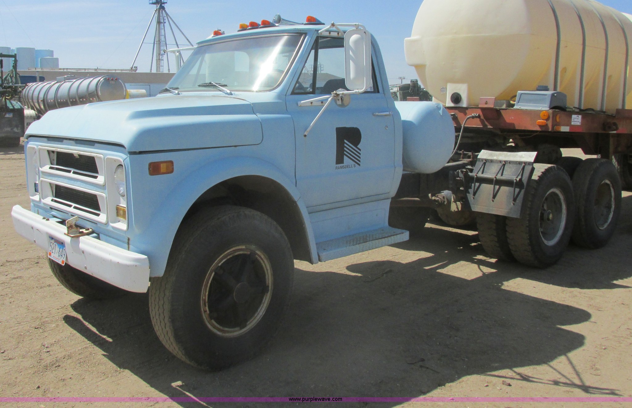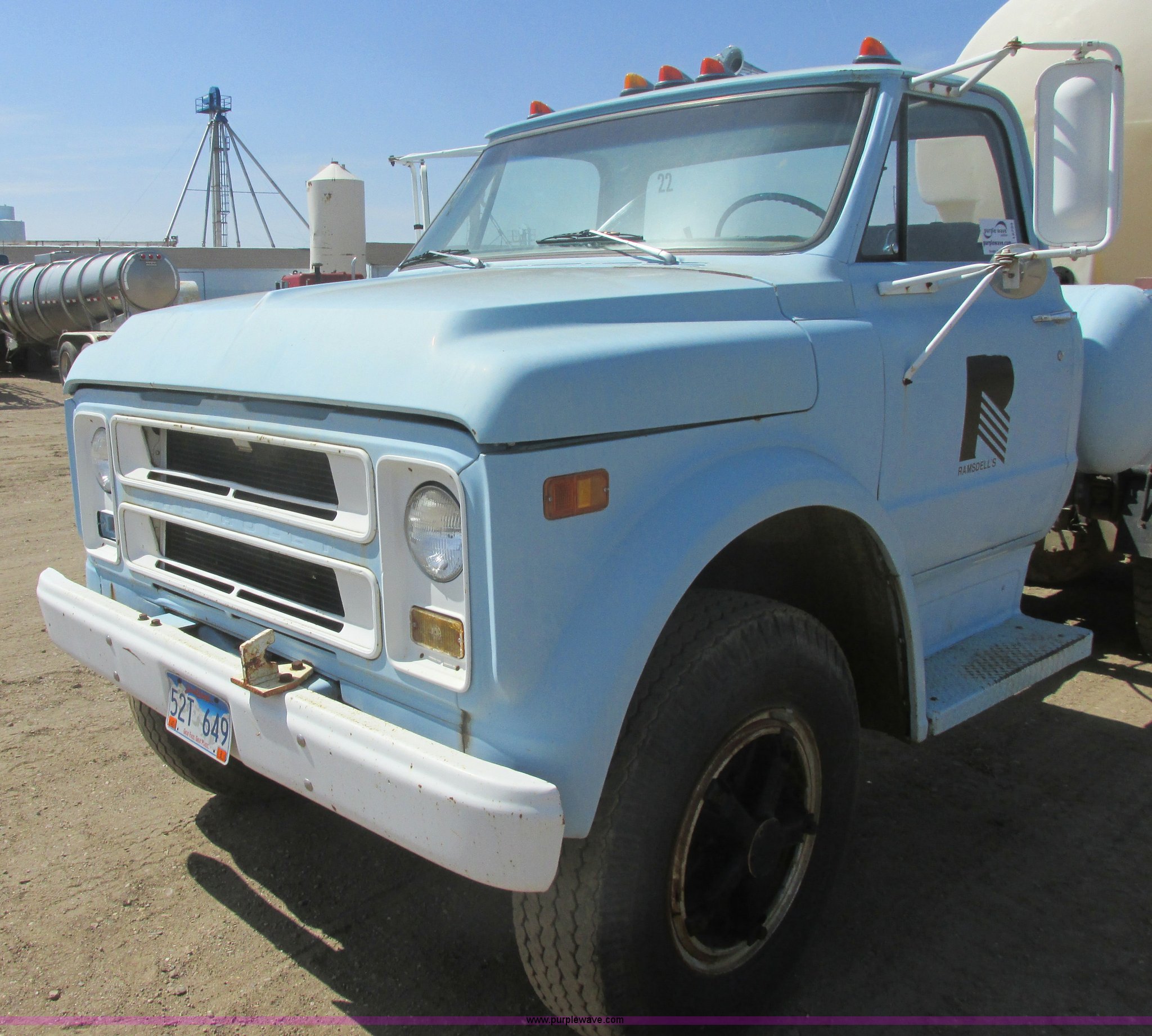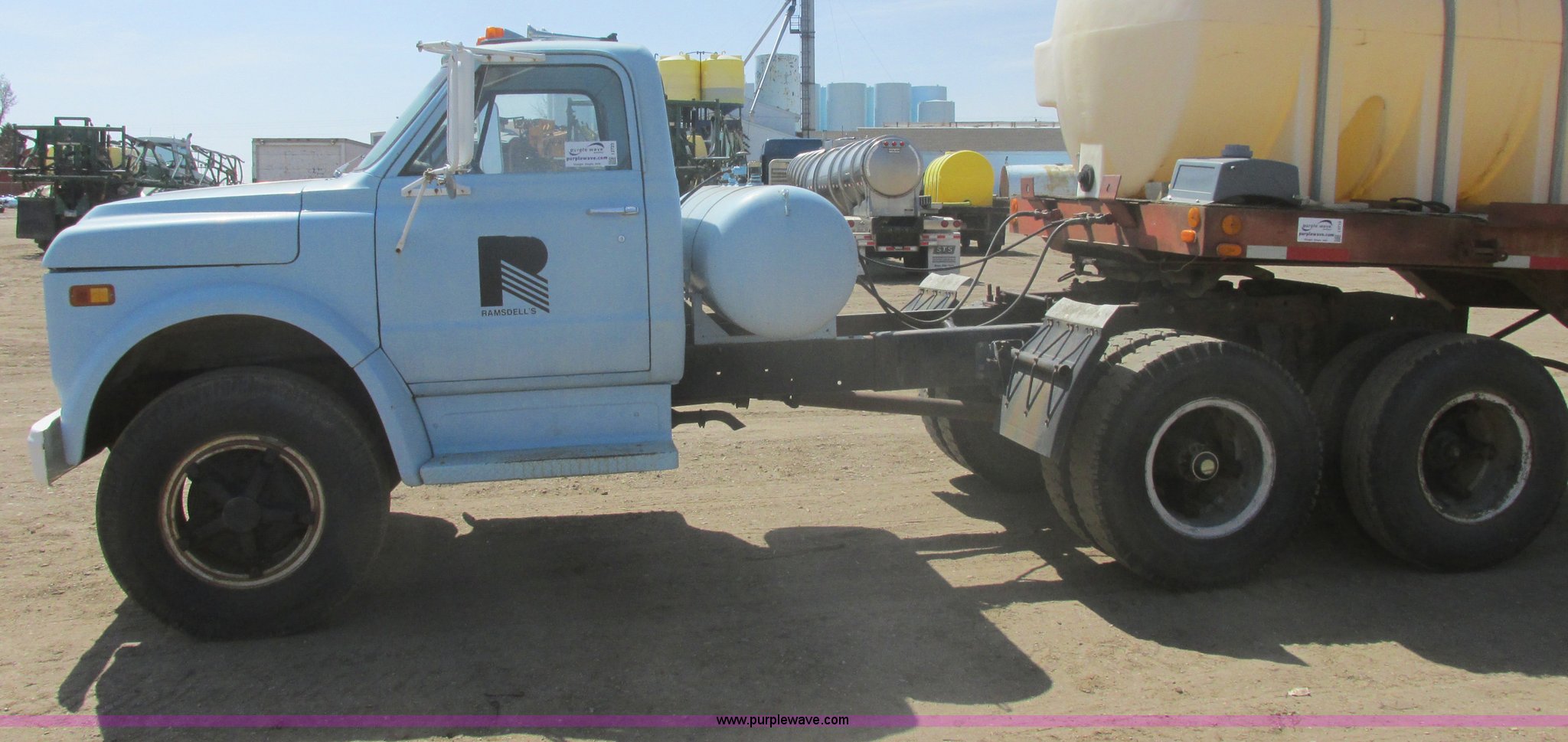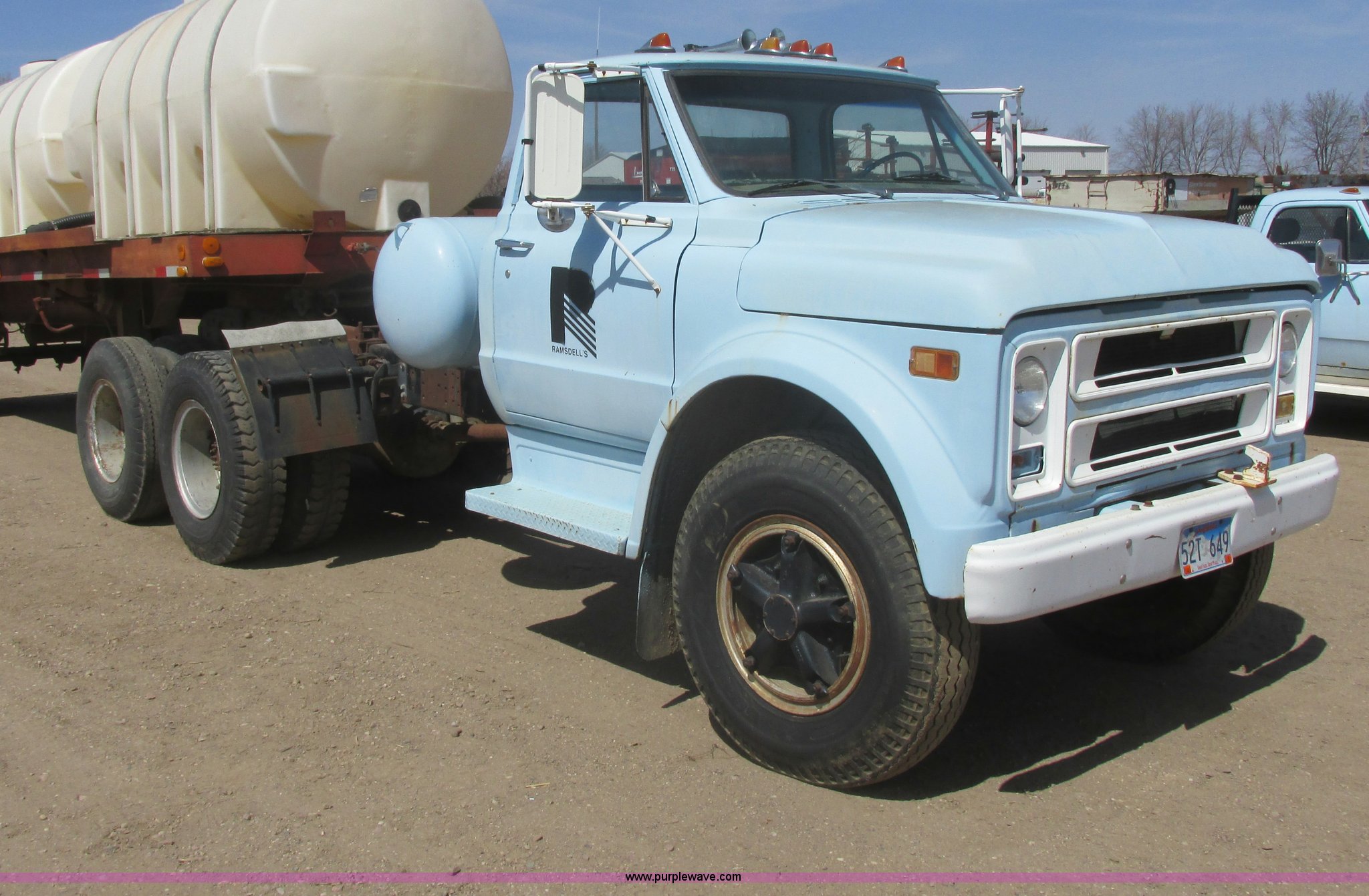 1968 Chevrolet semi truck. 12,079 miles on odometer, Eight cylinder LP engine, Five speed manual transmission, Two speed axle, Spring suspension seat, Bendex LP conversion pump, 150 gallon fuel tank, Steel deck plate, Spring suspension, Air brakes, 180" wheelbase, 10.00-20 front tires, 10.00-20 rear tires, GVWR 24,000 lbs, Passenger door issue, No passenger seat, Trailer not included, Unit# 22. CE63BB122521. View equipment video. Ramsdells F&M Ltd.. 308 S Veterans St. Flandreau, SD 57028