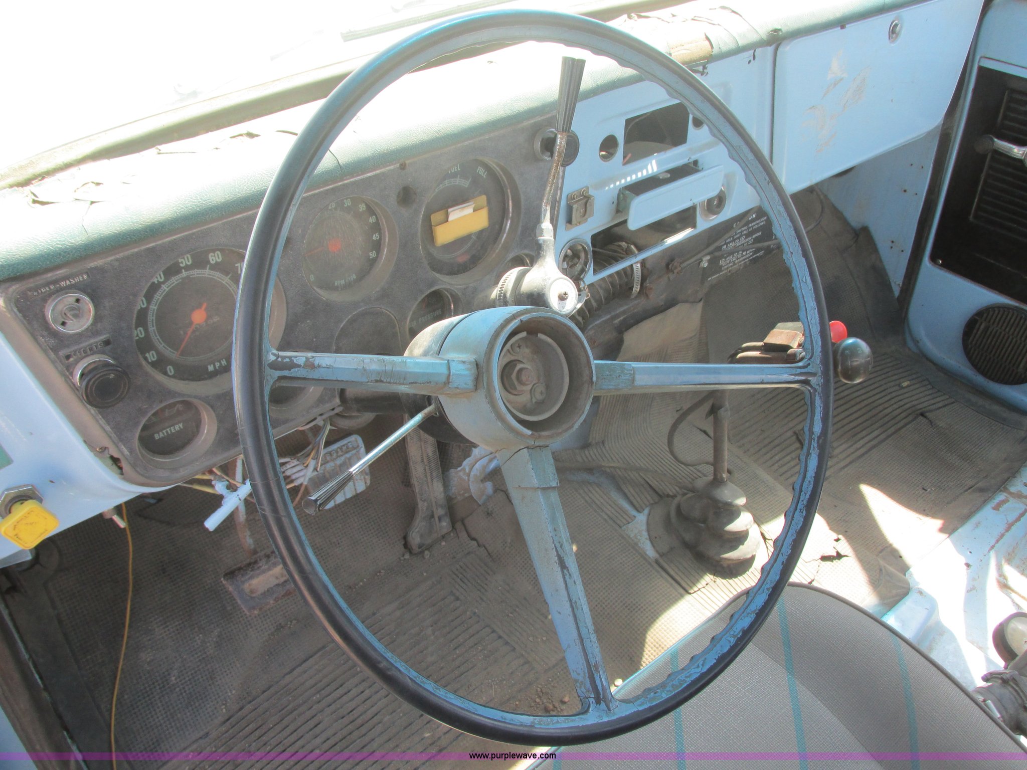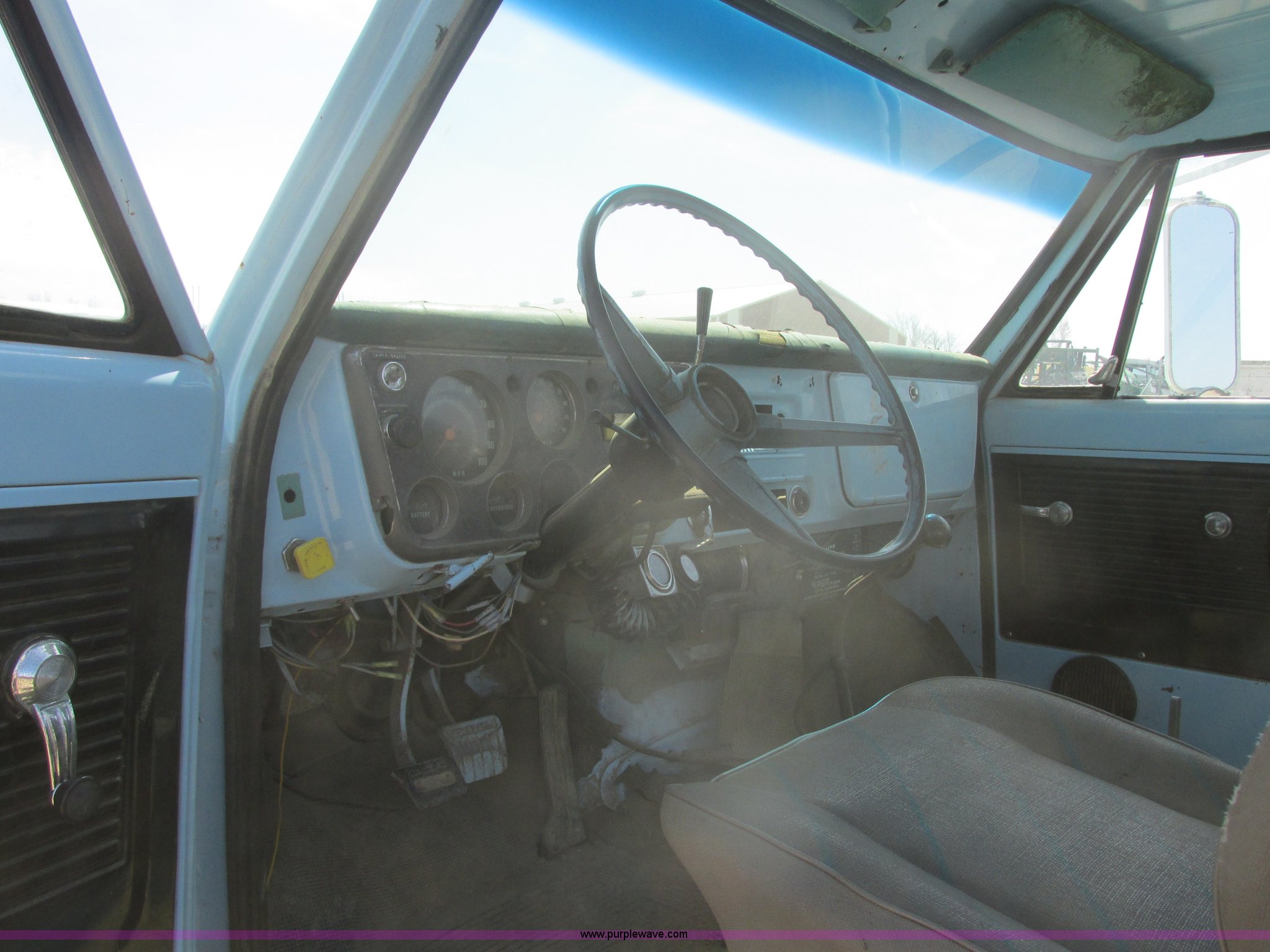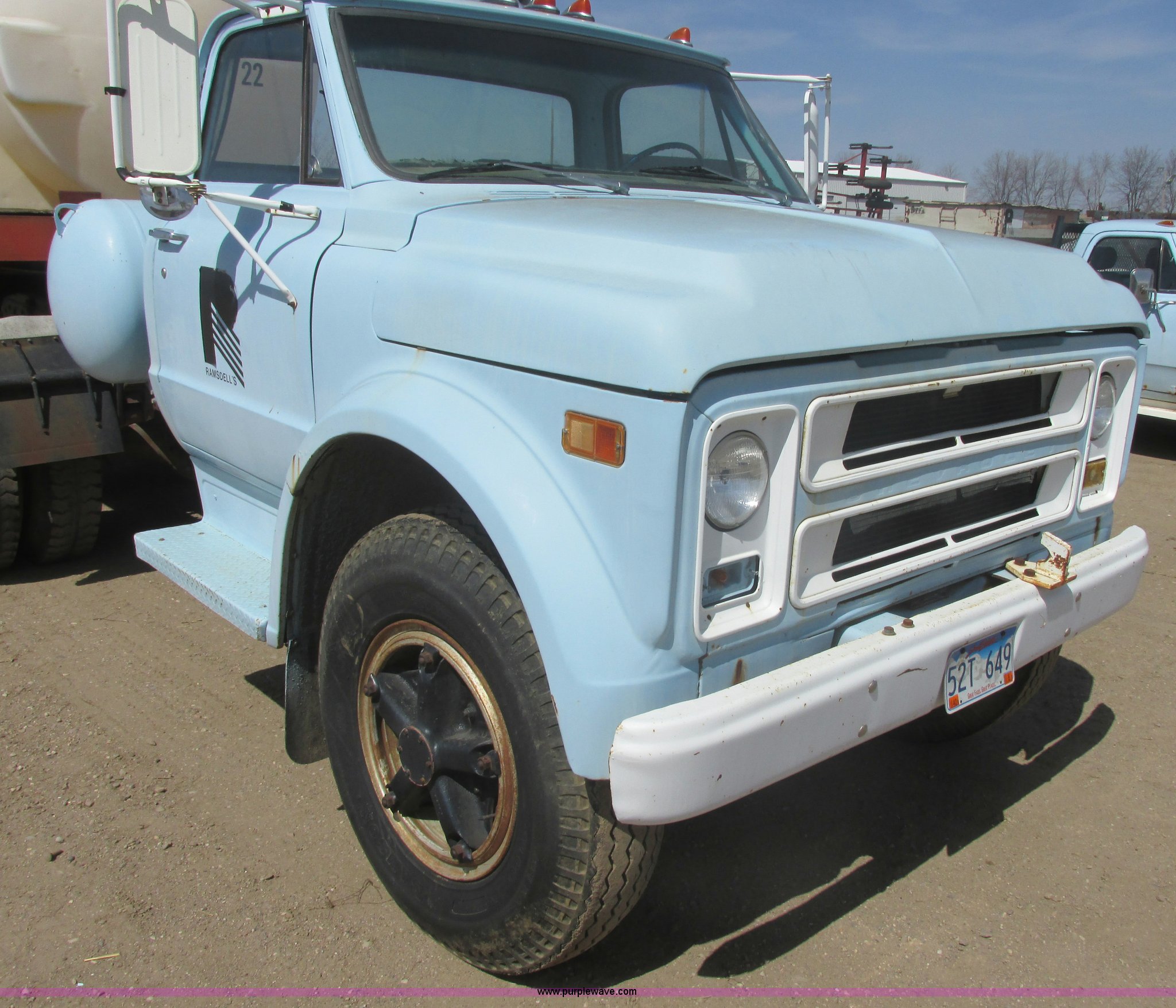 Purple Wave is selling a used Truck Tractor in South Dakota. This item is a 1968 Chevrolet semi truck with the following: 12,079 miles on odometer, Eight cylinder LP engine, Five speed manual transmission, Two speed axle, Spring suspension seat, Bendex LP conversion pump, 150 gallon fuel tank, Steel deck plate, Spring suspension, Air brakes, 180" wheelbase, 10.00-20 front tires, 10.00-20 rear tires, GVWR 24,000 lbs, Passenger door issue, No passenger seat, Trailer not included, Unit# 22
