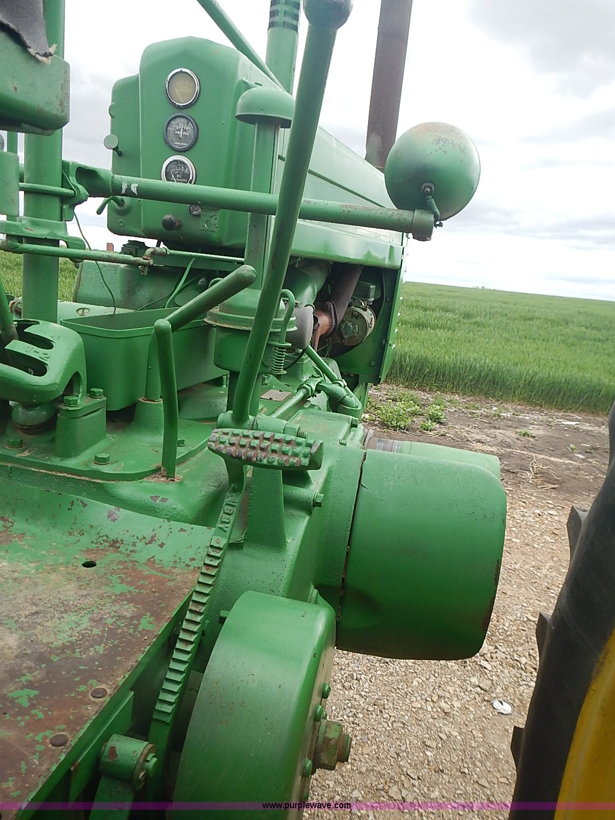 Purple Wave is selling a used Tractor in Kansas. This item is a 1947 John Deere G tractor with the following: John Deere 6.8L two cylinder multi-fuel engine, 6F-1R gears, Vinyl seat, Work lights, Flywheel pulley, Rear power hydraulics, Draw bar, 540 PTO, 6.00-16 front tires, One recently replaced, Recently replaced 14.9-38 rear tires, Anti-freeze included, Serial 58979