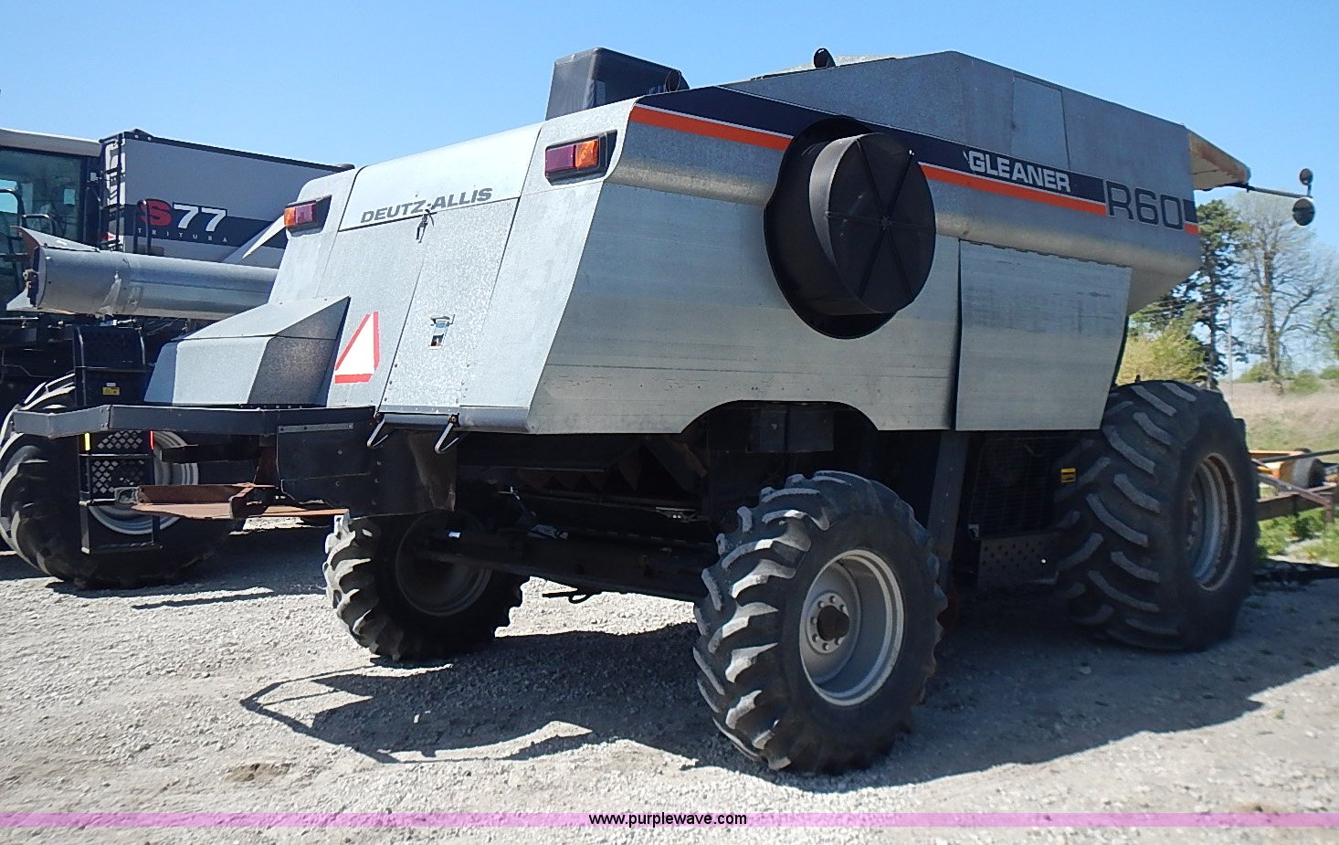 Purple Wave is selling a used Combine in Kansas. This item is a 1991 Gleaner R60 combine with the following: 2,983 engine hours on meter, 2,058 separator hours on meter, Duetz eight cylinder diesel engine, 228 HP, Serial 7987971, Type F8L513, Hydrostatic transmission, 4F-1R gears, AC, AM/FM, Cloth spring suspension seat, Tilt steering wheel, Front windshield wiper, Turn signals, Digital monitor, Fuel, Cylinder RPM, Engine RPM, Ground MPH, Tattletale V, DMC Combine Calc-U-Dri, Pacer, Shoe, Total, Cylinder, Set points, Range, Work lights, Straw chopper, Straw spreader, Case IH 1887 bin, 225 bu. bin capacity, Unloader swing, 30.5L-32 front tires, 16.9-24 rear tires, Dead batteries, Serial R60K016913H9191, Unit# HU502