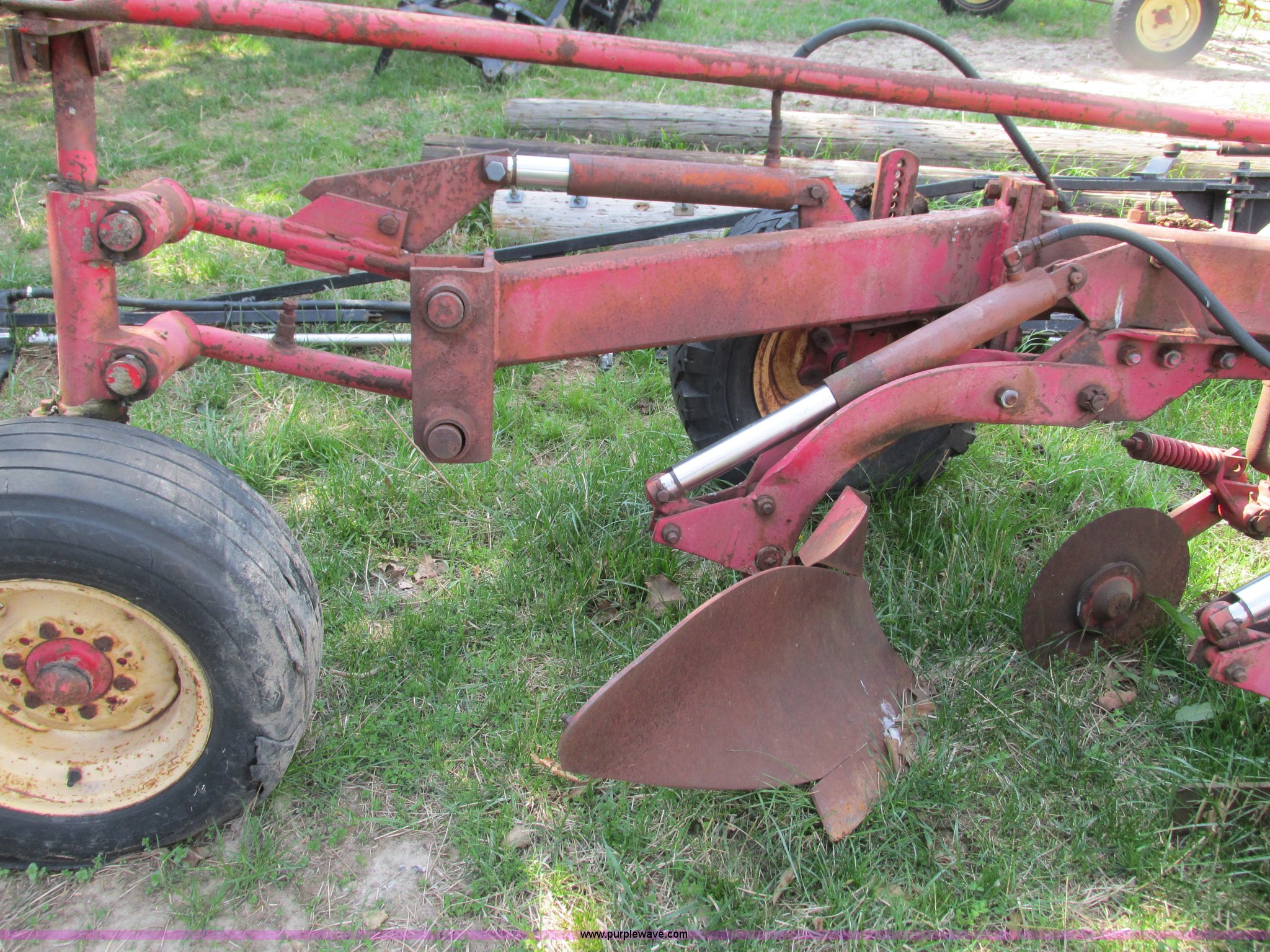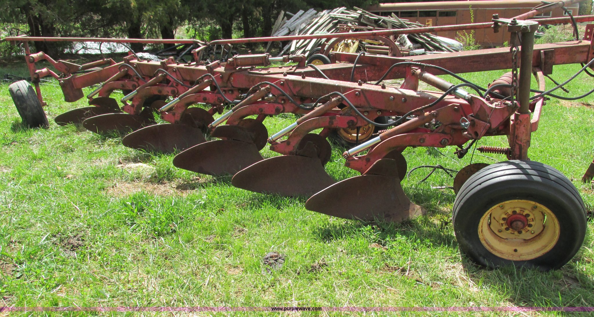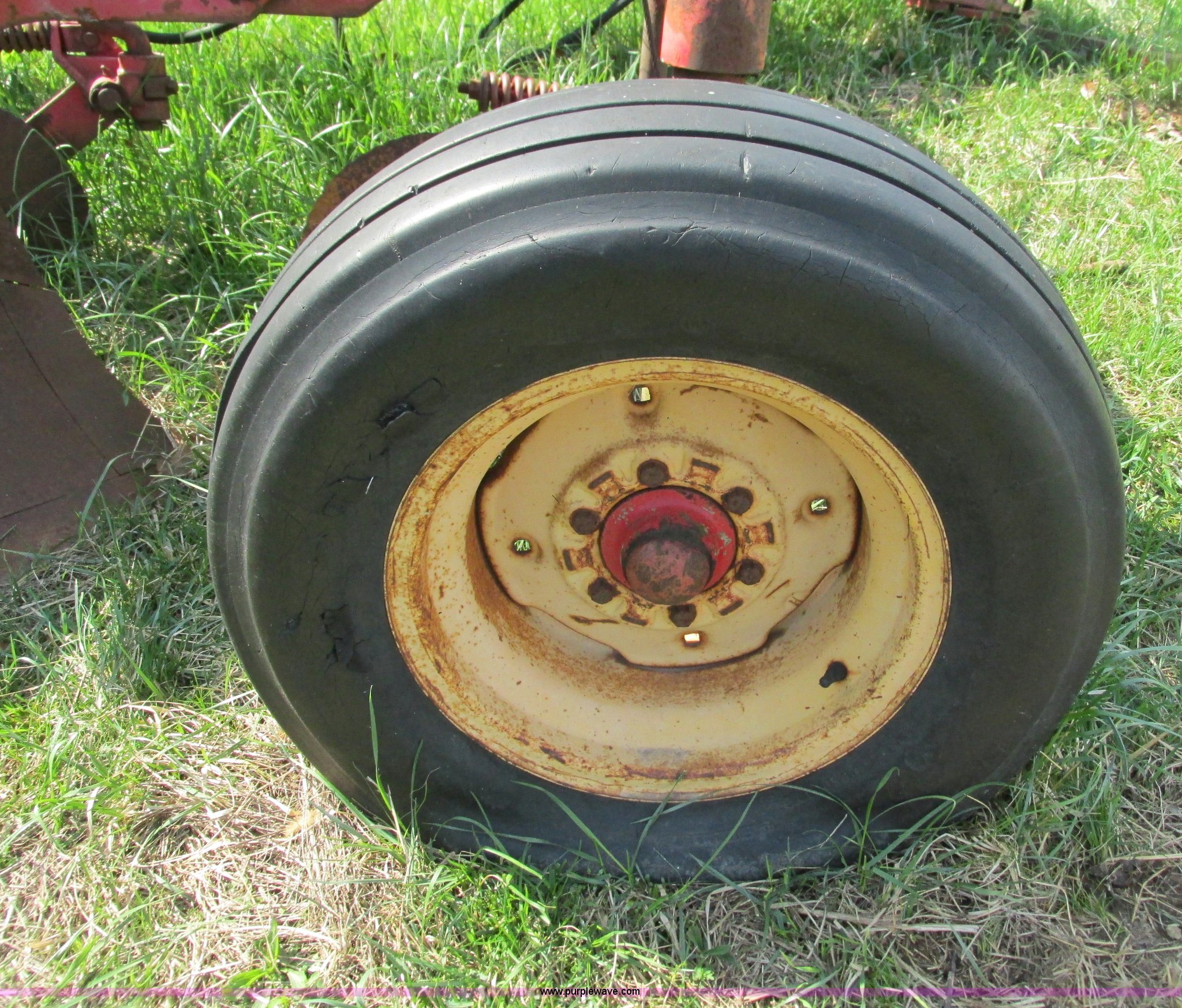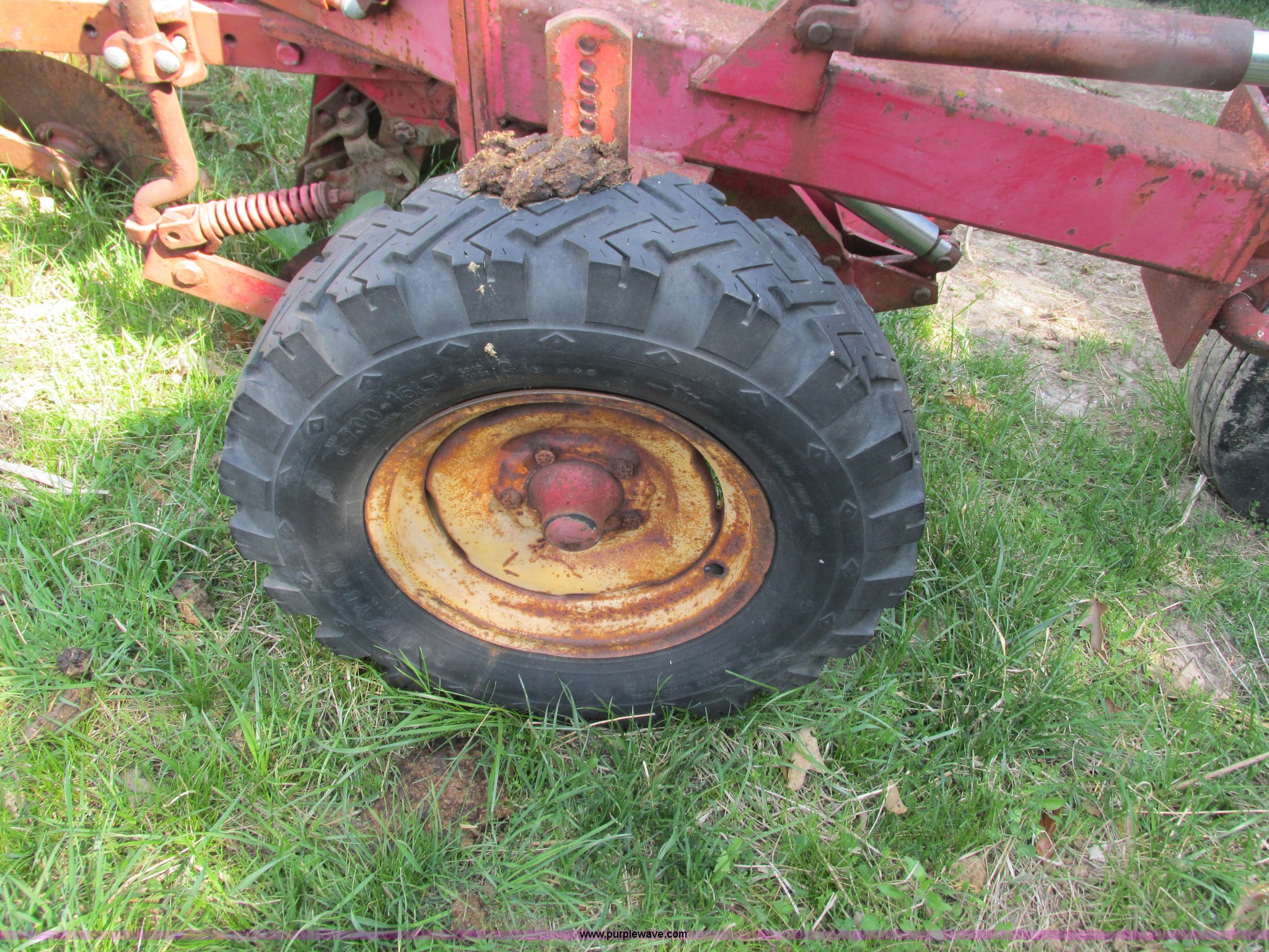 Purple Wave is selling a used Plow in Missouri. This item is a Massey-Ferguson 880 six bottom plow with the following: 16" disks, 31.5" plow at top, Approx. 21"W plow at bottom, Pin hitch, (2) 11Lx16 tires, 7x15 tire, One tire flat, Rust