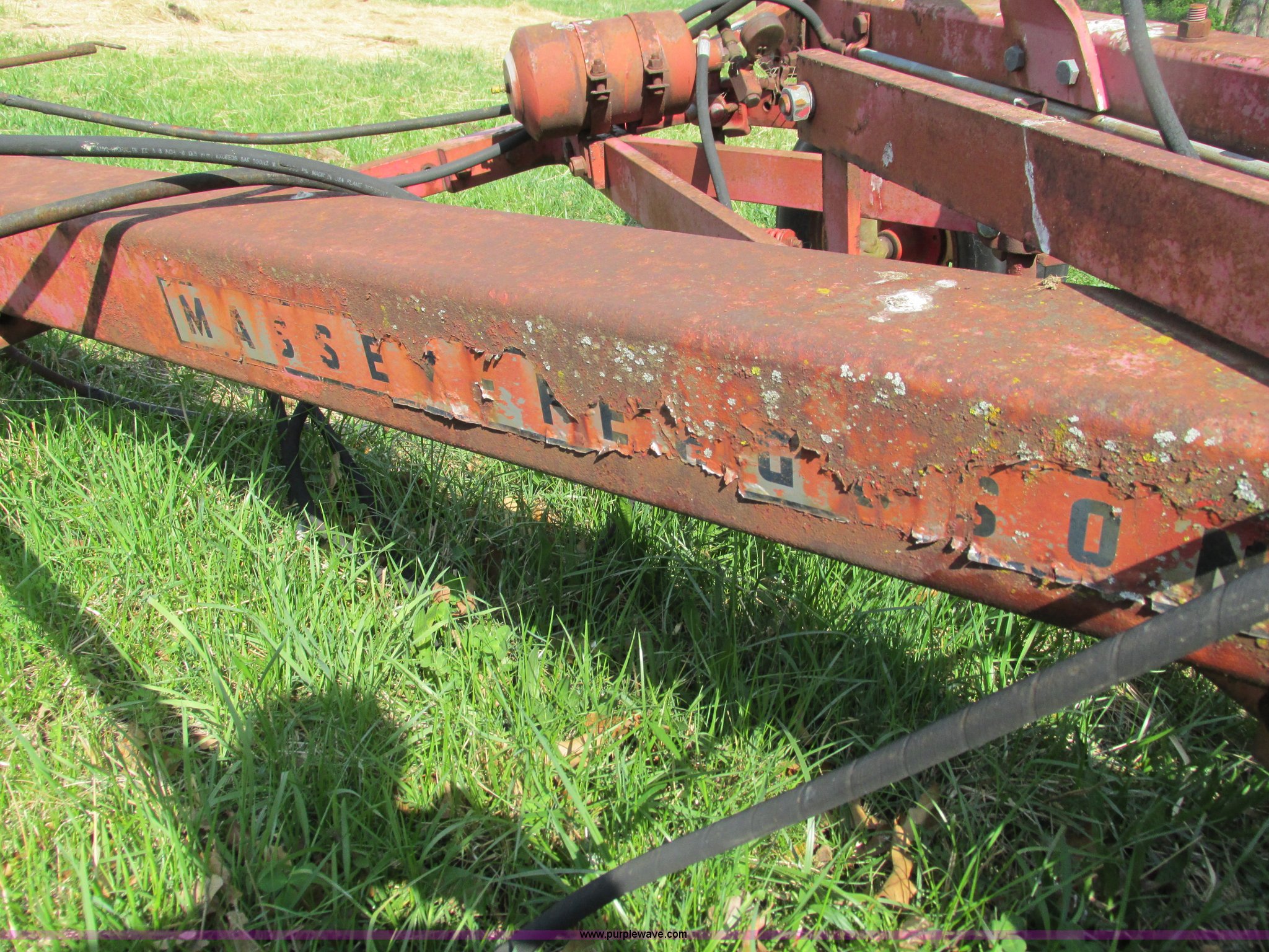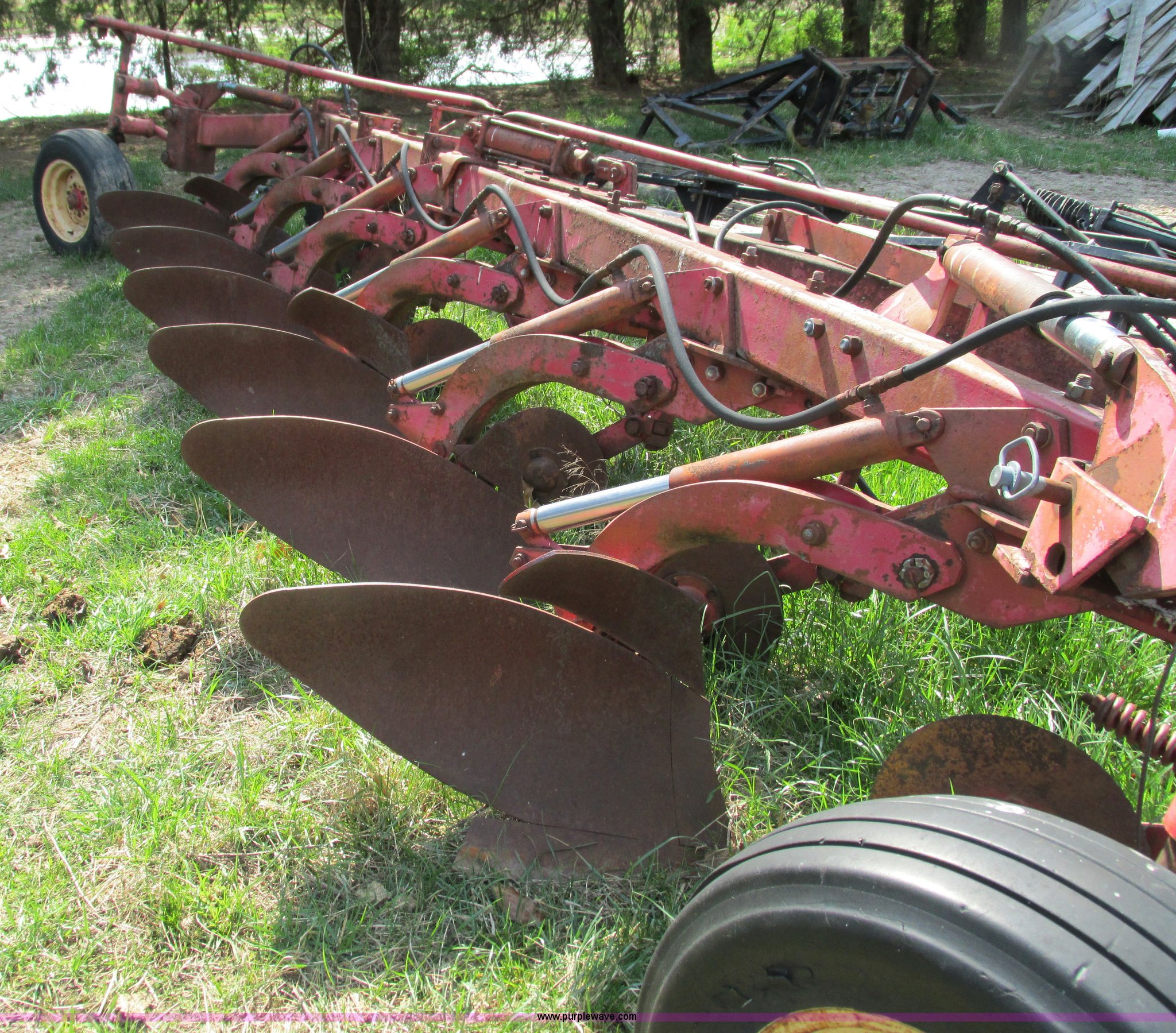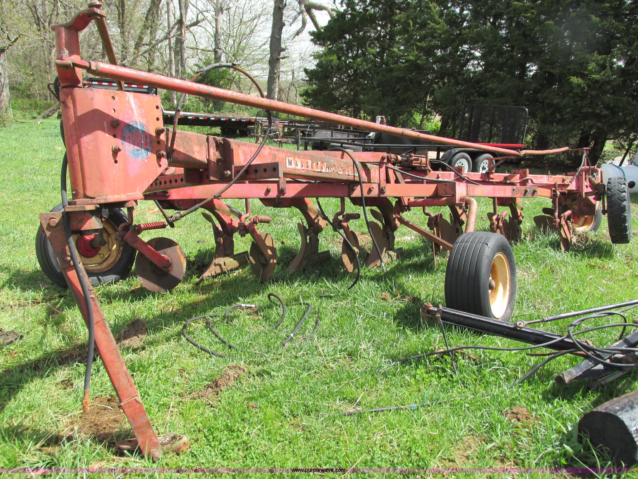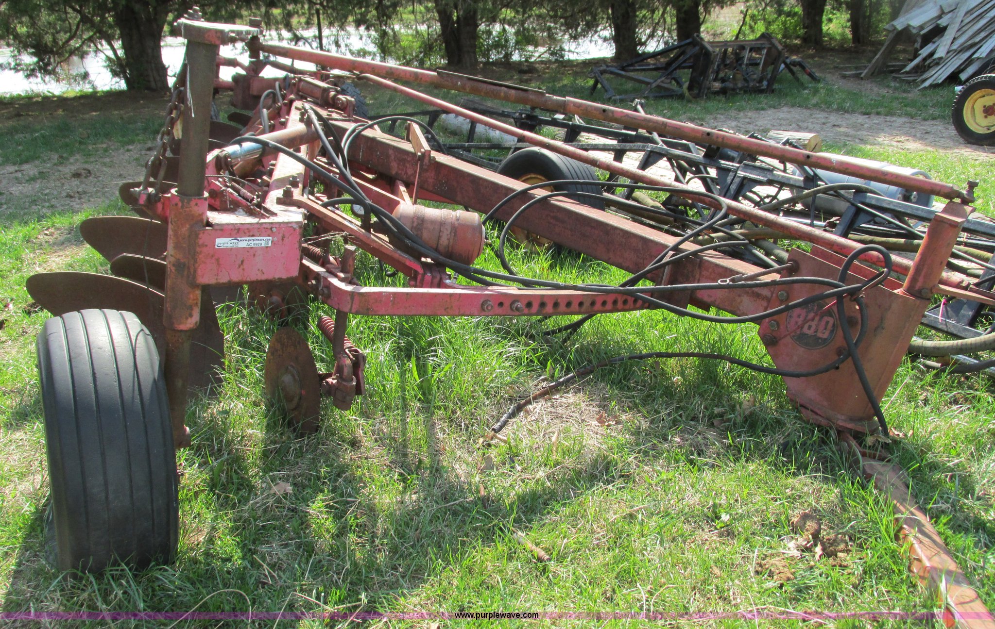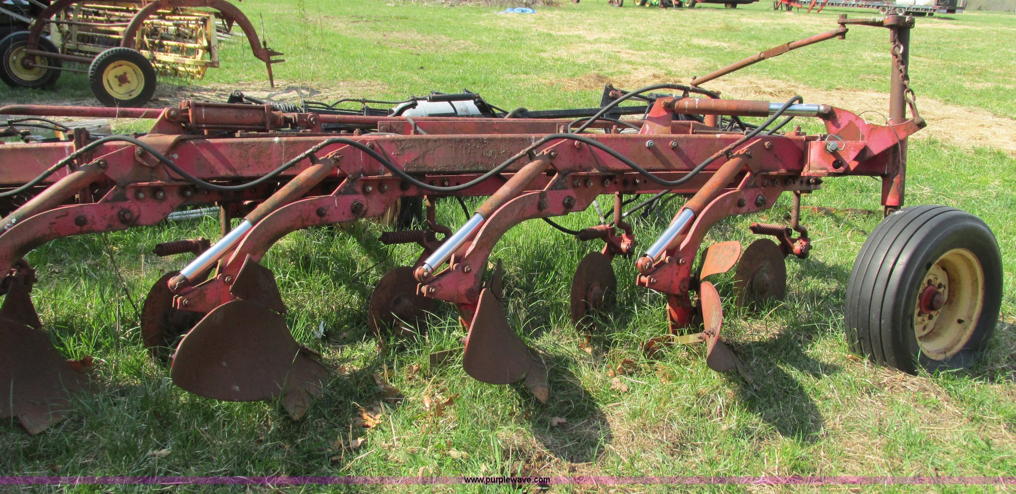 Purple Wave is selling a used Plow in Missouri. This item is a Massey-Ferguson 880 six bottom plow with the following: 16" disks, 31.5" plow at top, Approx. 21"W plow at bottom, Pin hitch, (2) 11Lx16 tires, 7x15 tire, One tire flat, Rust
