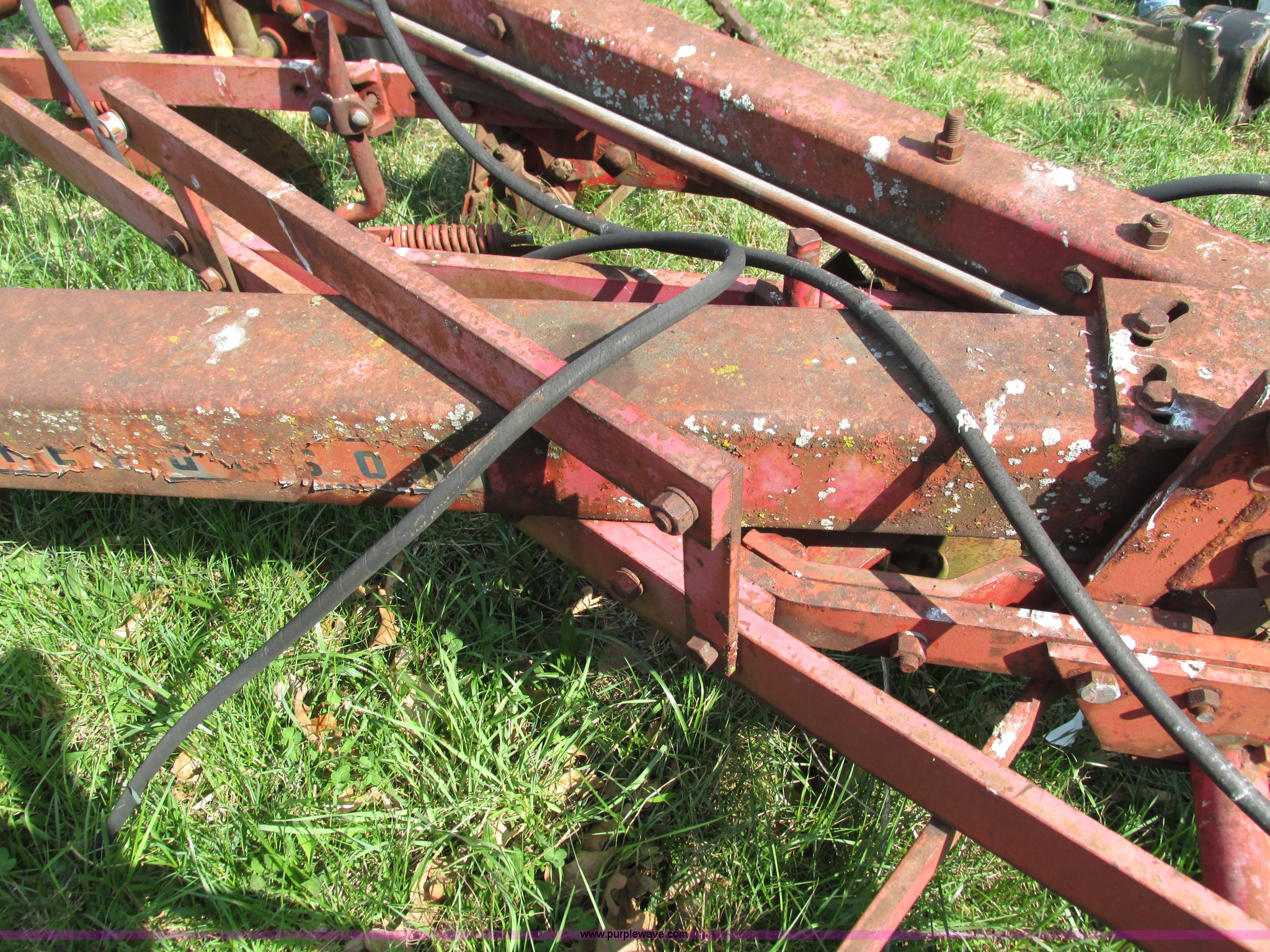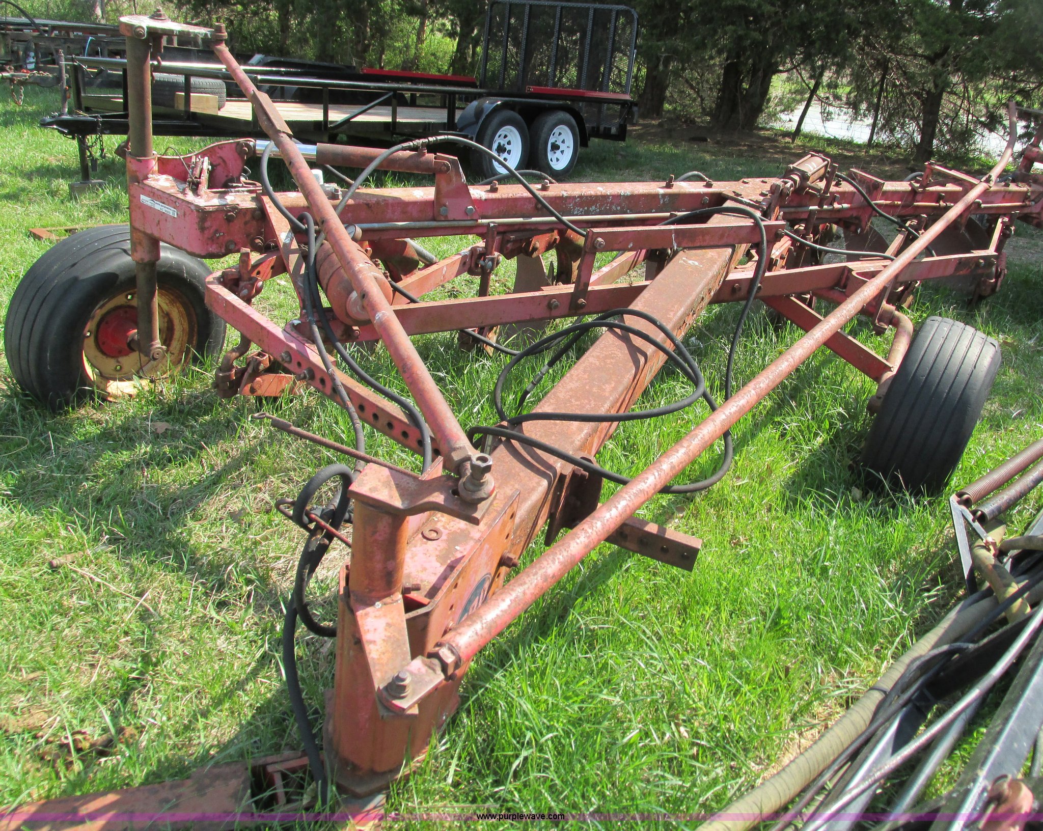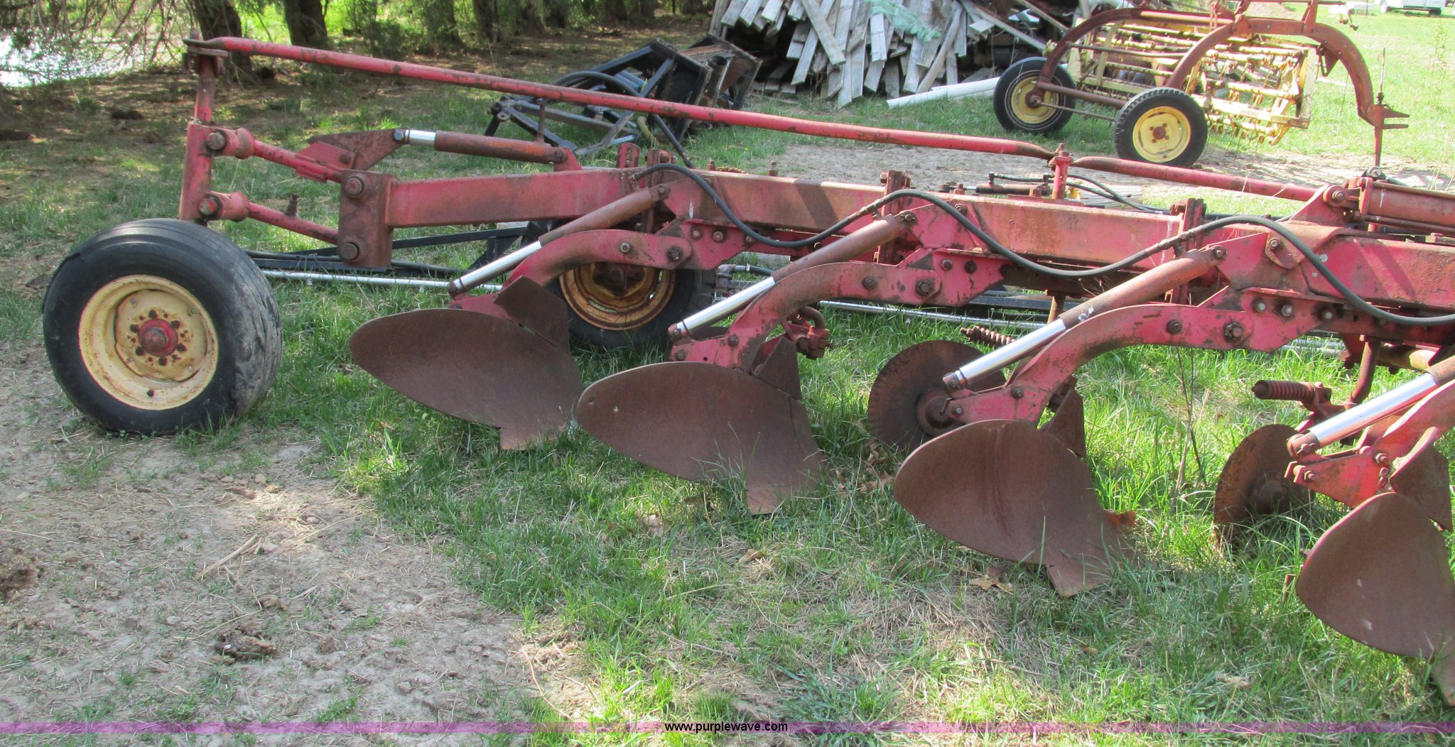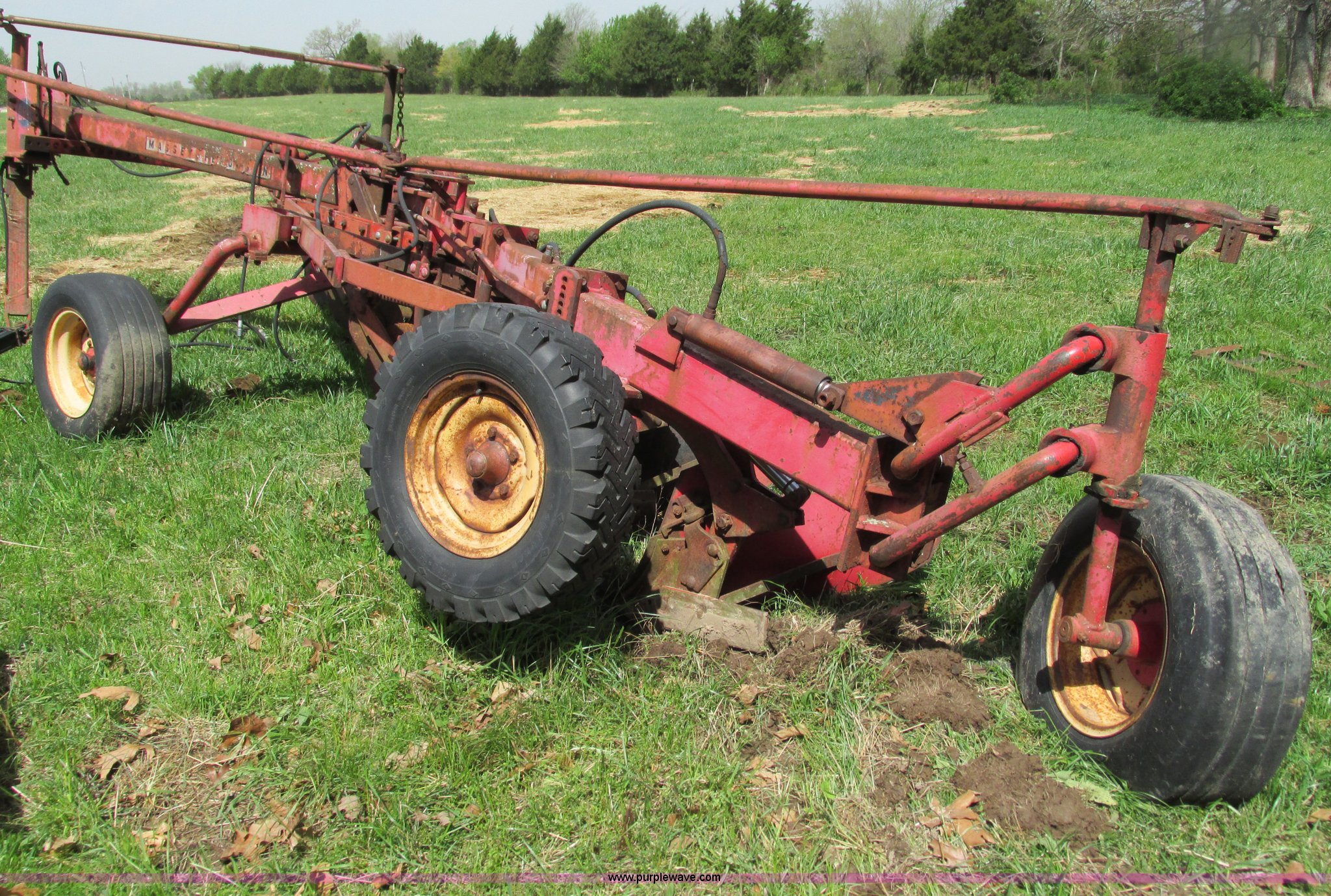 Purple Wave is selling a used Plow in Missouri. This item is a Massey-Ferguson 880 six bottom plow with the following: 16" disks, 31.5" plow at top, Approx. 21"W plow at bottom, Pin hitch, (2) 11Lx16 tires, 7x15 tire, One tire flat, Rust