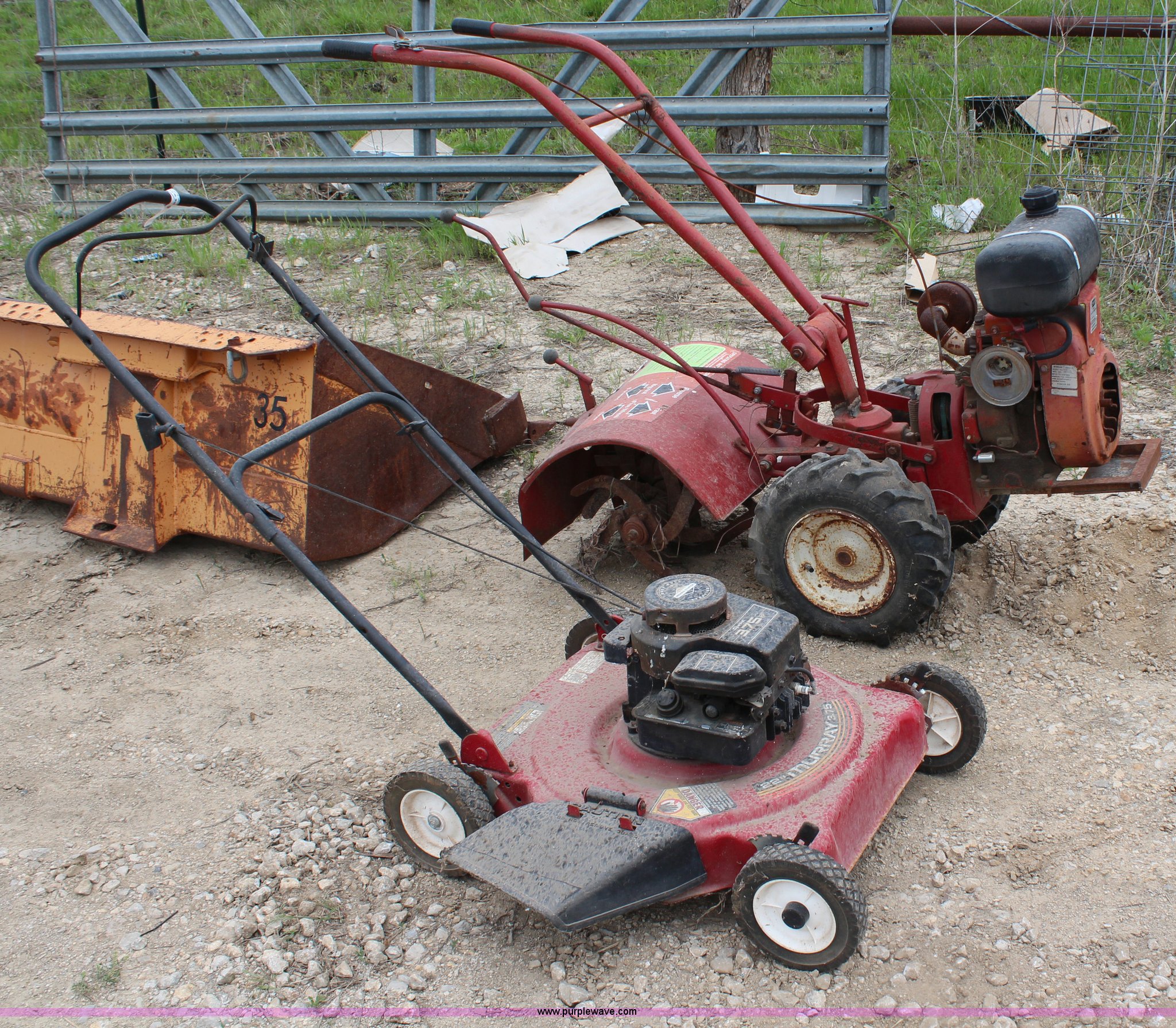 Purple Wave is selling a used Lawn Mower in Kansas. This item is a Assorted lawn and garden equipment with the following: Murray 22" push mower, Briggs & Stratton 3.75 HP gas engine, Unknown operating condition, Troy-Bilt 18" tiller, 7 HP gas engine, Recoil and air cleaner missing, Engine is free, Non-operational