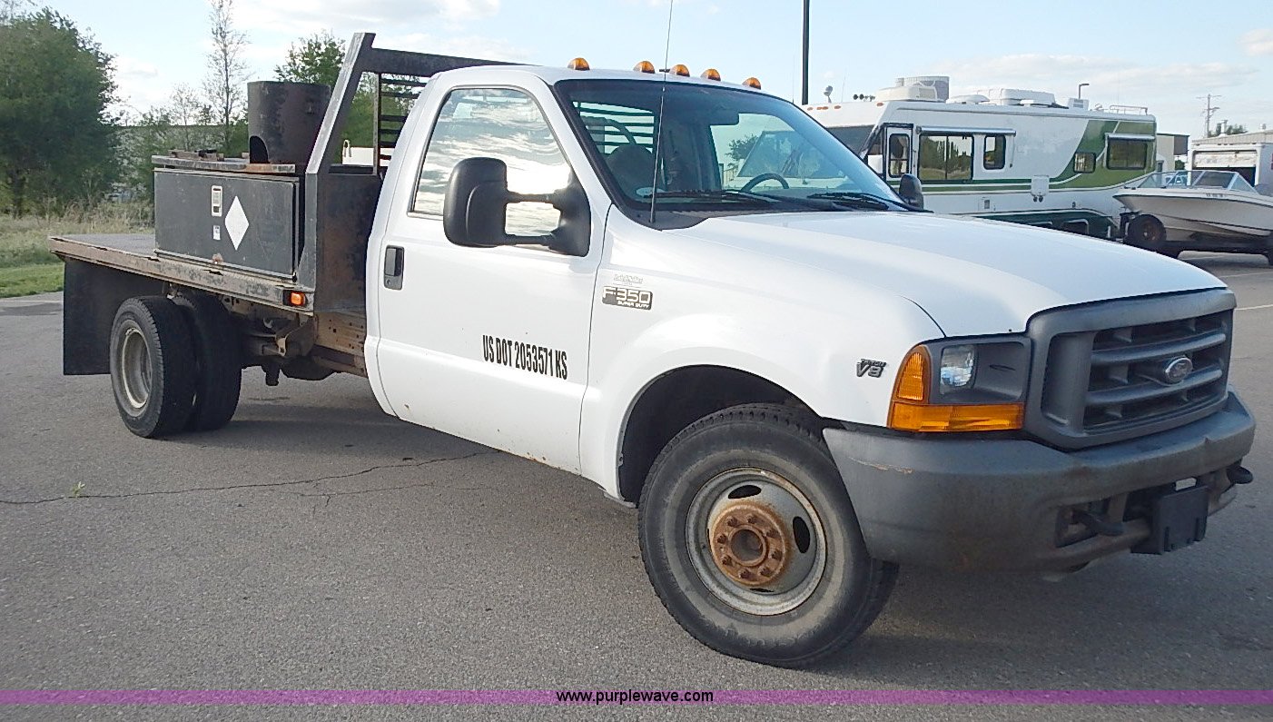 Purple Wave is selling a used 3/4 or 1 Ton Pickup or Van in Kansas. This item is a 2000 Ford F350 Super Duty XL flatbed truck with the following: 208,106 miles on odometer, 5.4L V8 SOHC 16V gas engine, Automatic transmission, AC and heat, AM/FM, Manual windows and locks, Cloth interior, 11'L x 93"W steel flatbed, Side slots for rails, Hide-away gooseneck hitch, (2) toolboxes, One toolbox will not open, Fuel tank with pump, Front hooks, Ball hitches, Trailer wiring, 235/85R16 tires, Interior/exterior cosmetic damage, Paint chipping, Rust