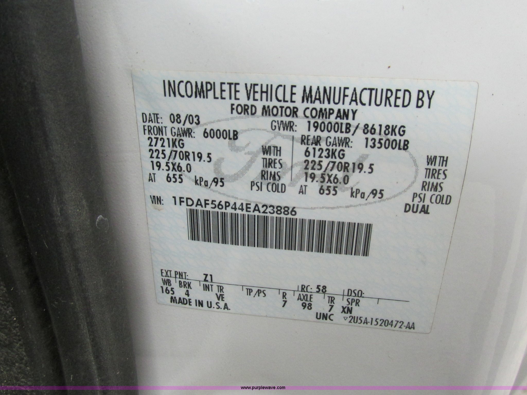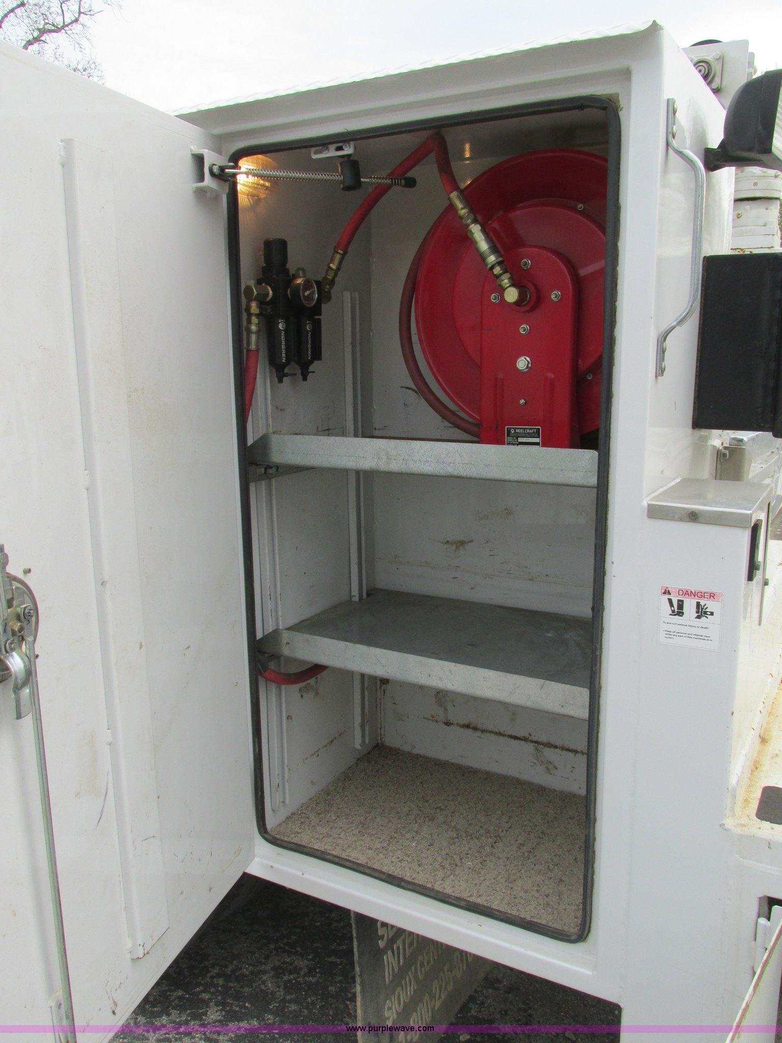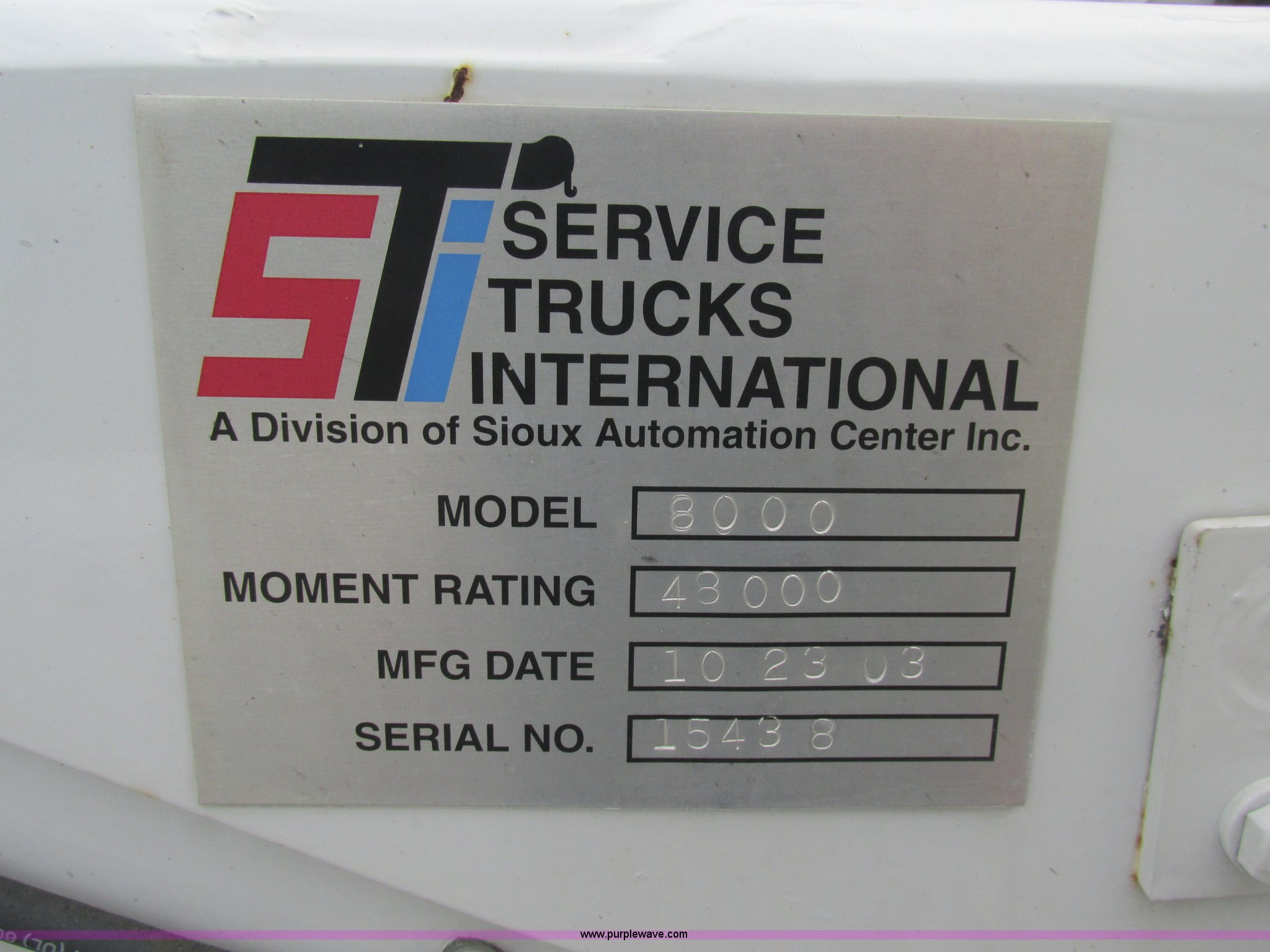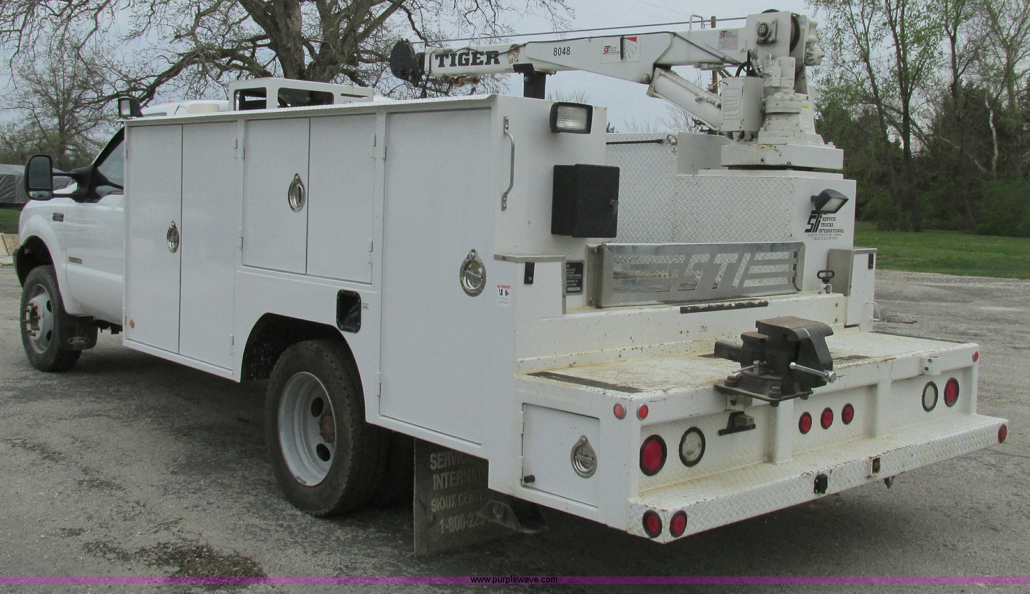 Purple Wave is selling a used Service Truck in Missouri. This item is a 2004 Ford F550 Super Duty XL service truck with crane with the following: 22,984 actual hours, 6.0L V8 OHV 32V turbo diesel engine, Five speed manual transmission, AC and heat, AM/FM, Vinyl interior, On-board engine RPM/PTO digital monitor, Tow mirrors, Bug deflector, Side window visors, International 11' service bed, STI/Tiger 8048 hydraulic crane, Model 8000, 48,000 moment rating, Serial 15438, Manual outriggers, One extends, Hydraulic controls, Tethered remote controls, 25' cord, Dual torch bottle box, Hold two 58" bottles, 3'L x 8'W tail box/work surface, 8" mounted vise, 12" x 14" x 8'W box, Side and rear work lights, Ventilated boxes with fan system, 14 drawer integrated toolbox, Spring loaded doors, Interior box lighting, Rear air hose reel, D-ring tie downs, 18.5" x 50.5" welder, Serial 1641, STI PTO mounted air compressor, Serial 0323767,, 2" receiver hitch, Trailer wiring, Chelsea PTO, 225/70R19.5 tires, 225/19.5 spare tire, Dent in bumper