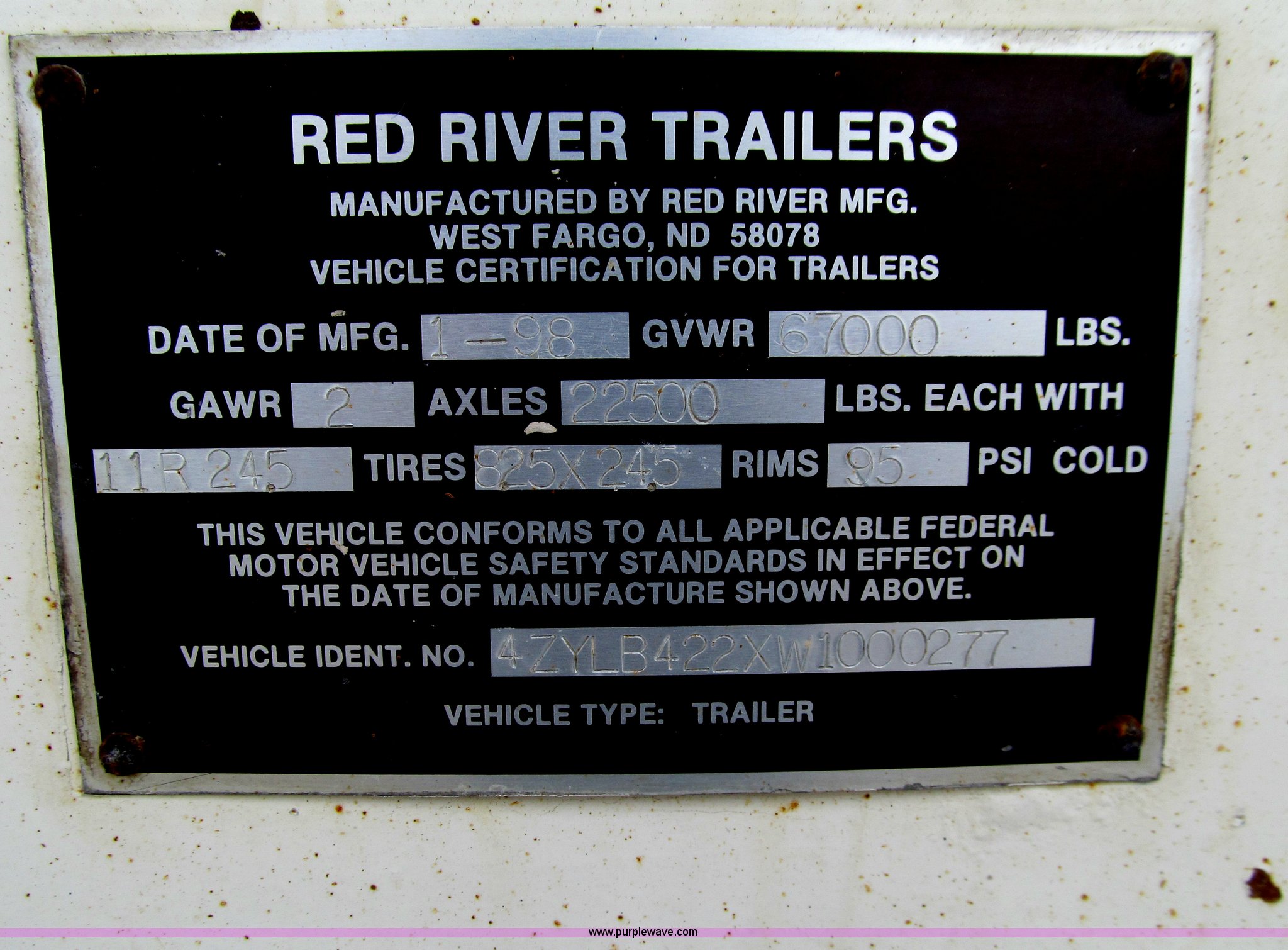 1998 Red River LB237 live bottom trailer. Approximately 42'L x 96"W, Full length tarp, Continuous rubber belt, Pin type landing gear, Mud flaps, Spring suspension , Air brakes, 11R24.5 tires, GVWR 67,000 lbs, GAWR 22,500 lbs, Rust Small perforations. 4ZYLB422XW1000277. Des Moines, IA 50316