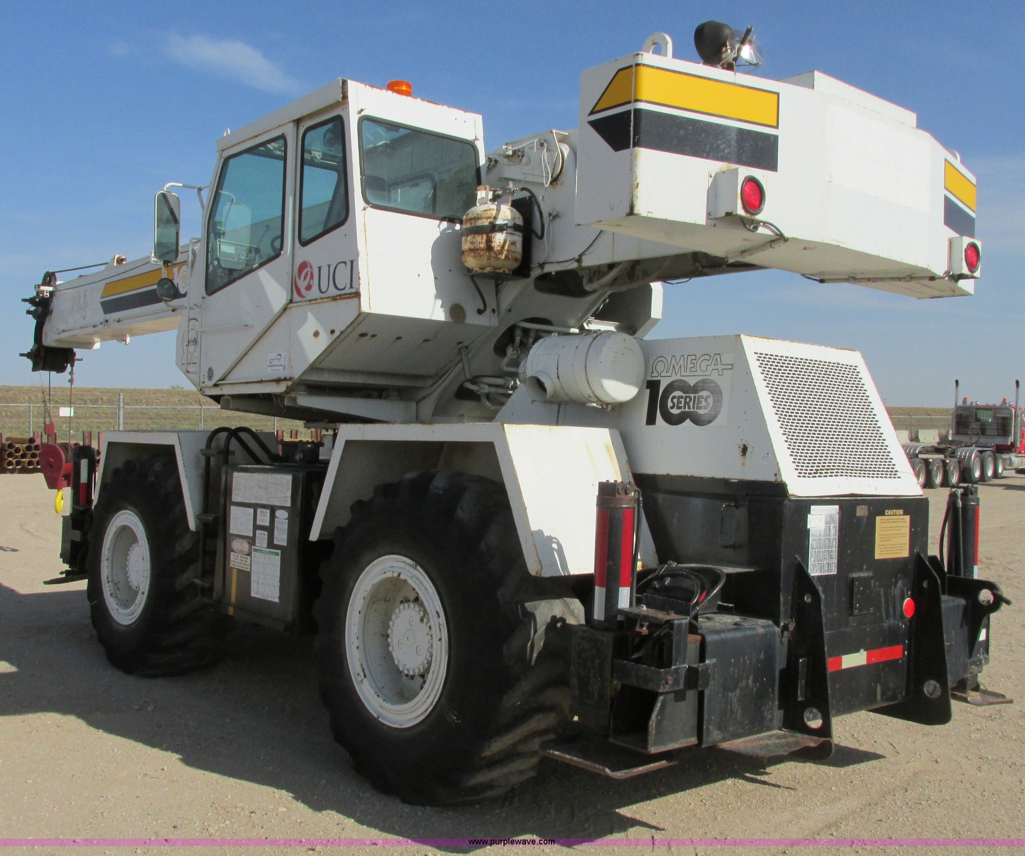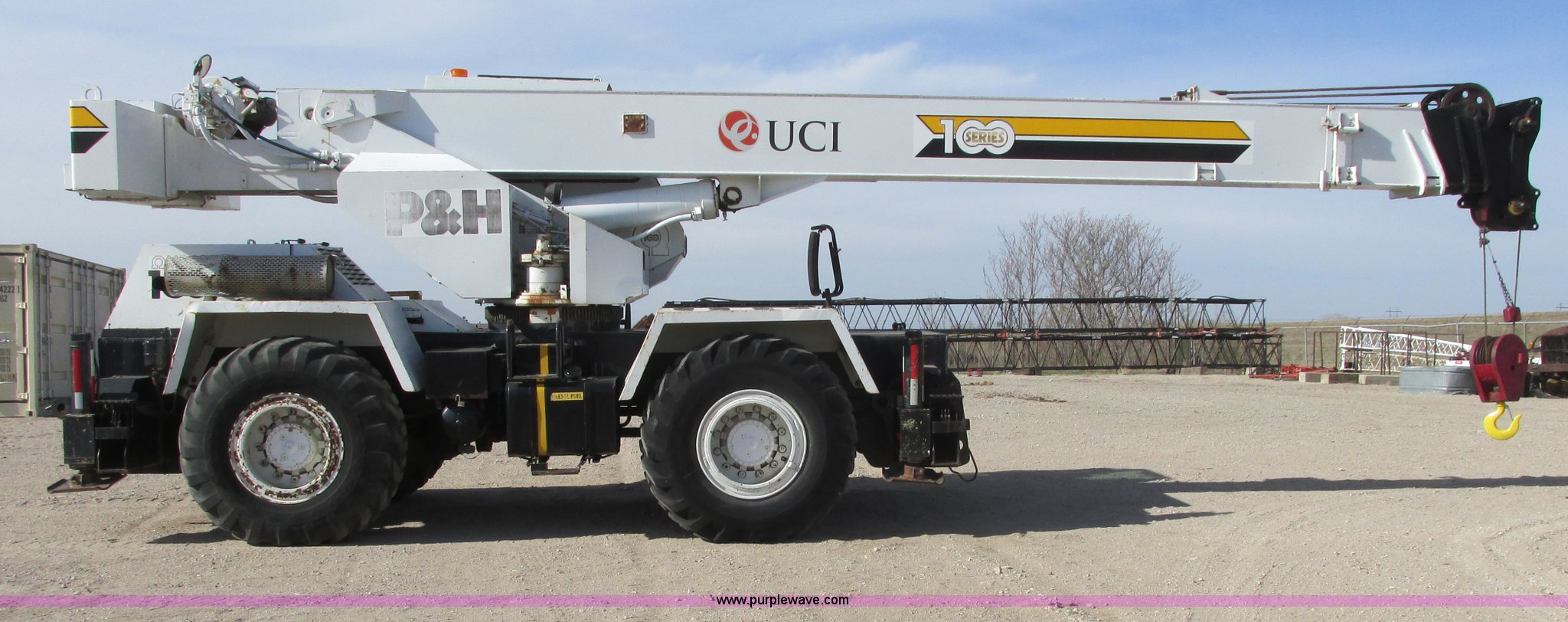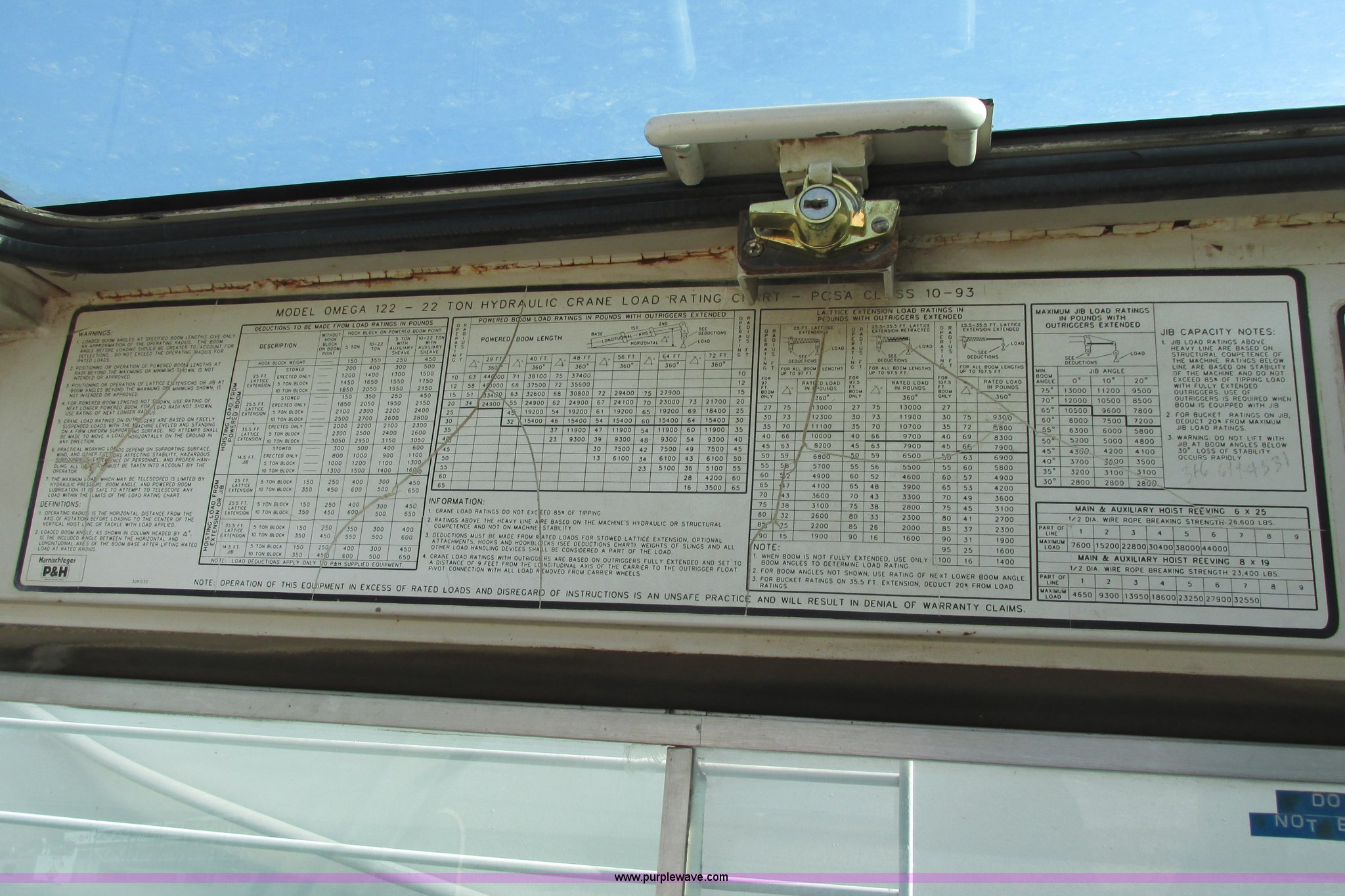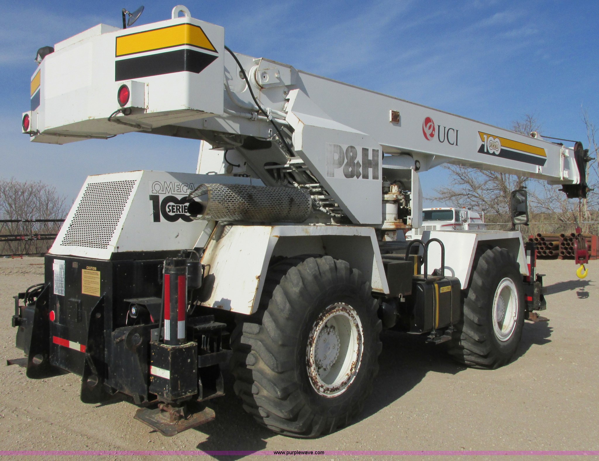 P & H 122 Omega 100 series hydraulic crane. 3,004 miles on odometer, 10,007 hours on meter 7 hours on replaced meter, Detroit Diesel 8.2L diesel engine, Powershift transmission 6F-3R gears, Four wheel drive, Enclosed cab Heat, 22 ton capacity, 72' maximum boom extension, 25' lattice boom extension Needs some lacing replaced, PCSA Class 10-93, Telescopic boom Oscillating, Two part cable, Seven part maximum, Two stick crane controls, Foot pedal crane control, In-cab outrigger control, Krueger two block warning system, Work lights, Boom lights, Slide-out horizontal outrigger frames Hydraulic post outriggers, 20.5-25 tires 20 ply, Additional parts and accessories included, Operator and parts manual, Manufacturer CTR No. TA00087. View equipment video. UCI. 1850 S Hoover. Wichita, KS 67209