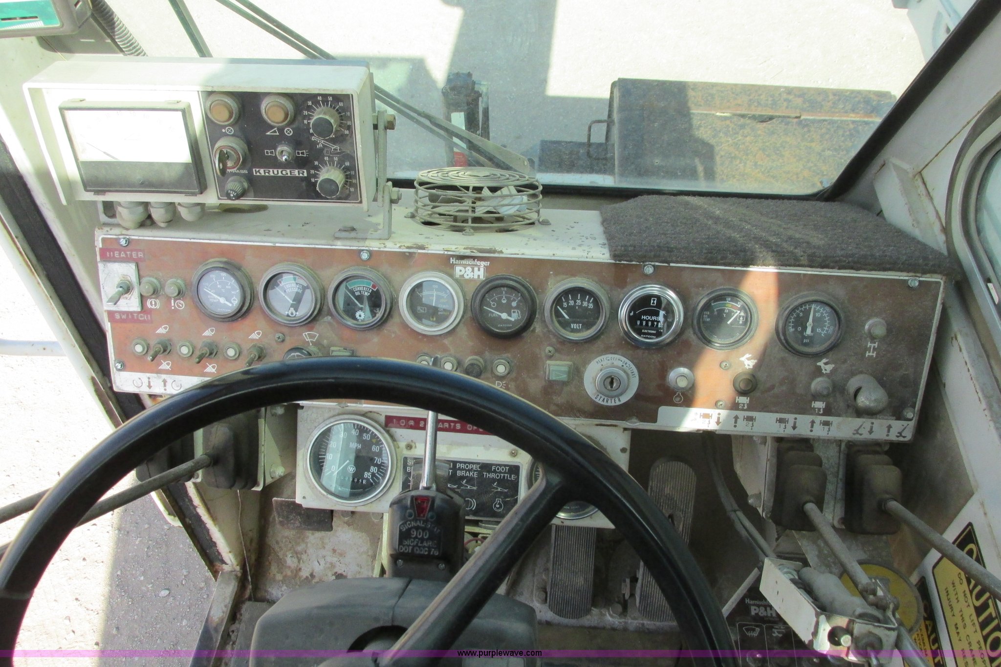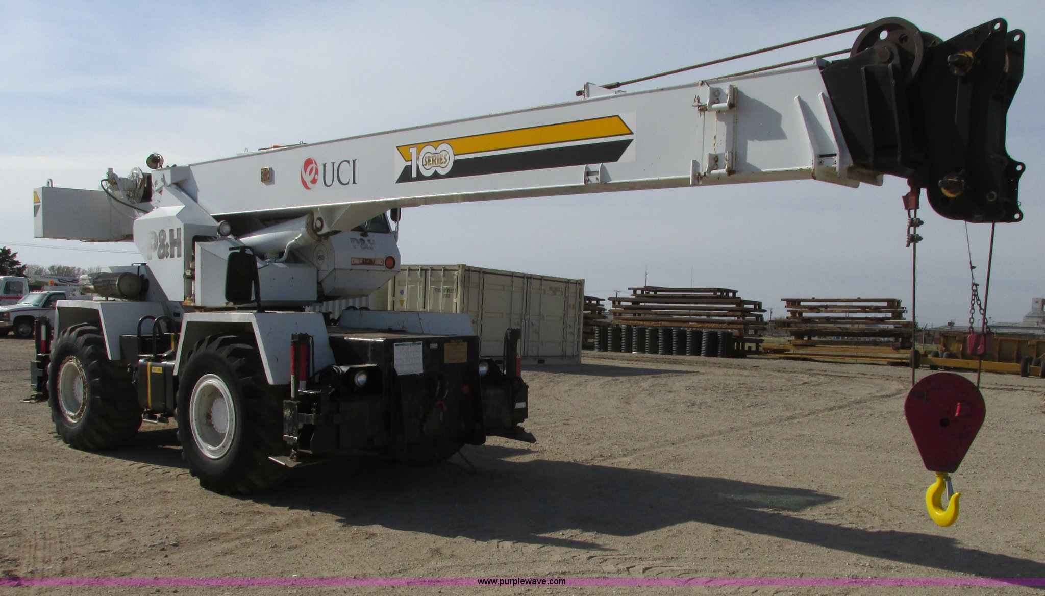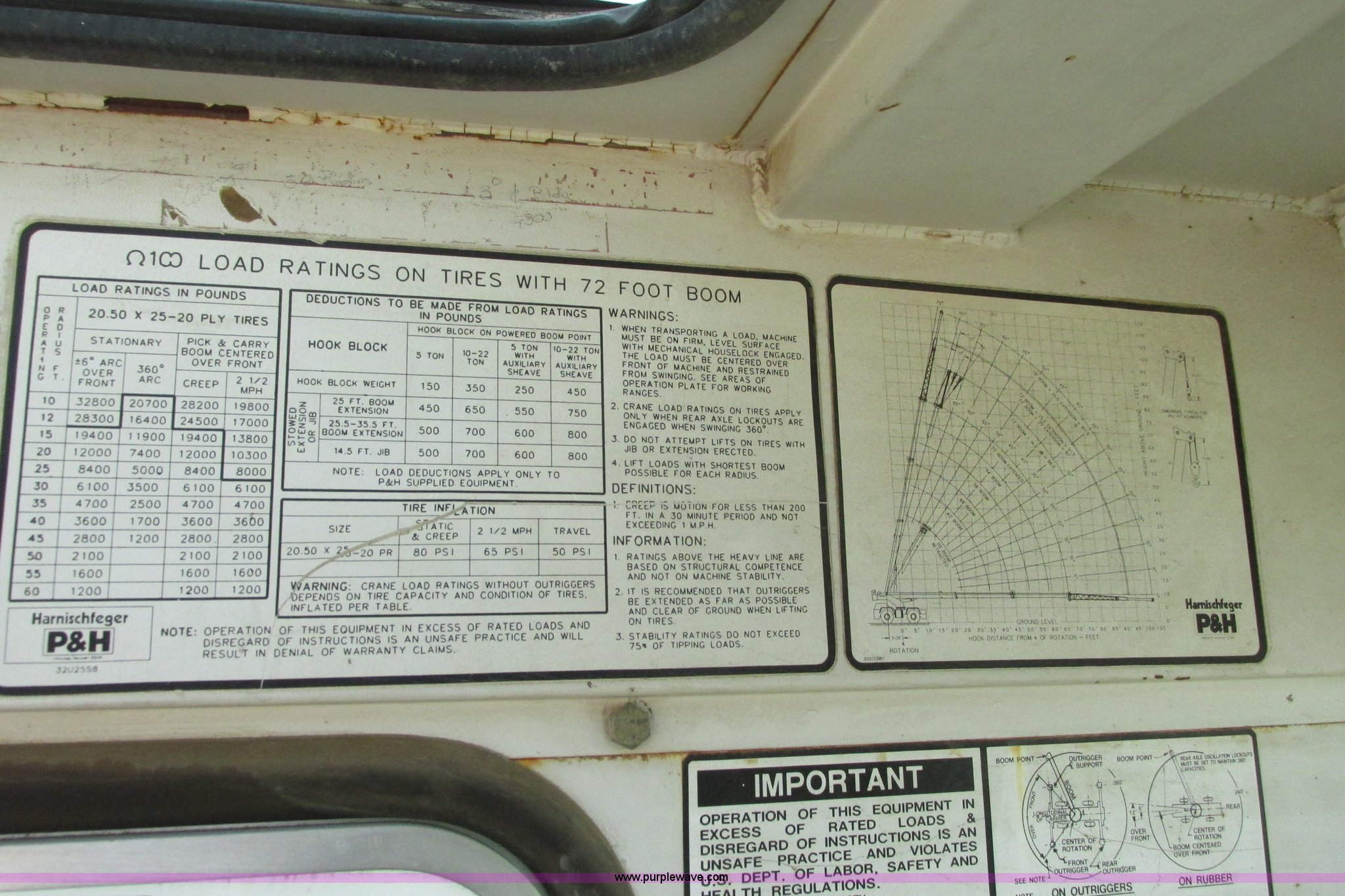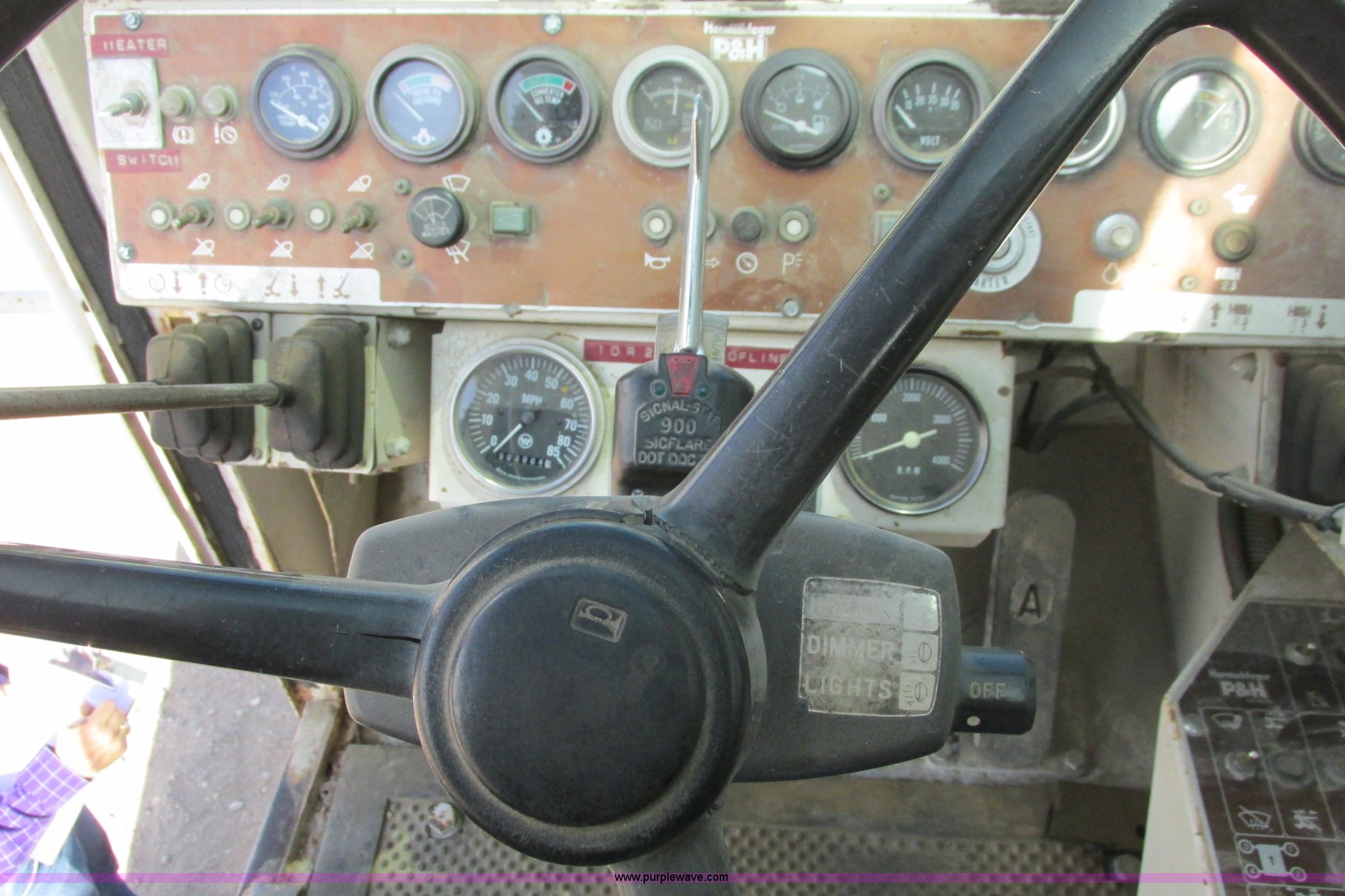 P & H 122 Omega 100 series hydraulic crane. 3,004 miles on odometer, 10,007 hours on meter 7 hours on replaced meter, Detroit Diesel 8.2L diesel engine, Powershift transmission 6F-3R gears, Four wheel drive, Enclosed cab Heat, 22 ton capacity, 72' maximum boom extension, 25' lattice boom extension Needs some lacing replaced, PCSA Class 10-93, Telescopic boom Oscillating, Two part cable, Seven part maximum, Two stick crane controls, Foot pedal crane control, In-cab outrigger control, Krueger two block warning system, Work lights, Boom lights, Slide-out horizontal outrigger frames Hydraulic post outriggers, 20.5-25 tires 20 ply, Additional parts and accessories included, Operator and parts manual, Manufacturer CTR No. TA00087. View equipment video. UCI. 1850 S Hoover. Wichita, KS 67209