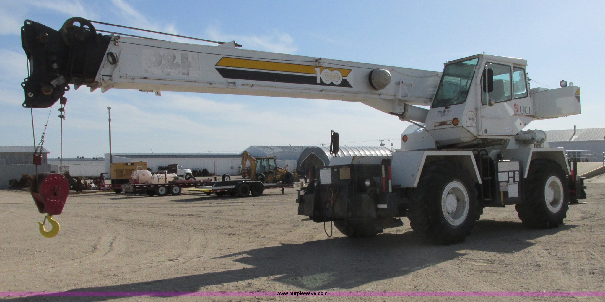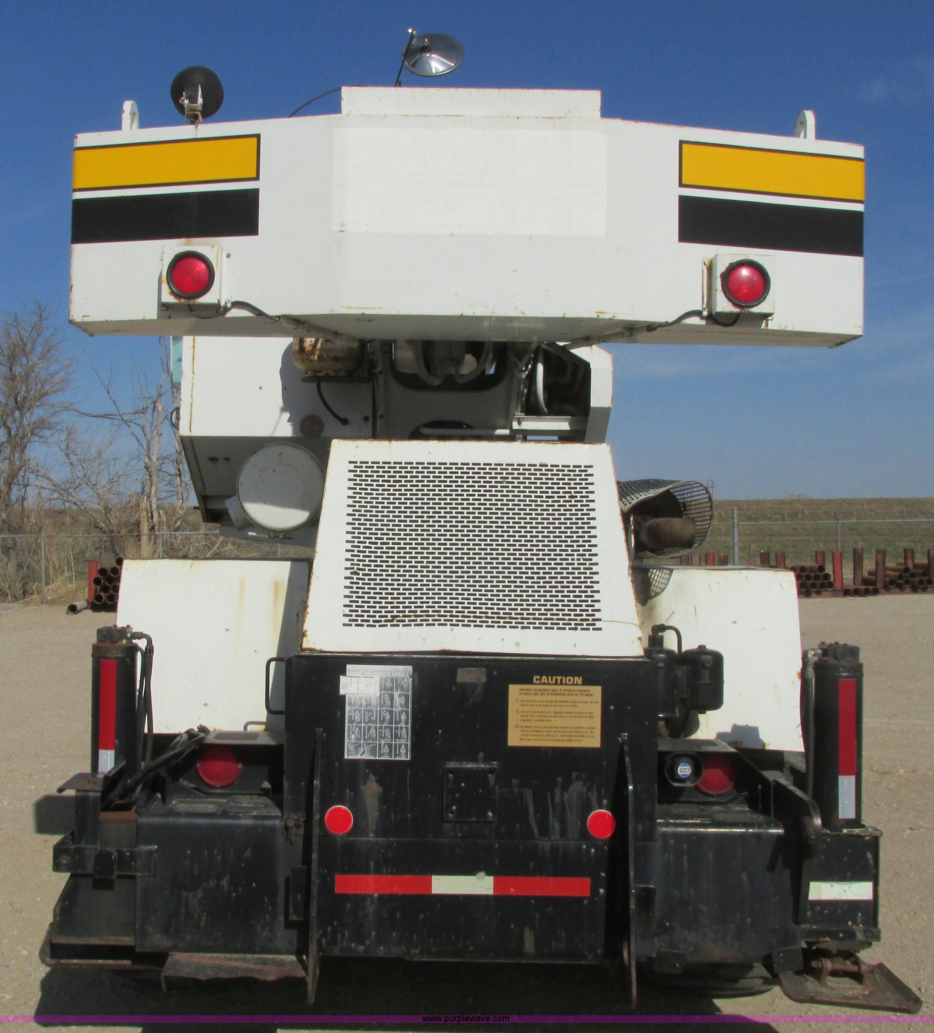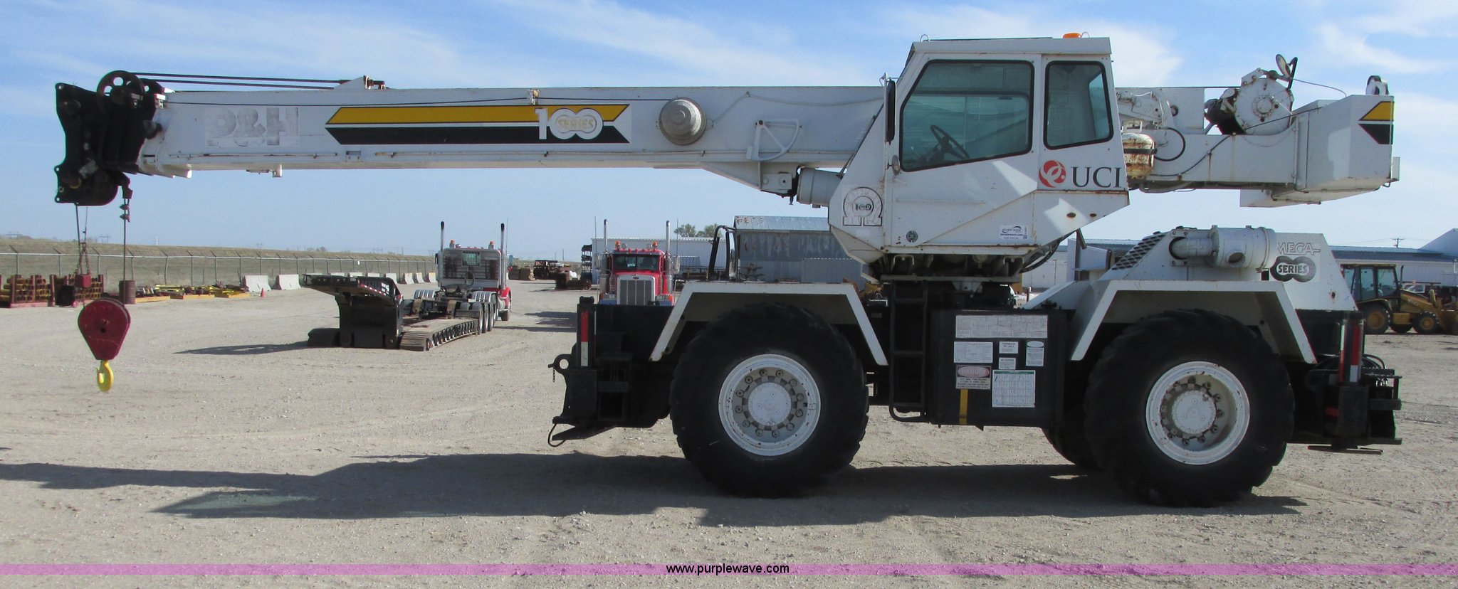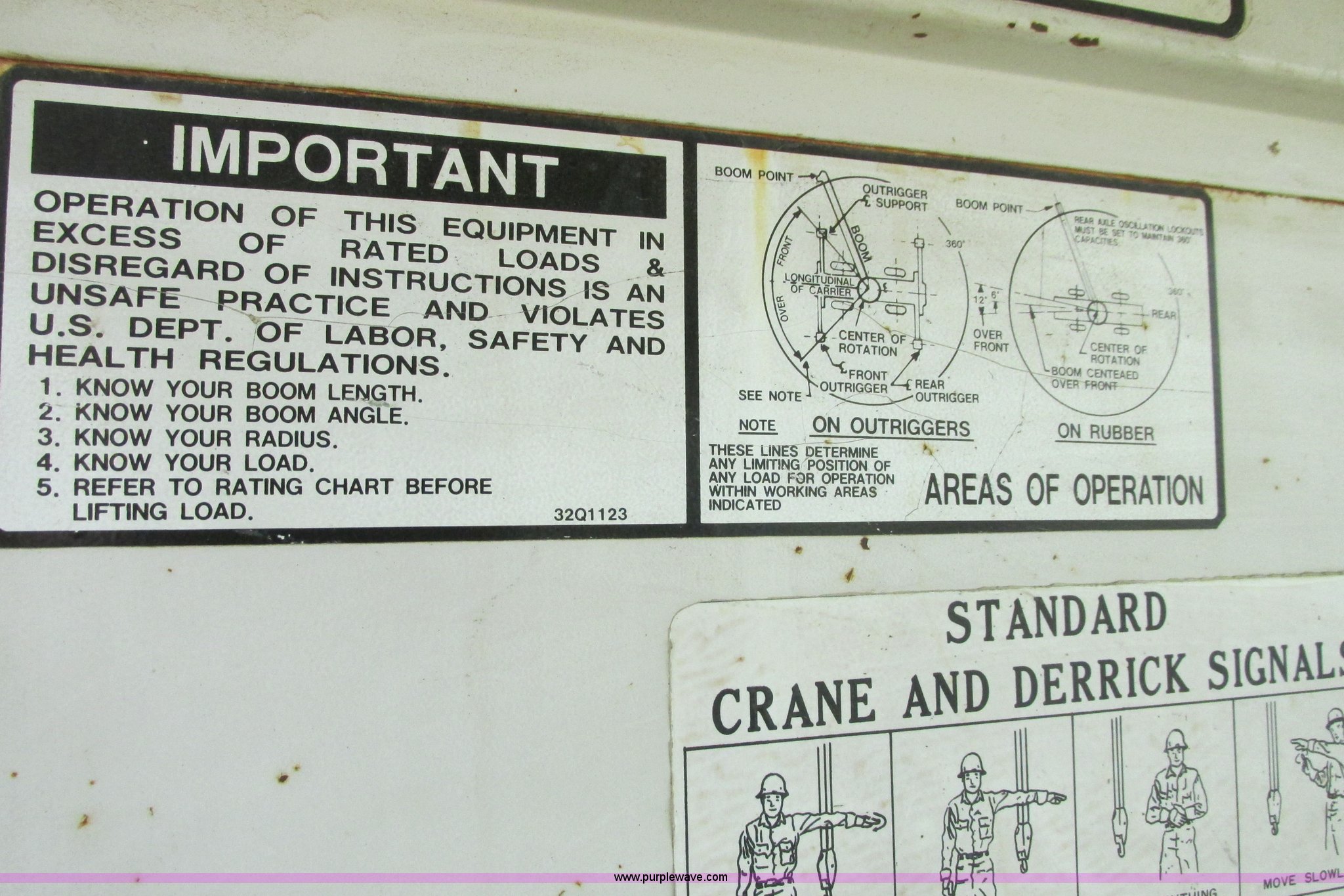 P & H 122 Omega 100 series hydraulic crane. 3,004 miles on odometer, 10,007 hours on meter 7 hours on replaced meter, Detroit Diesel 8.2L diesel engine, Powershift transmission 6F-3R gears, Four wheel drive, Enclosed cab Heat, 22 ton capacity, 72' maximum boom extension, 25' lattice boom extension Needs some lacing replaced, PCSA Class 10-93, Telescopic boom Oscillating, Two part cable, Seven part maximum, Two stick crane controls, Foot pedal crane control, In-cab outrigger control, Krueger two block warning system, Work lights, Boom lights, Slide-out horizontal outrigger frames Hydraulic post outriggers, 20.5-25 tires 20 ply, Additional parts and accessories included, Operator and parts manual, Manufacturer CTR No. TA00087. View equipment video. UCI. 1850 S Hoover. Wichita, KS 67209