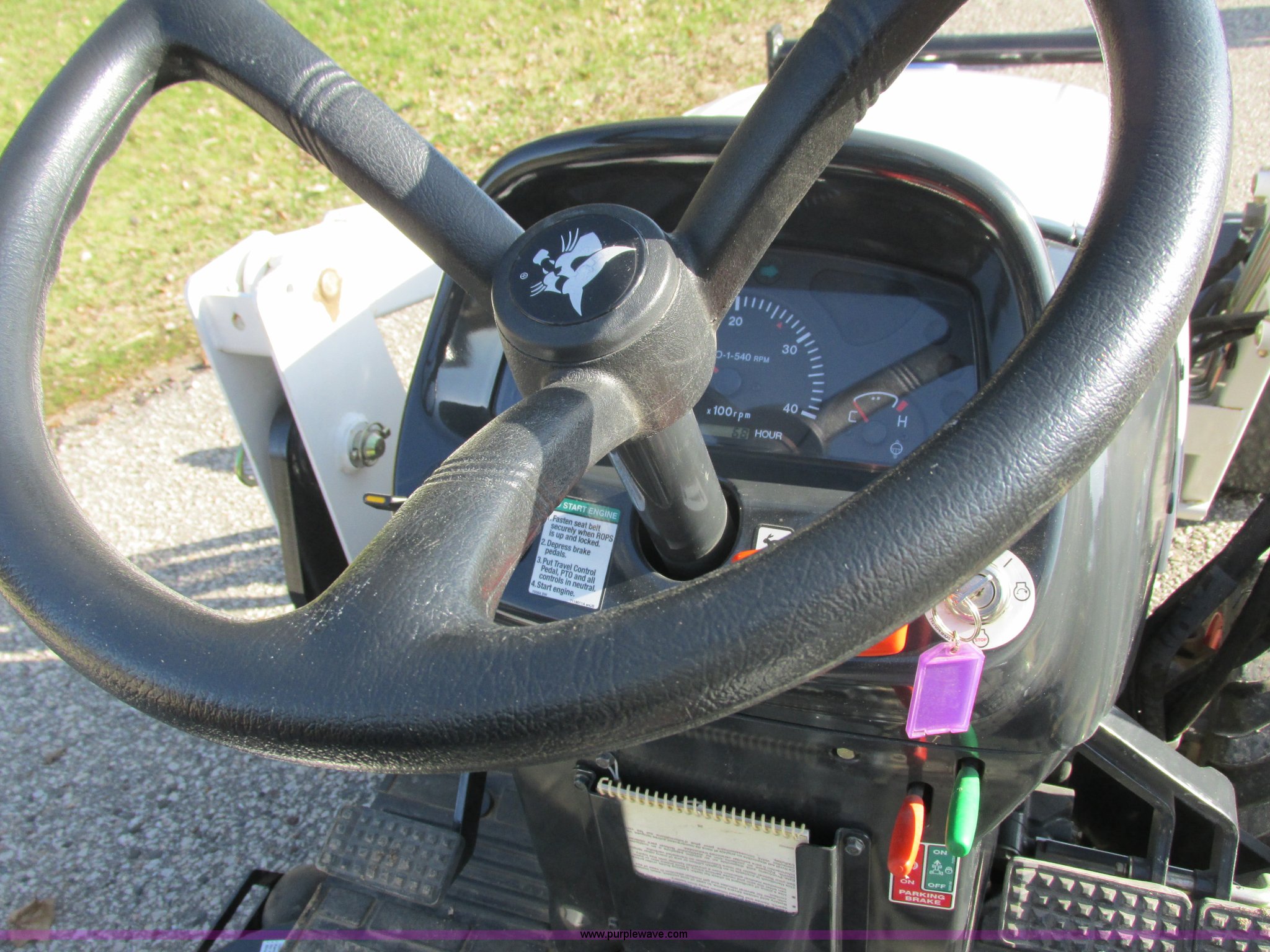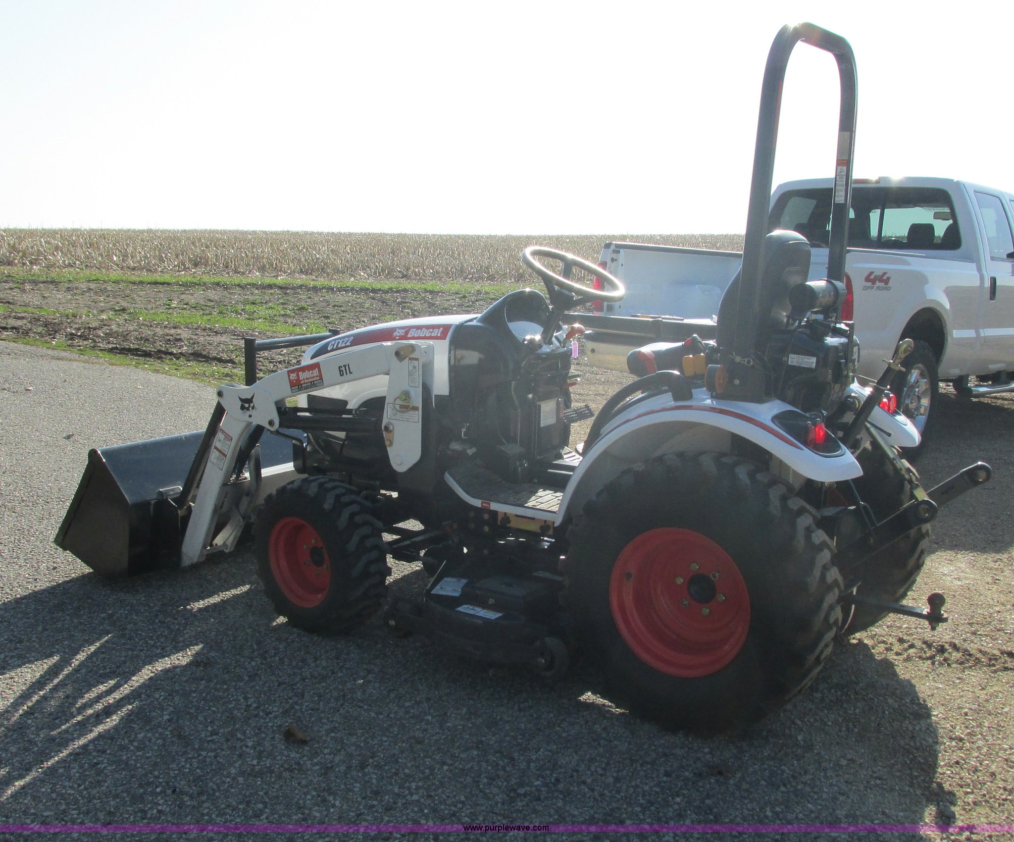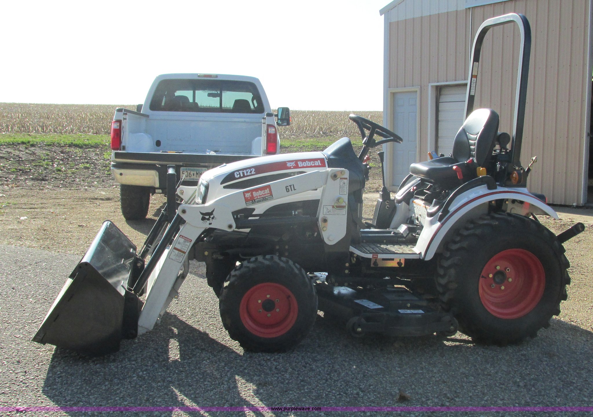 Purple Wave is selling a used Tractor in Minnesota. This item is a 2009 Bobcat CT122 tractor with loader with the following: 68 actual hours, Three cylinder diesel engine, Hydrostatic transmission, 2F-2R gears, Four wheel drive, Fold down ROPS, Work lights, 6TL loader, 54"W bucket, Joystick bucket controls, 59" rear blade, Three point, Draw bar, 540 PTO, Single rear hydraulic remote, Mower deck, 54" cutting capacity, PTO driven, 12-16 front tires, 23 x 8.5 rear tires, Serial ABF511324
