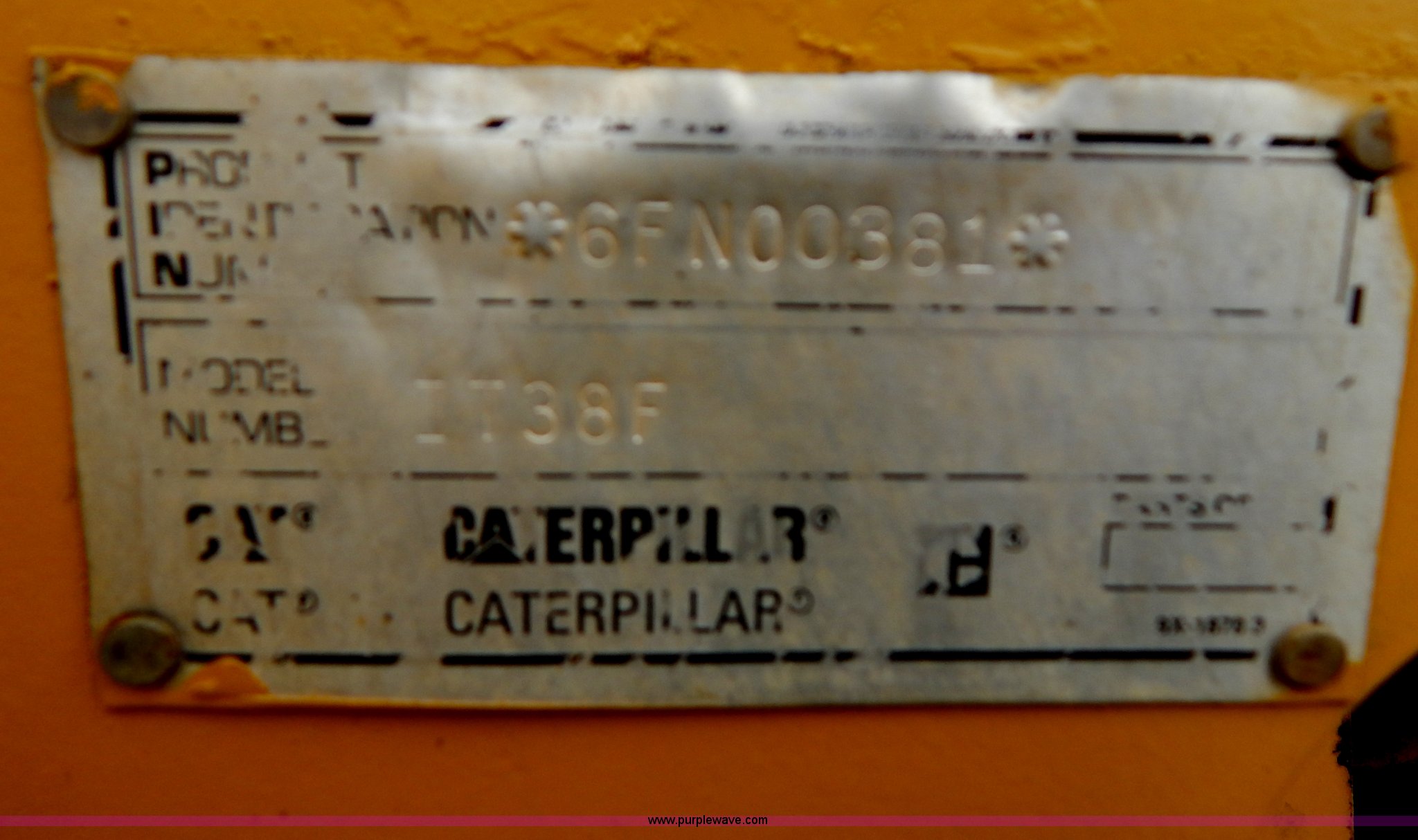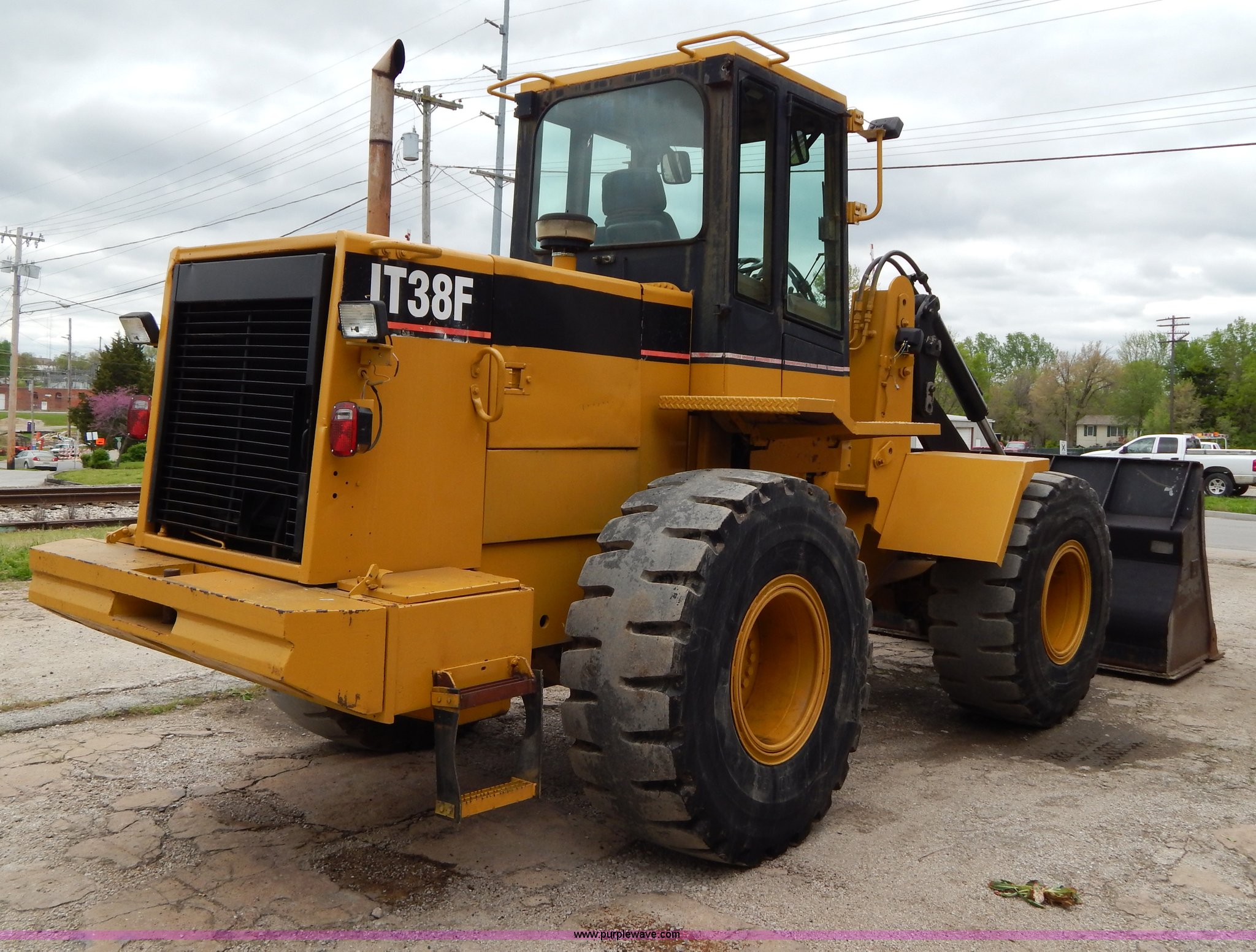 Purple Wave is selling a used Wheel Loader in Missouri. This item is a 1996 Caterpillar IT38F wheel loader with the following: 26,865 hours on meter, Caterpillar 3116 diesel engine, Serial 98214725, Four speed shuttle shift transmission, Serial 7ZX03049, Enclosed cab, AC and heat, AM/FM/cassette, Tilt steering wheel, Air suspension seat, Two stick loader control, Work lights, 109"W bucket, Smooth bolt-on cutting edge, 5'L x 6"W x 2.5" thick forks, Forks spread up to 81"W, Quick coupler, Rear pin hitch, Rear counter weight, 20.5R25 tires, 28,731 lbs. base operating weight, Serial 6FN00381