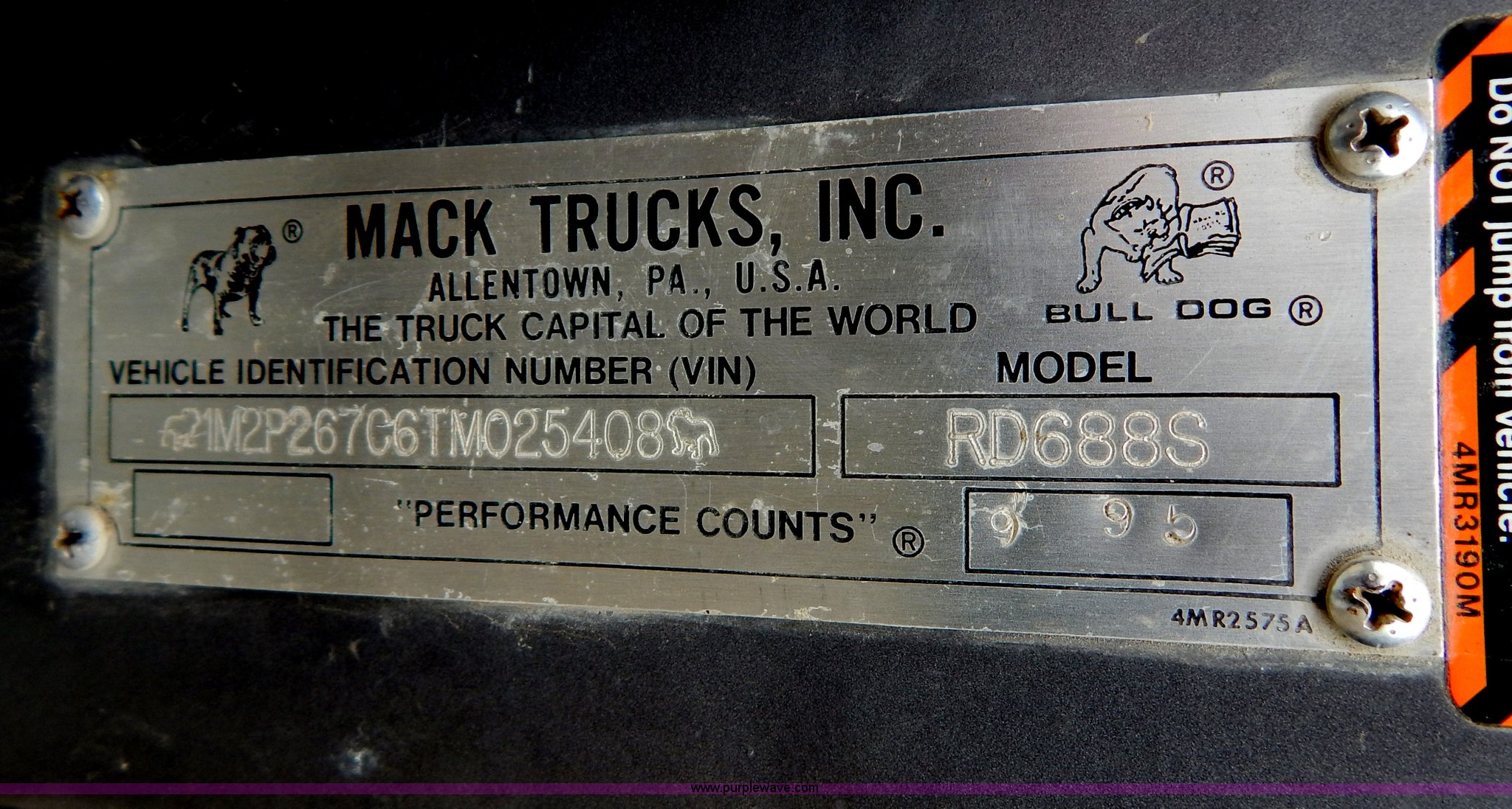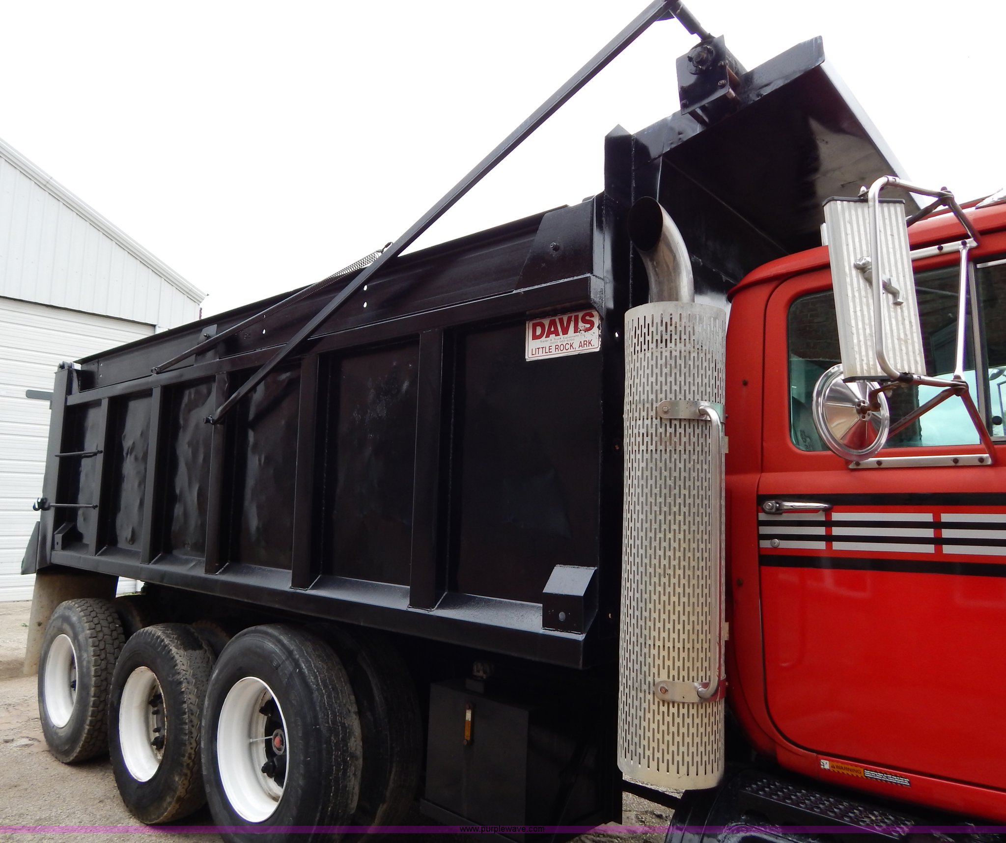 Purple Wave is selling a used Construction Dump Truck in Missouri. This item is a 1996 Mack RD688S triple axle dump truck with the following: 367,383 miles on odometer, 16,584 hours on meter, Mack E7 12.0L L6 diesel engine, 350 HP, Eaton Fuller nine speed manual transmission, AC and heat, Tilt, AM/FM/cassette, Air suspension seat, Exterior visor, Chrome bumper, 16'L x 8'W x 55"H dump bed, Air end gate, Rollover tarp, Exterior visor, Chrome bumper, Dual 55 gallon fuel tanks, PTO, Spring suspension, Air brakes, 425/65R22.5 front tires, 11R22.5 rear tires